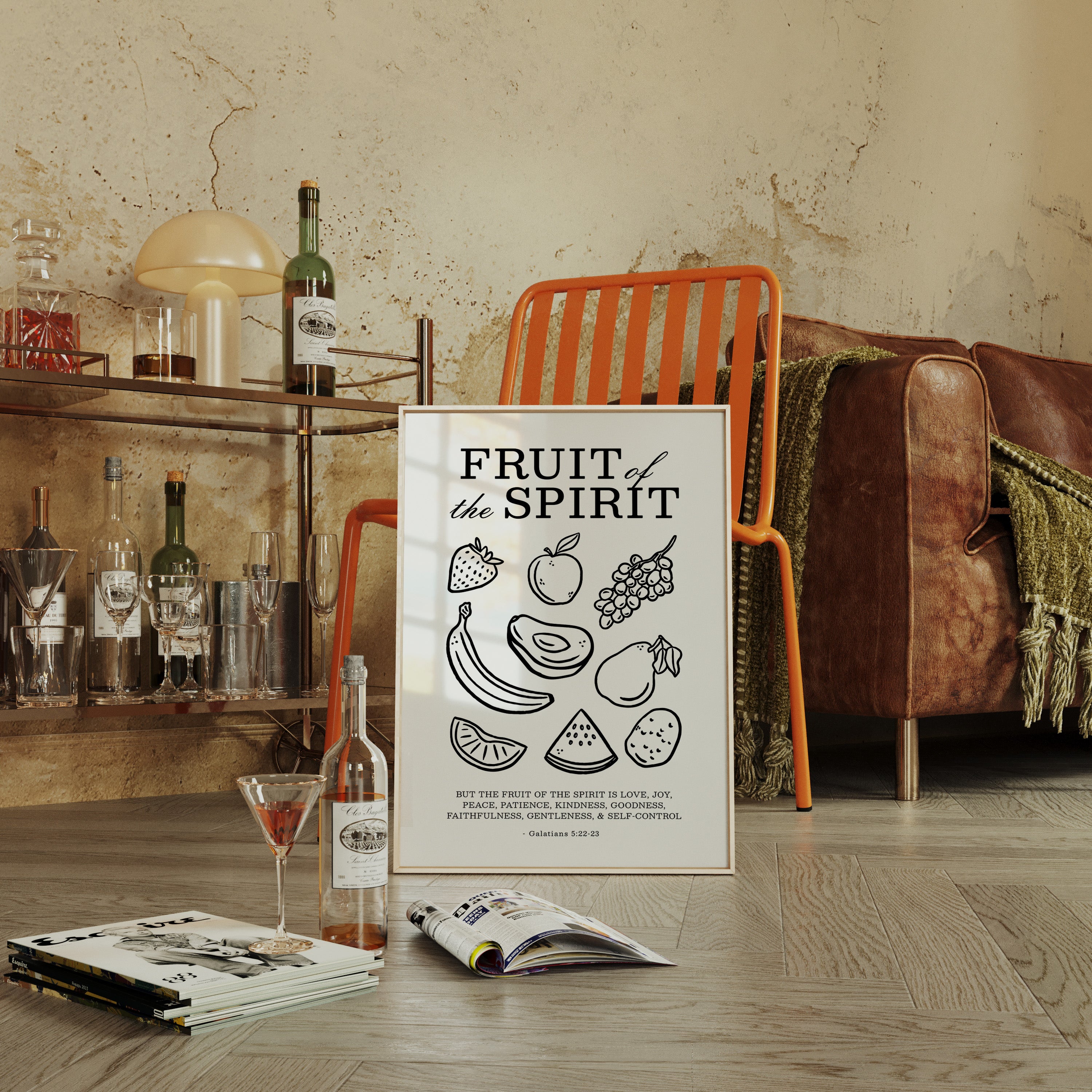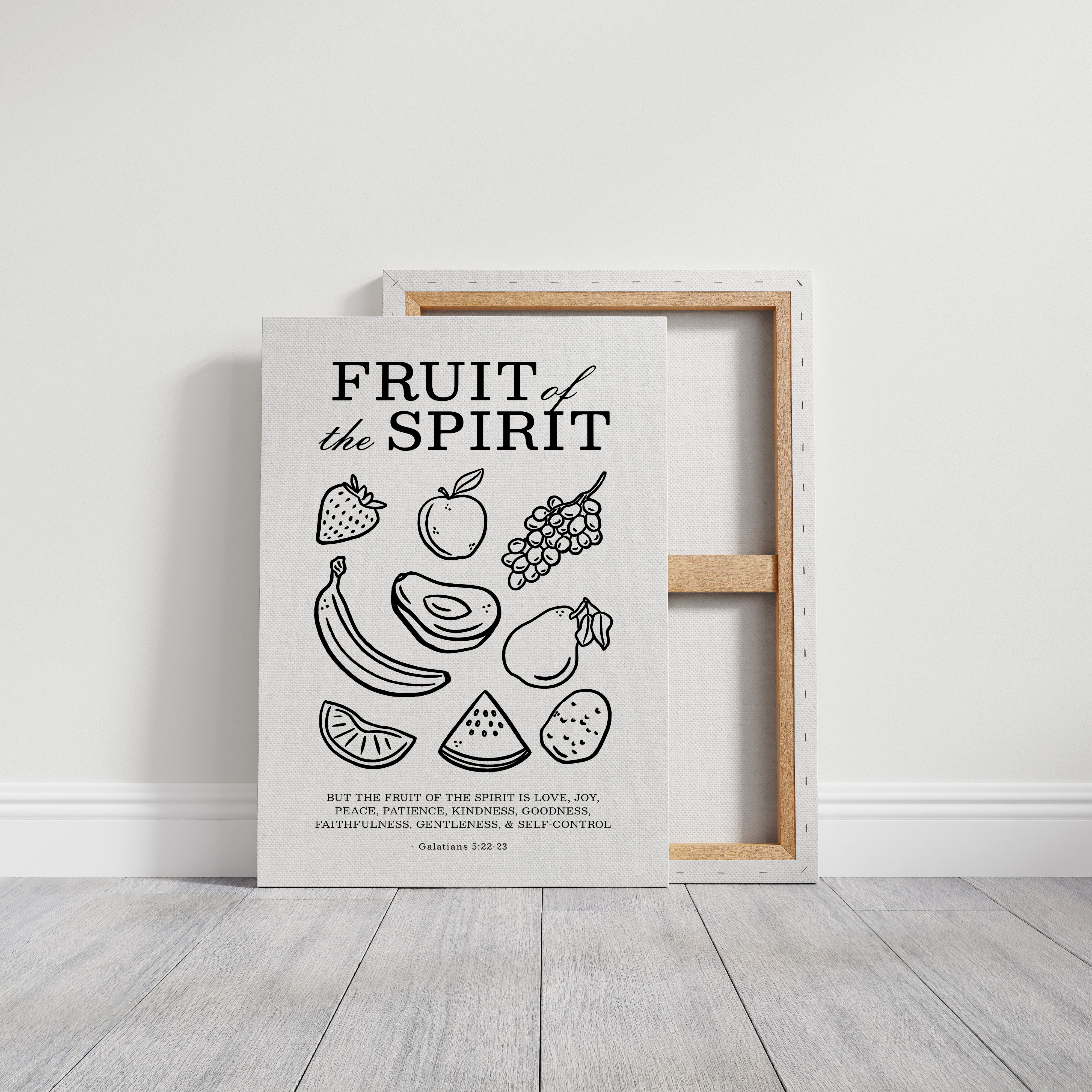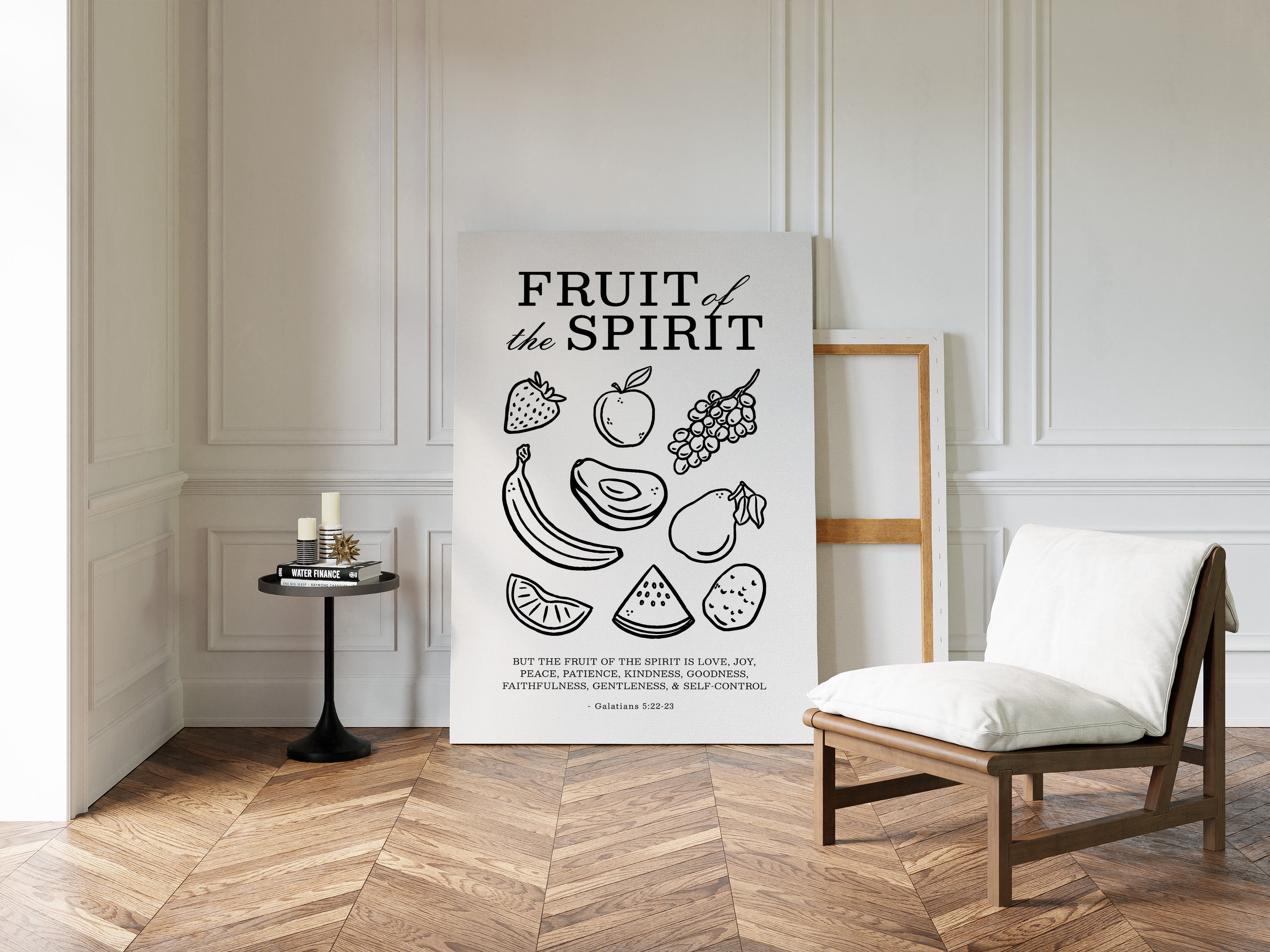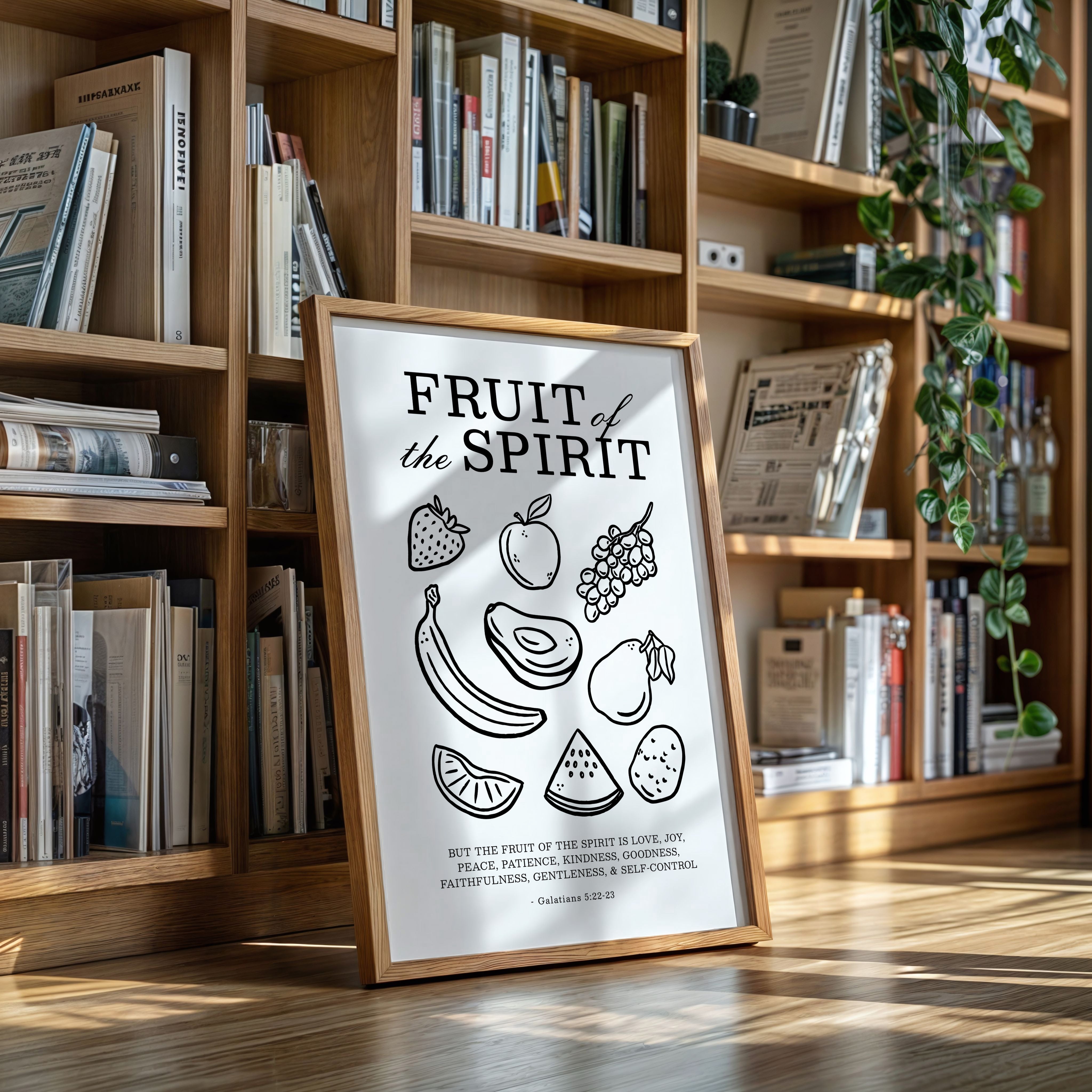 Clean lines trace the essence of abundance, where simple fruits carry profound meaning. This contemporary minimalist piece brings scripture to life through playful line drawings. Each carefully illustrated fruit becomes a symbol of spiritual virtues, arranged with purposeful simplicity against pristine white space. The marriage of modern design and timeless wisdom creates a gentle reminder of life's sweetest truths. Perfect for bringing inspiration to kitchen spaces, dining areas, or any room seeking both style and substance. A thoughtful addition that serves as both art and daily meditation.