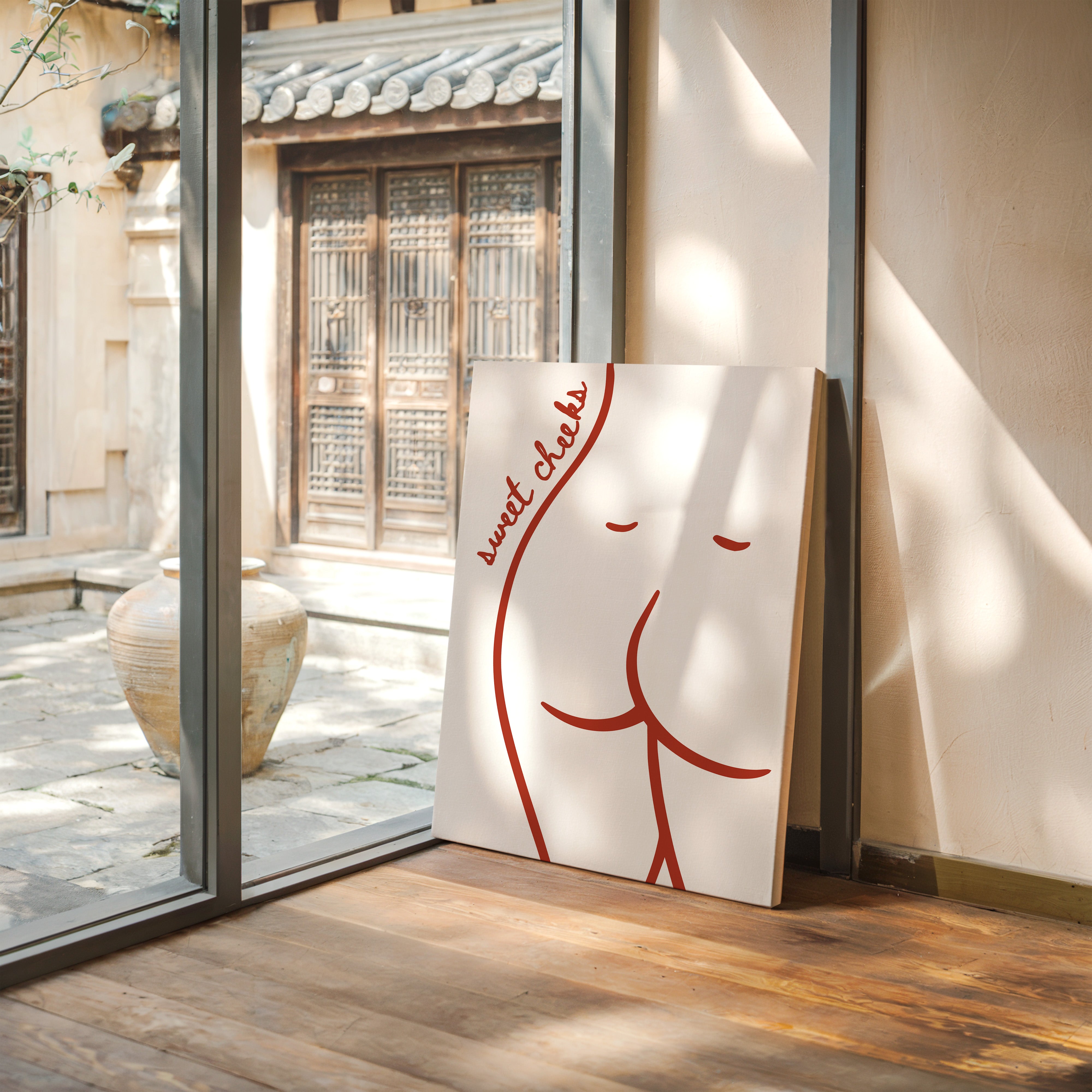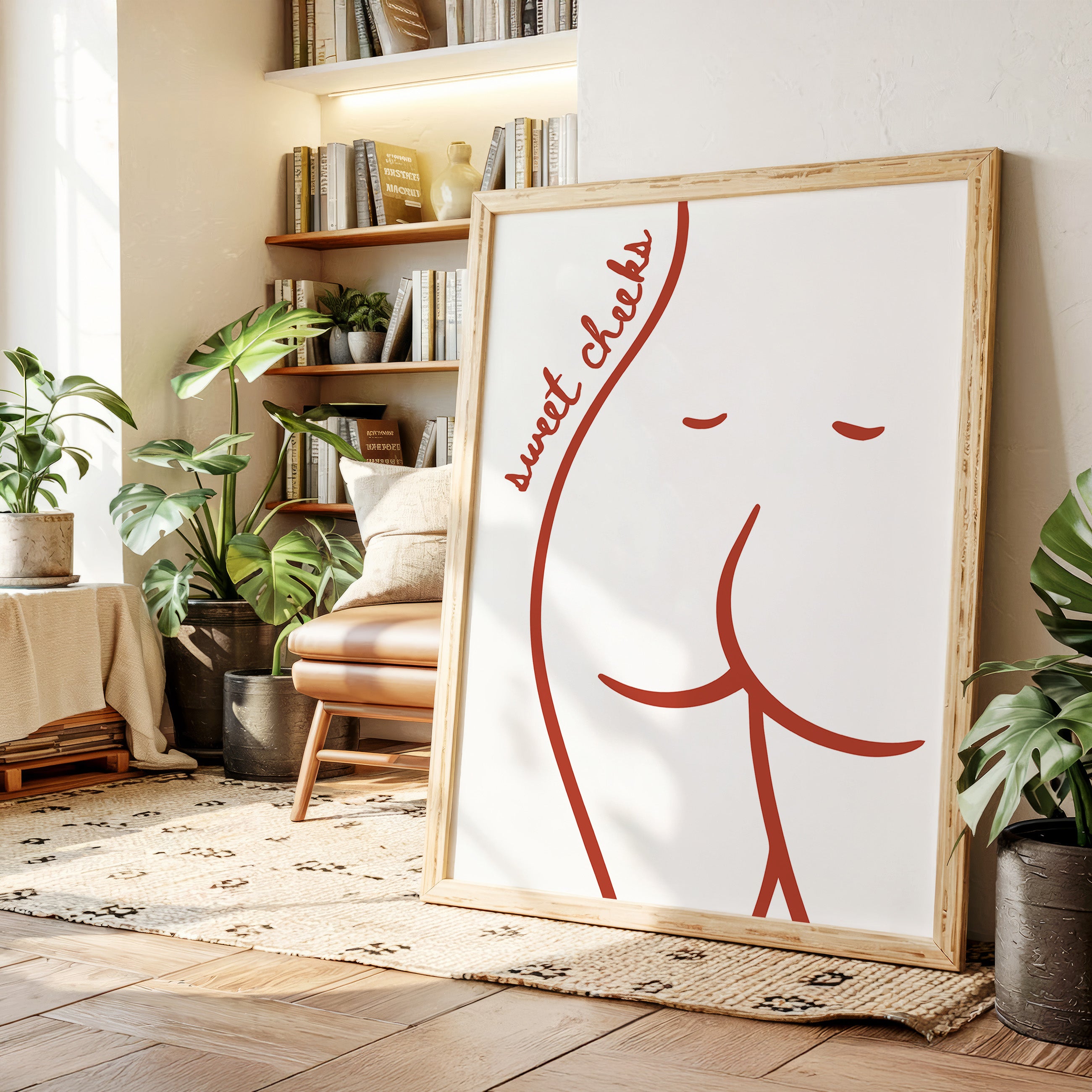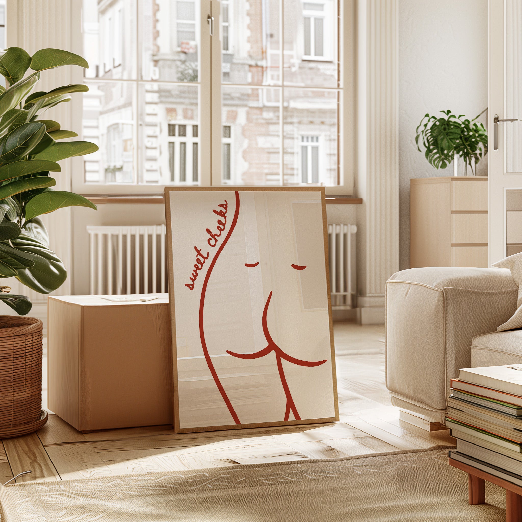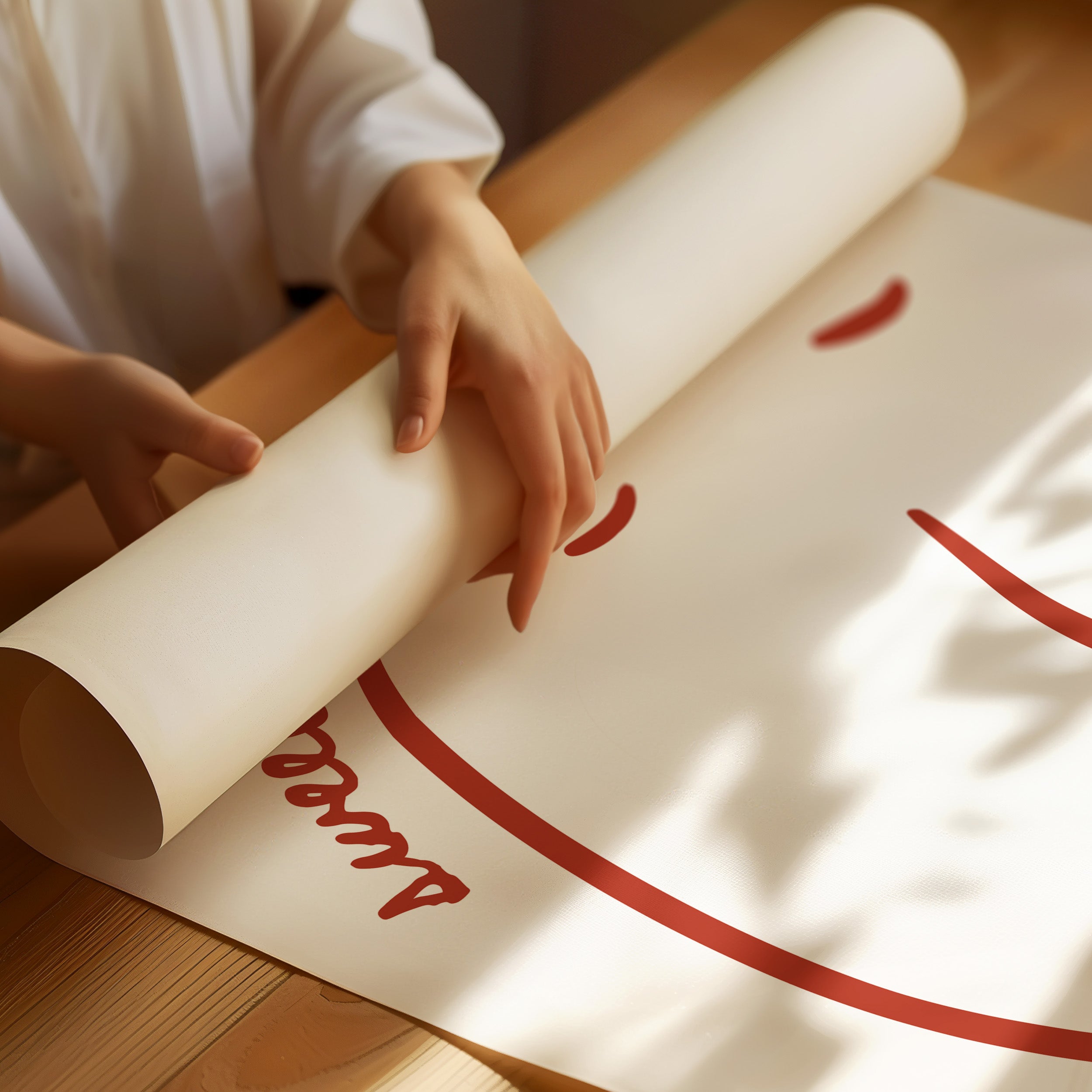 A minimalist red line drawing captures the essence of joy with elegant simplicity. The curved strokes dance across white space, forming a playful expression that speaks volumes through sparing detail. The terracotta hue adds warmth and personality to the contemporary composition, while maintaining a sophisticated restraint. This piece brings a touch of whimsy and modern artistry to any space, perfect for adding character to a clean-lined dining room or bringing life to a minimal home office.