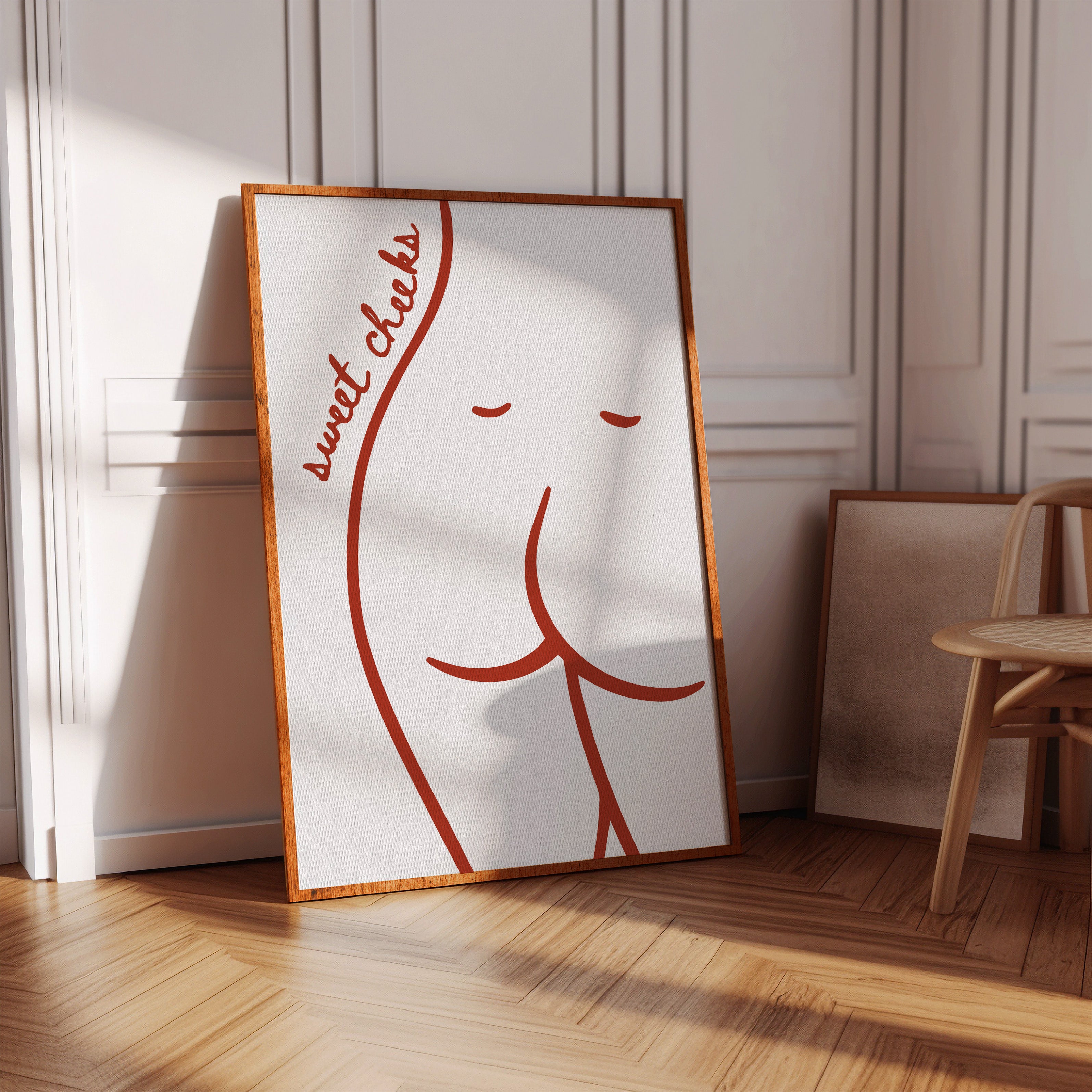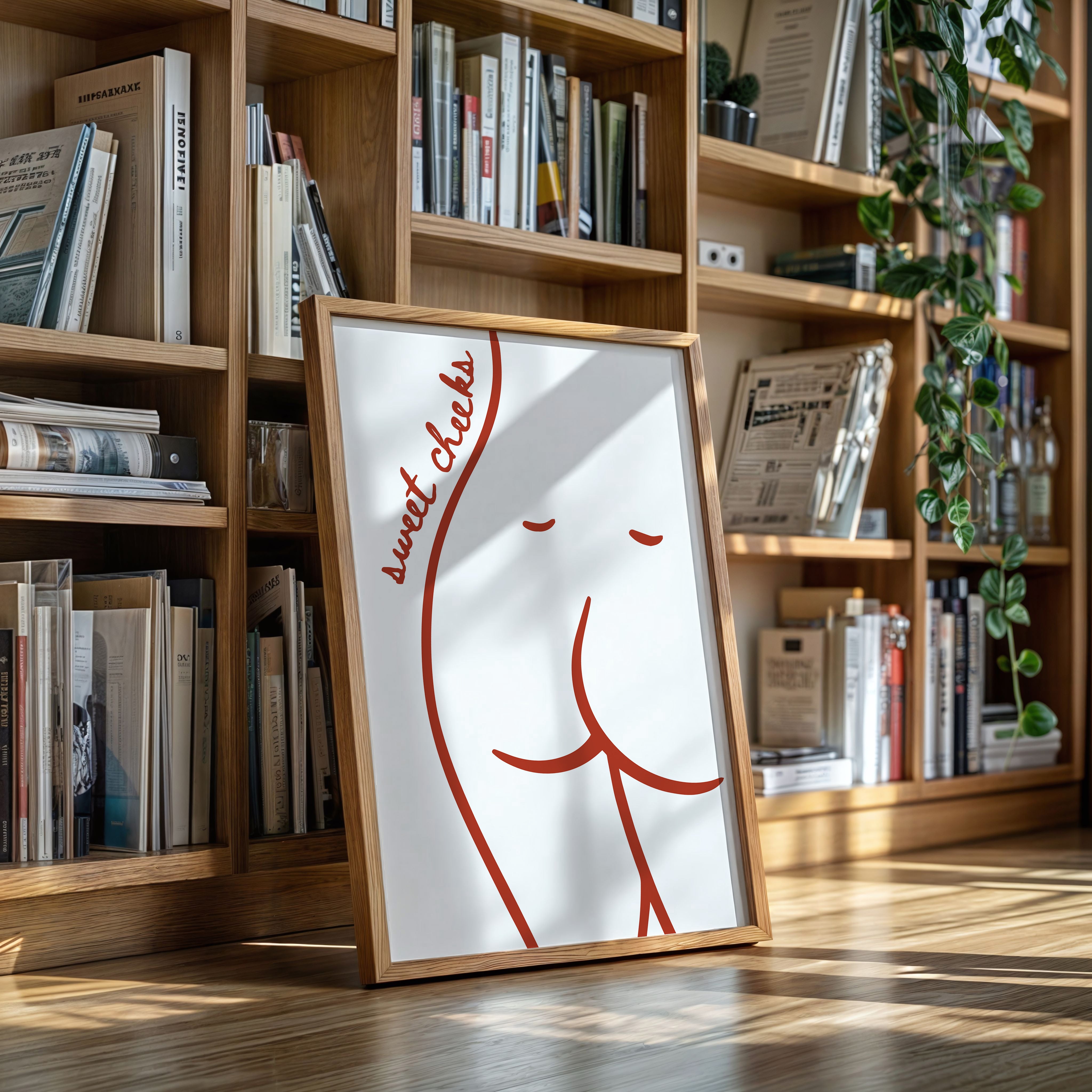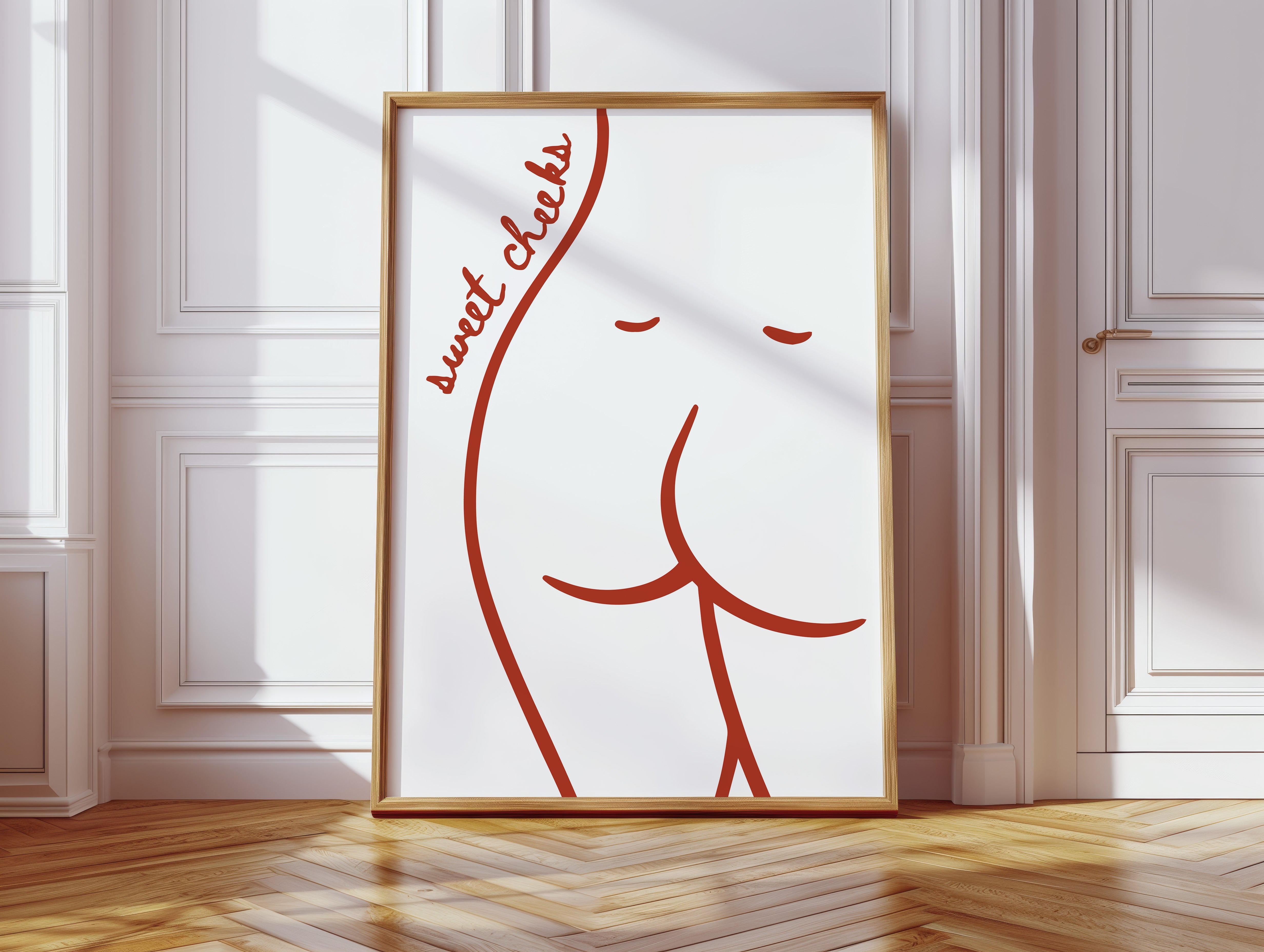 A minimalist red line drawing captures the essence of joy with elegant simplicity. The curved strokes dance across white space, forming a playful expression that speaks volumes through sparing detail. The terracotta hue adds warmth and personality to the contemporary composition, while maintaining a sophisticated restraint. This piece brings a touch of whimsy and modern artistry to any space, perfect for adding character to a clean-lined dining room or bringing life to a minimal home office.