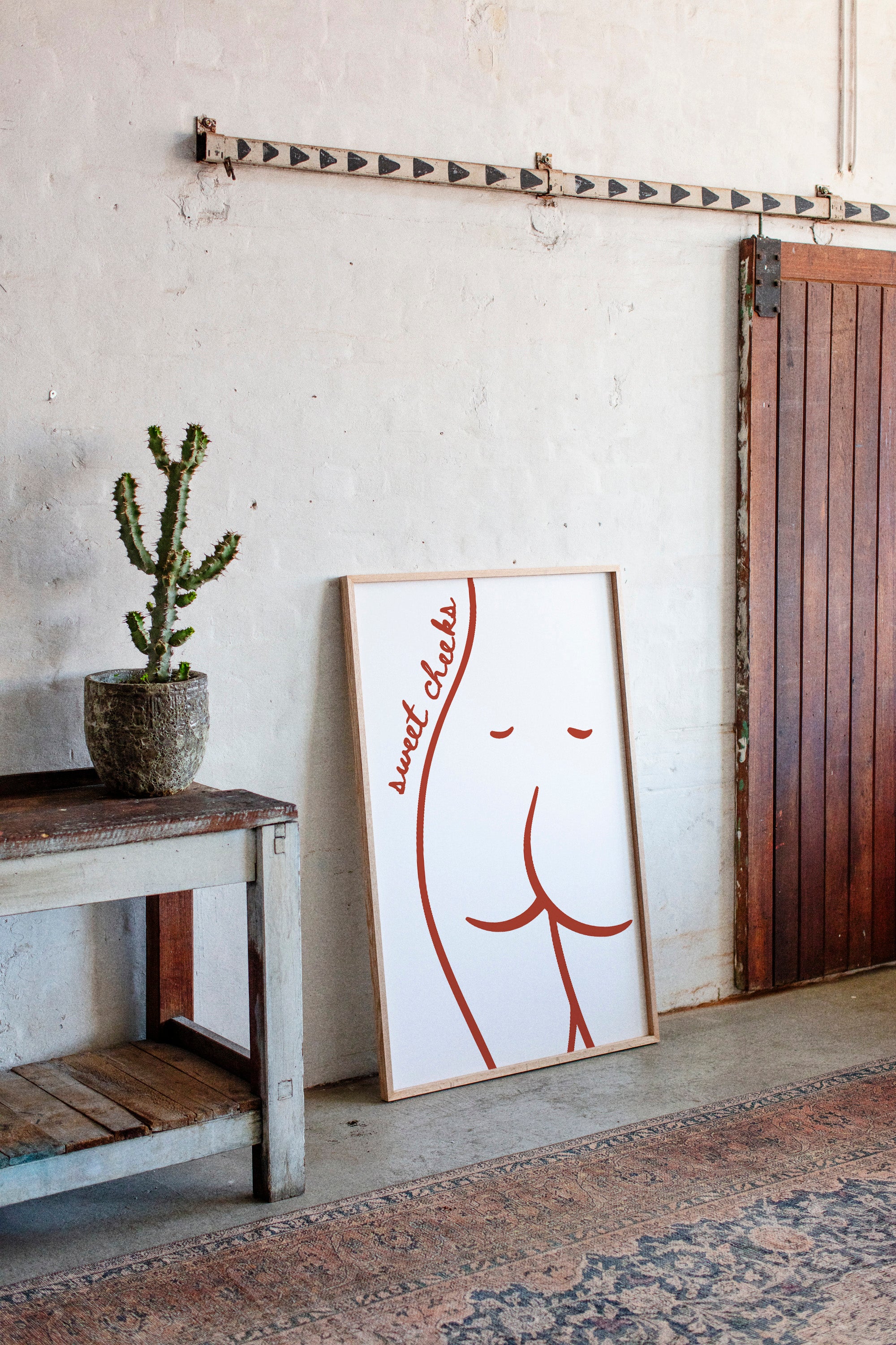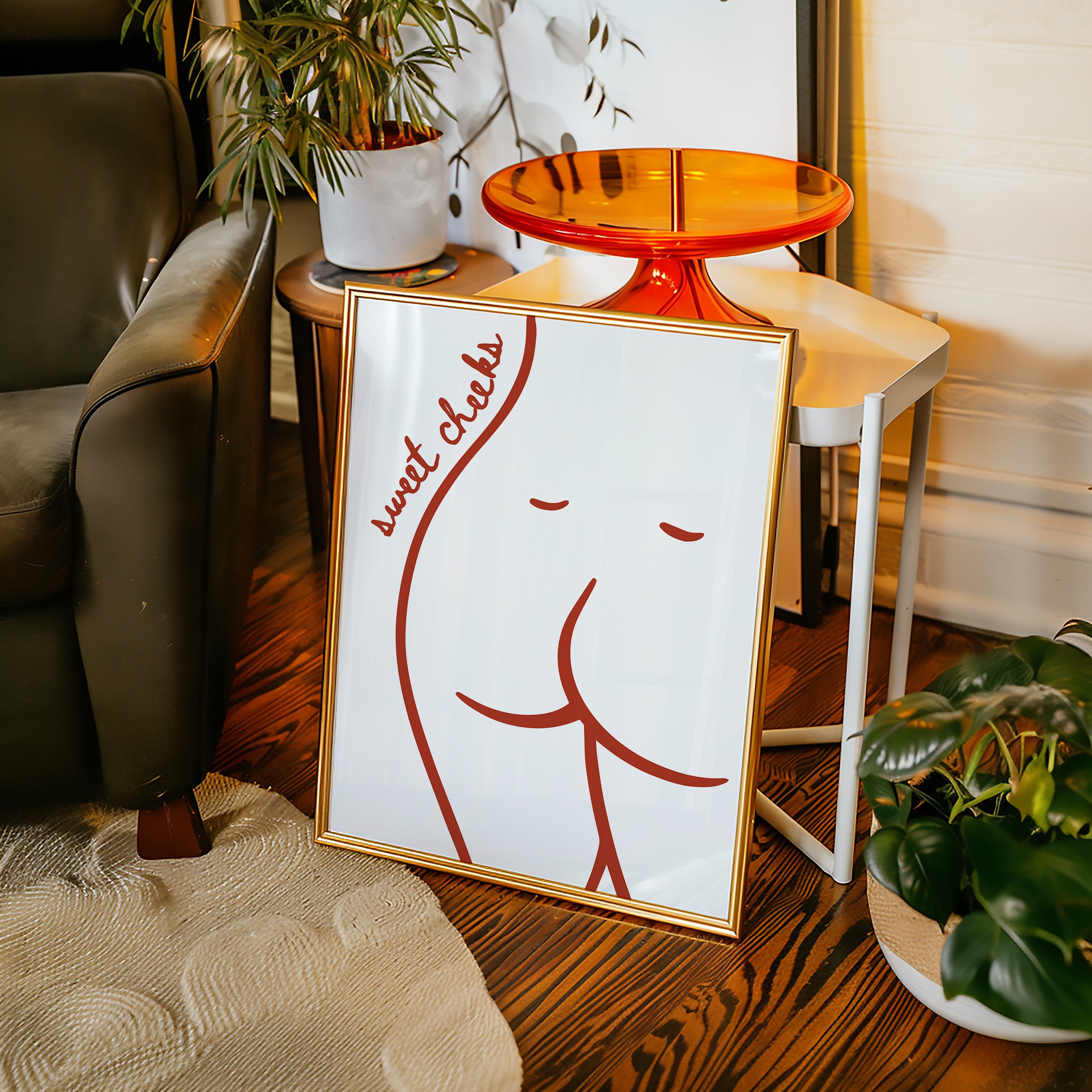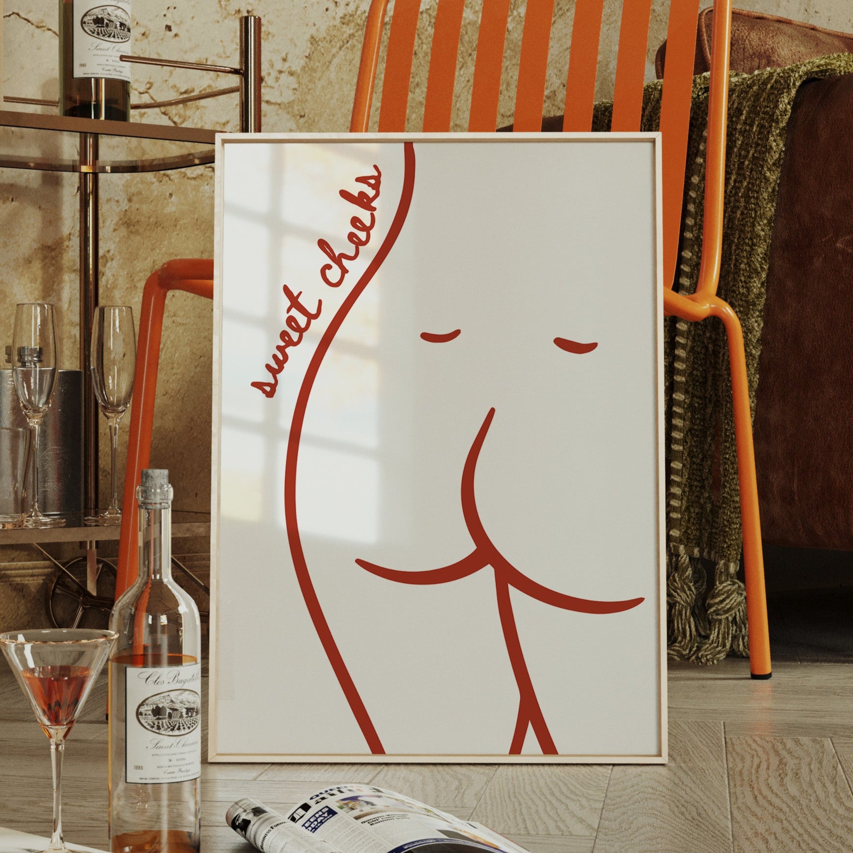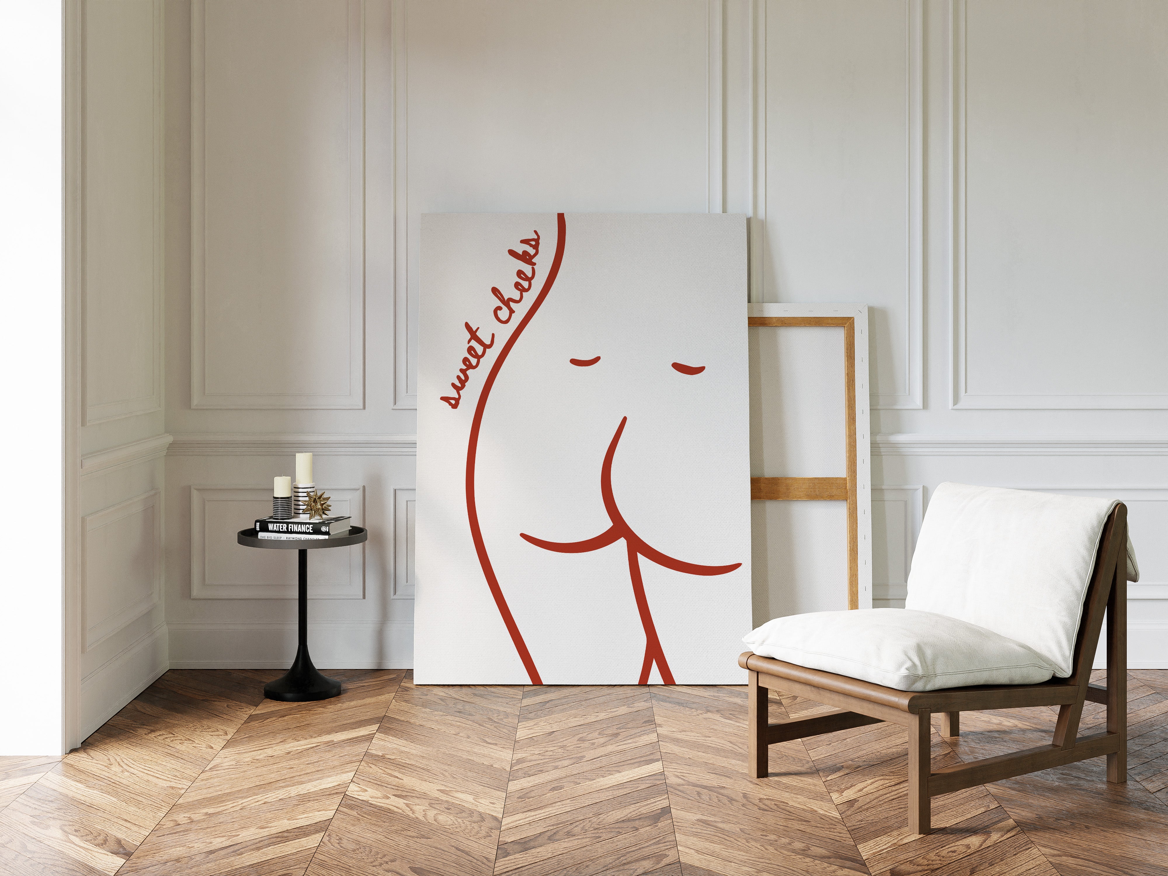 A minimalist red line drawing captures the essence of joy with elegant simplicity. The curved strokes dance across white space, forming a playful expression that speaks volumes through sparing detail. The terracotta hue adds warmth and personality to the contemporary composition, while maintaining a sophisticated restraint. This piece brings a touch of whimsy and modern artistry to any space, perfect for adding character to a clean-lined dining room or bringing life to a minimal home office.