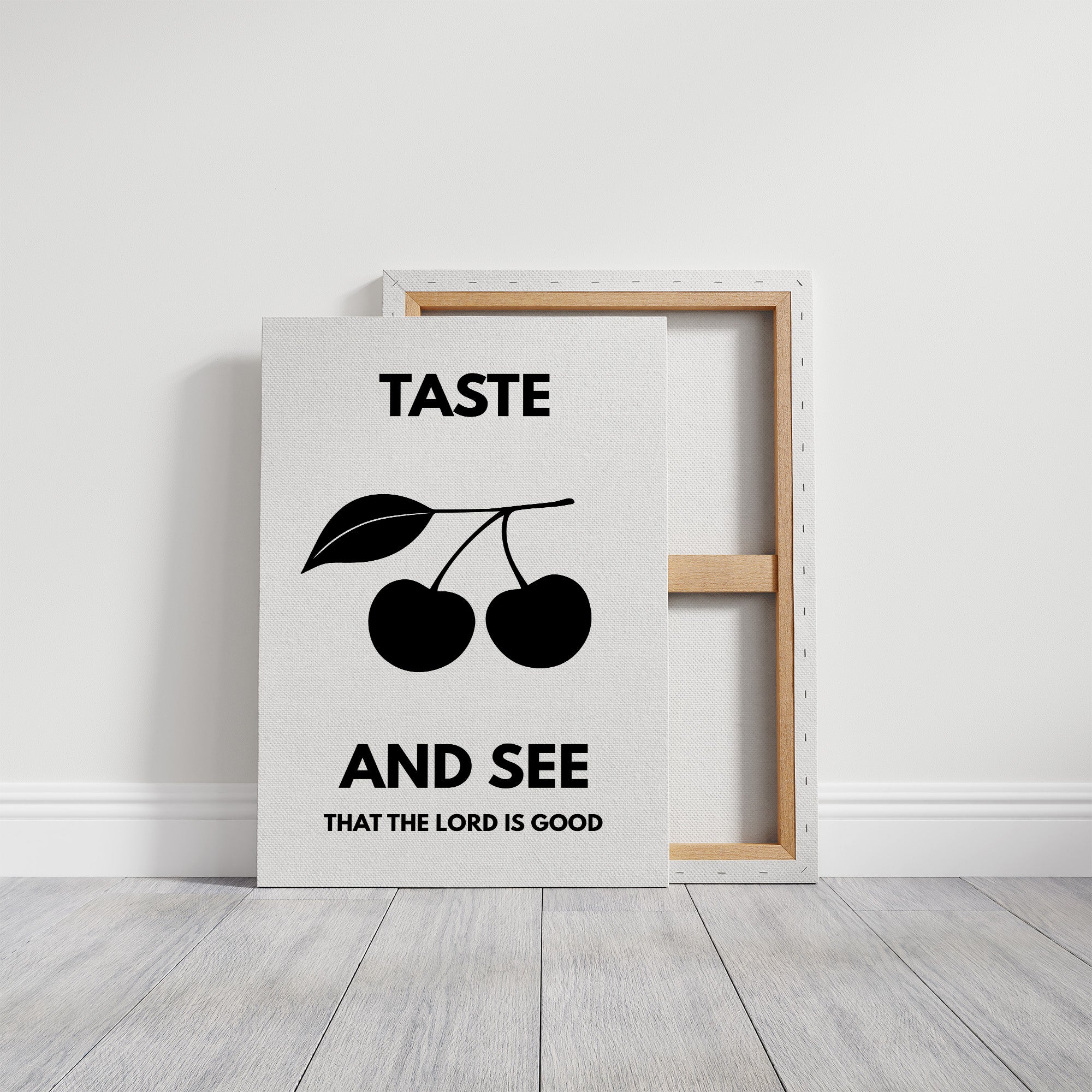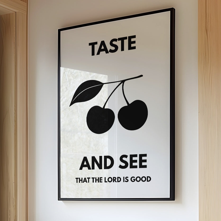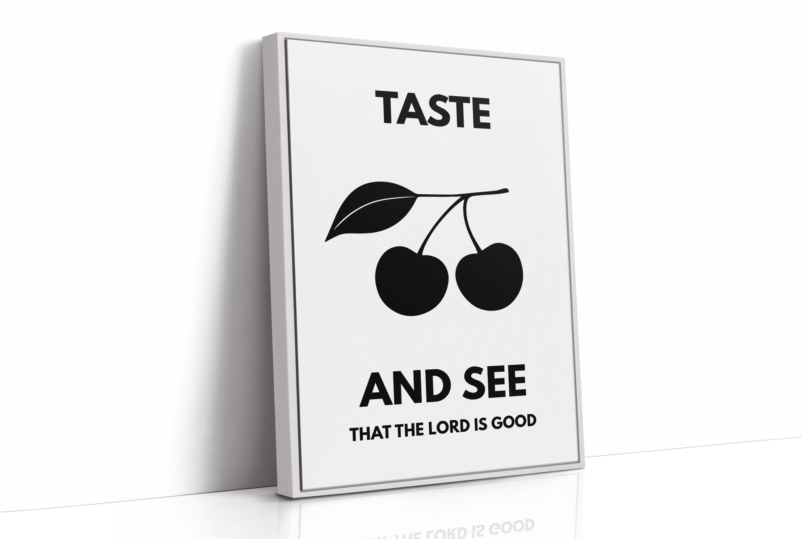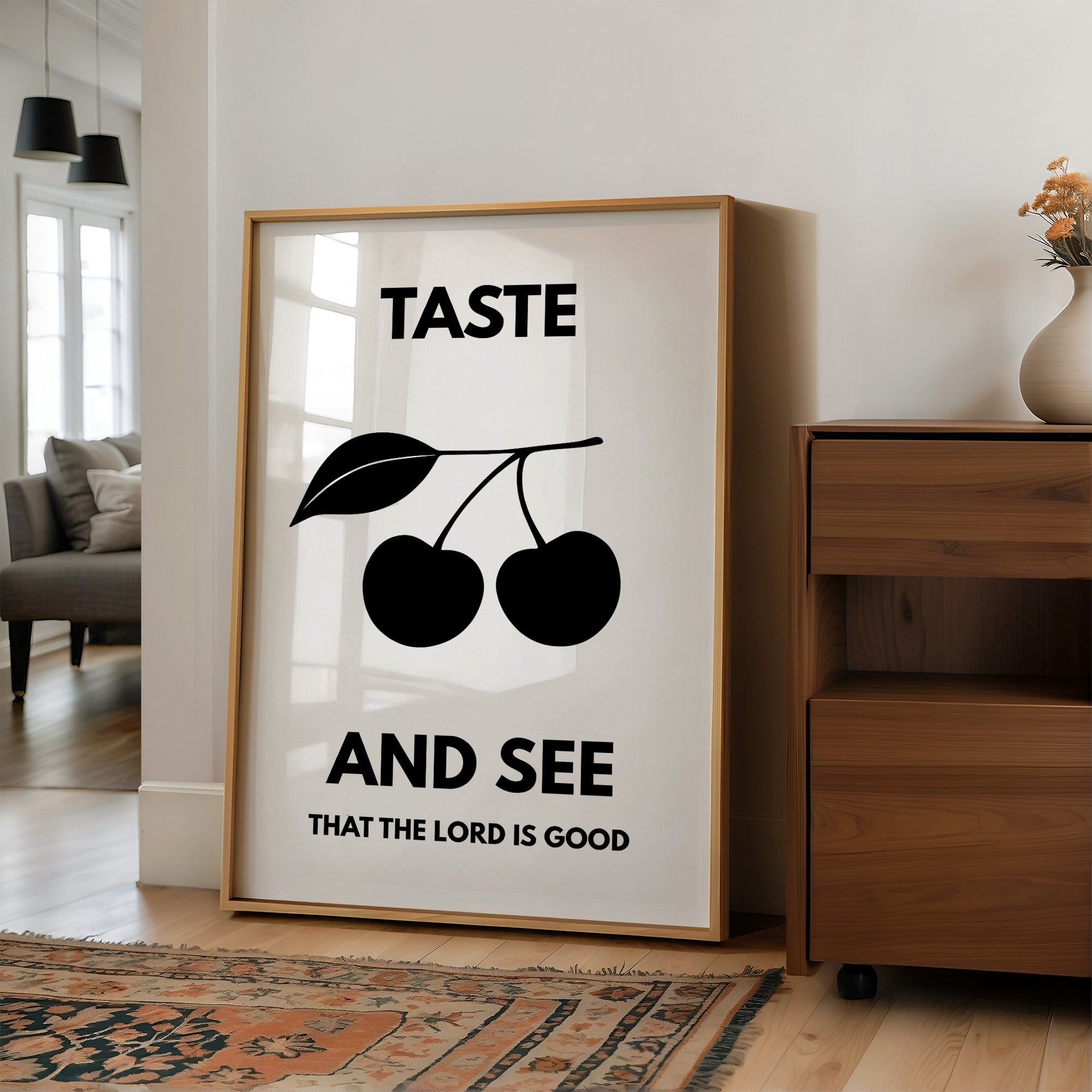 Bold words stand against pristine white, inviting contemplation of life's simple pleasures and deeper truths. The stark silhouette of cherriesnature's perfect sweetnessbridges the powerful biblical phrase with elegant minimalism. Black and white contrast creates a timeless quality, allowing the scripture's message about experiencing divine goodness to resonate with quiet confidence.