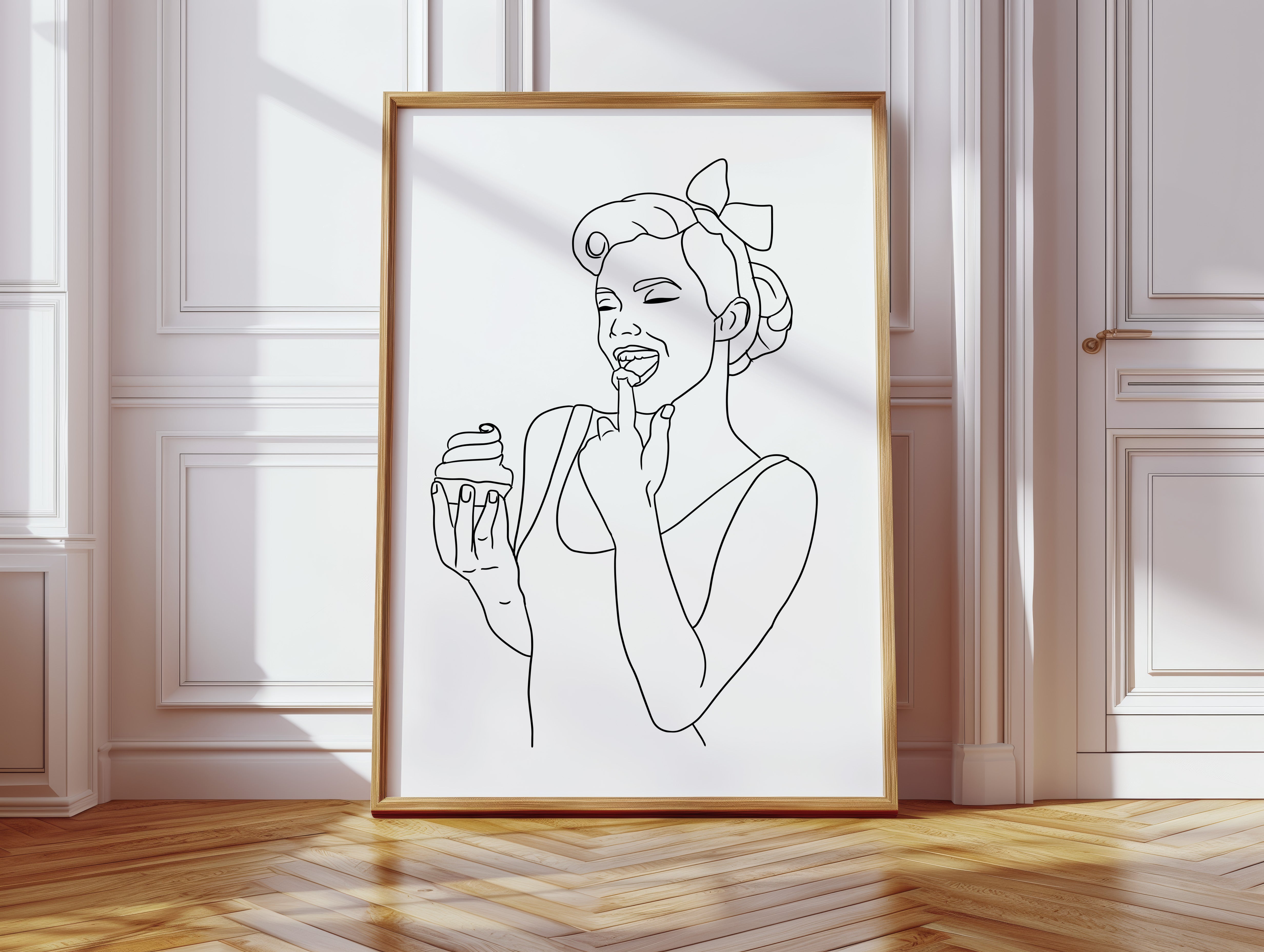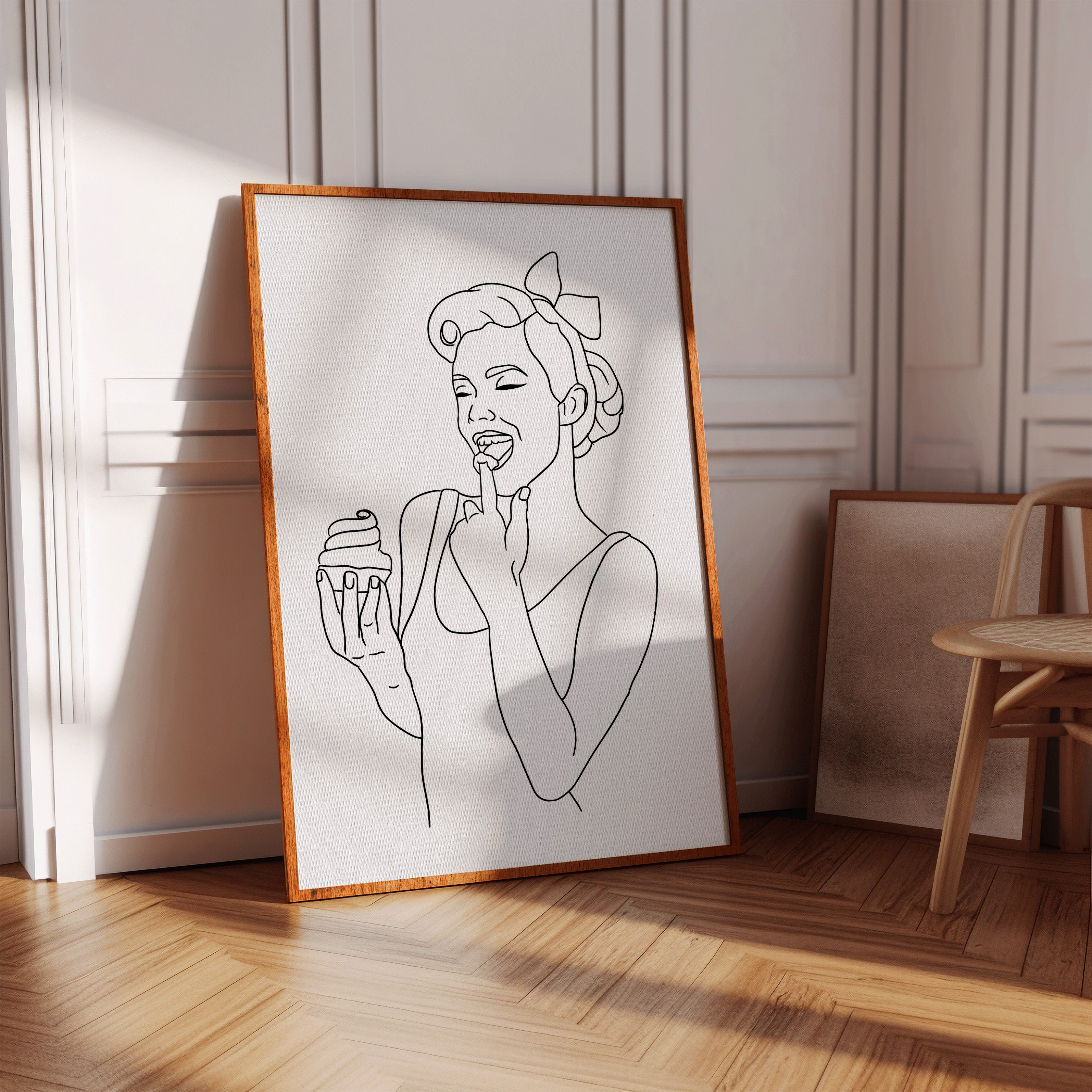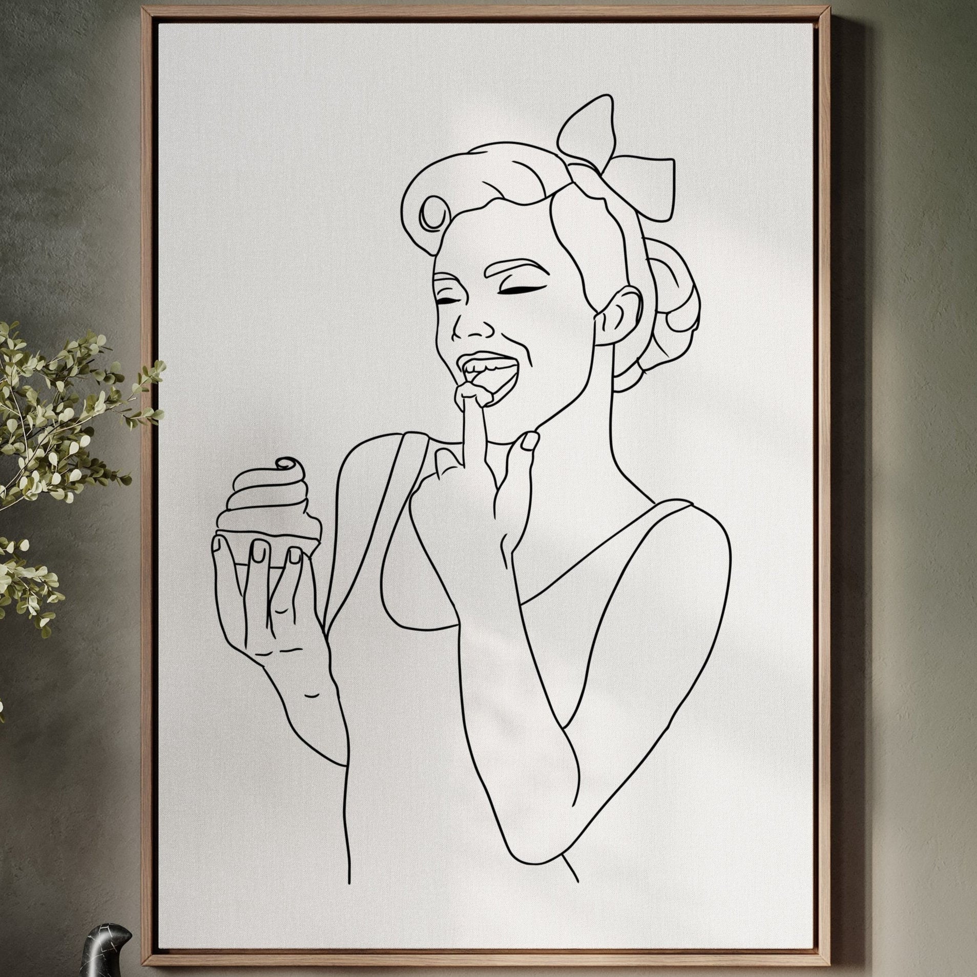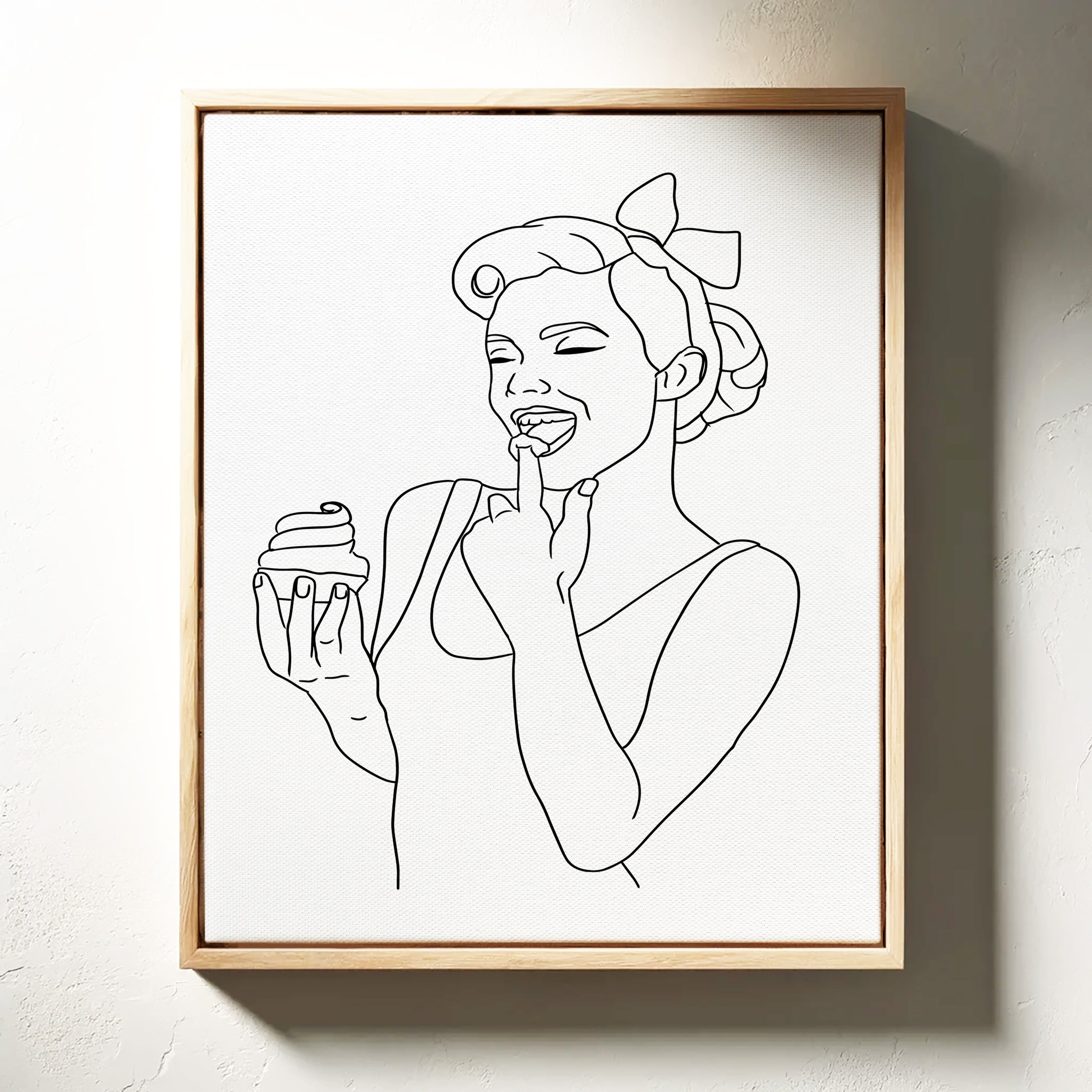 A playful expression captured in minimalist strokes, where joy meets indulgence in a single gesture. This piece belongs to our Contemporary collection, celebrating modern line art's ability to capture fleeting moments of delight. The clean, continuous lines flow with graceful simplicity, creating a portrait of pure pleasure through the interaction with a cupcake. The composition balances negative space with precise detail, letting the viewer's eye dance between the expressive face and the tempting treat. Perfect for adding a touch of whimsy to a kitchen, dining room, or any space where life's simple pleasures are celebrated. The piece invites viewers to pause and savor their own sweet moments.