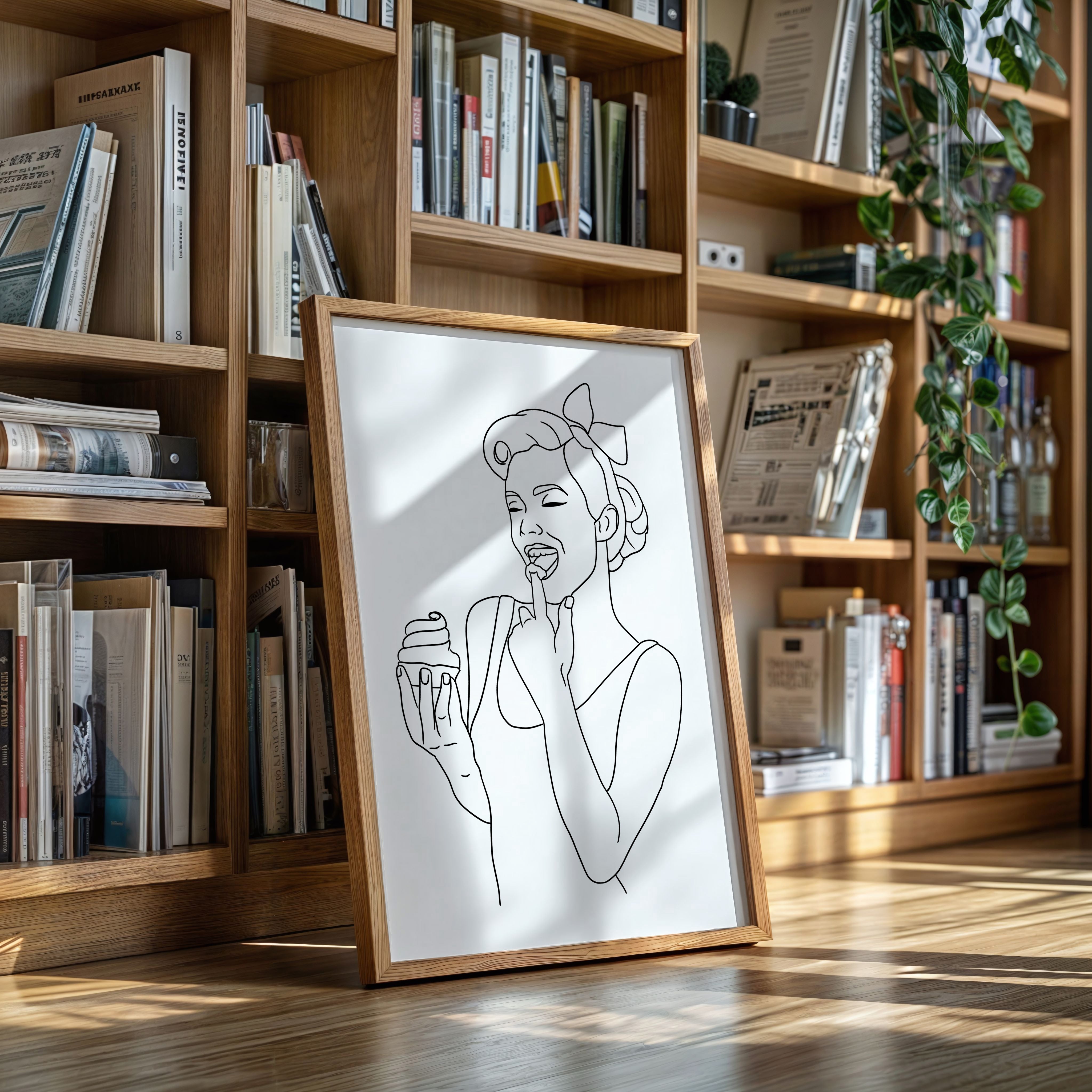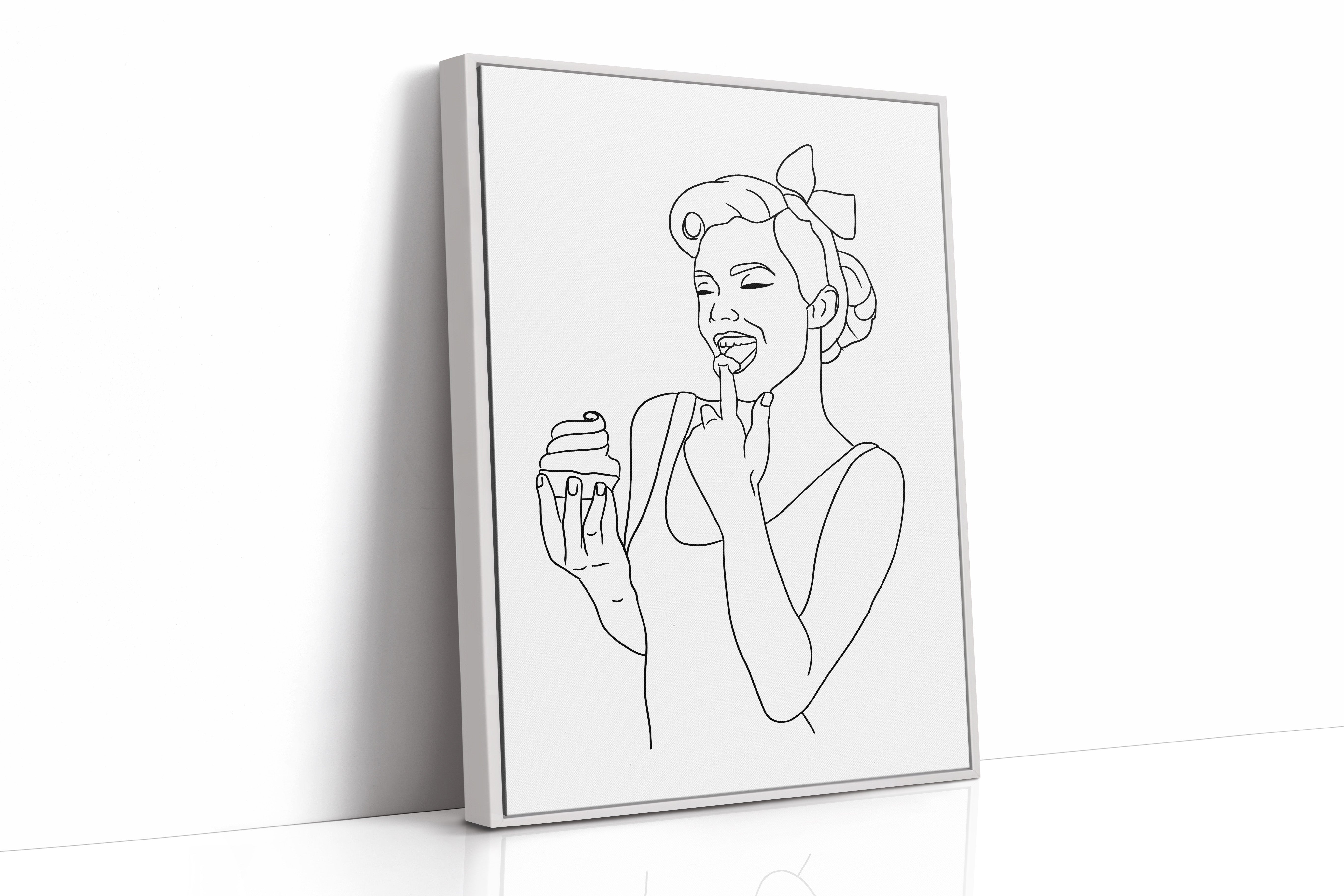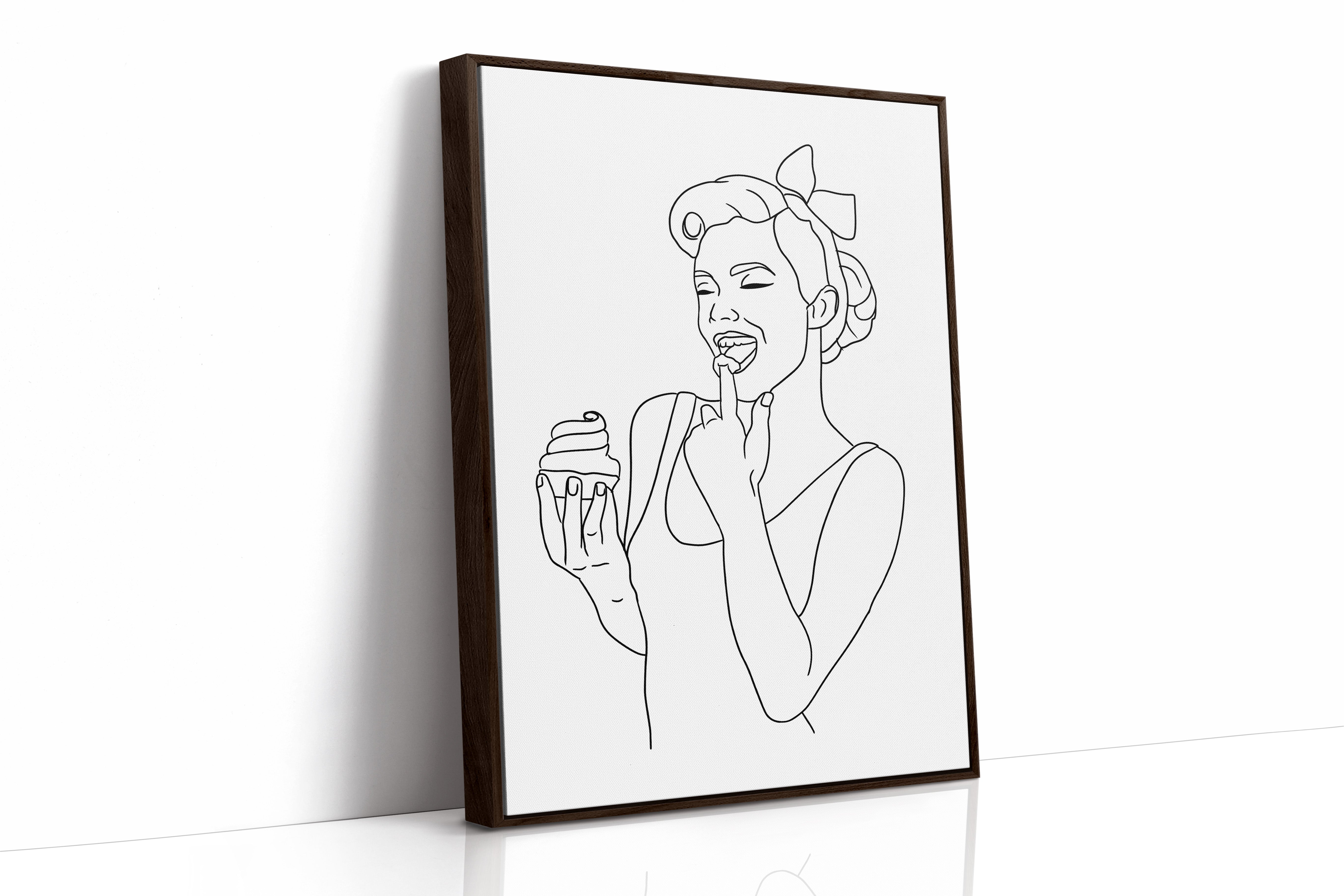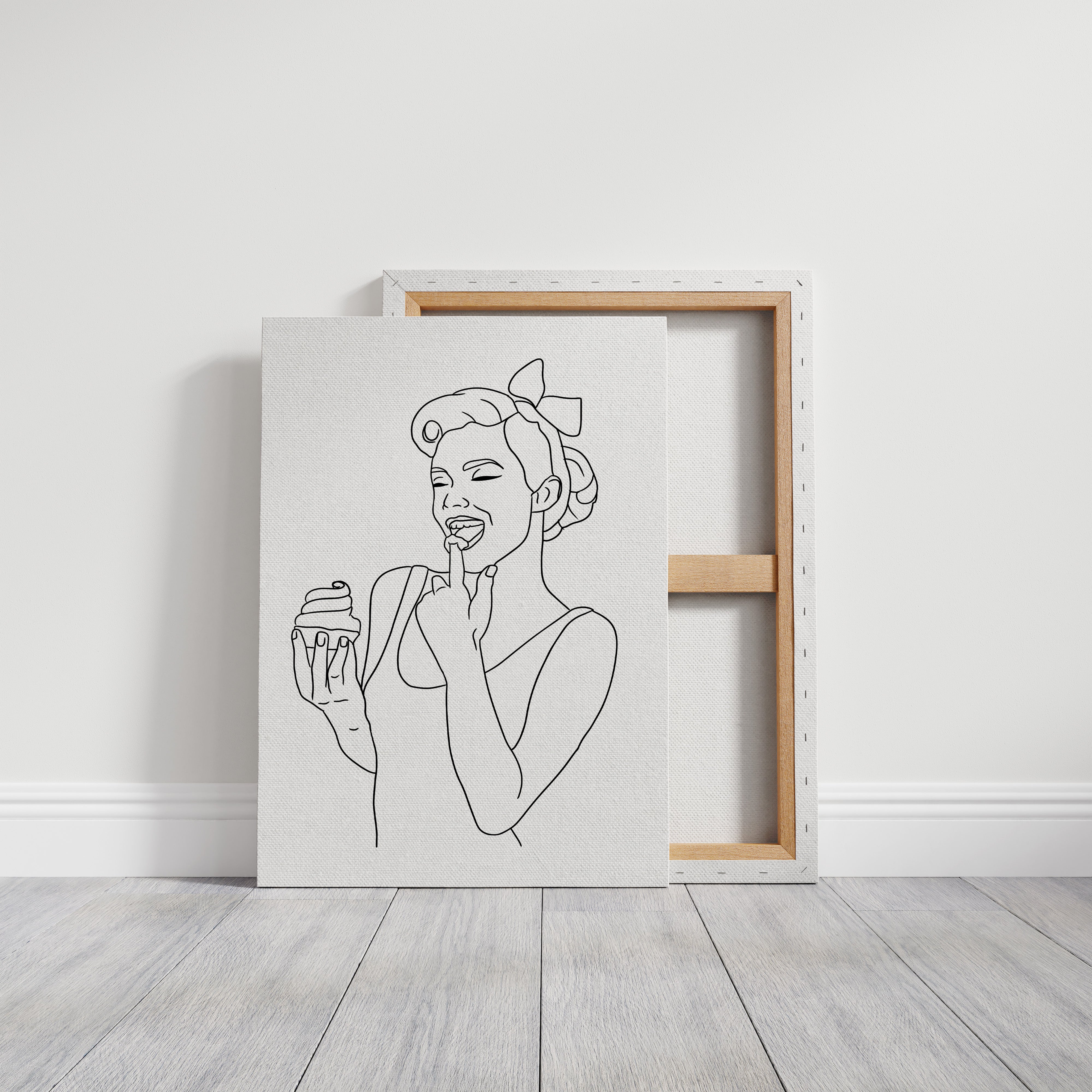 A playful expression captured in minimalist strokes, where joy meets indulgence in a single gesture. This piece belongs to our Contemporary collection, celebrating modern line art's ability to capture fleeting moments of delight. The clean, continuous lines flow with graceful simplicity, creating a portrait of pure pleasure through the interaction with a cupcake. The composition balances negative space with precise detail, letting the viewer's eye dance between the expressive face and the tempting treat. Perfect for adding a touch of whimsy to a kitchen, dining room, or any space where life's simple pleasures are celebrated. The piece invites viewers to pause and savor their own sweet moments.