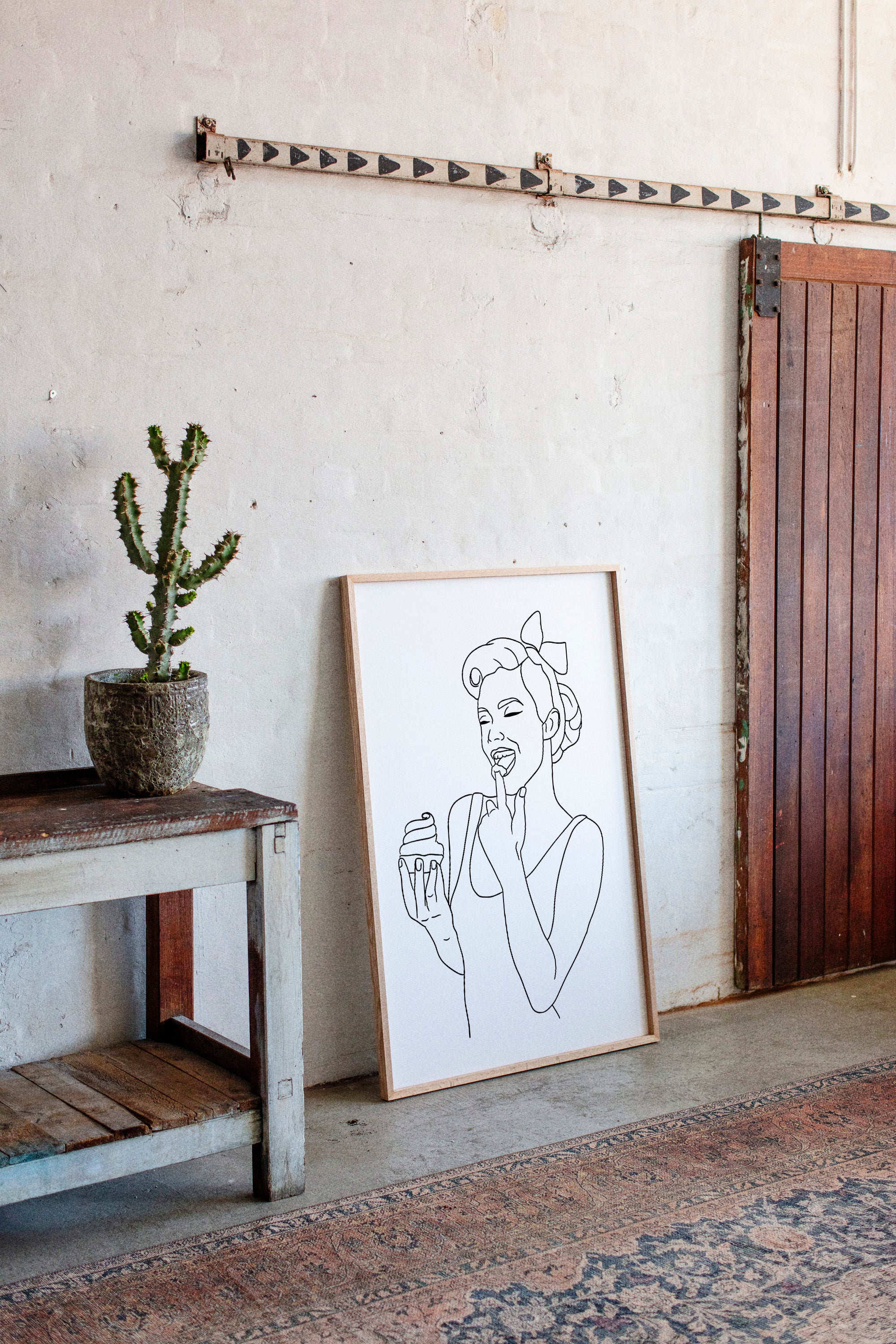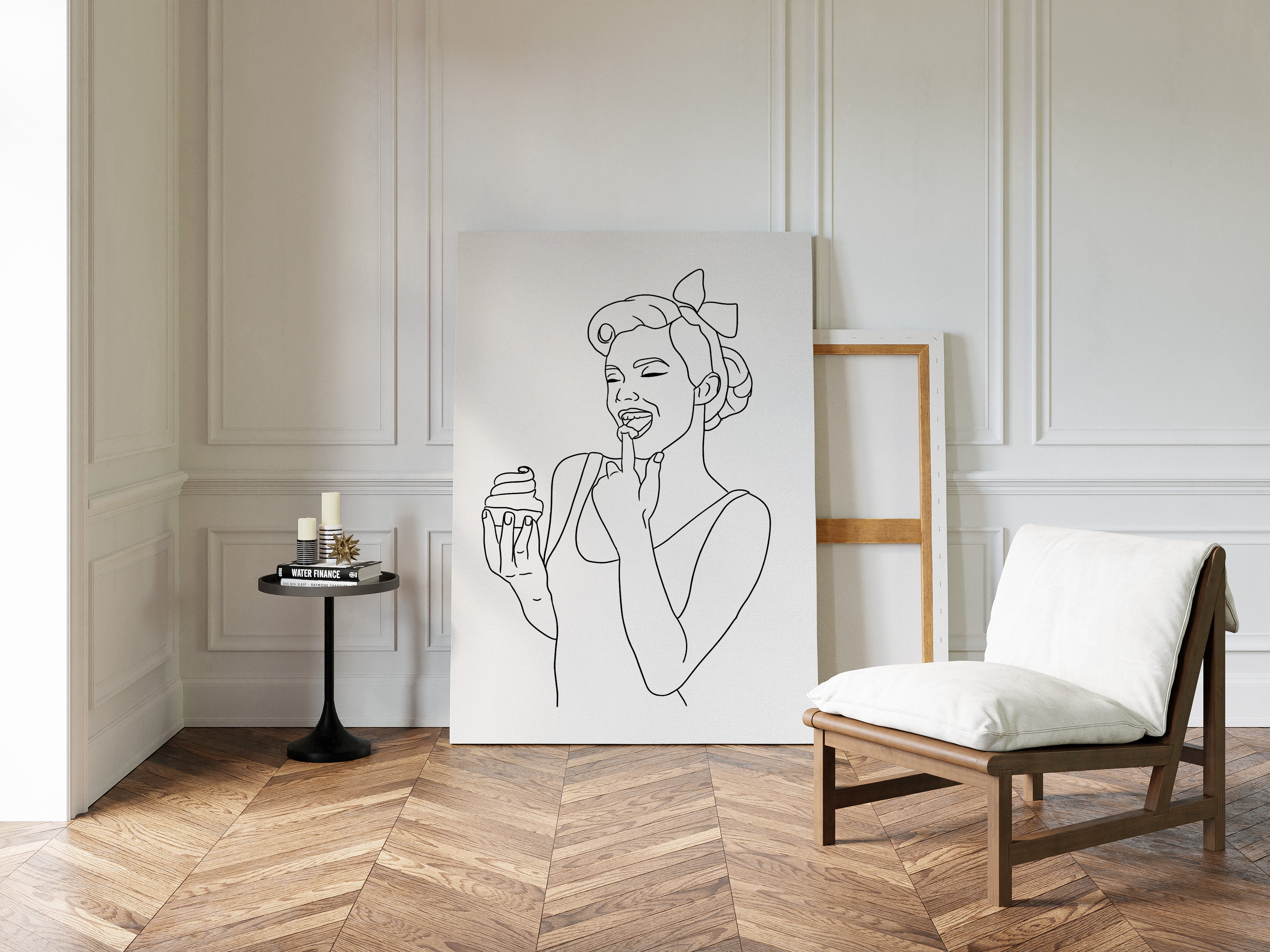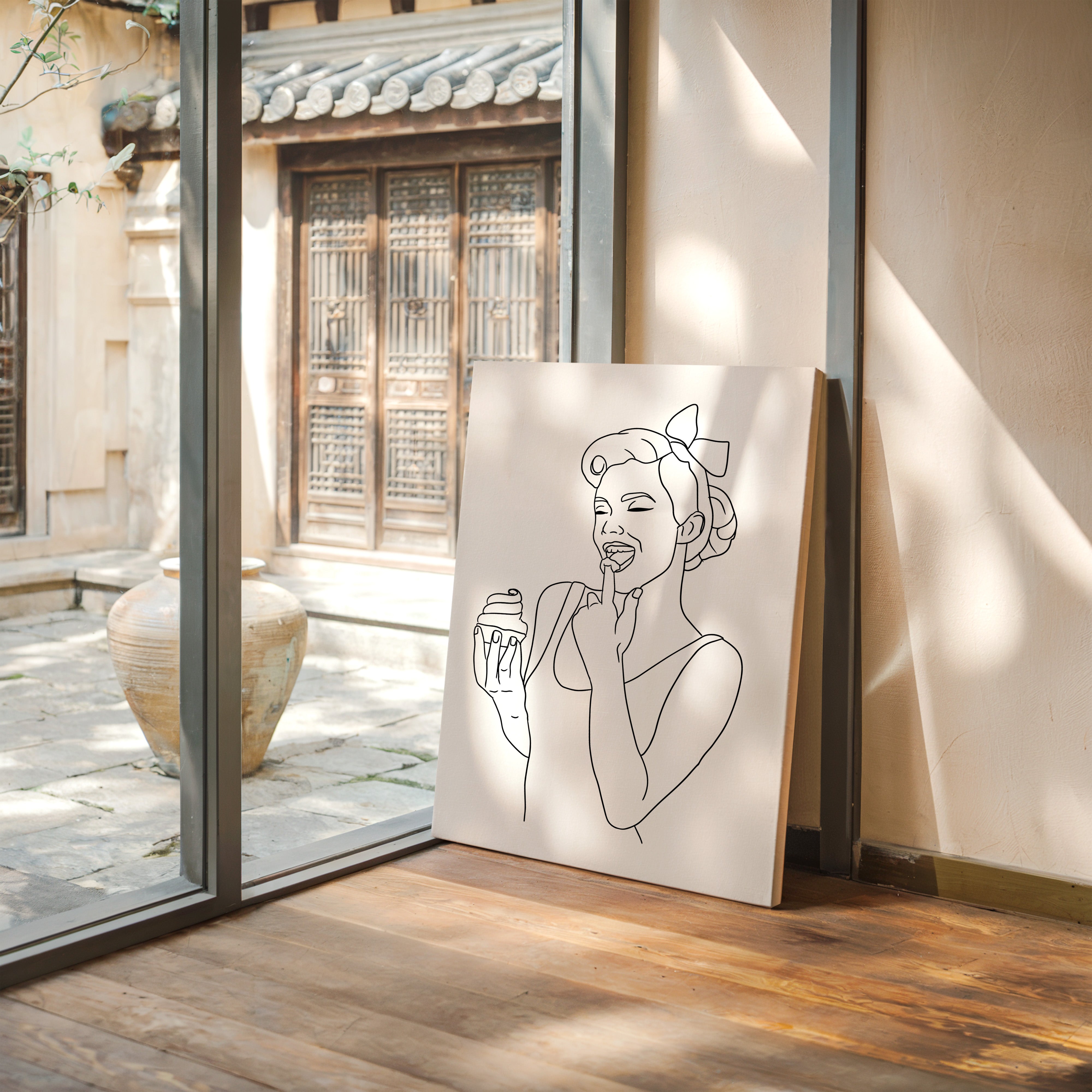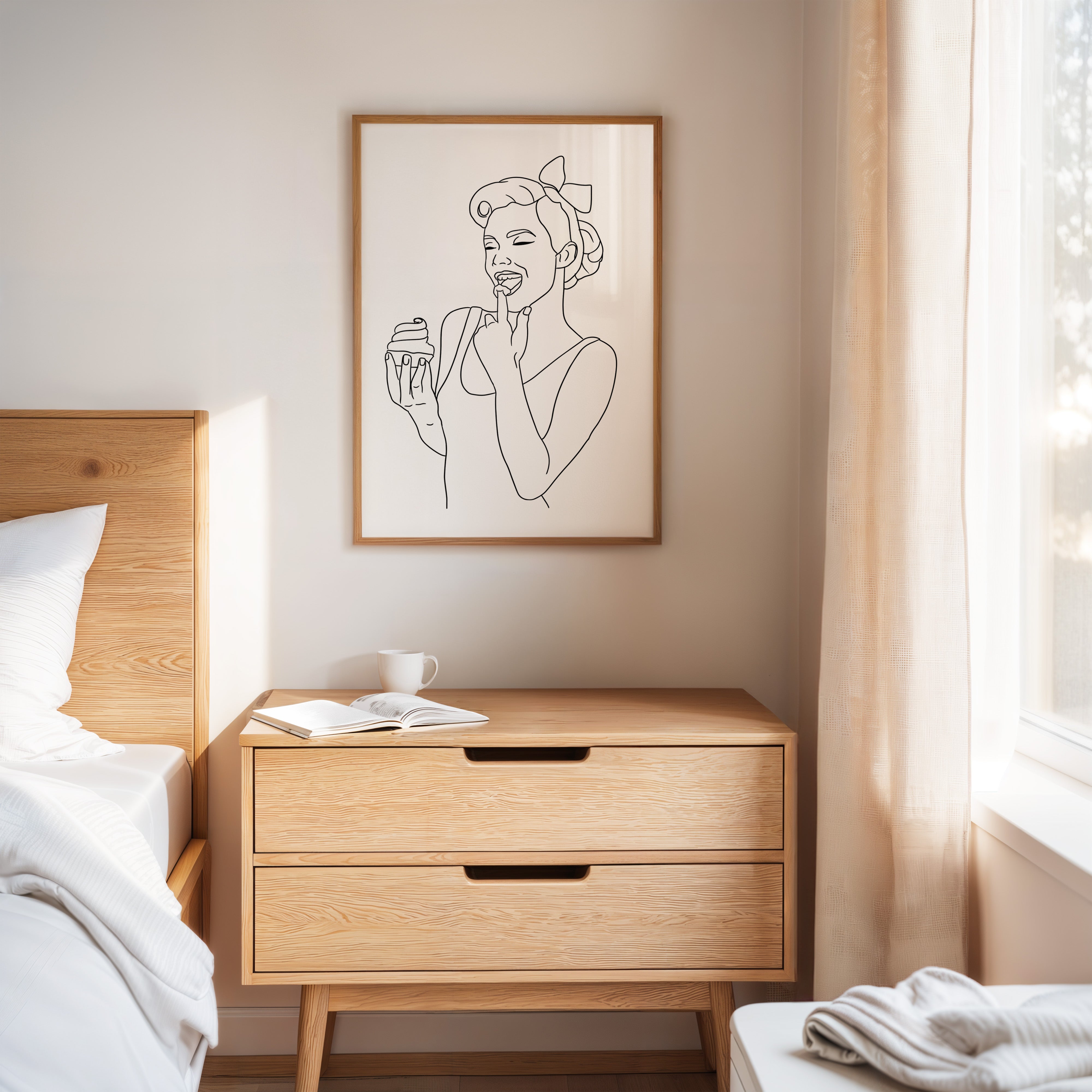 A playful expression captured in minimalist strokes, where joy meets indulgence in a single gesture. This piece belongs to our Contemporary collection, celebrating modern line art's ability to capture fleeting moments of delight. The clean, continuous lines flow with graceful simplicity, creating a portrait of pure pleasure through the interaction with a cupcake. The composition balances negative space with precise detail, letting the viewer's eye dance between the expressive face and the tempting treat. Perfect for adding a touch of whimsy to a kitchen, dining room, or any space where life's simple pleasures are celebrated. The piece invites viewers to pause and savor their own sweet moments.