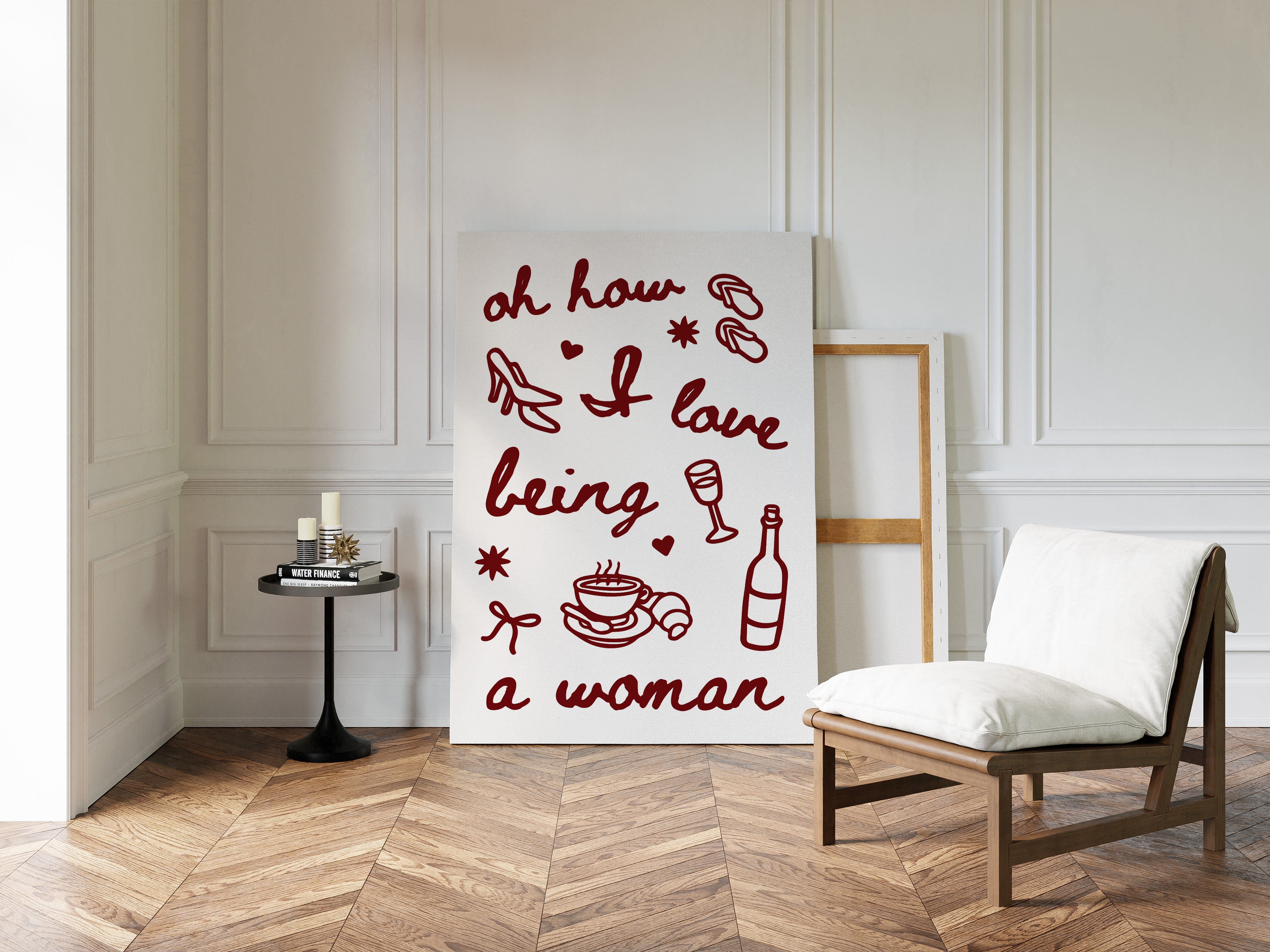 Delicate hand-drawn illustrations dance across pristine white space, each burgundy stroke telling stories of life's simple pleasures. The flowing script and playful icons create an intimate narrative of leisure and luxury - from steaming coffee cups to elegant wine glasses. These whimsical vignettes celebrate the art of slowing down and savoring each moment. The minimalist design speaks to modern sensibilities while maintaining a warm, personal touch that feels both sophisticated and approachable. Perfect for adding a touch of feminine charm to a home office, dressing room, or cozy reading nook.