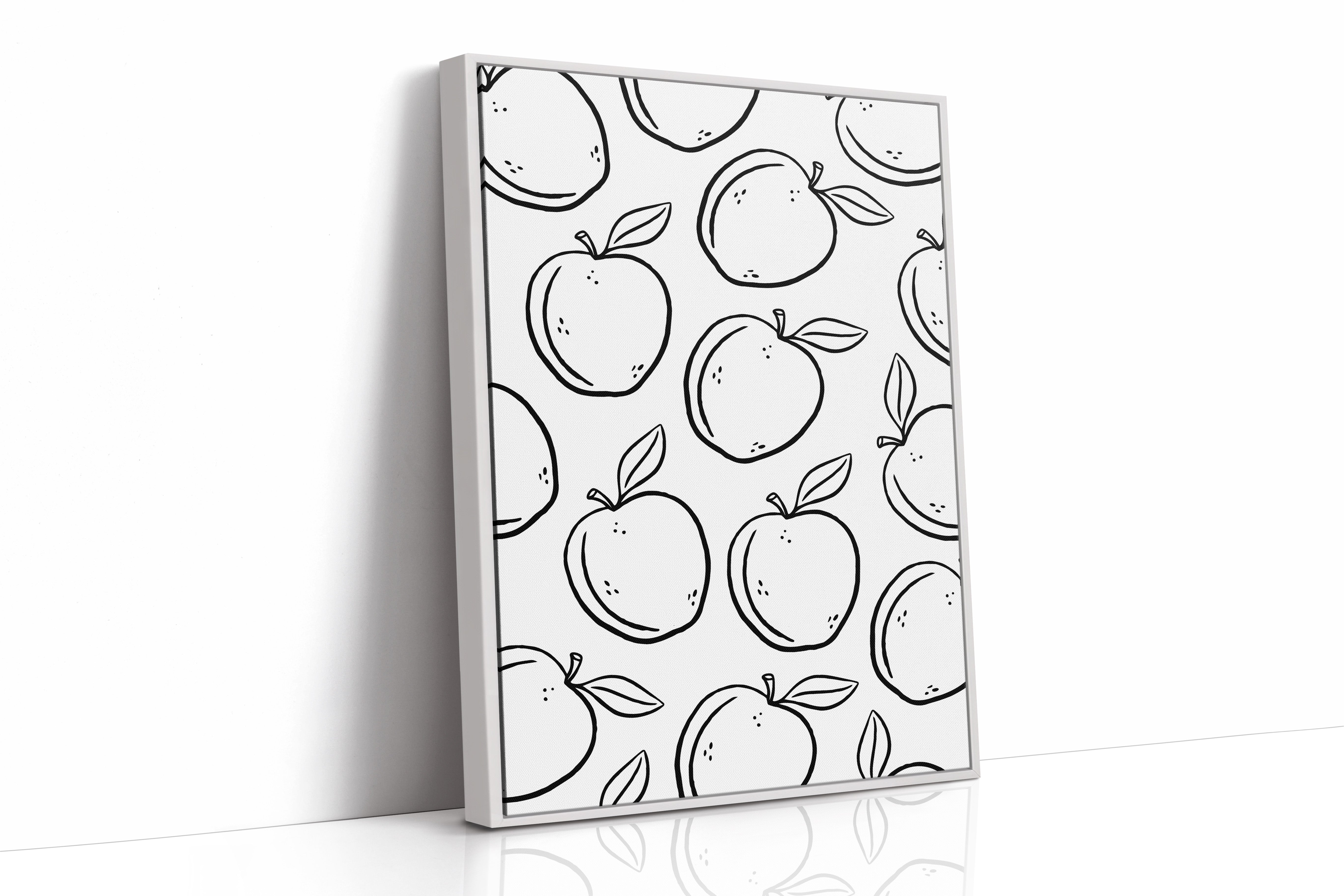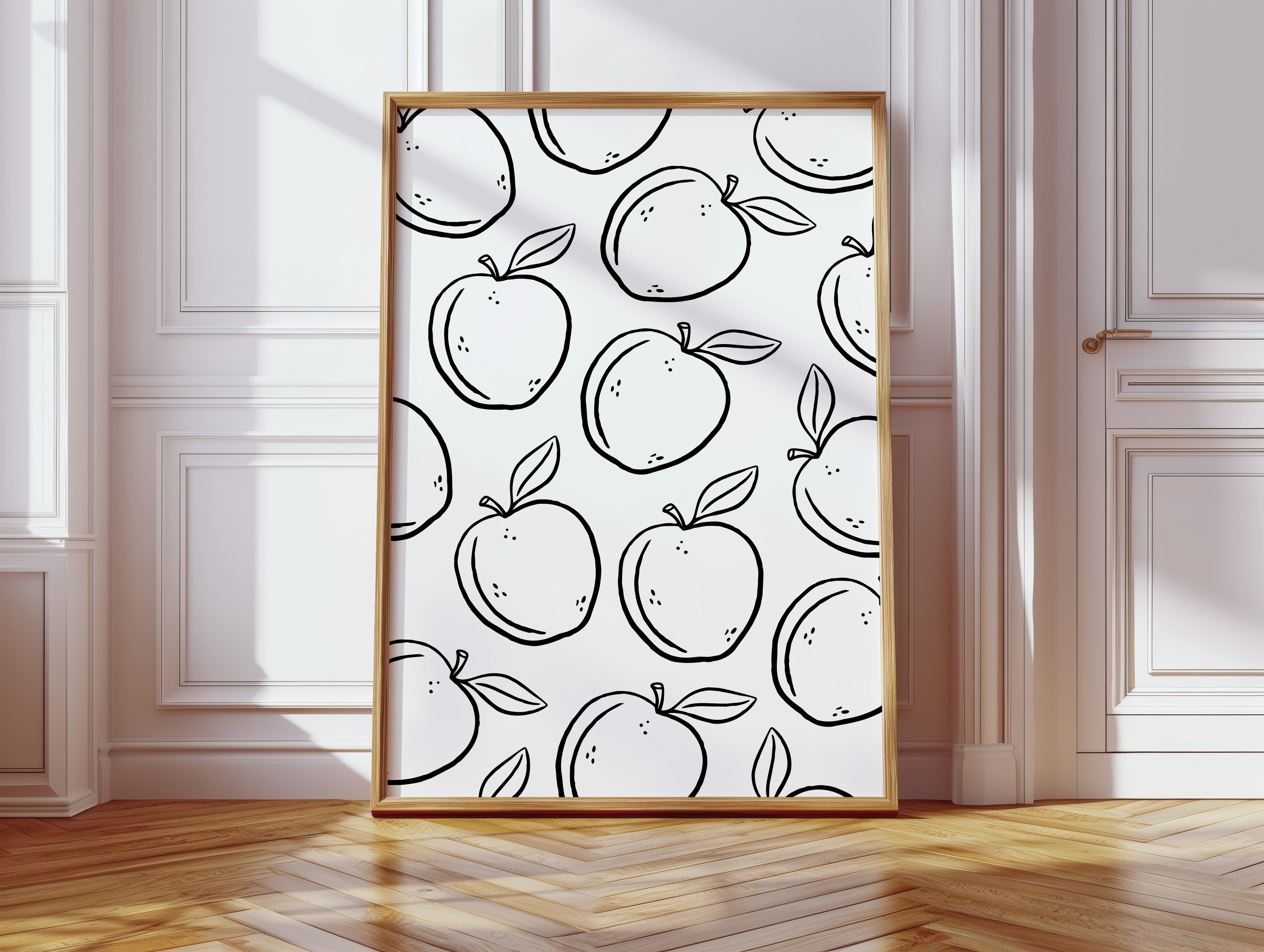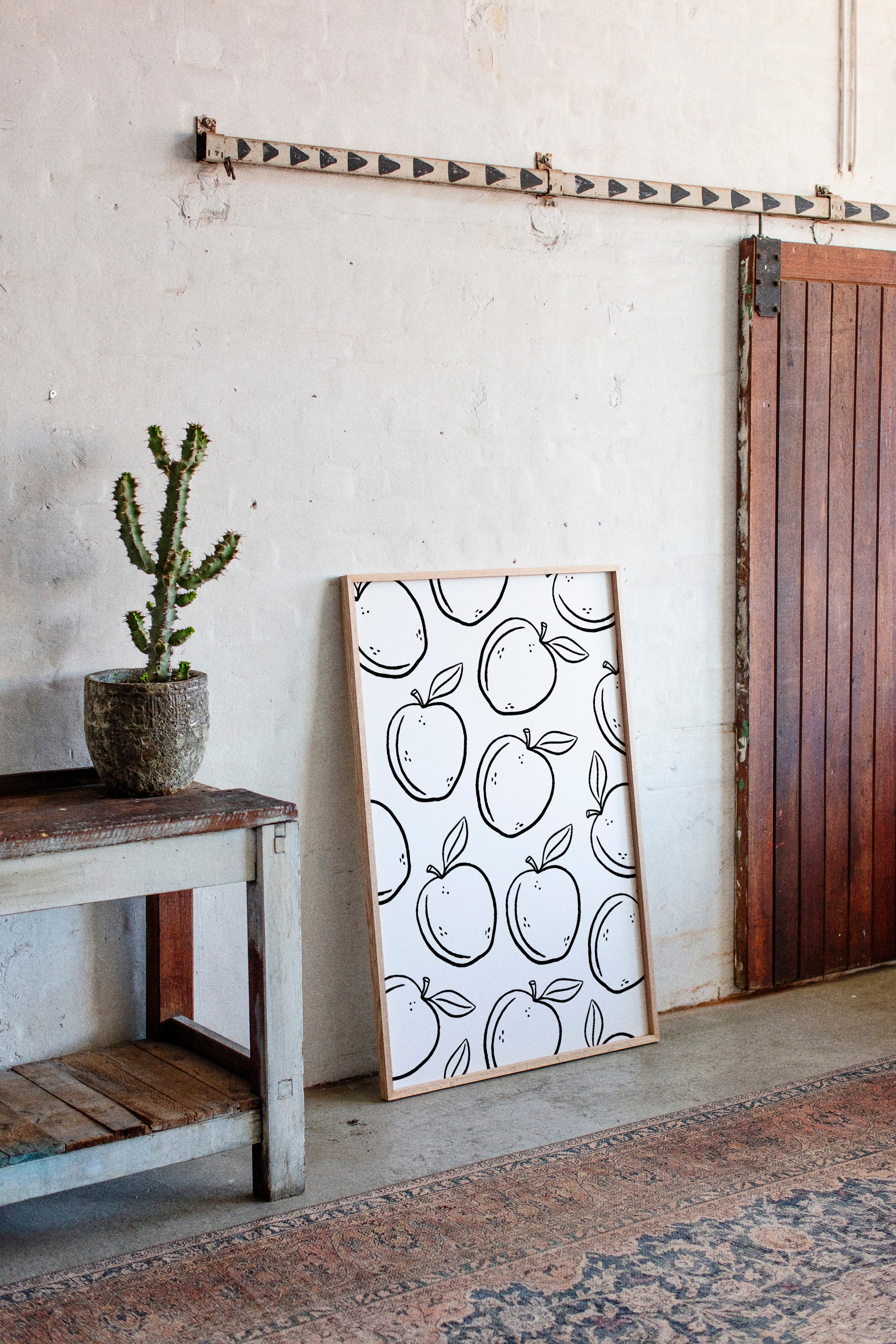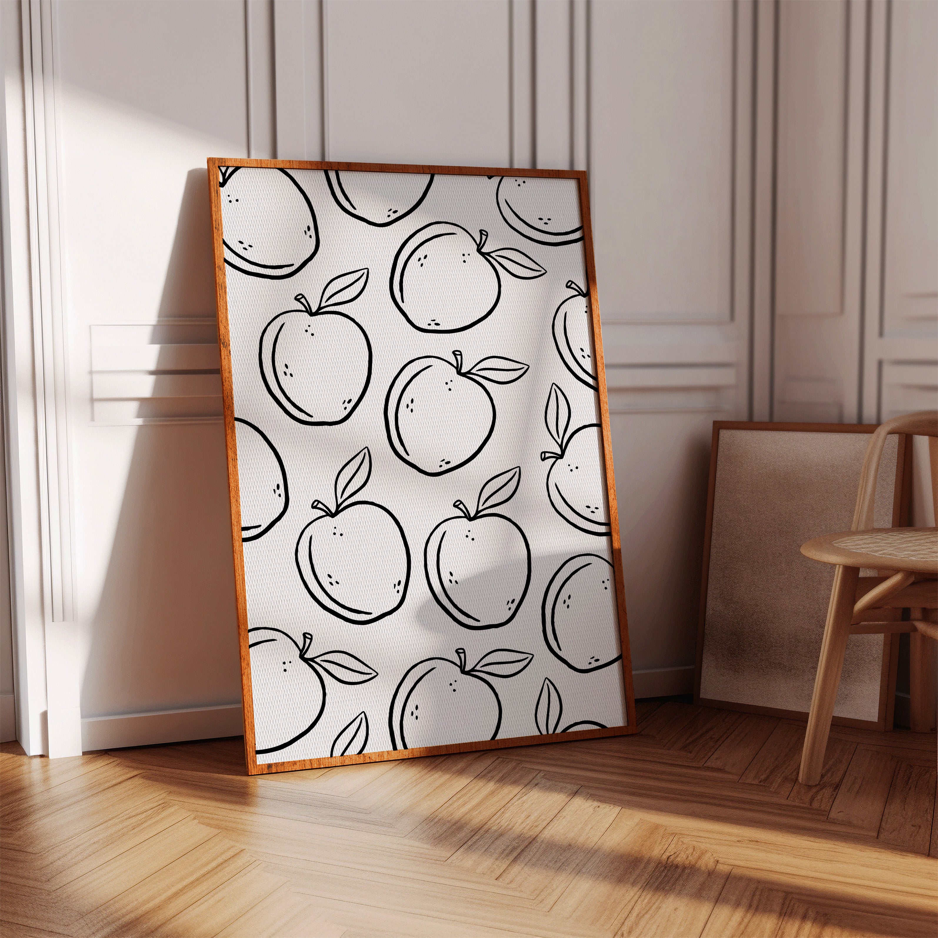 Simple strokes capture the essence of autumn's bounty, where apples float in an elegant dance against pristine white. This piece from our Contemporary collection celebrates minimalist line art with playful sophistication. Each apple is rendered with delicate precision, their curved forms and gentle leaves creating a rhythmic pattern that speaks to nature's perfect geometry. The clean black and white palette brings a modern edge to a timeless subject, while maintaining an air of botanical charm. This piece would bring a fresh, organic energy to a modern kitchen or dining space, perfectly balancing simplicity with visual interest.
