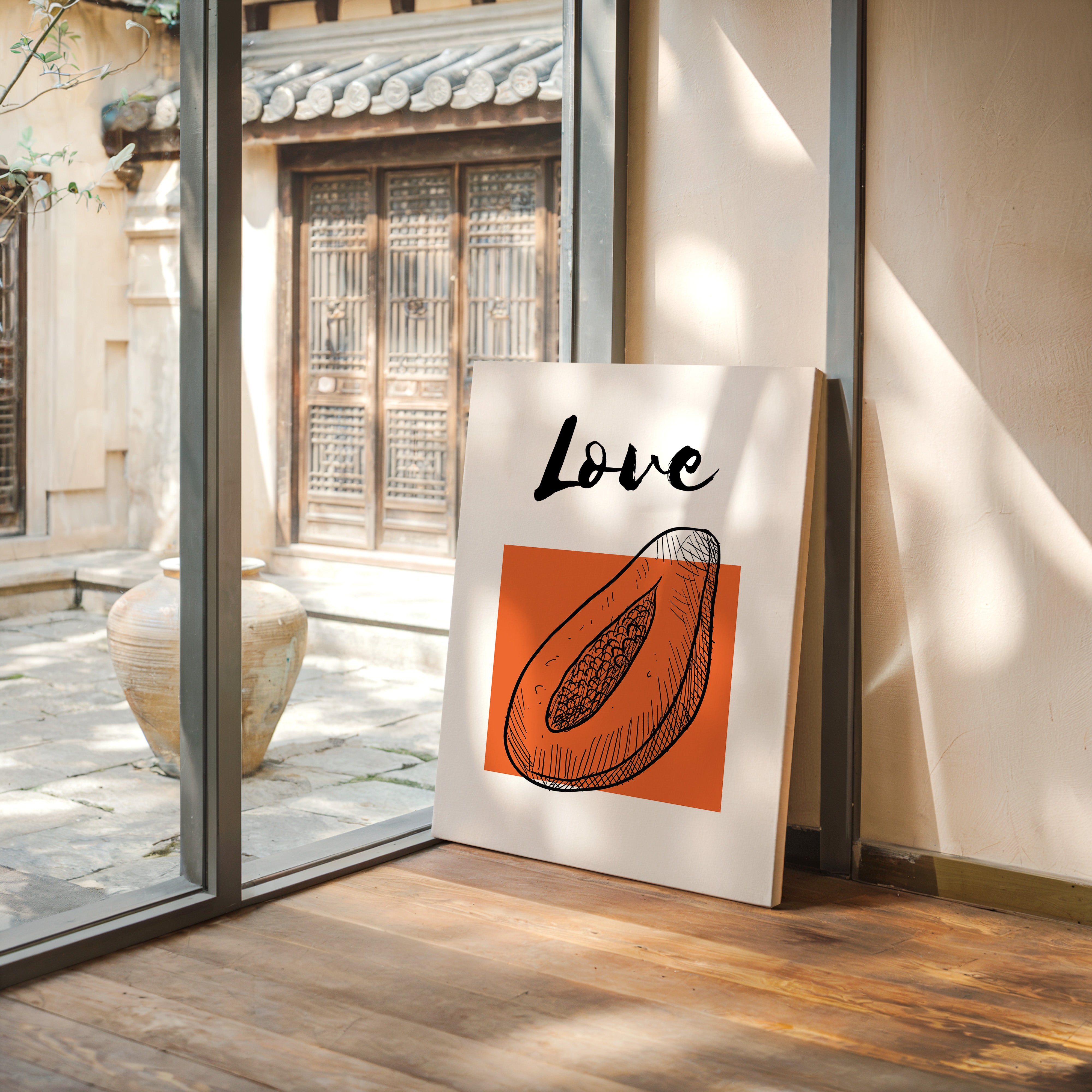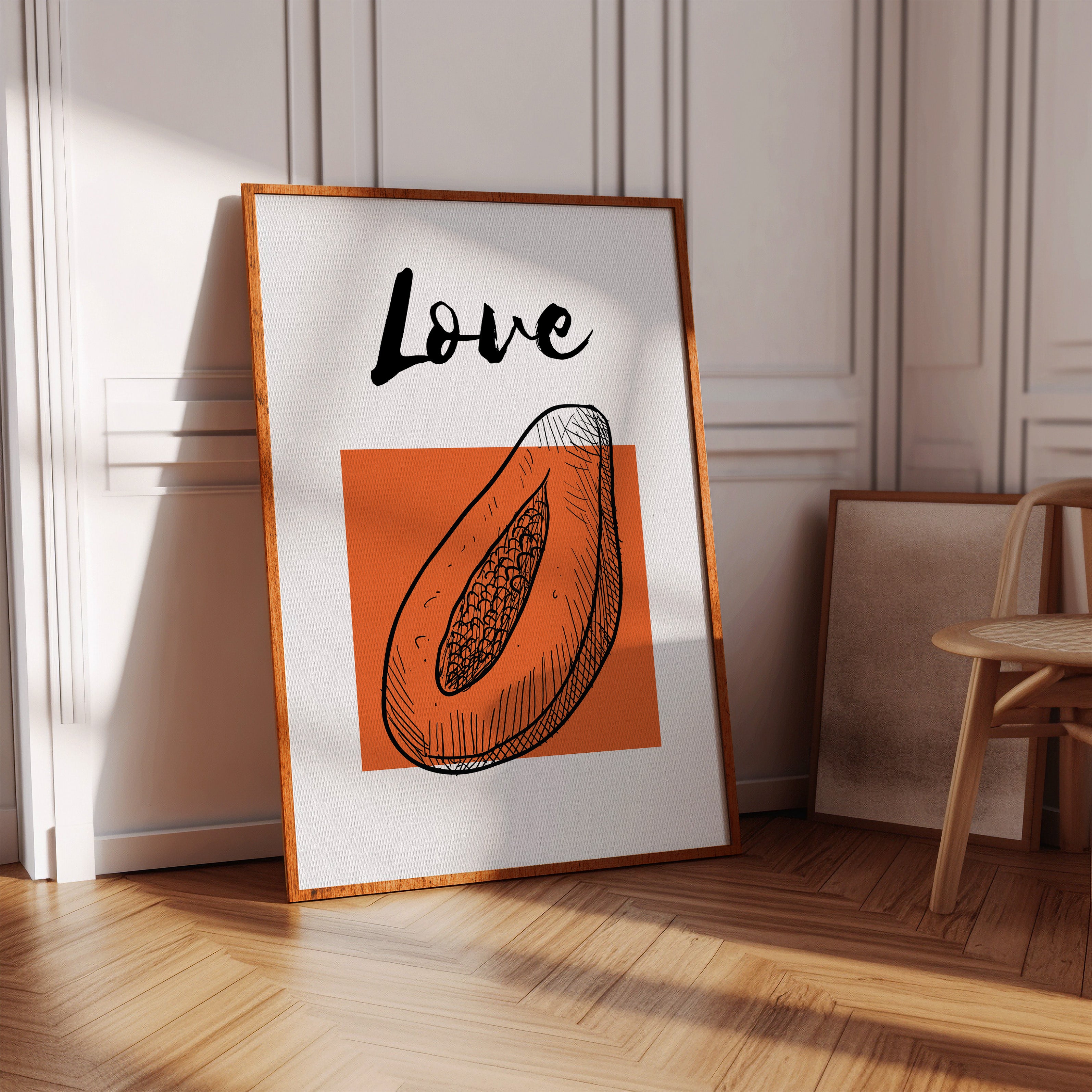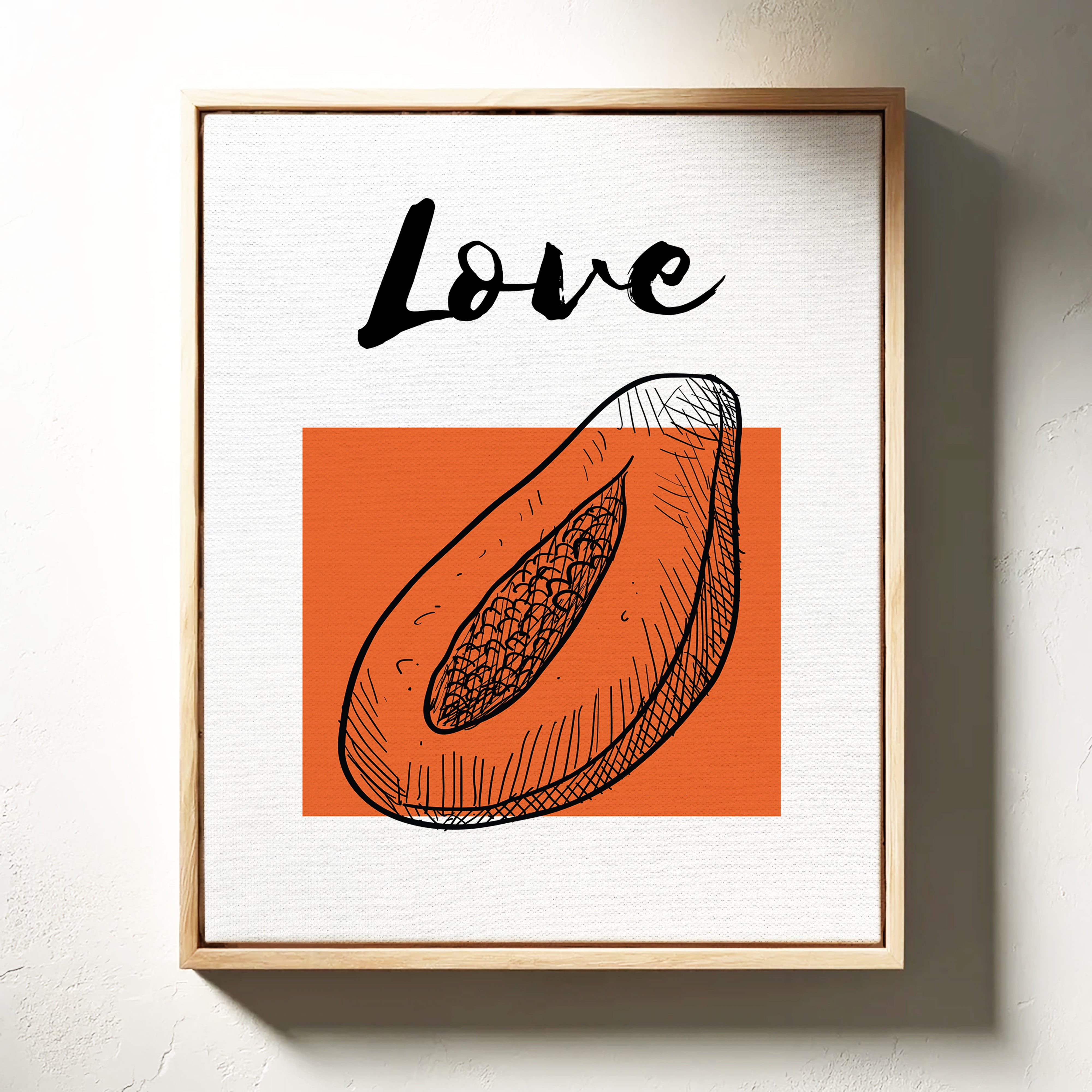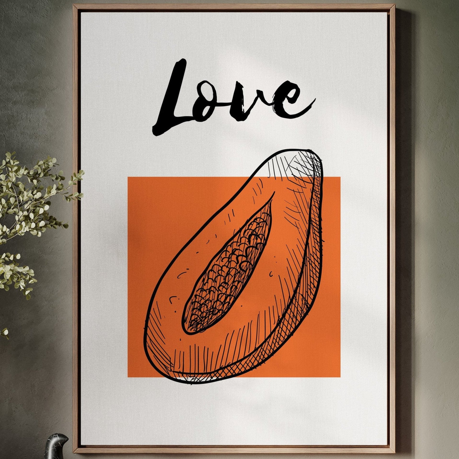A bold brushstroke of love floats above a sun-ripened papaya, capturing the essence of tropical sweetness. This piece from our Contemporary collection marries minimalist line art with vibrant coral energy. The contrast between the delicate black ink drawing and the warm orange background creates a playful dialogue, while the hand-drawn quality adds an intimate, personal touch to the modern composition. Perfect for bringing a splash of warmth to a kitchen or dining space, this piece invites conversations about the simple pleasures of summer fruits and heartfelt moments. Each viewing reveals new details in the careful crosshatching and organic curves of the illustration.