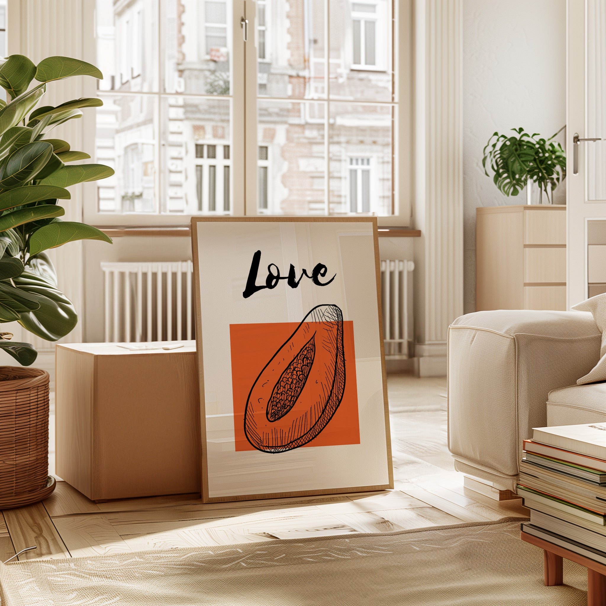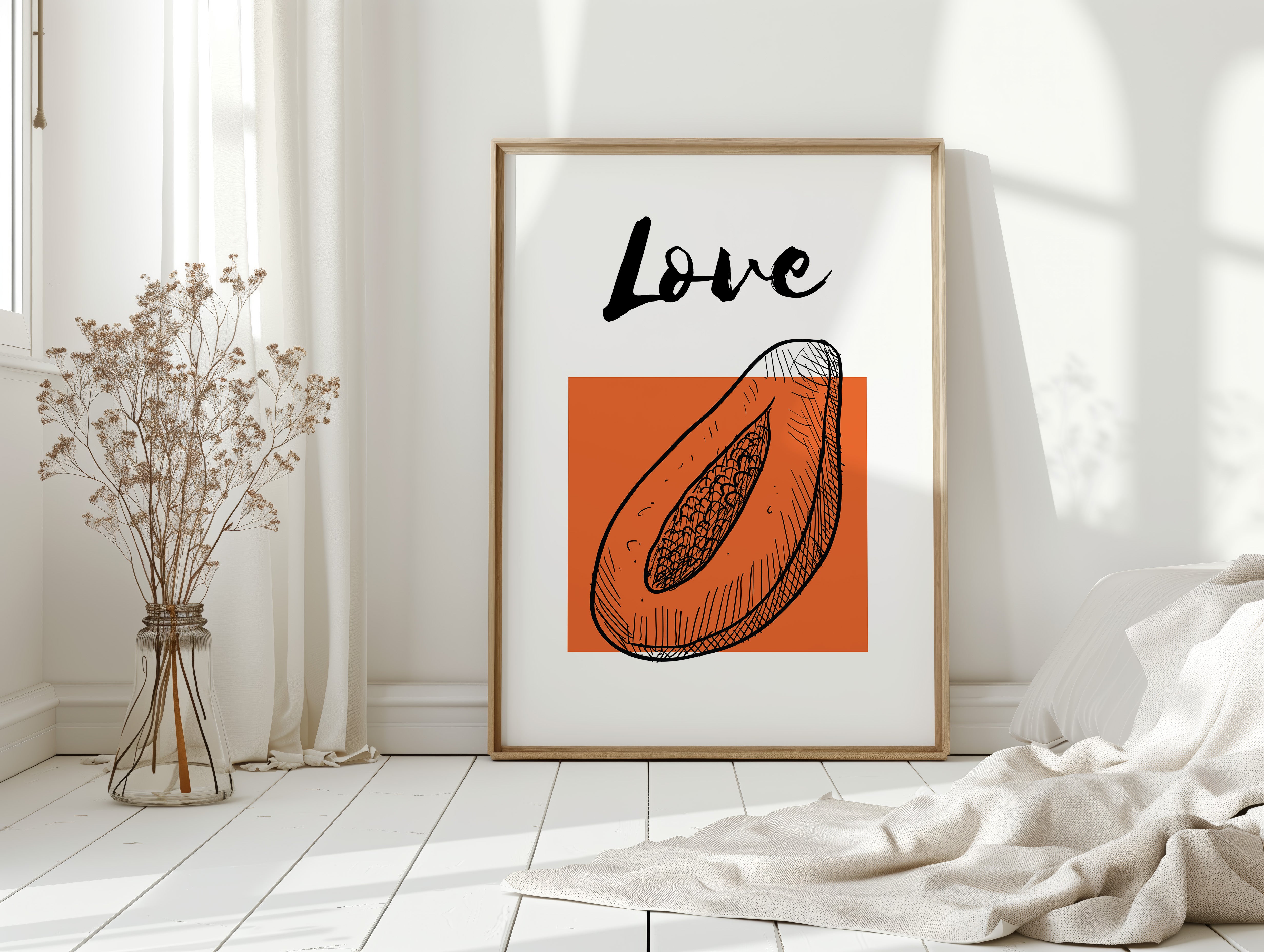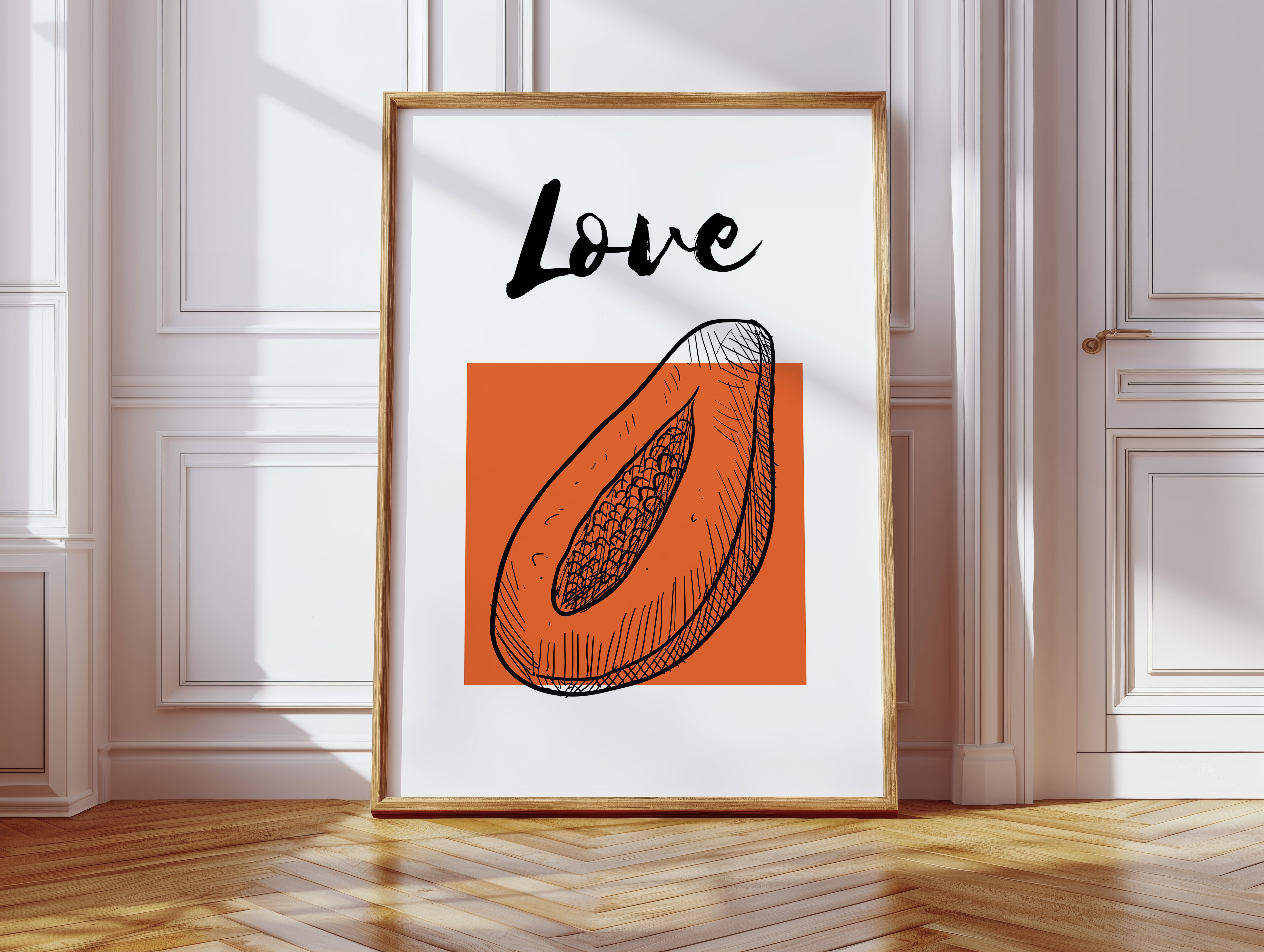 A bold brushstroke of love floats above a sun-ripened papaya, capturing the essence of tropical sweetness. This piece from our Contemporary collection marries minimalist line art with vibrant coral energy. The contrast between the delicate black ink drawing and the warm orange background creates a playful dialogue, while the hand-drawn quality adds an intimate, personal touch to the modern composition. Perfect for bringing a splash of warmth to a kitchen or dining space, this piece invites conversations about the simple pleasures of summer fruits and heartfelt moments. Each viewing reveals new details in the careful crosshatching and organic curves of the illustration.