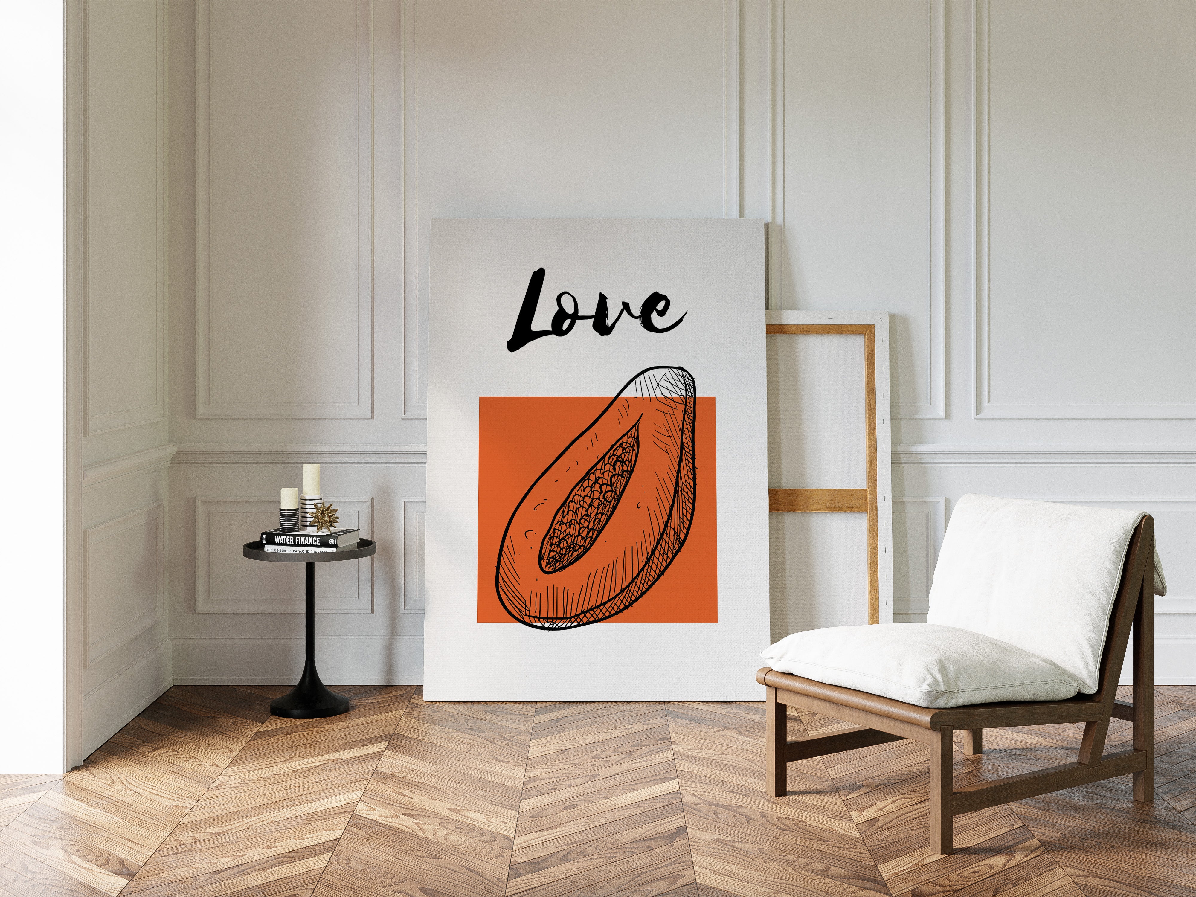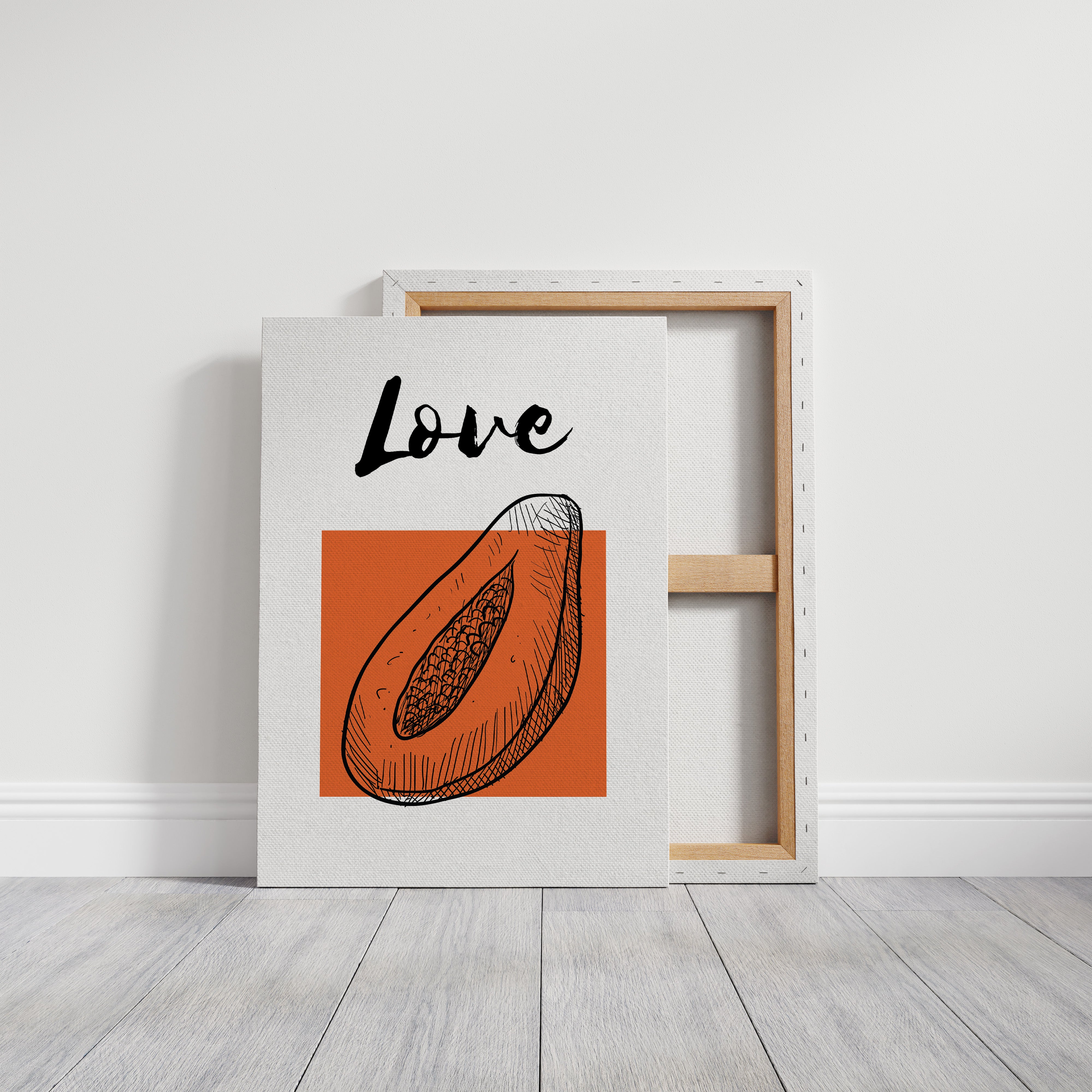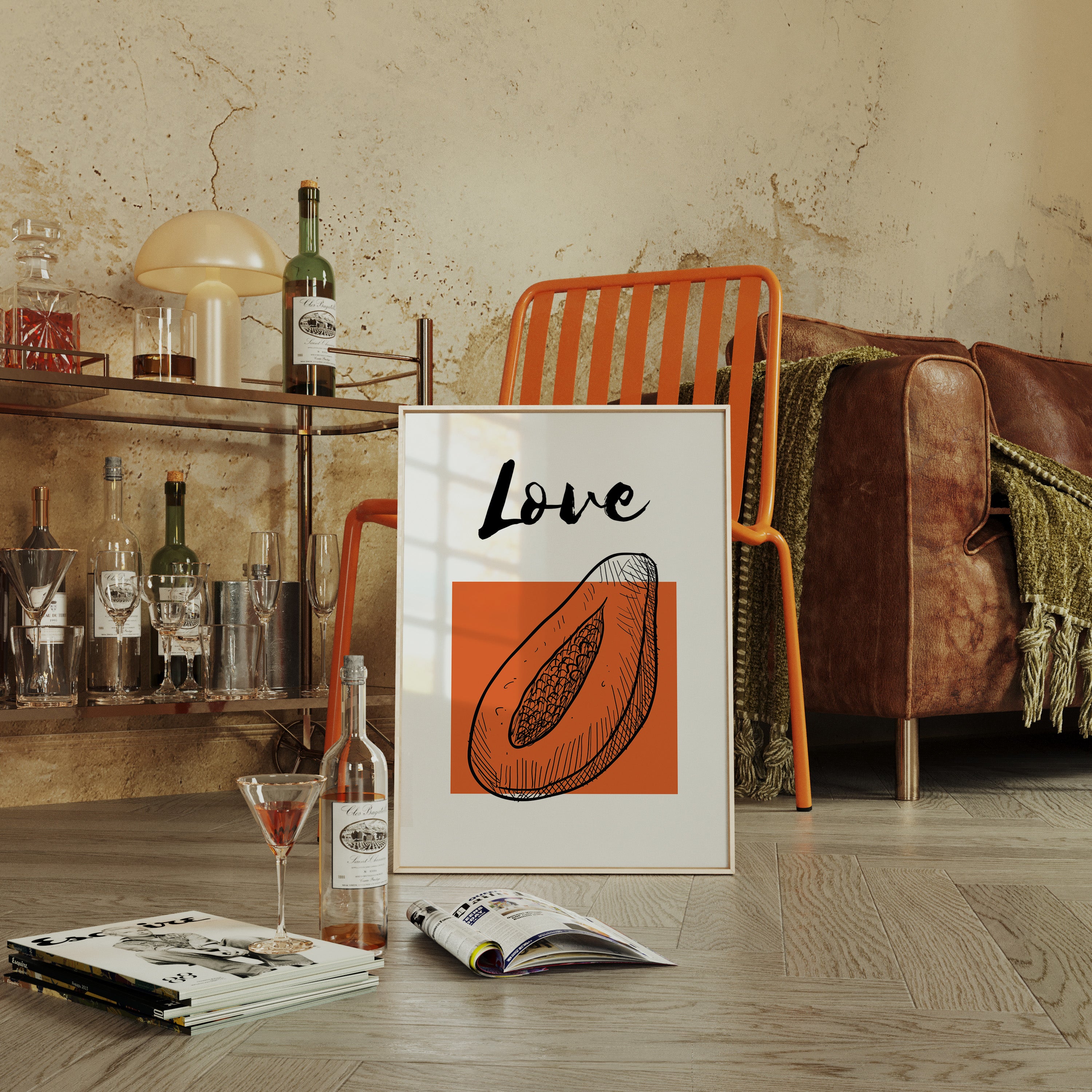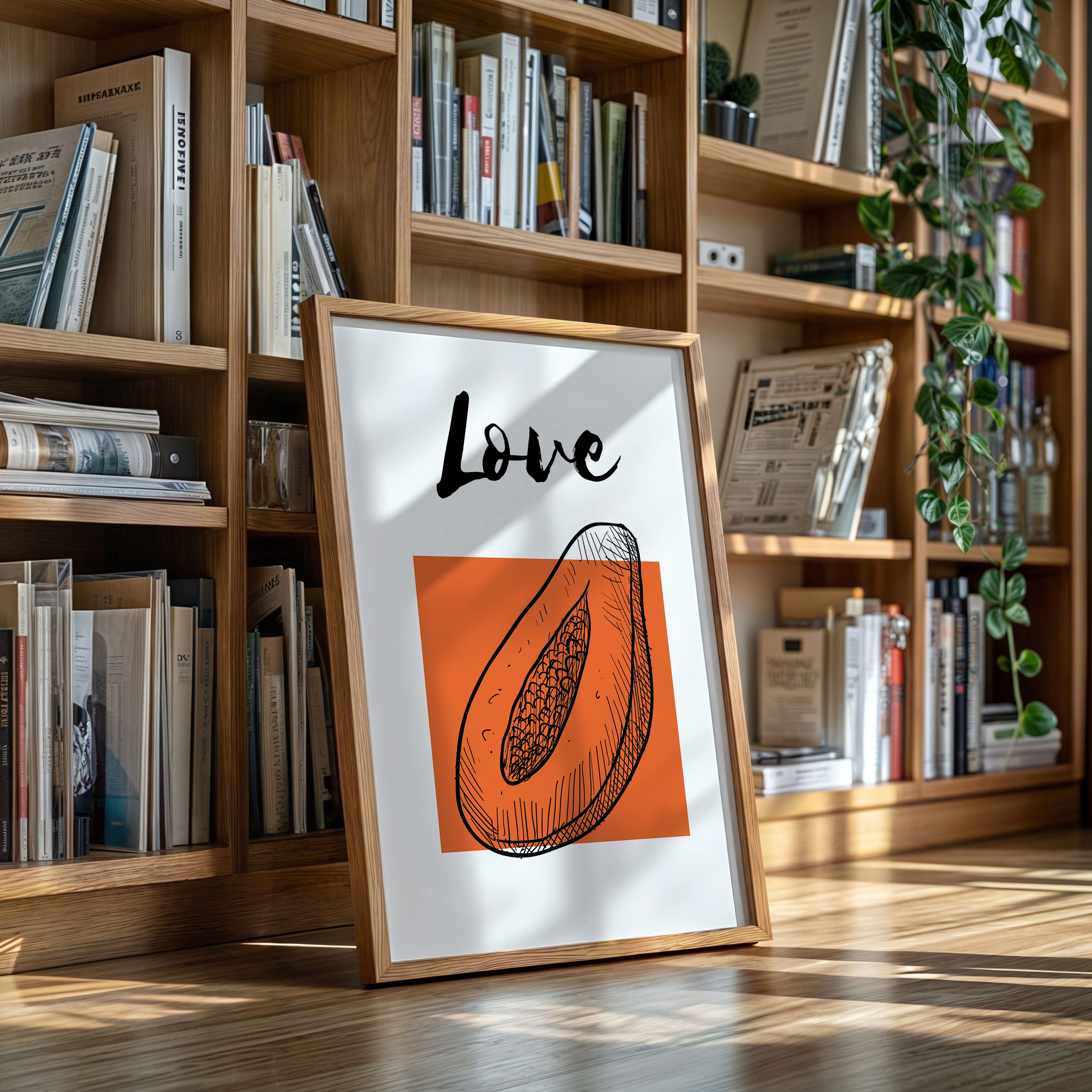 A bold brushstroke of love floats above a sun-ripened papaya, capturing the essence of tropical sweetness. This piece from our Contemporary collection marries minimalist line art with vibrant coral energy. The contrast between the delicate black ink drawing and the warm orange background creates a playful dialogue, while the hand-drawn quality adds an intimate, personal touch to the modern composition. Perfect for bringing a splash of warmth to a kitchen or dining space, this piece invites conversations about the simple pleasures of summer fruits and heartfelt moments. Each viewing reveals new details in the careful crosshatching and organic curves of the illustration.