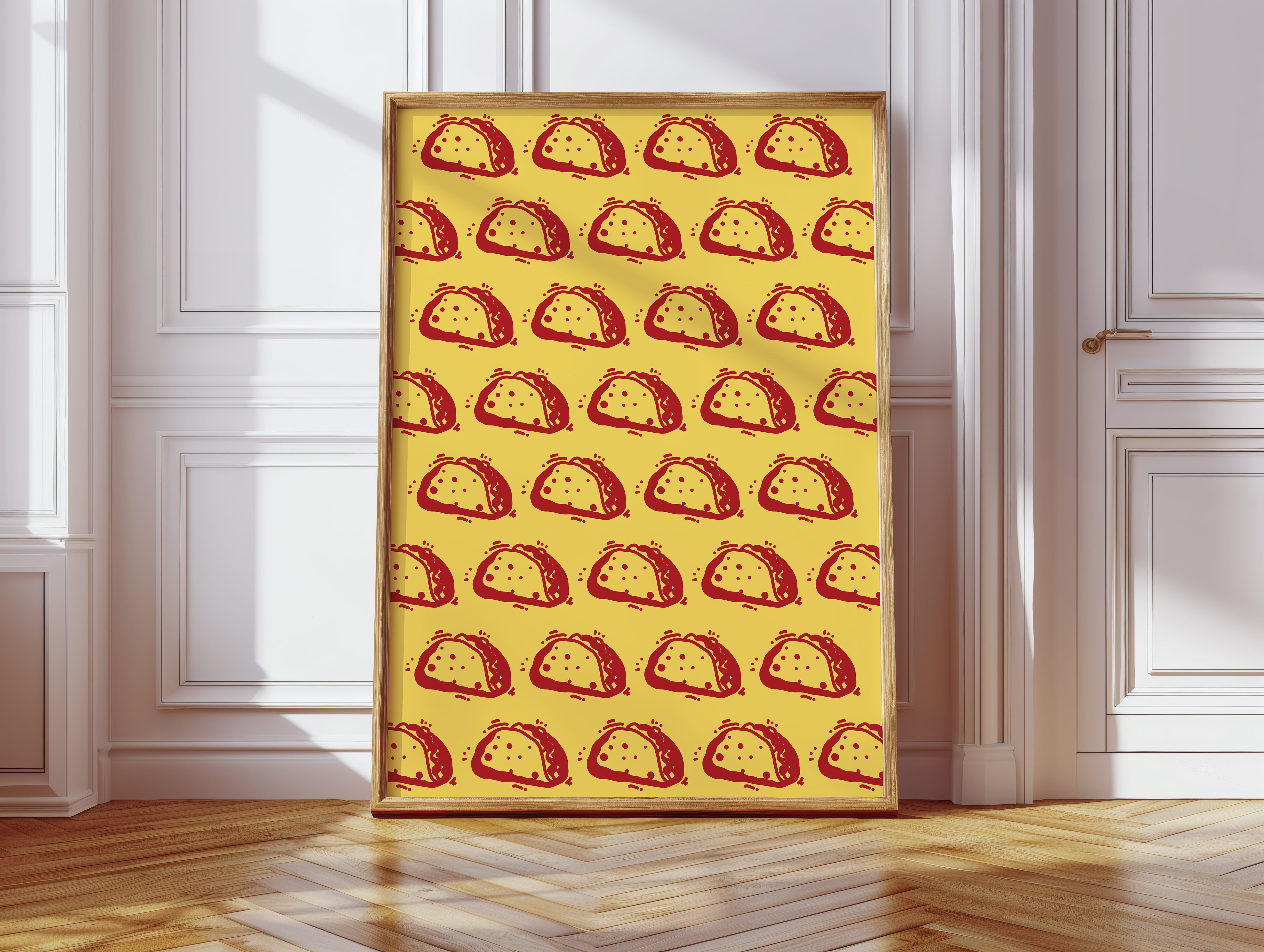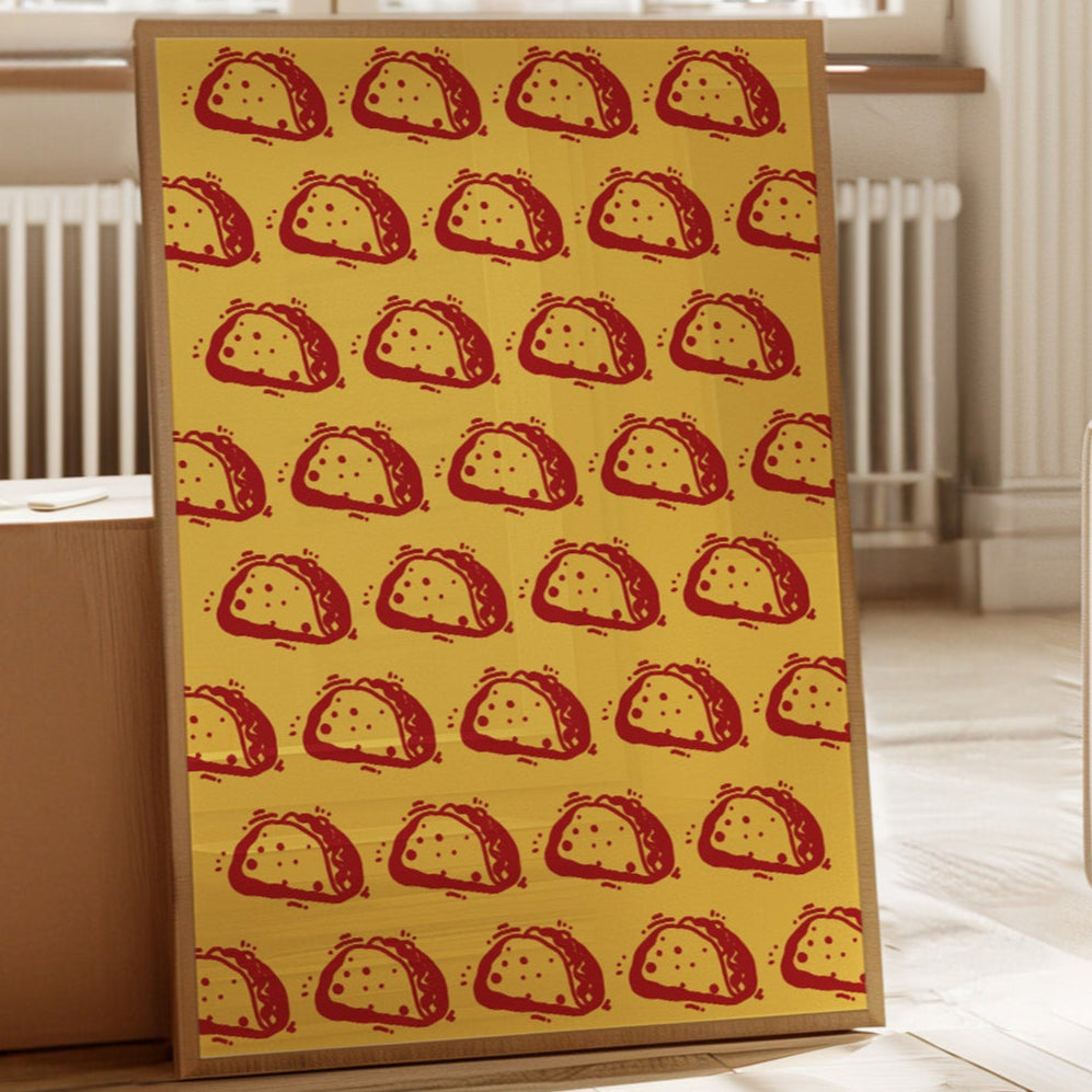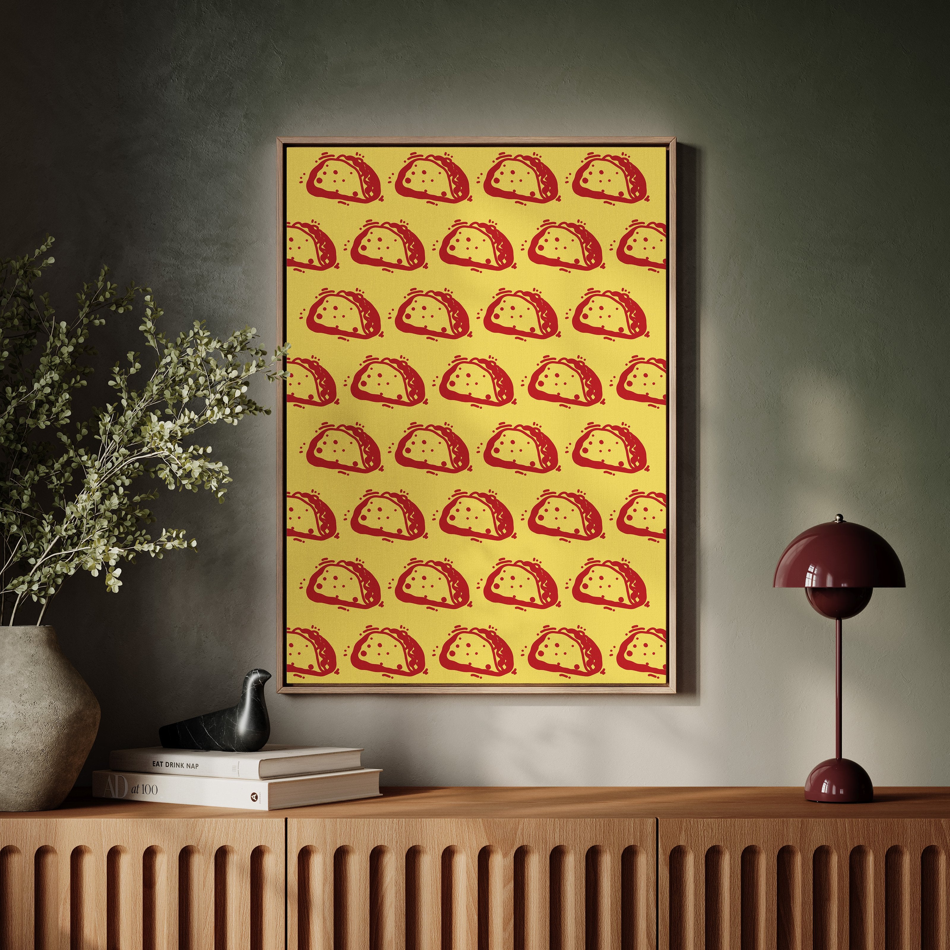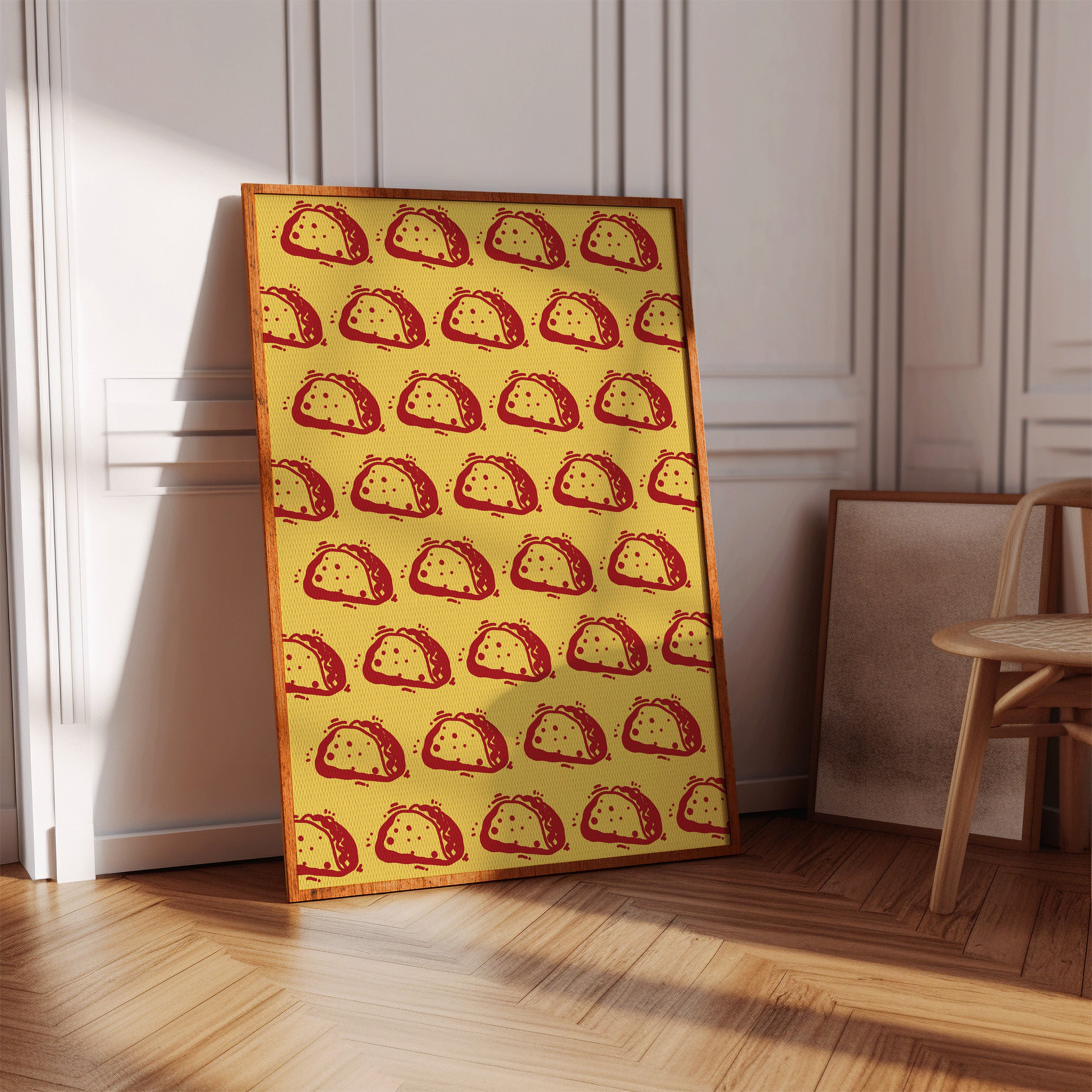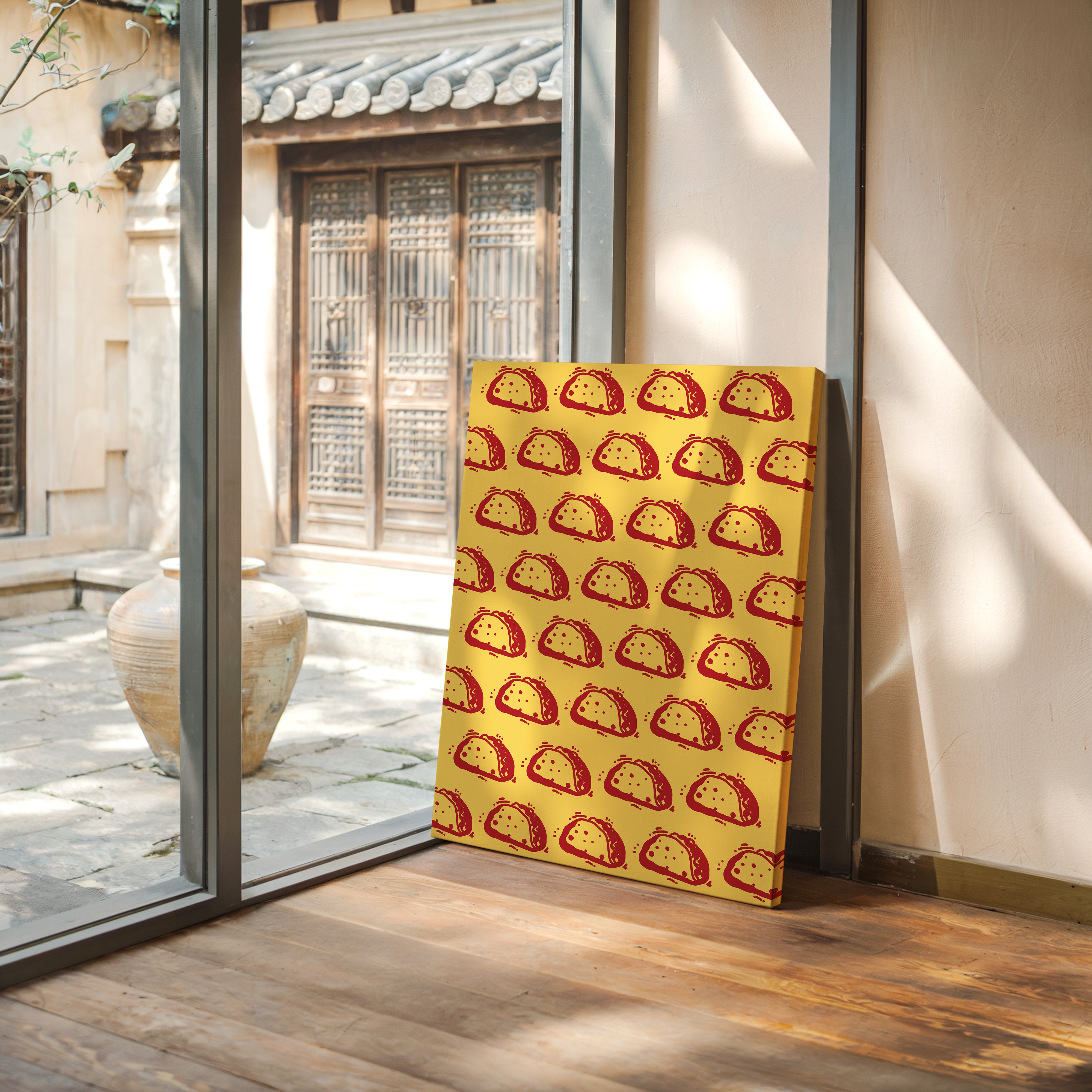 Playful red tacos march in perfect rhythm across a sun-drenched yellow canvas, creating a deliciously hypnotic pattern. This piece from our Contemporary collection brings pop art flair to culinary iconography. Each taco is lovingly rendered with a touch of whimsy, their repeated forms creating a mesmerizing dance of comfort food meets modern design. The warm golden background radiates joy while crimson outlines add a bold, graphic punch that commands attention. This statement piece brings personality and charm to dining spaces, modern kitchens, or any room needing a dash of foodie fun. Let it spark conversation and celebrate the simple pleasures of everyone's favorite weekday tradition.