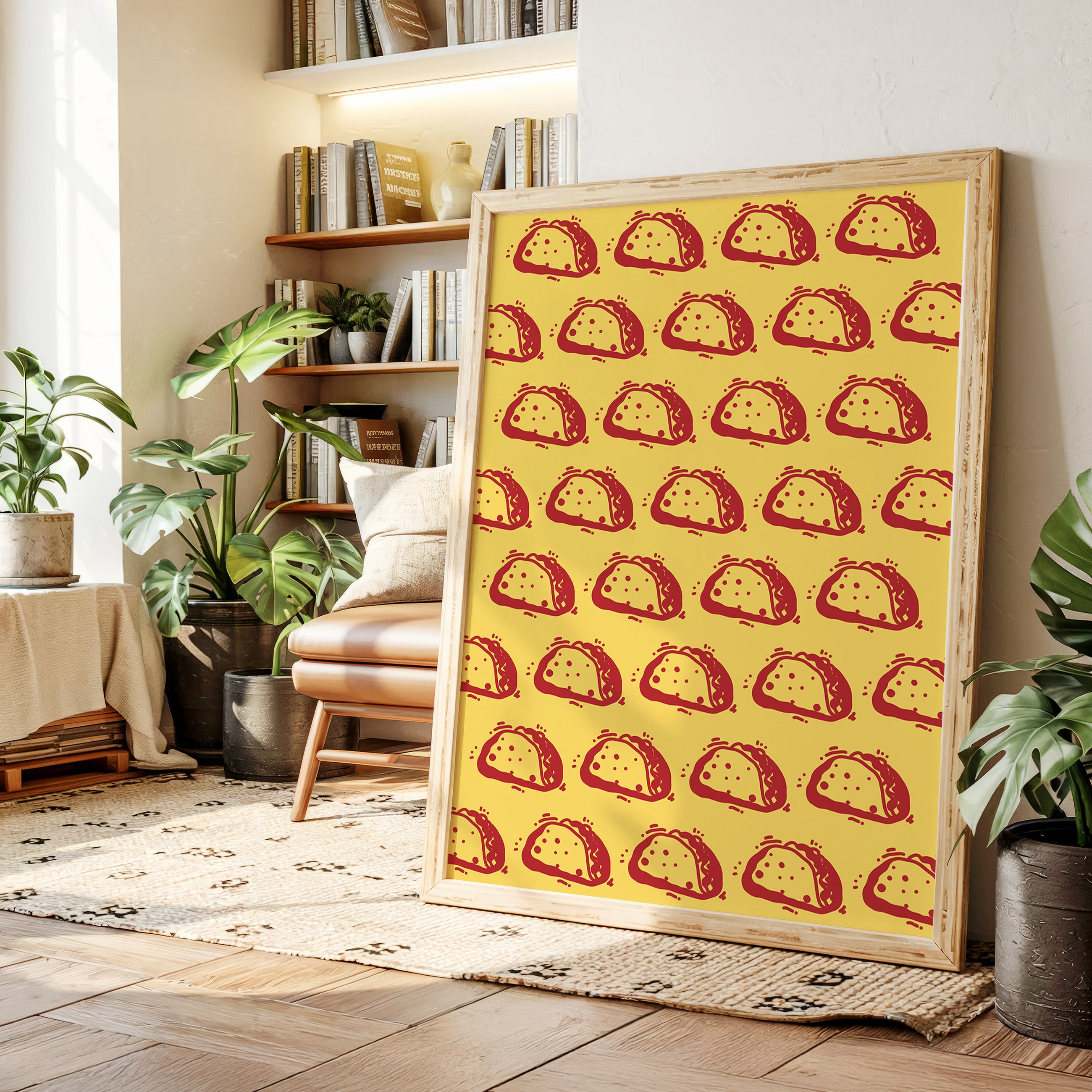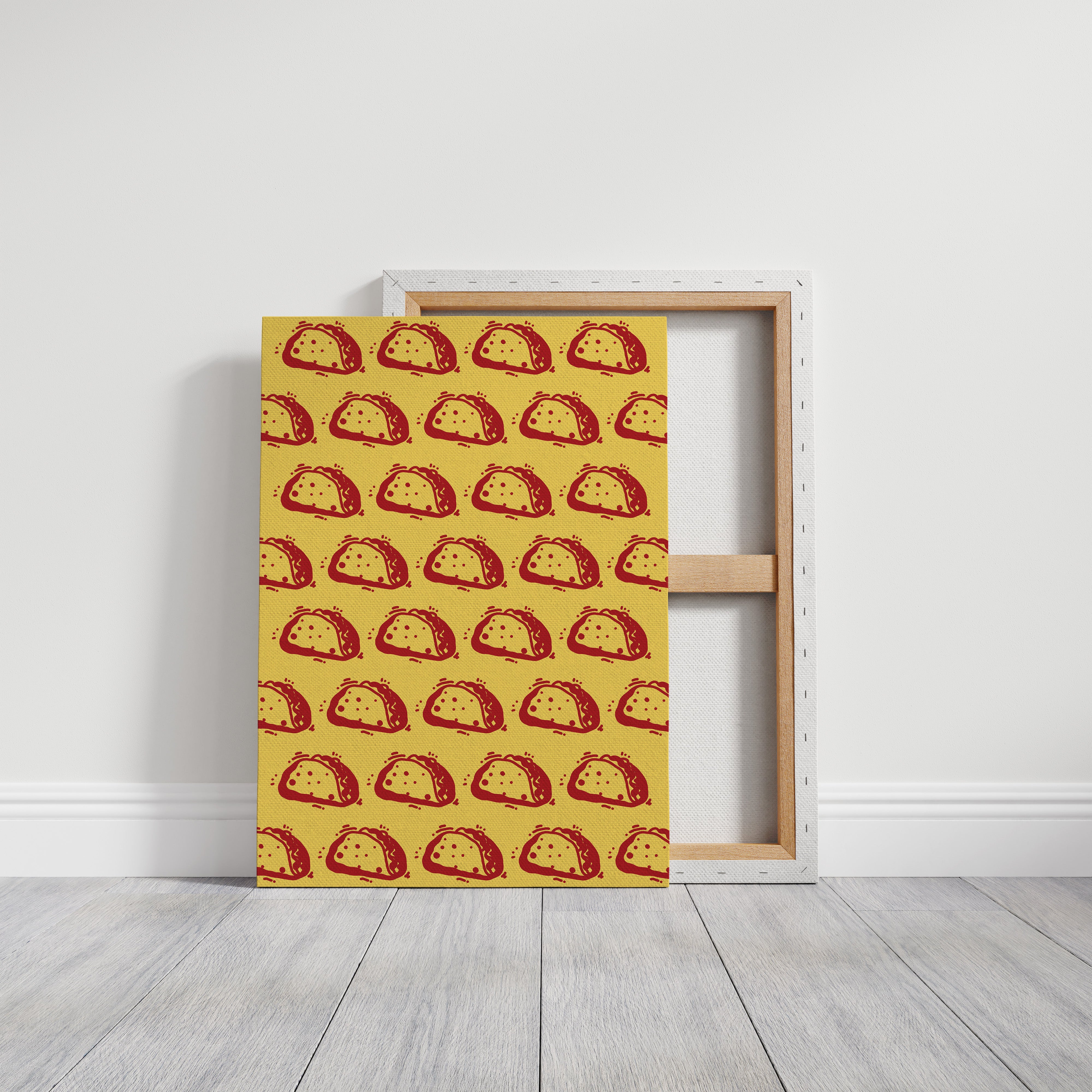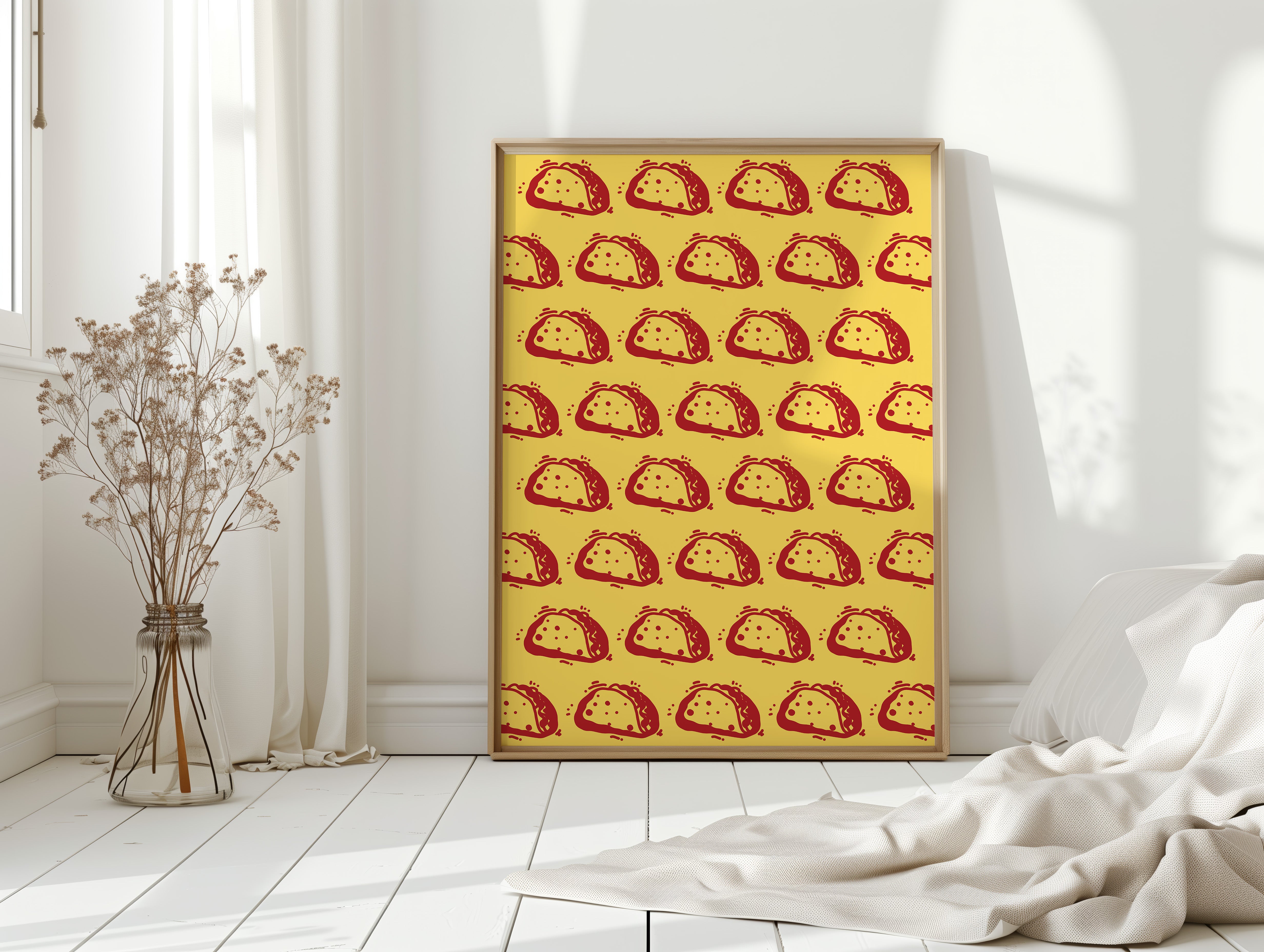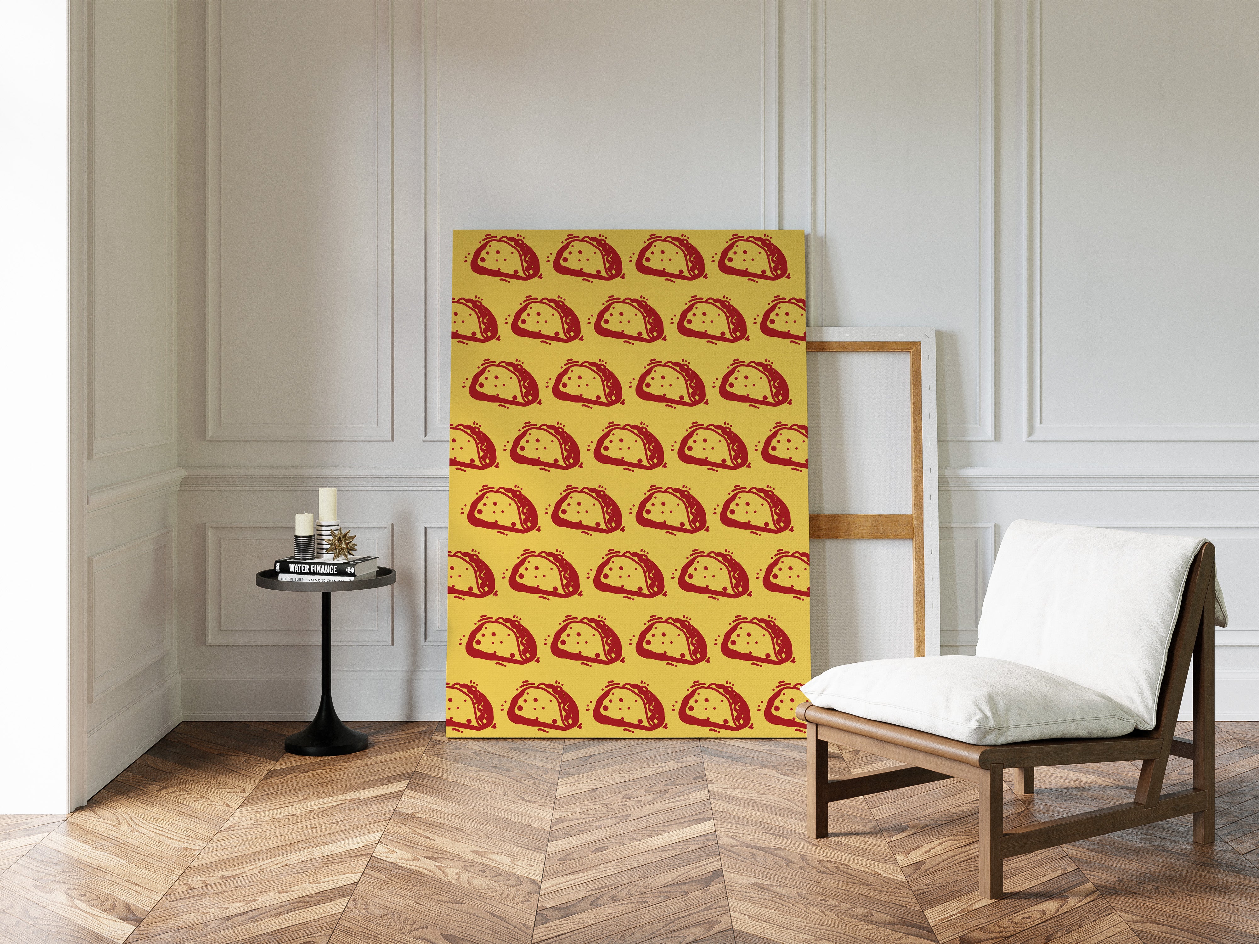 Playful red tacos march in perfect rhythm across a sun-drenched yellow canvas, creating a deliciously hypnotic pattern. This piece from our Contemporary collection brings pop art flair to culinary iconography. Each taco is lovingly rendered with a touch of whimsy, their repeated forms creating a mesmerizing dance of comfort food meets modern design. The warm golden background radiates joy while crimson outlines add a bold, graphic punch that commands attention. This statement piece brings personality and charm to dining spaces, modern kitchens, or any room needing a dash of foodie fun. Let it spark conversation and celebrate the simple pleasures of everyone's favorite weekday tradition.