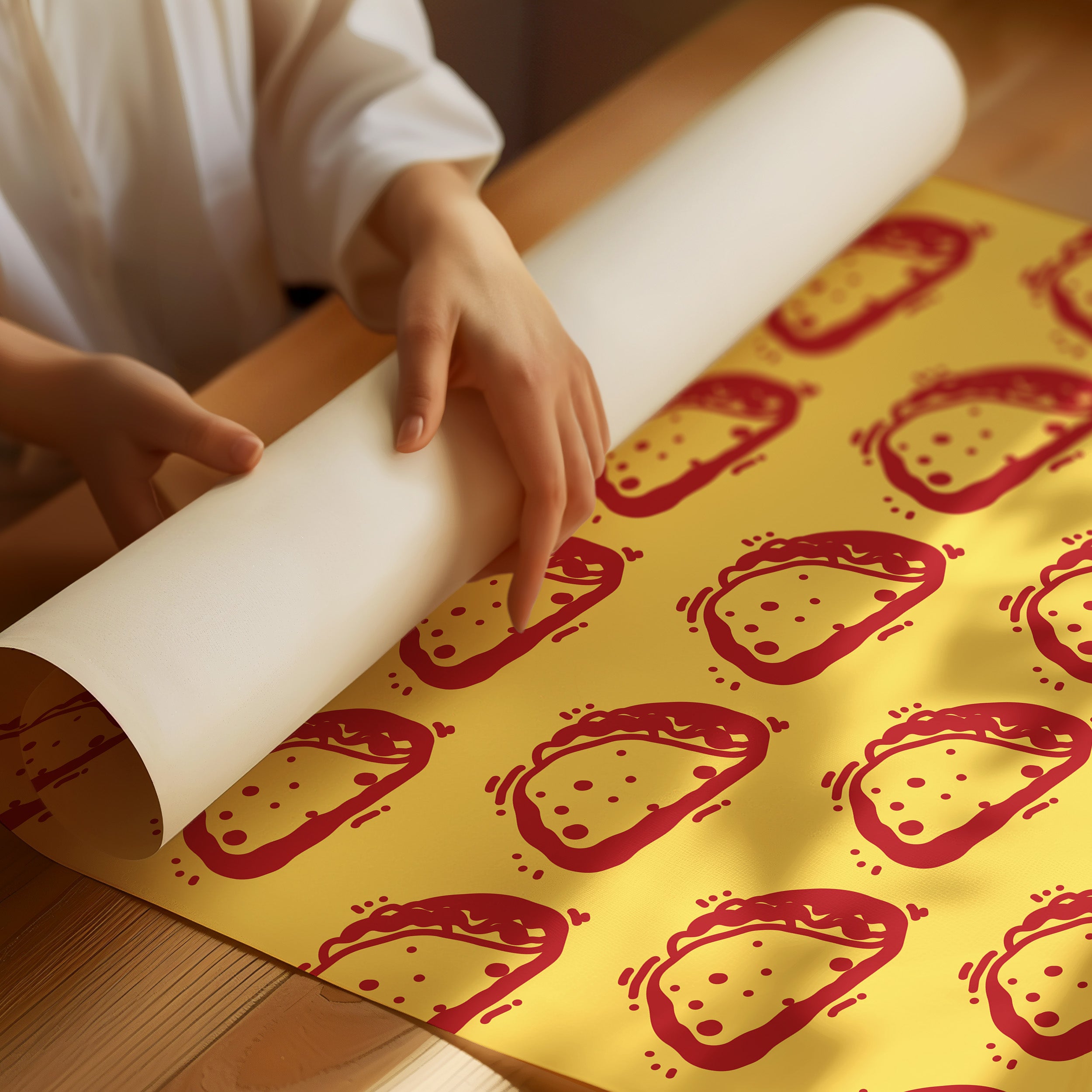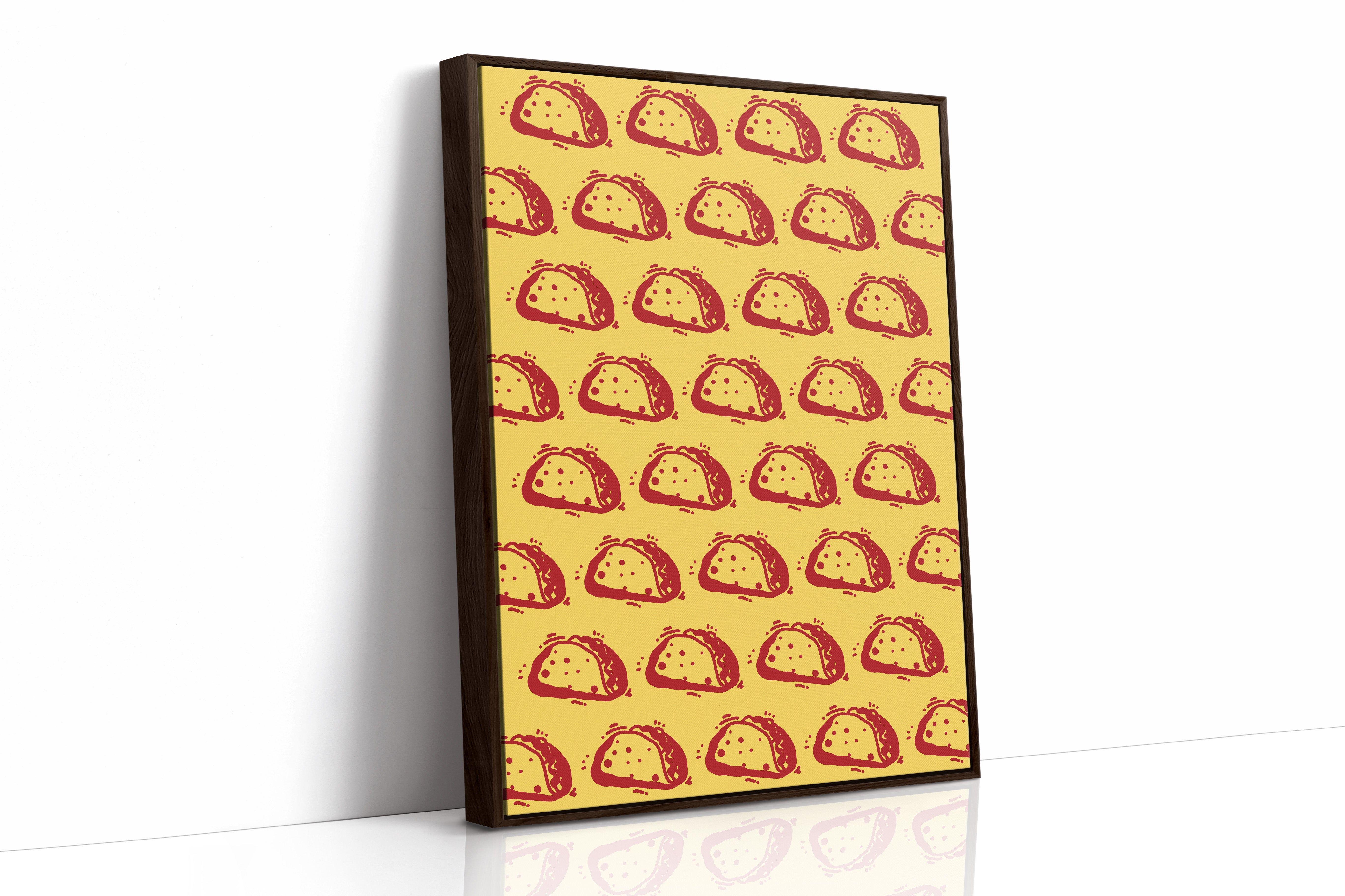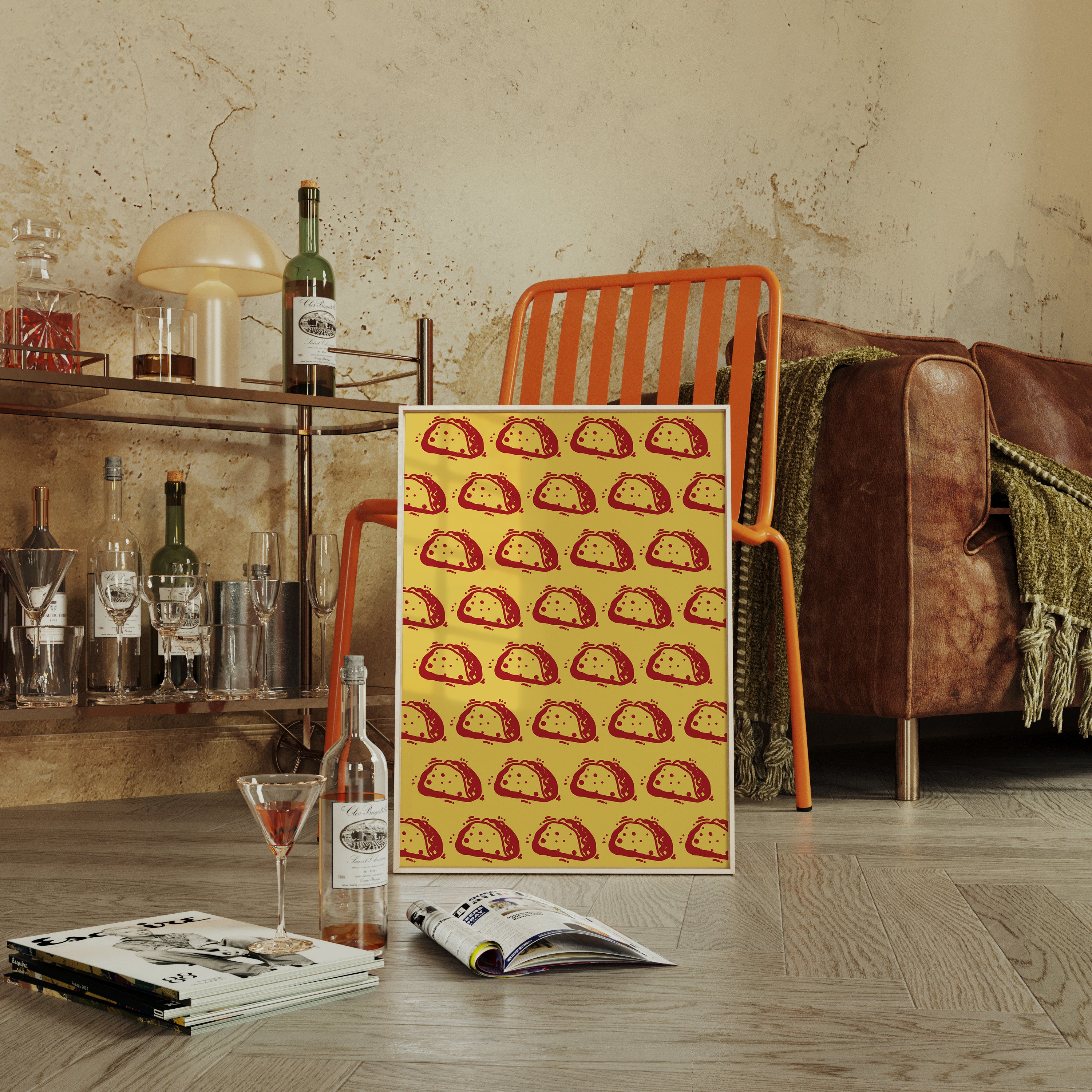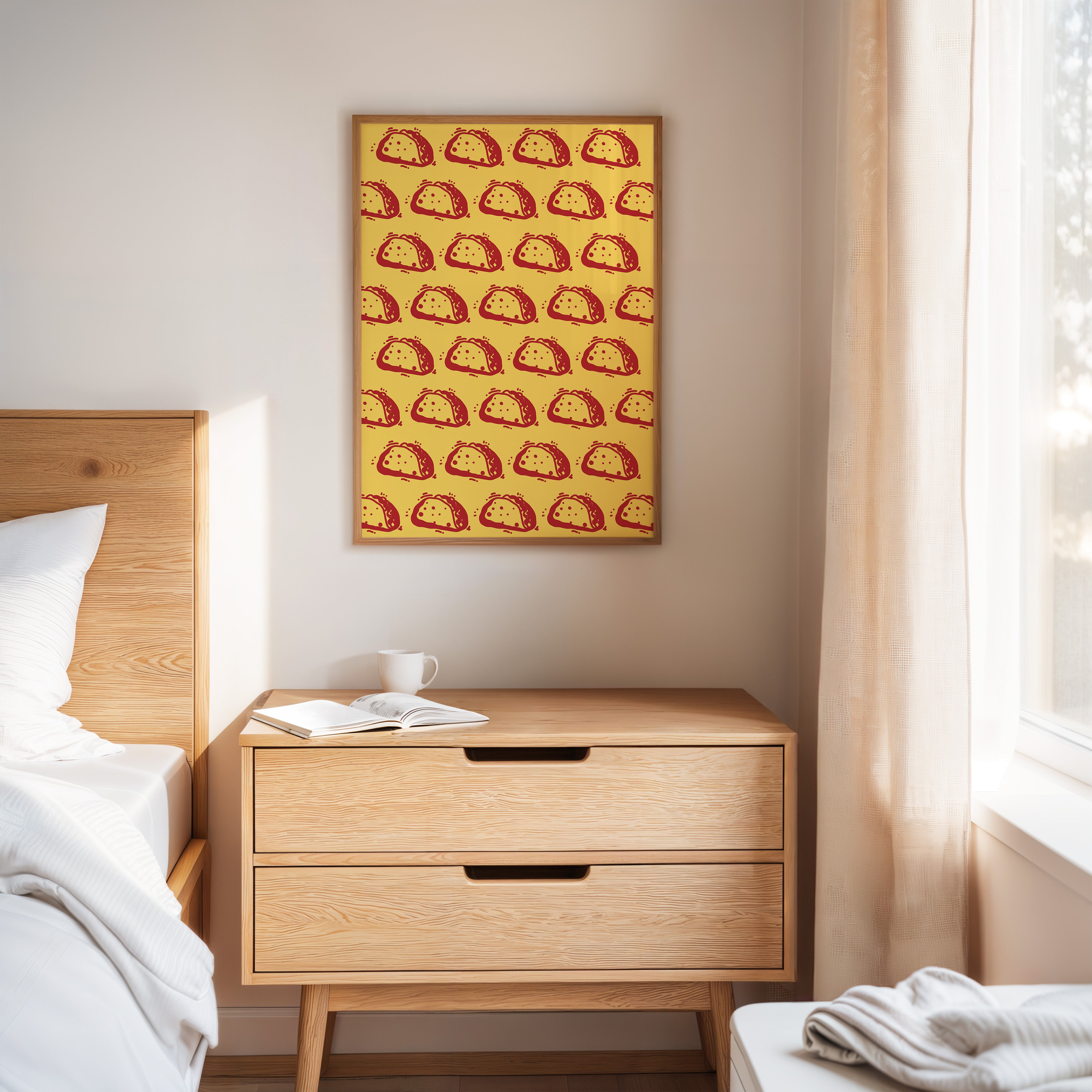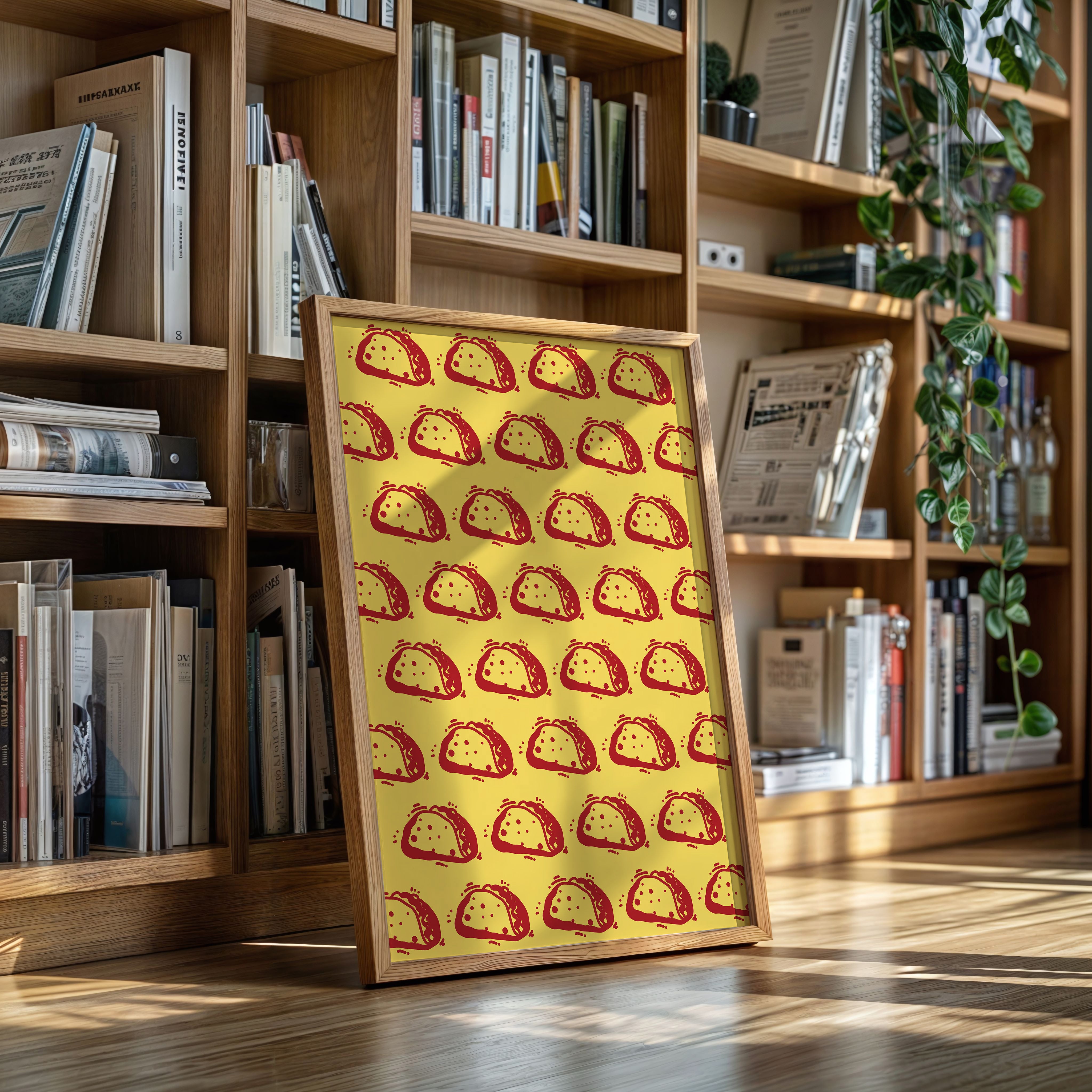 Playful red tacos march in perfect rhythm across a sun-drenched yellow canvas, creating a deliciously hypnotic pattern. This piece from our Contemporary collection brings pop art flair to culinary iconography. Each taco is lovingly rendered with a touch of whimsy, their repeated forms creating a mesmerizing dance of comfort food meets modern design. The warm golden background radiates joy while crimson outlines add a bold, graphic punch that commands attention. This statement piece brings personality and charm to dining spaces, modern kitchens, or any room needing a dash of foodie fun. Let it spark conversation and celebrate the simple pleasures of everyone's favorite weekday tradition.