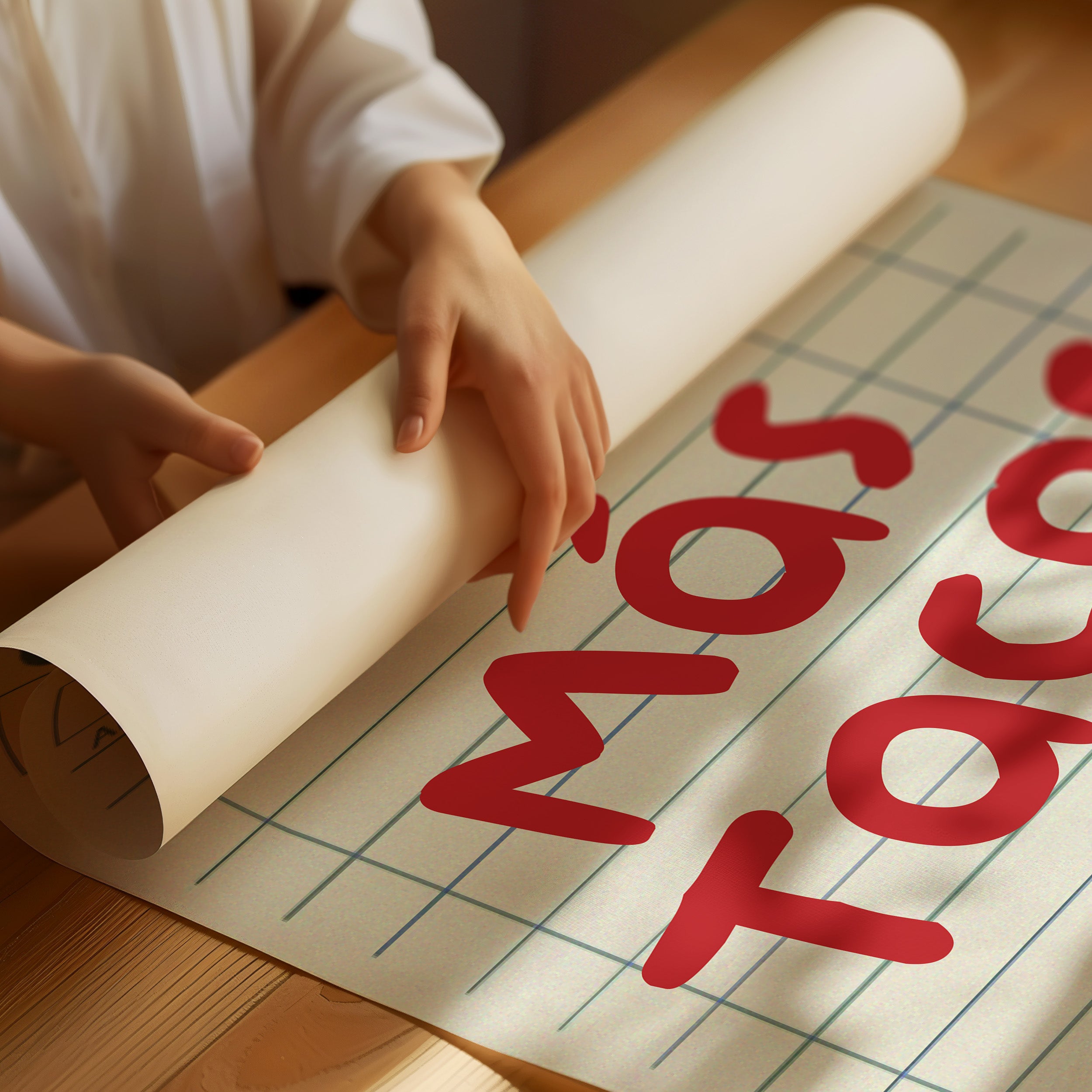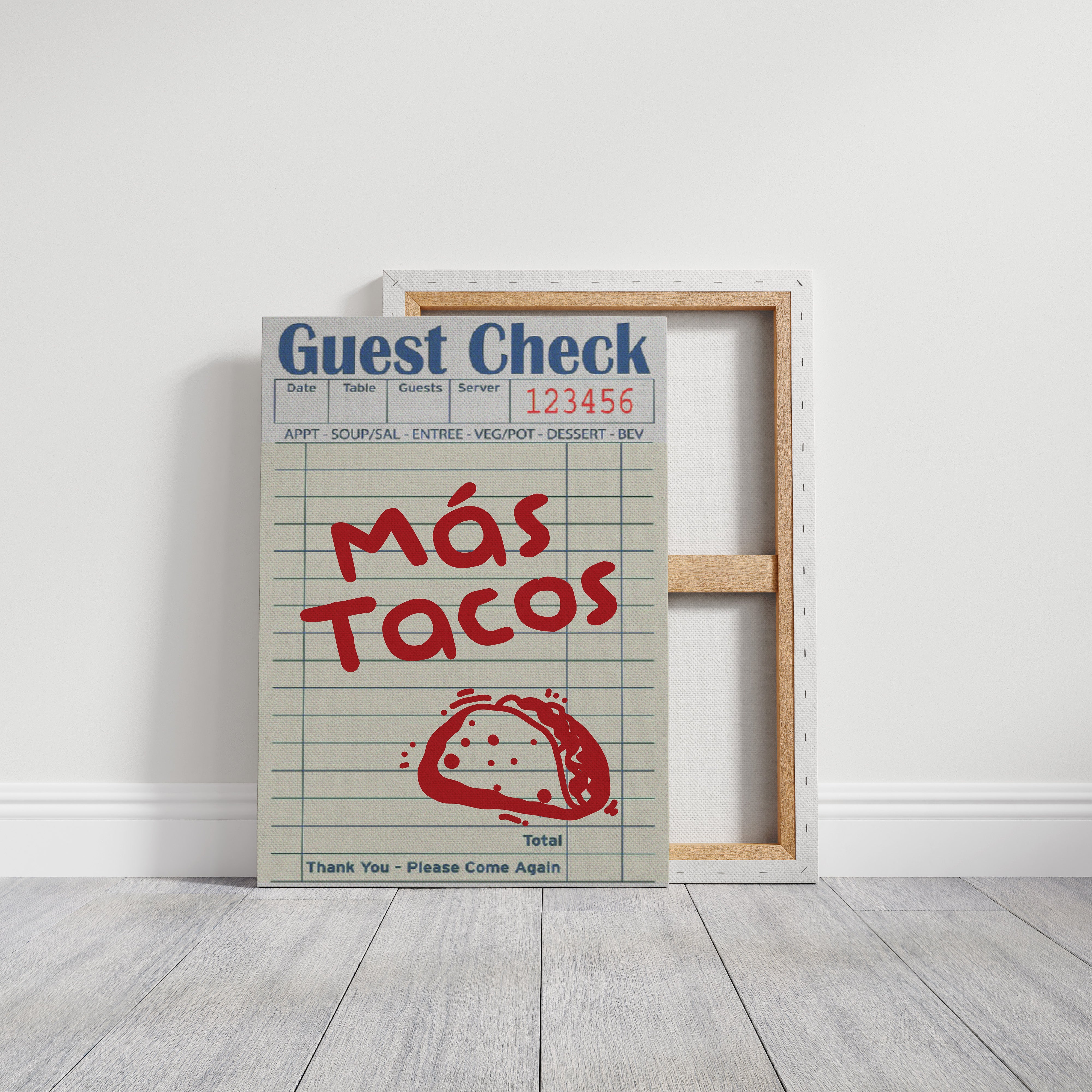A playful oversized guest check becomes an unexpected canvas for culinary nostalgia, with bold red lettering dancing across lined paper. This piece from our Contemporary collection reimagines restaurant ephemera as striking modern art. The familiar format of a server's pad transforms into something extraordinary, where 'M√°s Tacos' and a whimsical taco illustration celebrate the joy of casual dining culture. Against pristine white walls and chevron hardwood floors, this piece creates a perfect balance between sophistication and laid-back charm. Perfect for adding personality to a modern dining room or bringing unexpected wit to a minimalist kitchen space. Each viewing serves up a fresh helping of nostalgia with a side of smile.