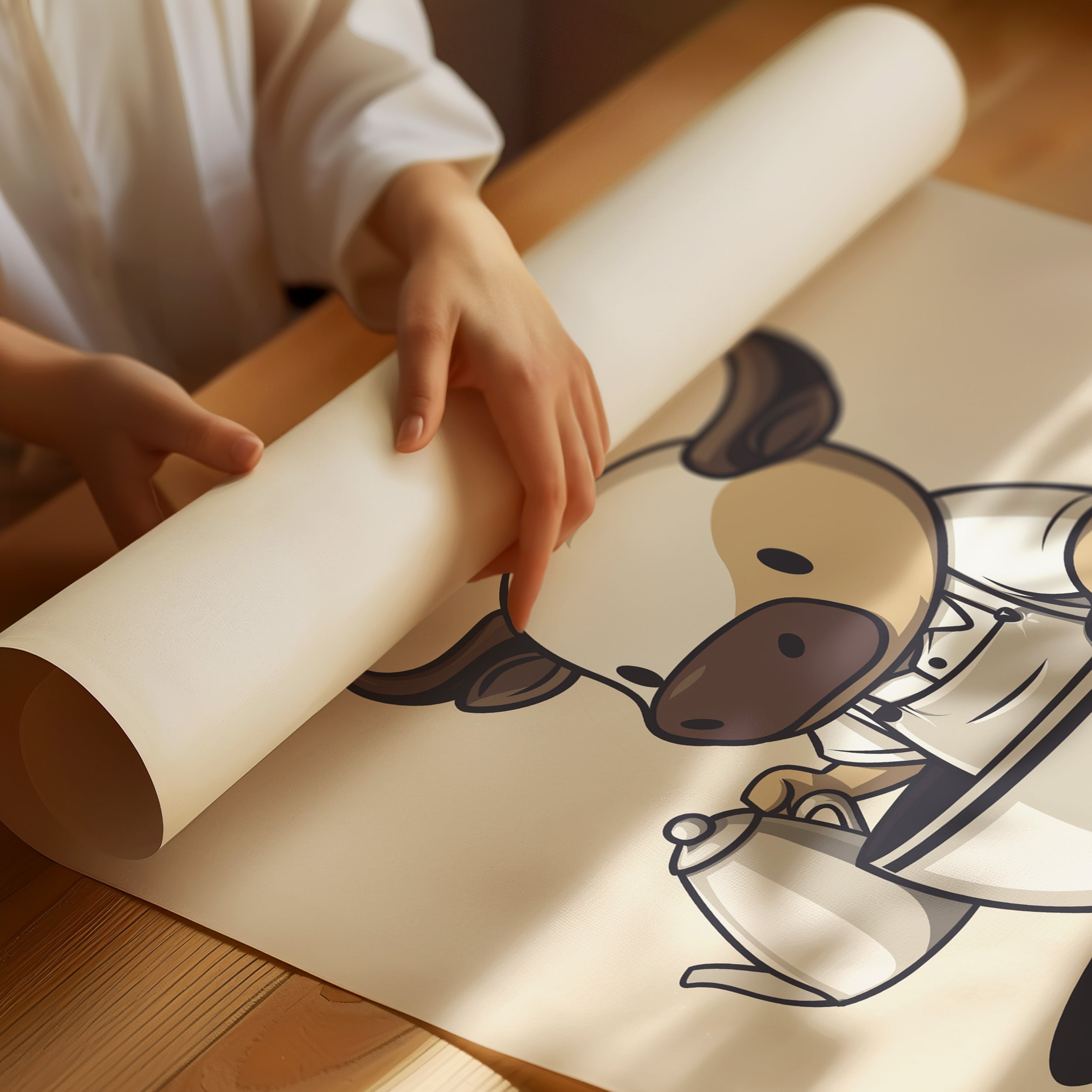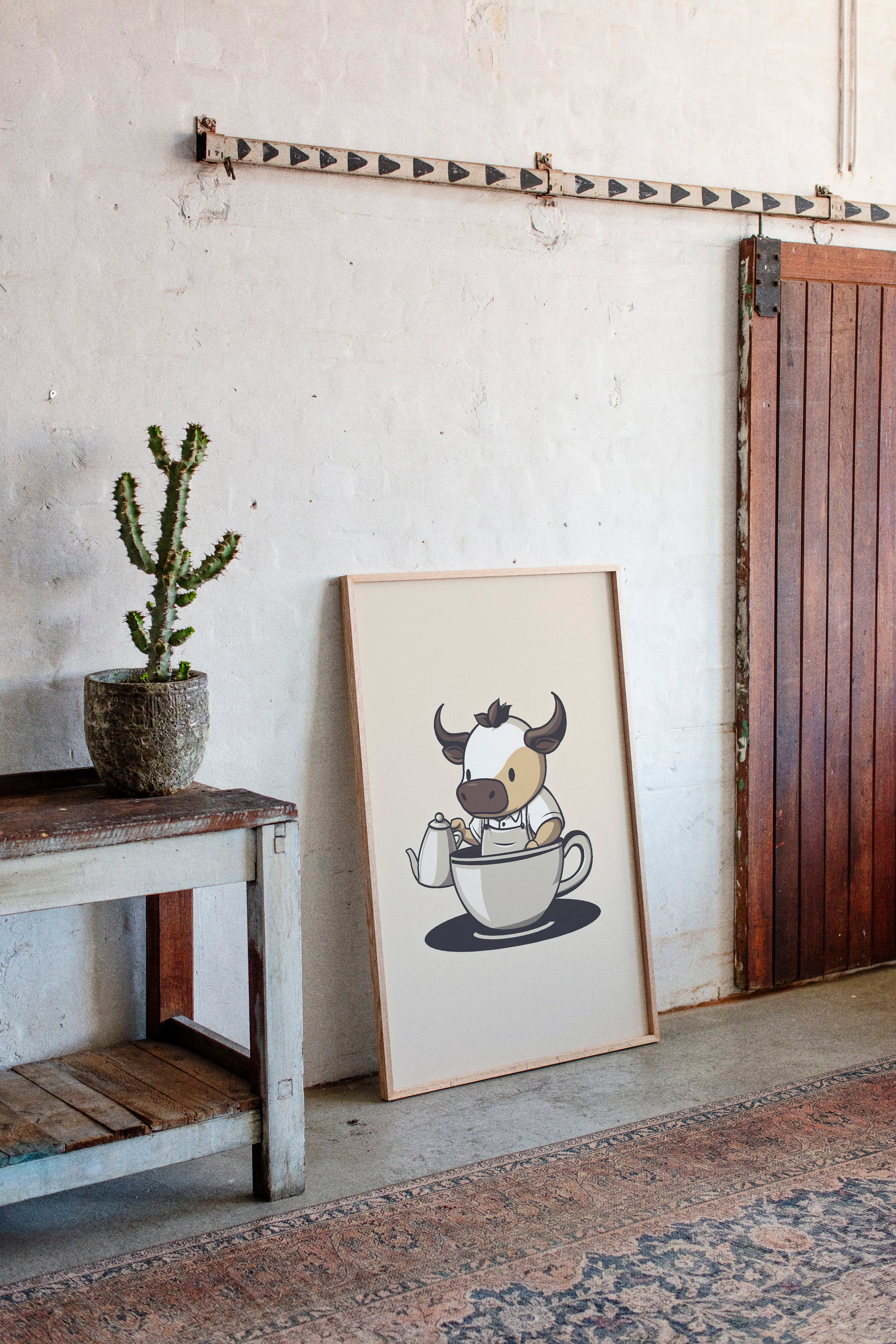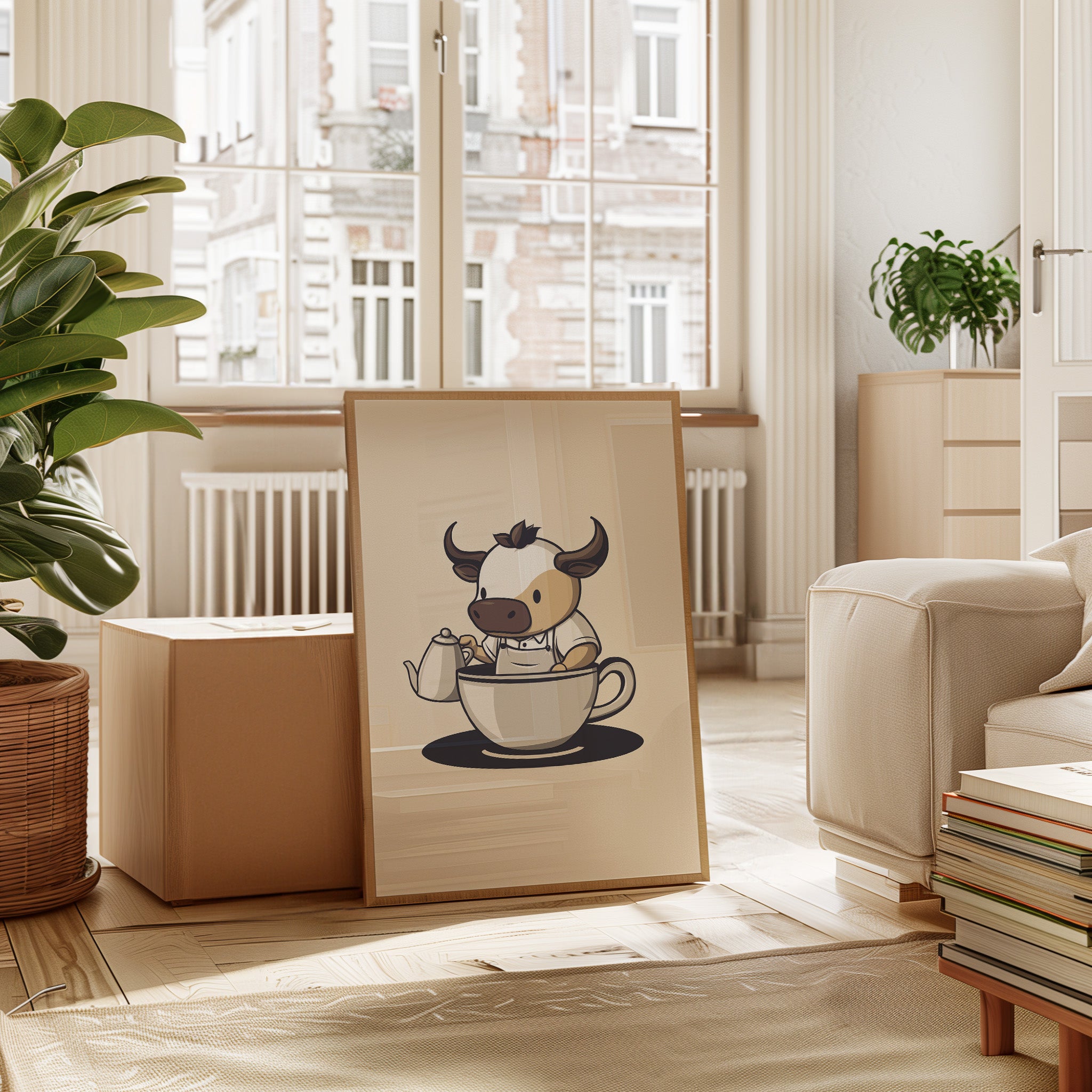 A charming little cow barista nestles perfectly inside an oversized teacup, carefully pouring from a classic cream-colored teapot. This piece captures the whimsical spirit of the Contemporary collection's playful take on everyday moments. The illustration's clean lines and gentle beige palette create a harmonious blend of modern minimalism and kawaii charm, while the cow's earnest expression and tiny apron add heartwarming personality to the scene. Perfect for adding a touch of joy to kitchen spaces or creating a cozy corner in a cafe-themed home office. This delightful piece brings warmth and whimsy to any room while celebrating the simple pleasure of a perfectly poured cup of tea.