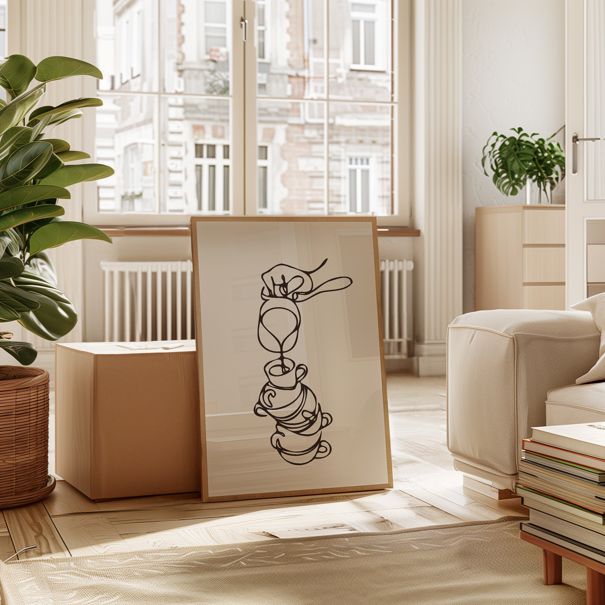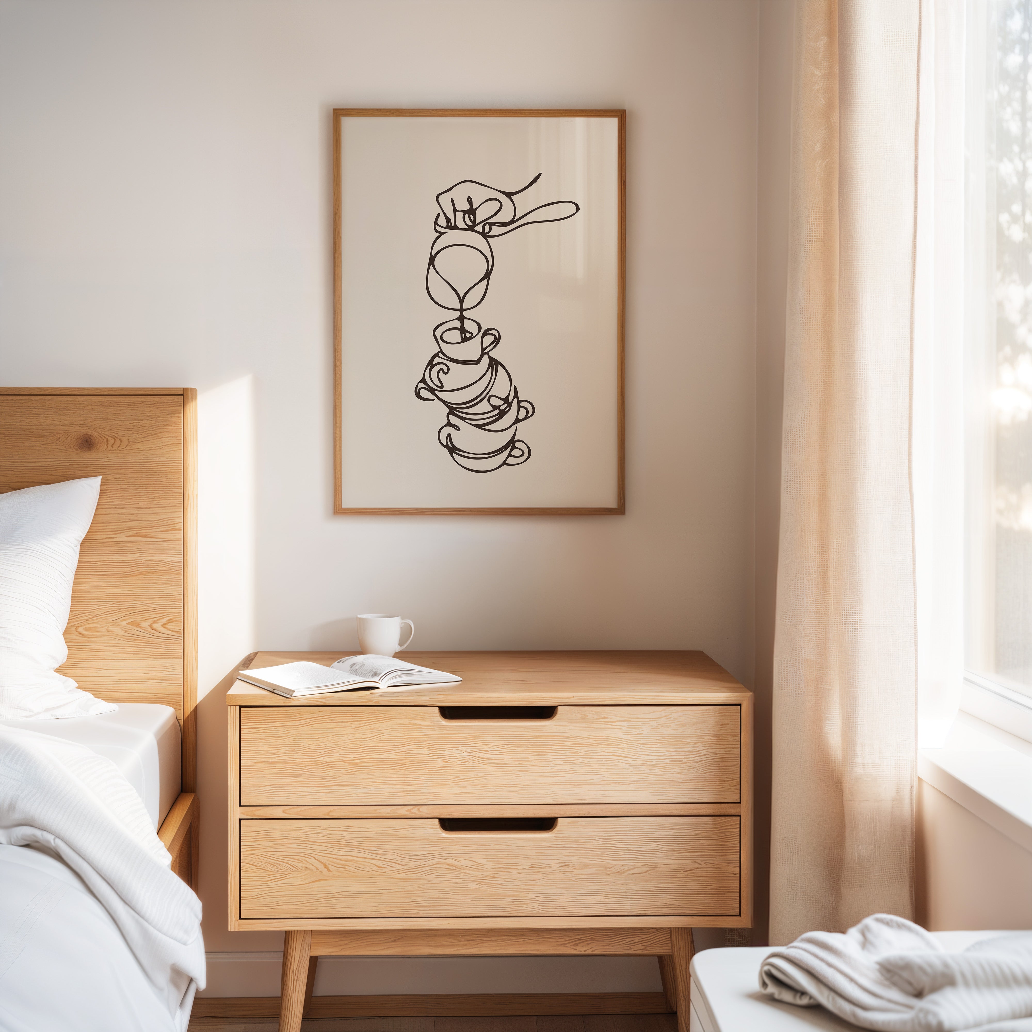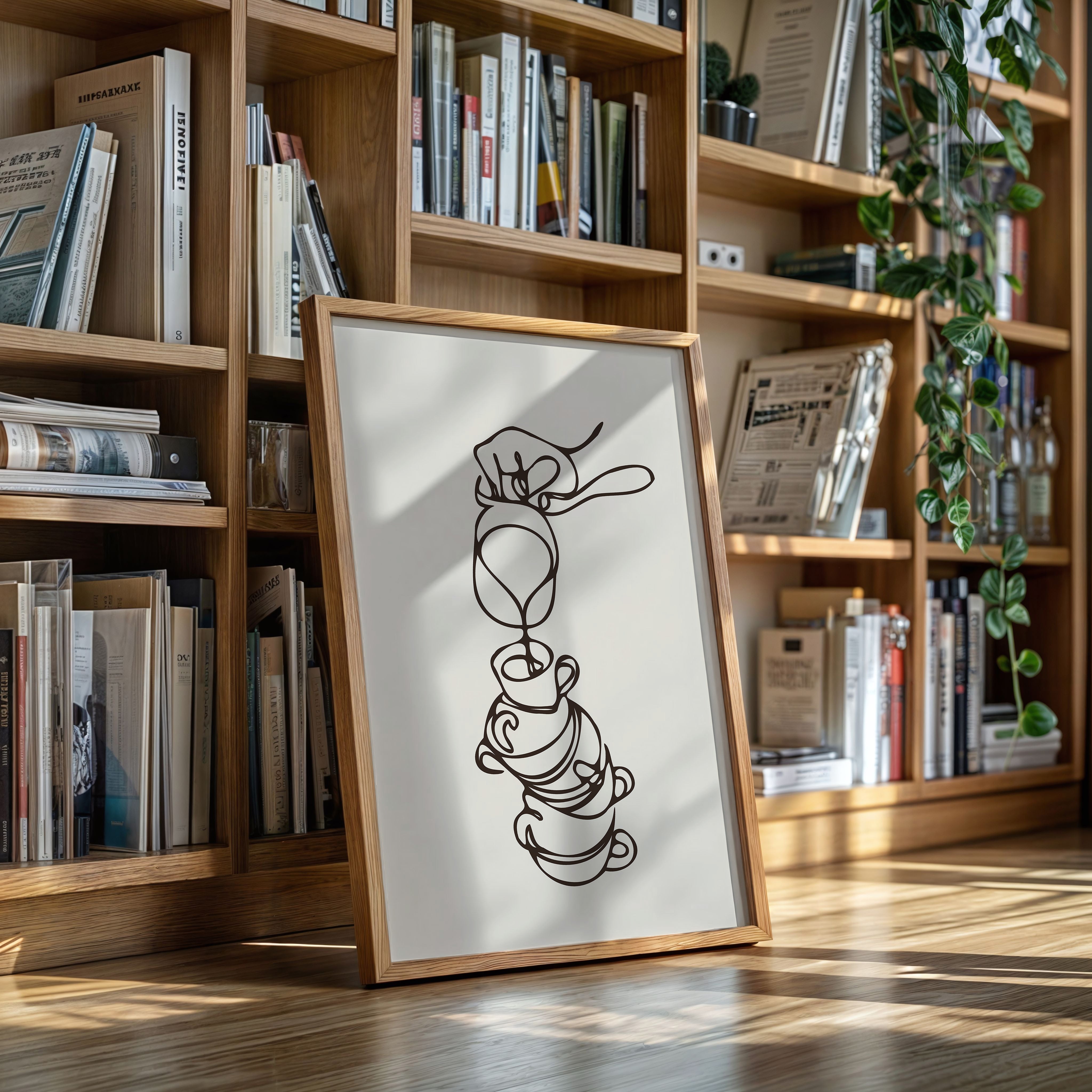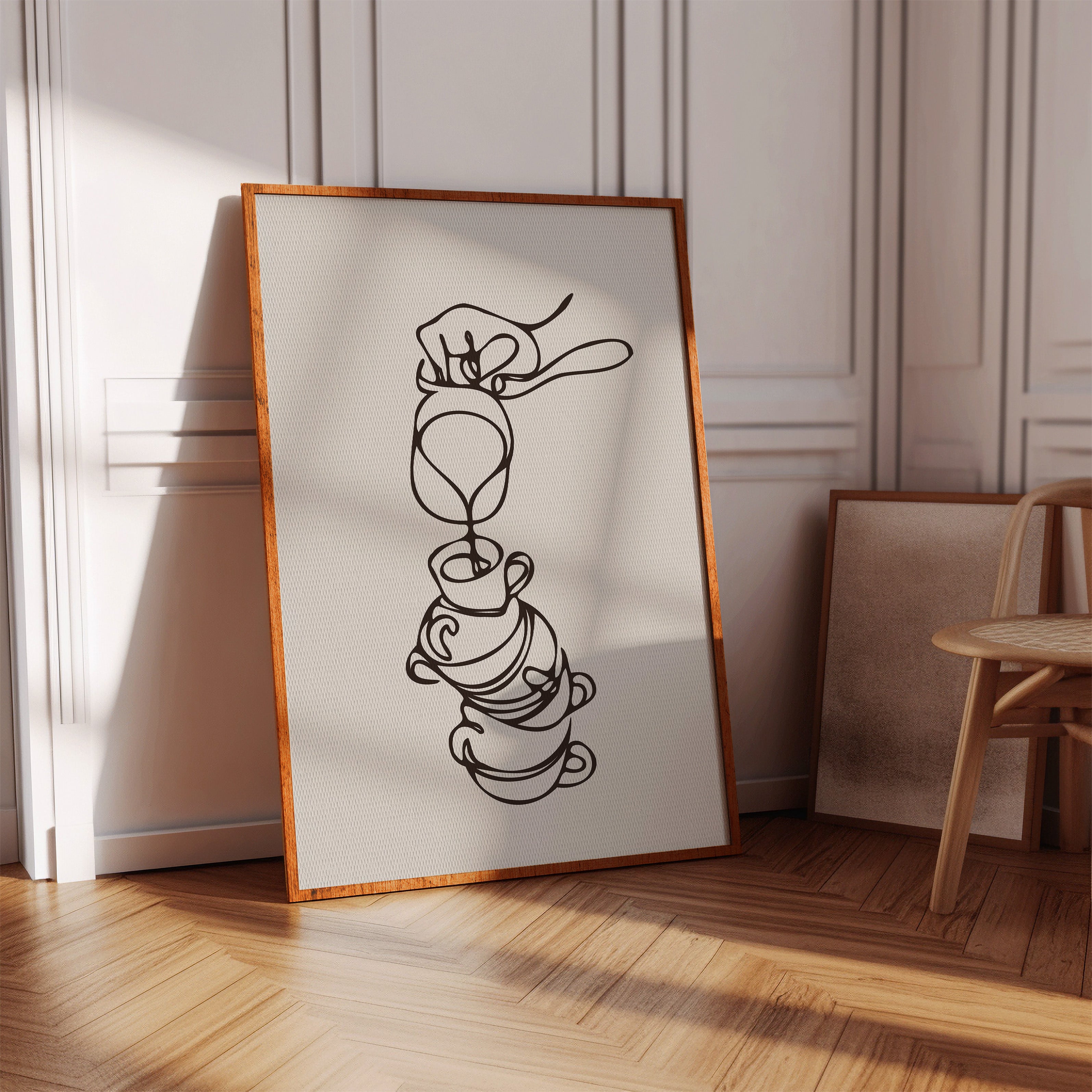 A graceful dance of stacked teacups rises like a morning meditation, their curved lines flowing with elegant simplicity. This piece from our Geometric collection celebrates the poetry of everyday rituals through minimalist line art. The continuous single-line drawing transforms ordinary coffee cups into an extraordinary ballet, each vessel balanced perfectly upon the next as steam rises in artistic swirls. The warm beige background creates a sense of calm, while the bold black lines trace a story of quiet moments and contemplative breaks. Perfect for kitchen spaces, coffee nooks, or any area where you gather to pause and reflect. Let this piece remind you to find beauty in your daily ceremonies.