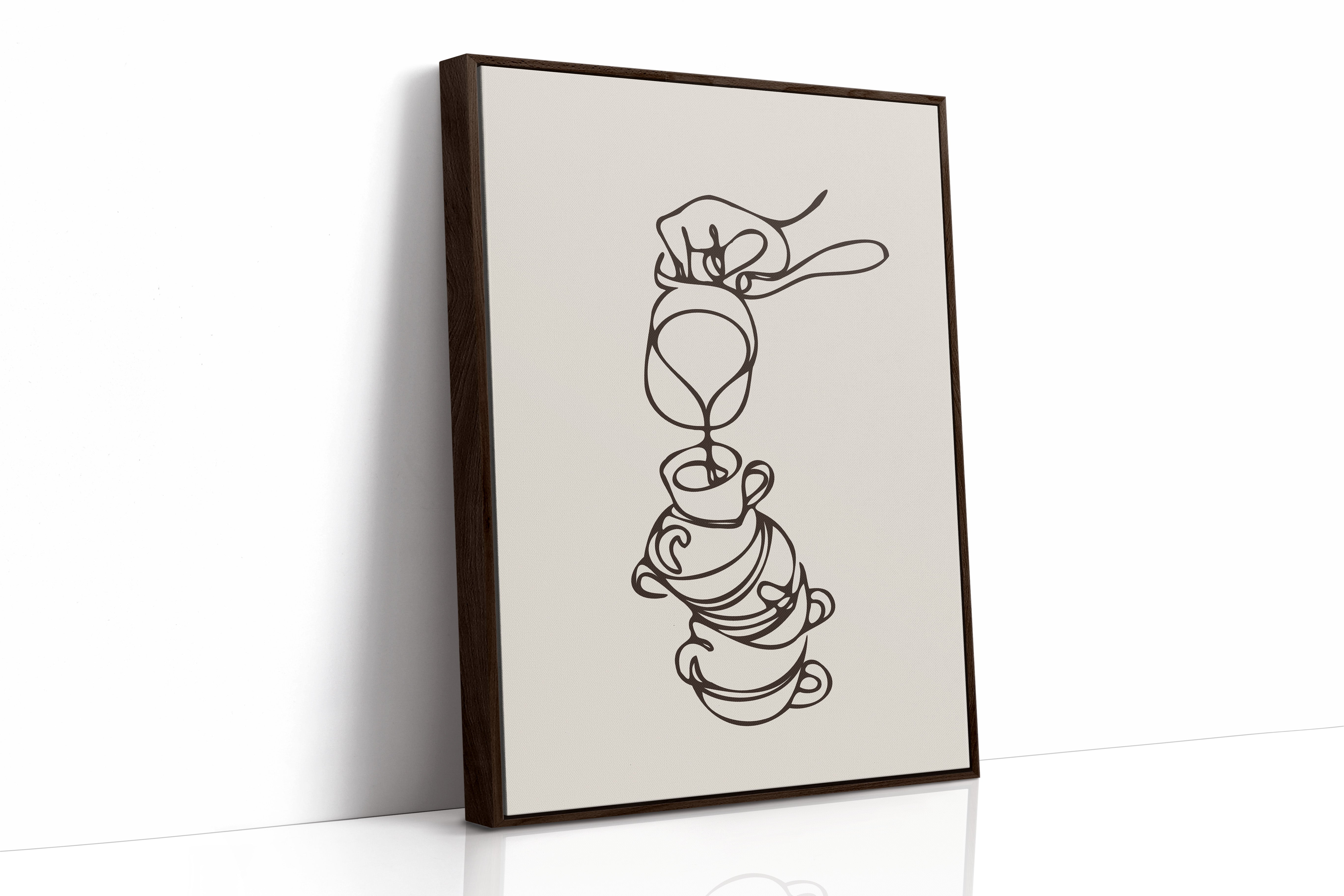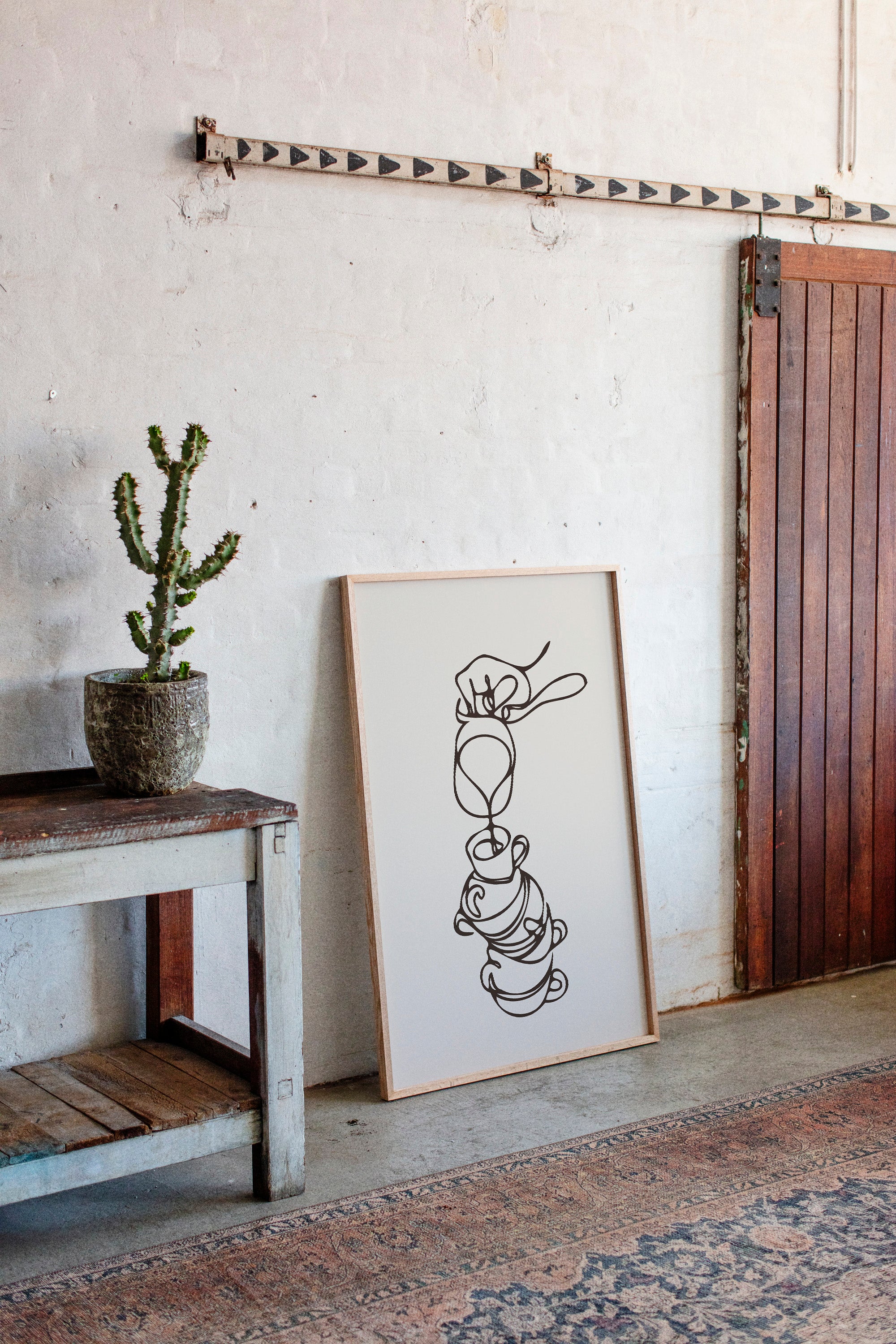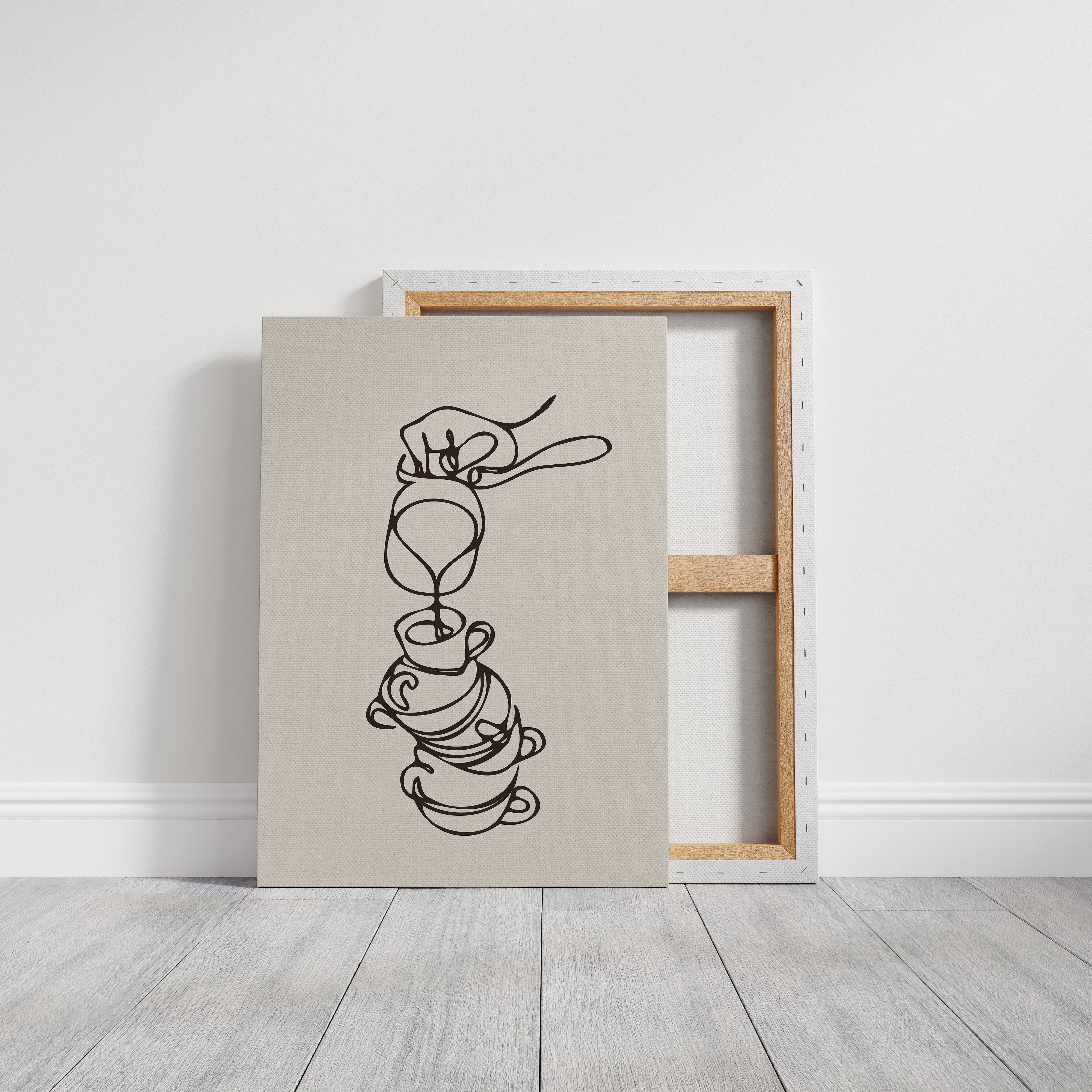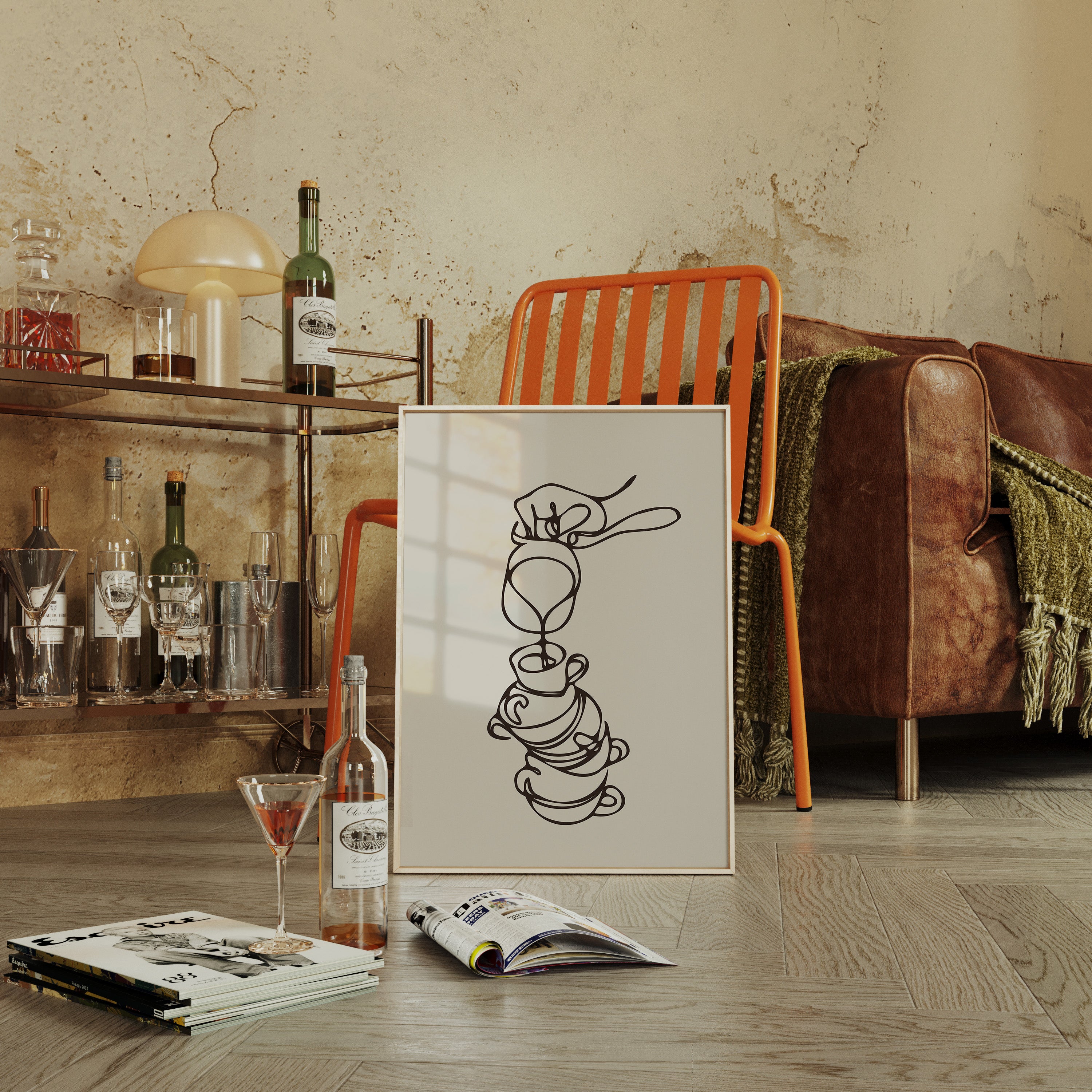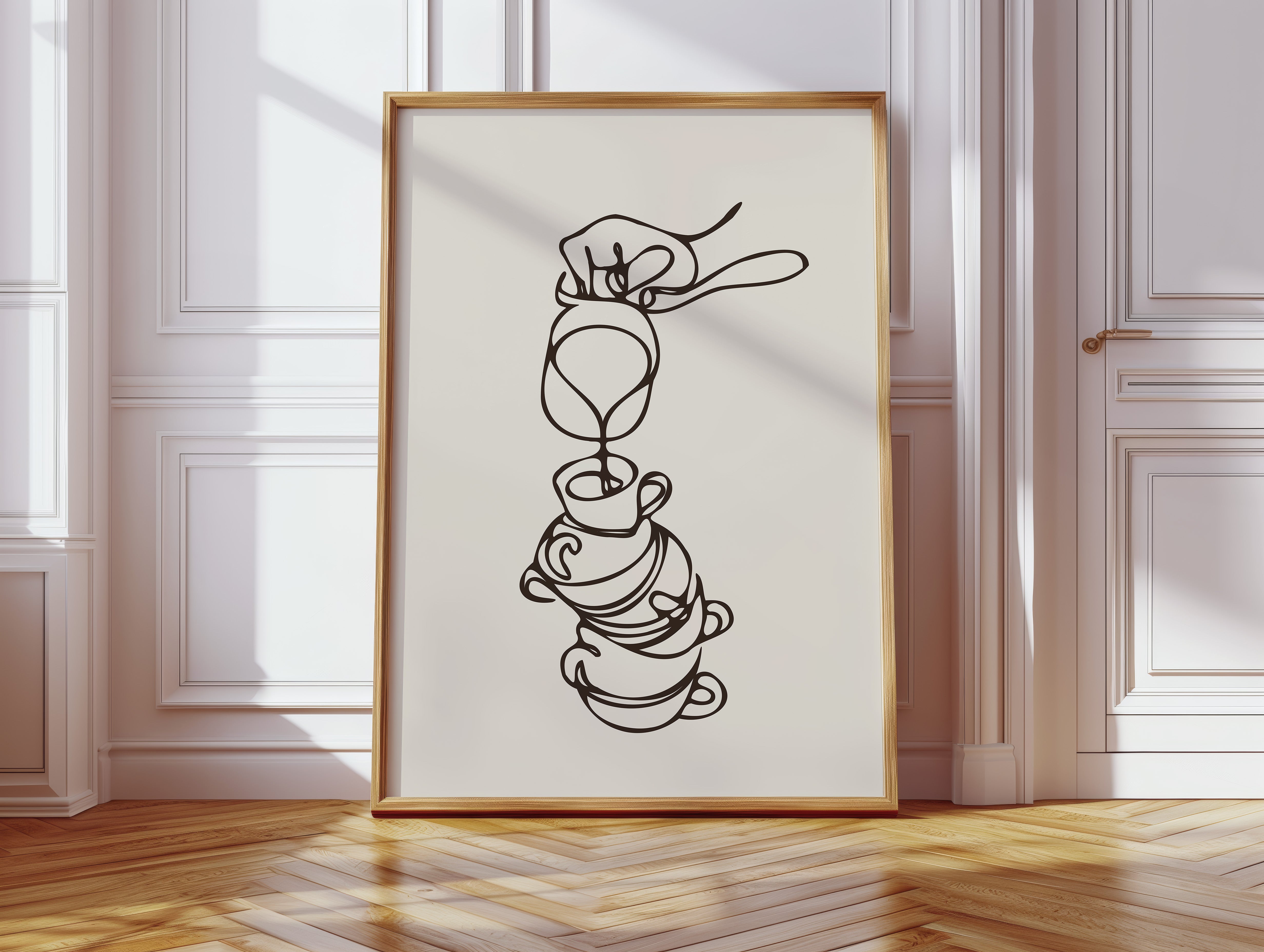 A graceful dance of stacked teacups rises like a morning meditation, their curved lines flowing with elegant simplicity. This piece from our Geometric collection celebrates the poetry of everyday rituals through minimalist line art. The continuous single-line drawing transforms ordinary coffee cups into an extraordinary ballet, each vessel balanced perfectly upon the next as steam rises in artistic swirls. The warm beige background creates a sense of calm, while the bold black lines trace a story of quiet moments and contemplative breaks. Perfect for kitchen spaces, coffee nooks, or any area where you gather to pause and reflect. Let this piece remind you to find beauty in your daily ceremonies.