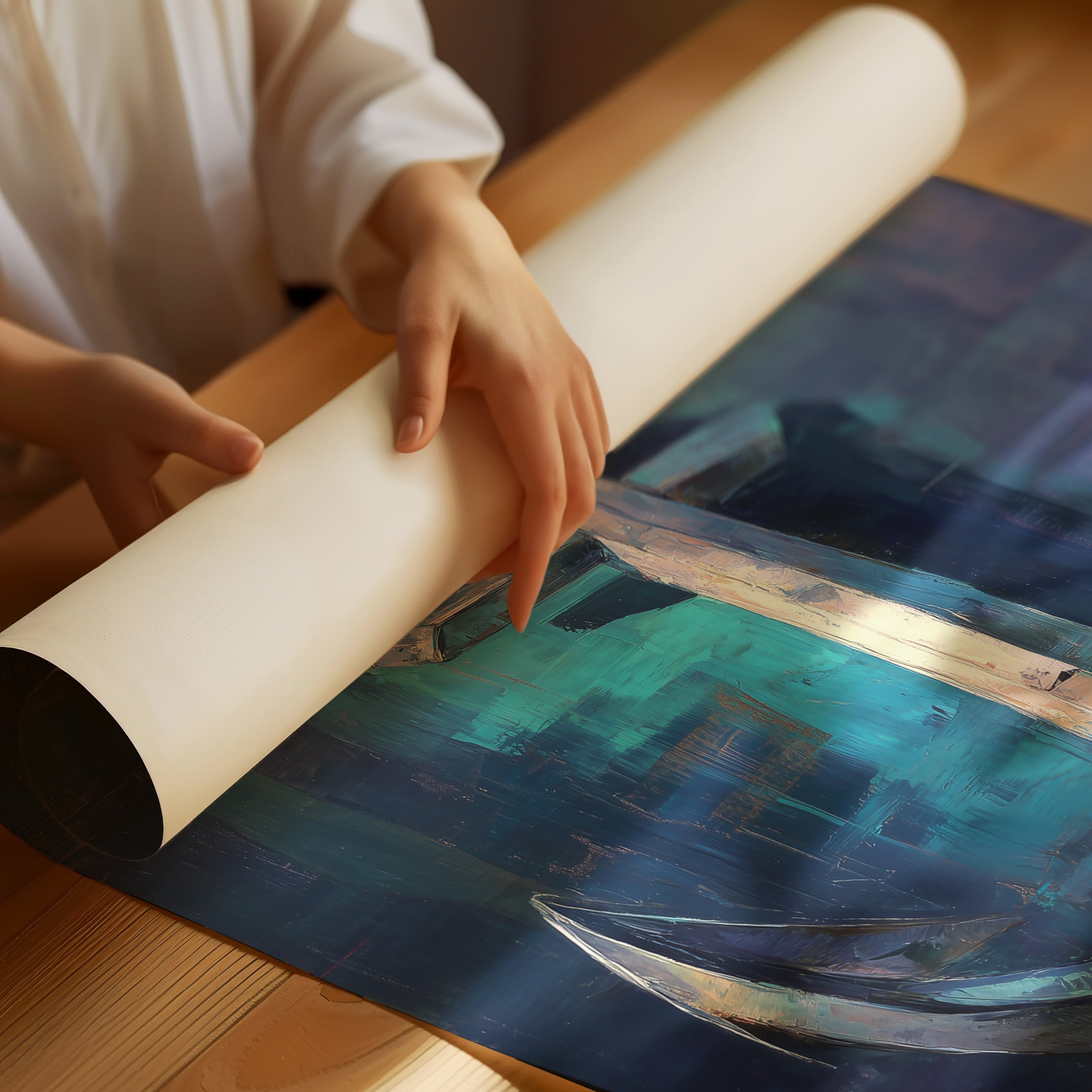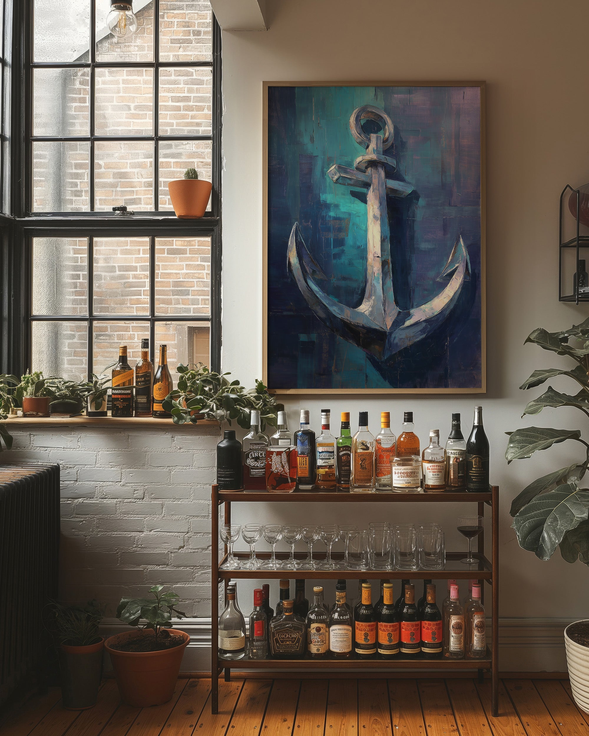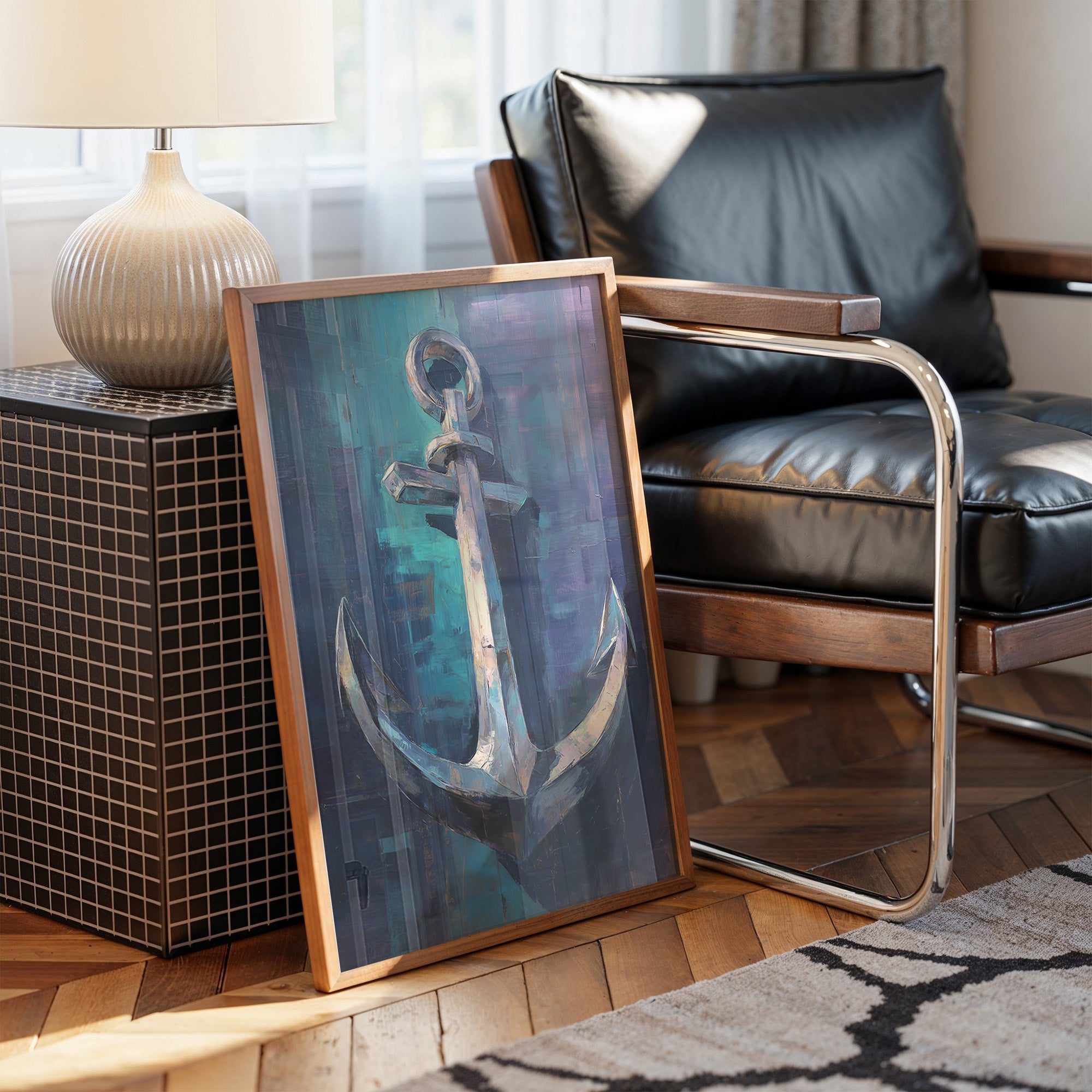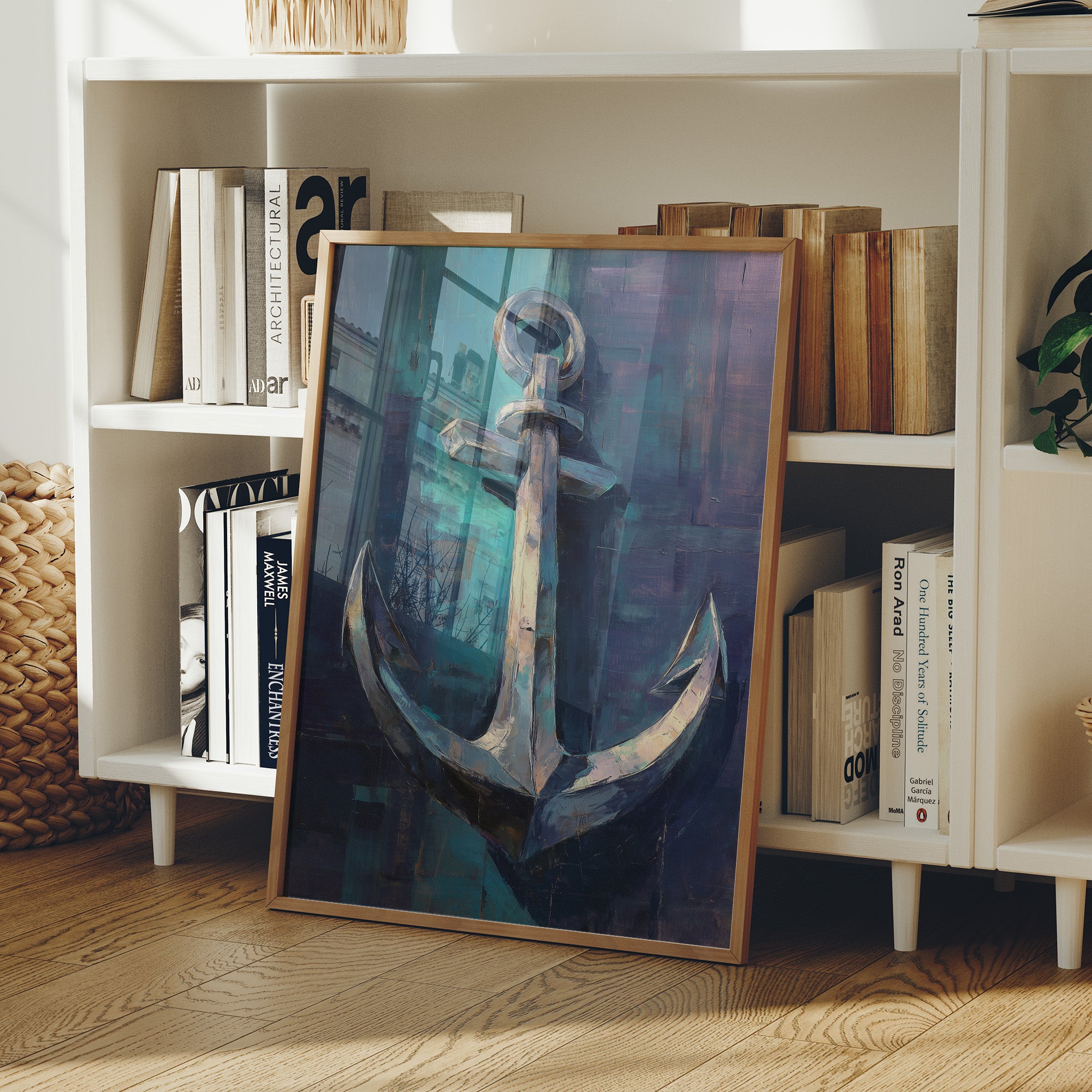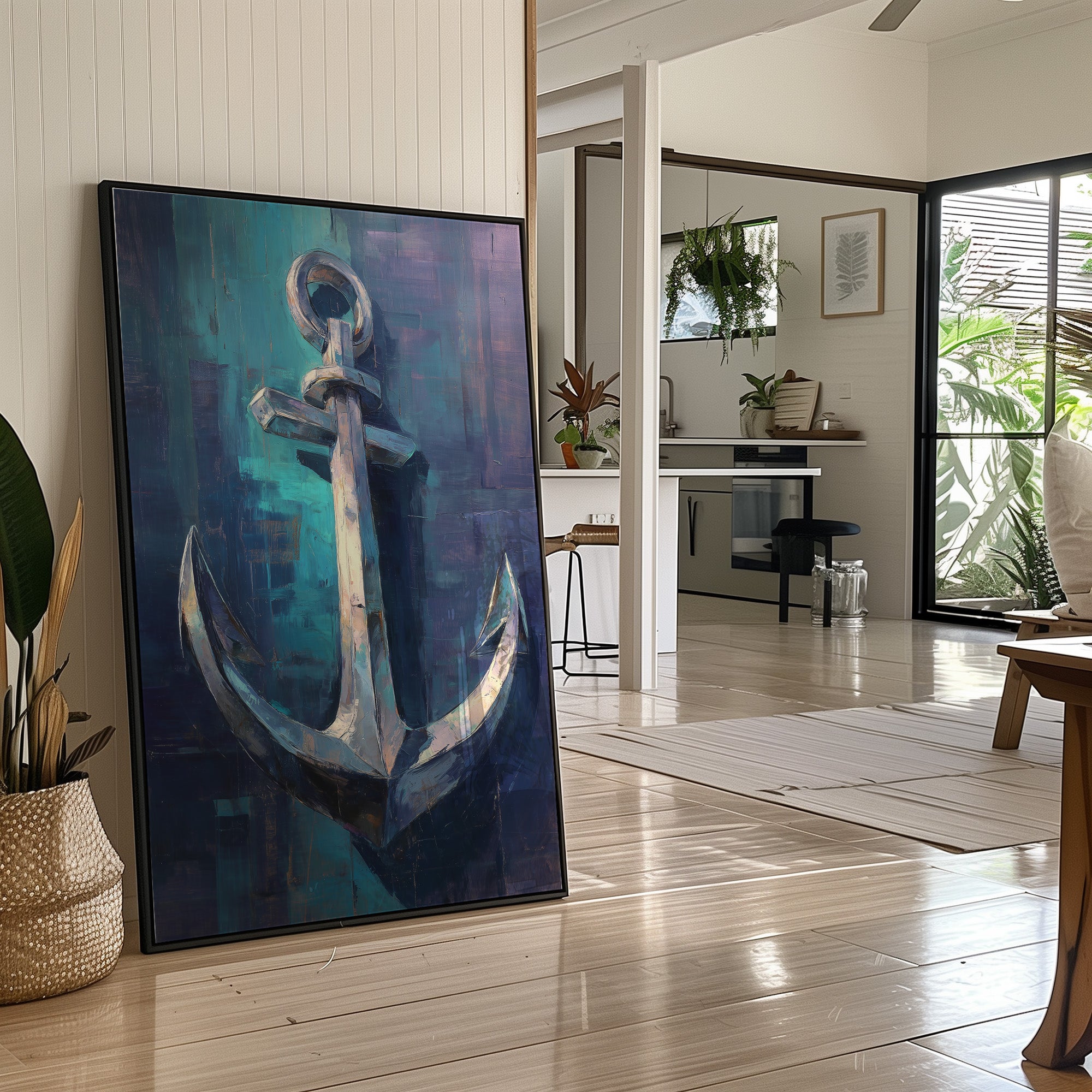 Morning light dances across a serene portrait of maritime strength, where an anchor emerges from layers of teal and navy brushstrokes. The textured painting captures the weathered metal against a backdrop of ocean-inspired hues, suggesting both stability and the mysterious pull of distant shores. The wooden frame complements the nautical theme, creating a harmonious bridge between the art's cool palette and the warm wooden elements of the surrounding space. This piece would bring coastal sophistication to a study, living room, or anywhere you wish to anchor a sense of calm determination.