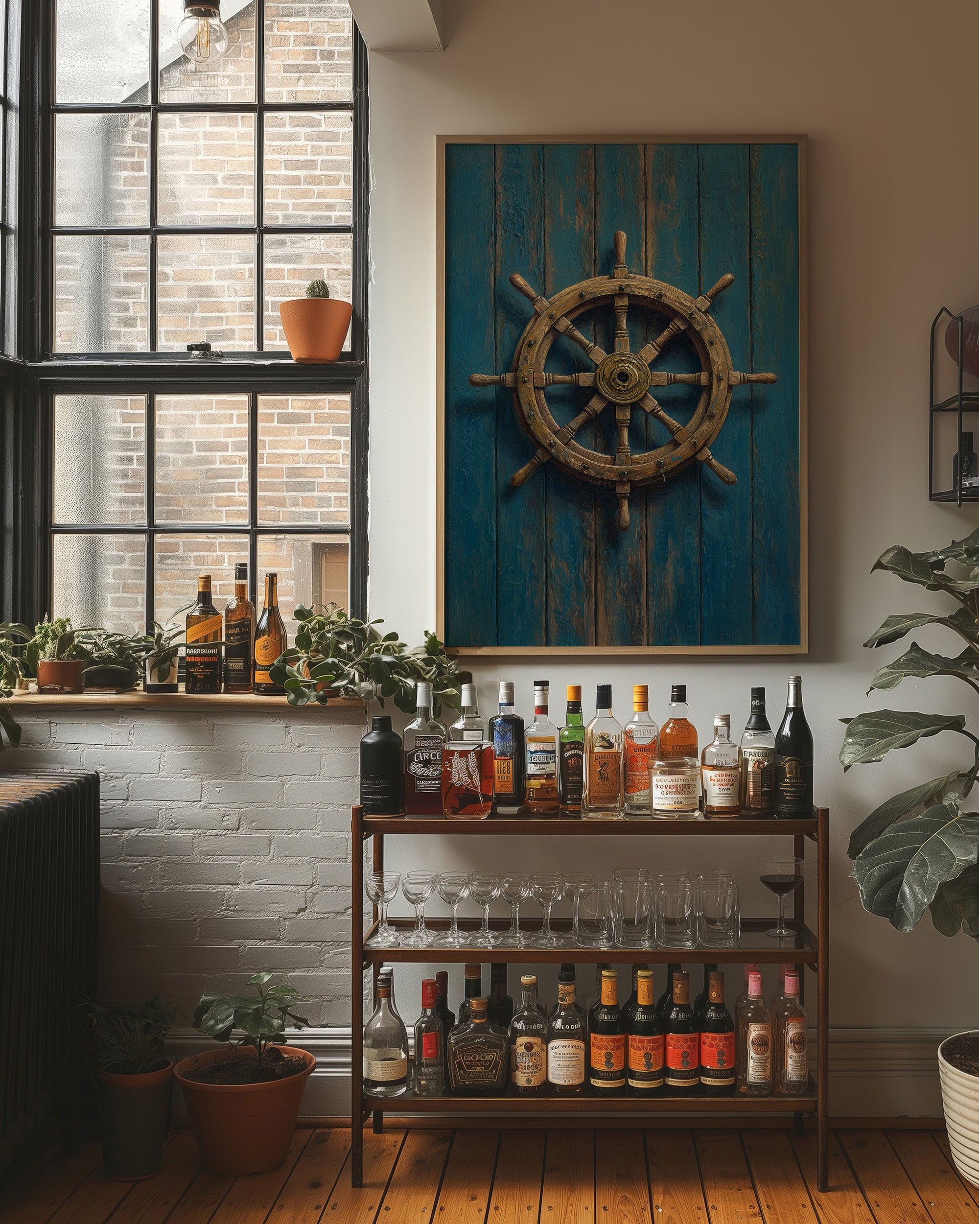 Sunlight streams across weathered turquoise planks, illuminating a captain's wheel that seems to hold stories of distant shores. The rustic nautical piece brings coastal charm into this sophisticated living space, its aged wood and brass details creating a perfect tension between adventure and comfort. This statement piece finds its ideal home in a modern living room, adding character to sleek leather furniture and warm wood tones.
