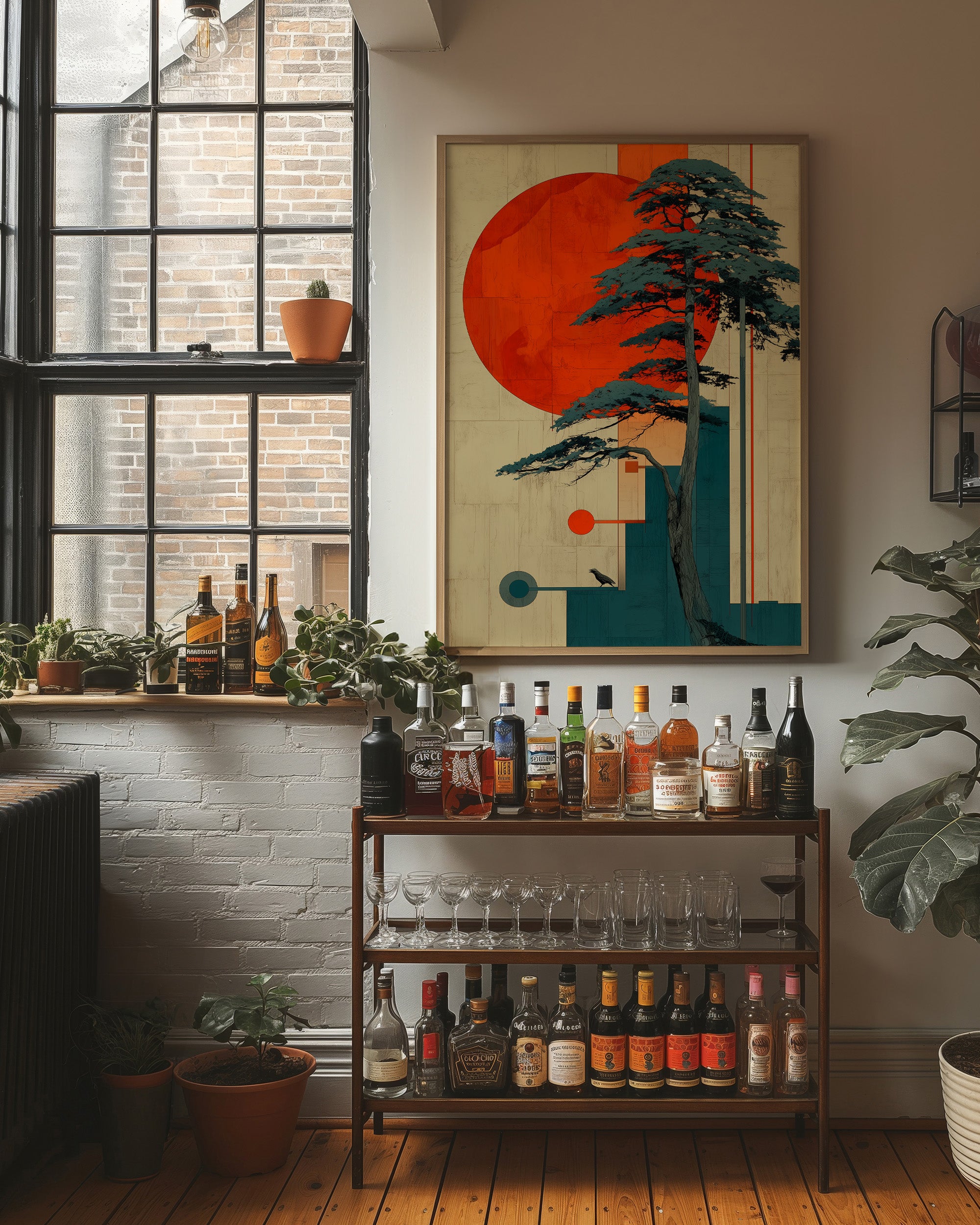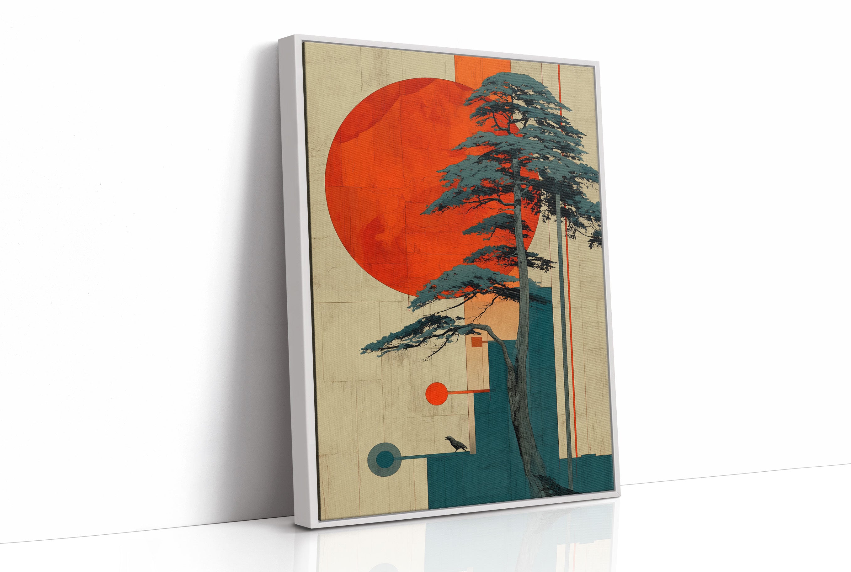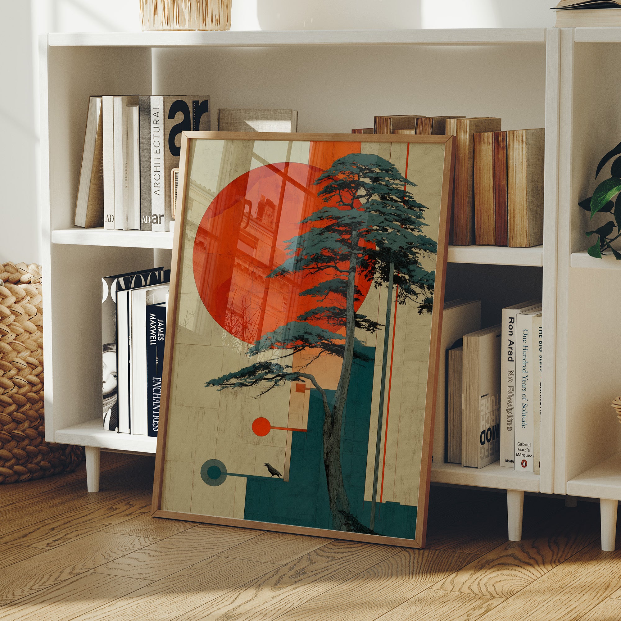 A striking geometric composition where nature meets modern design, as a majestic pine tree stands against a bold crimson sun. The interplay of teal and orange creates a contemporary take on traditional Japanese aesthetics, while clean lines and circular elements bring balance to the organic form of the tree. This piece rests elegantly against a minimalist bookshelf, demonstrating how contemporary Asian-inspired art can transform a reading nook into a contemplative sanctuary.