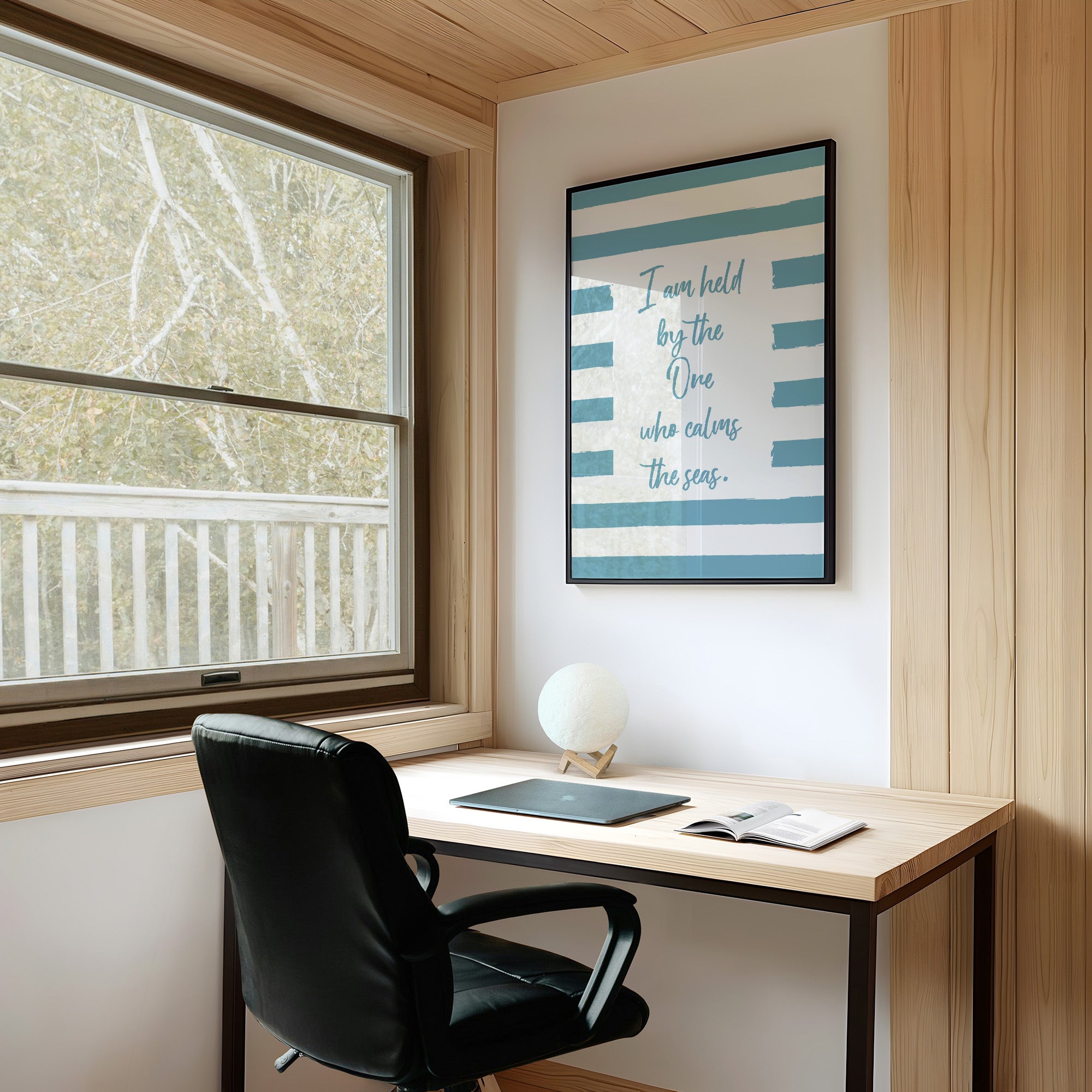 Gentle waves of aquamarine wash across a pristine canvas, creating a sense of peaceful rhythm and divine reassurance. The handwritten script flows with the same tranquility as the striped pattern, merging faith and coastal serenity in perfect harmony. The soothing teal palette evokes the healing qualities of water, offering both visual comfort and spiritual affirmation. This piece would bring a peaceful anchor to a bathroom sanctuary, coastal-themed bedroom, or prayer corner where daily reflection meets aesthetic calm.