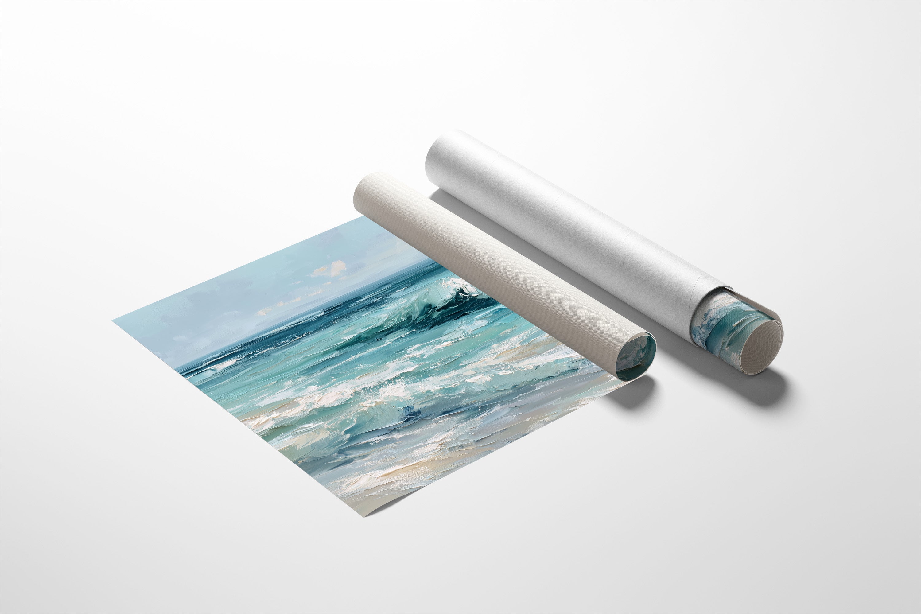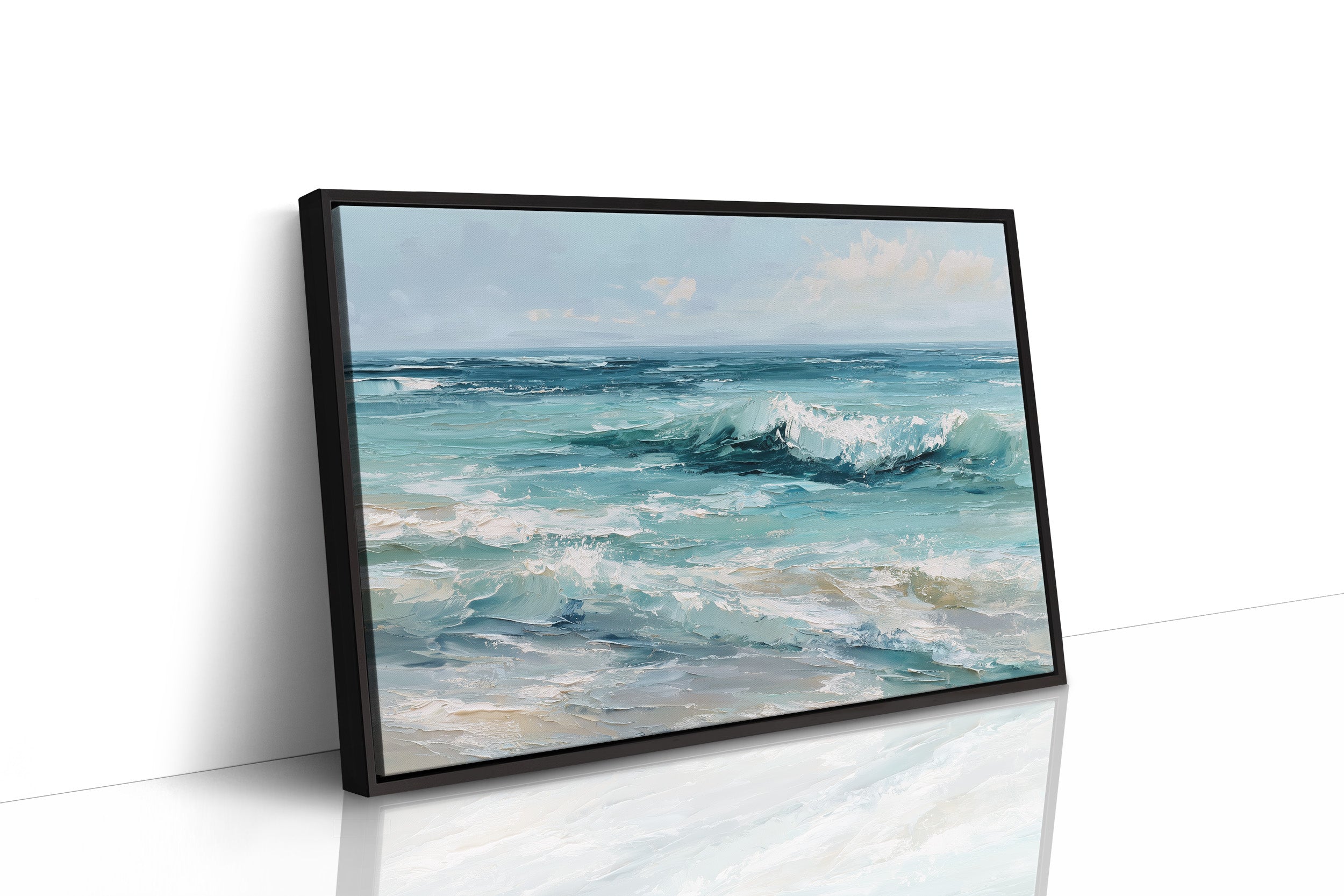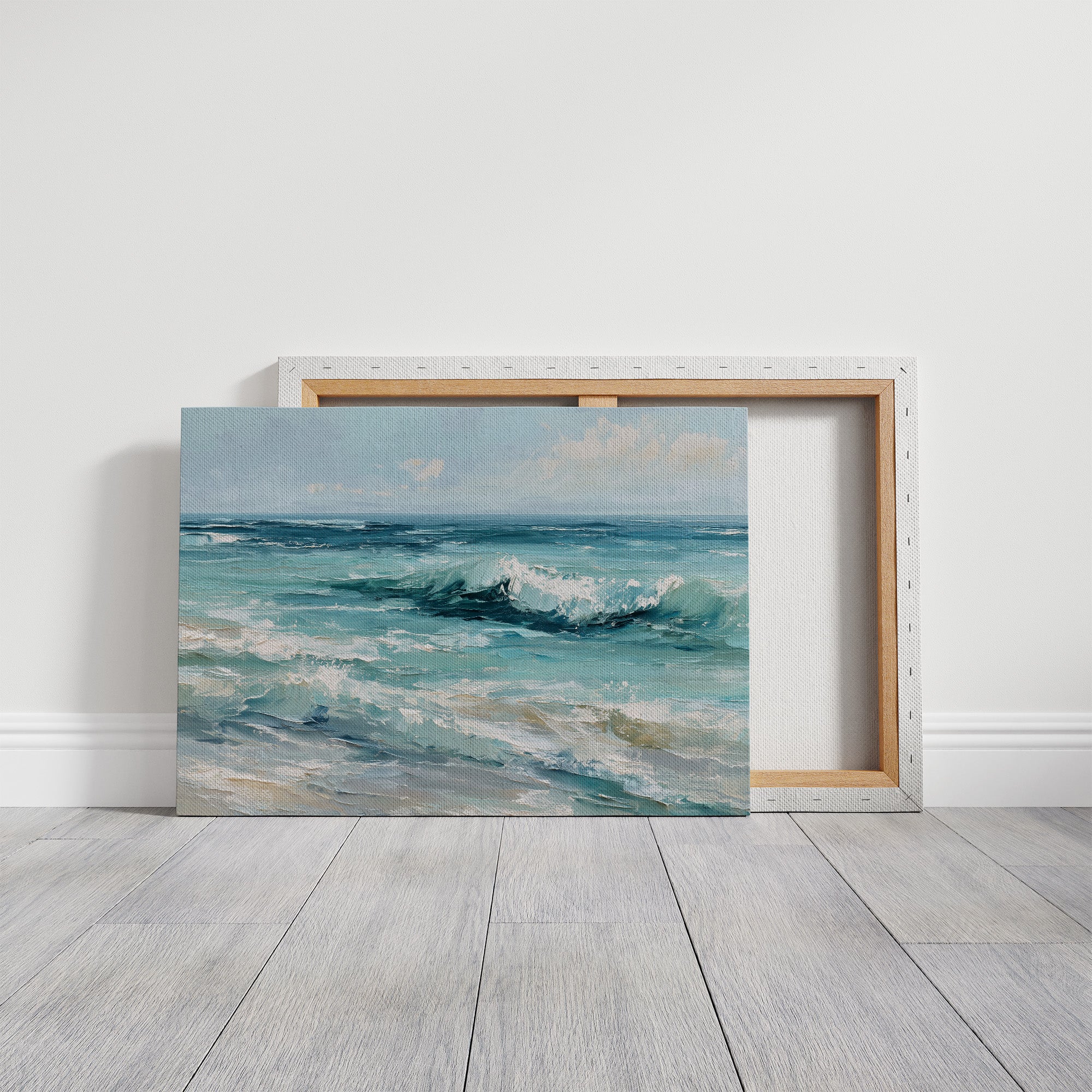The ocean breathes in gentle rhythm, each wave carrying sunlight on its crest like scattered diamonds. Layers of aquamarine and cerulean blend with frothy white caps, creating a dance of movement across the canvas that captures both the tranquility and constant motion of coastal waters. This serene seascape brings the restorative energy of the shoreline into your living space, perfect for creating a peaceful sanctuary in living rooms, bedrooms, or any space where you seek calm reflection.