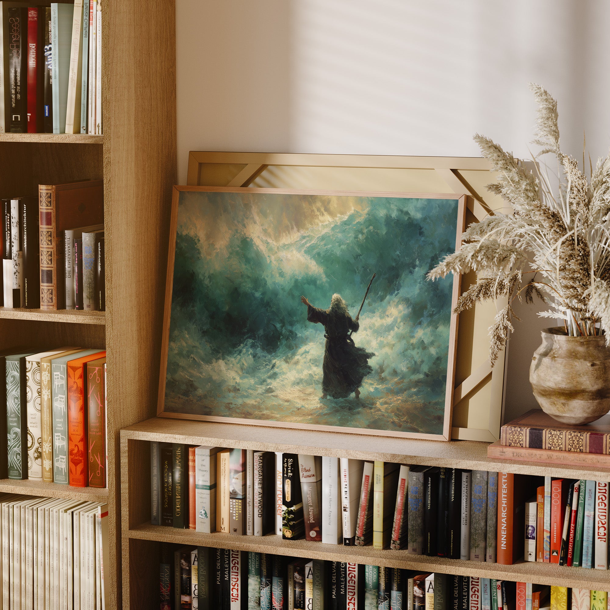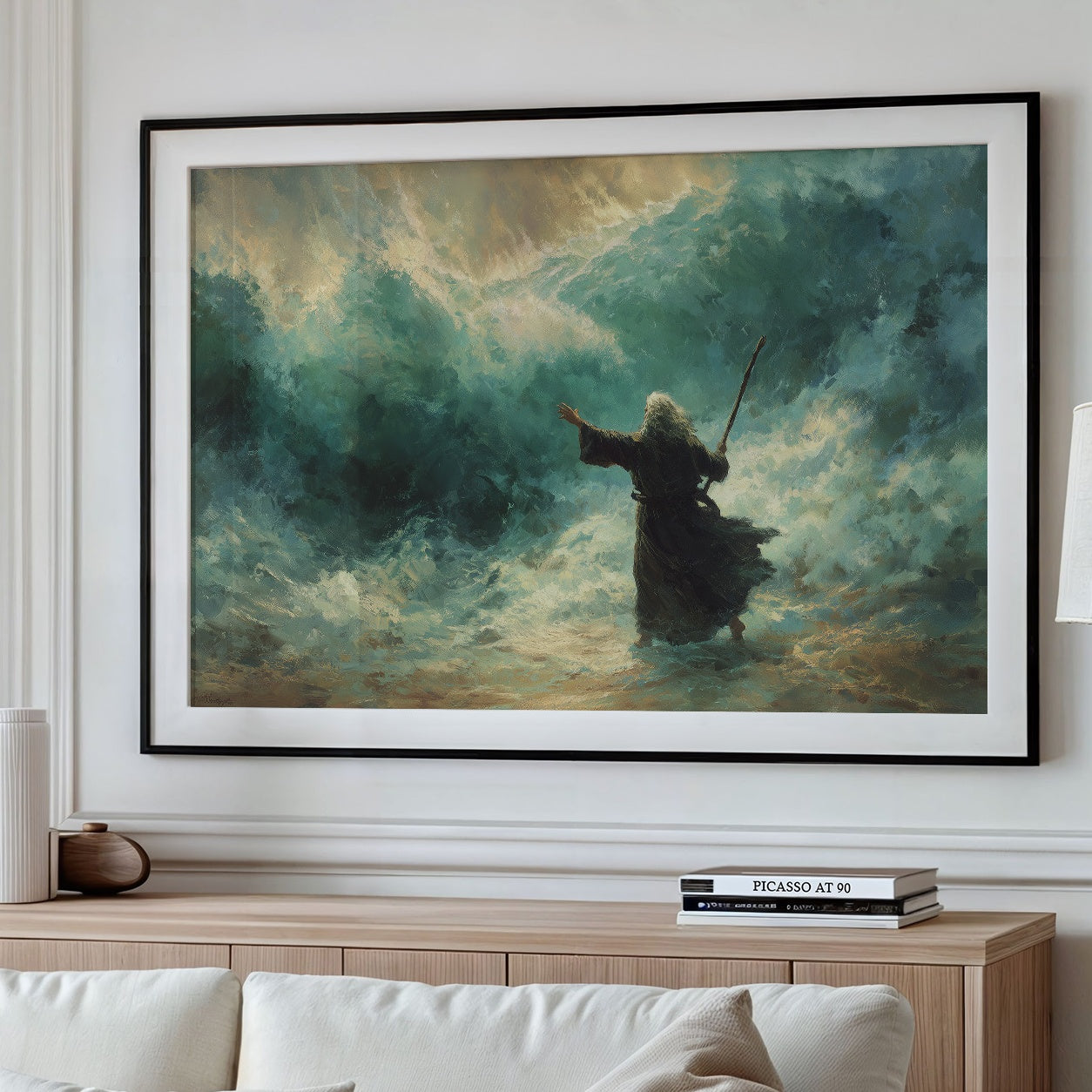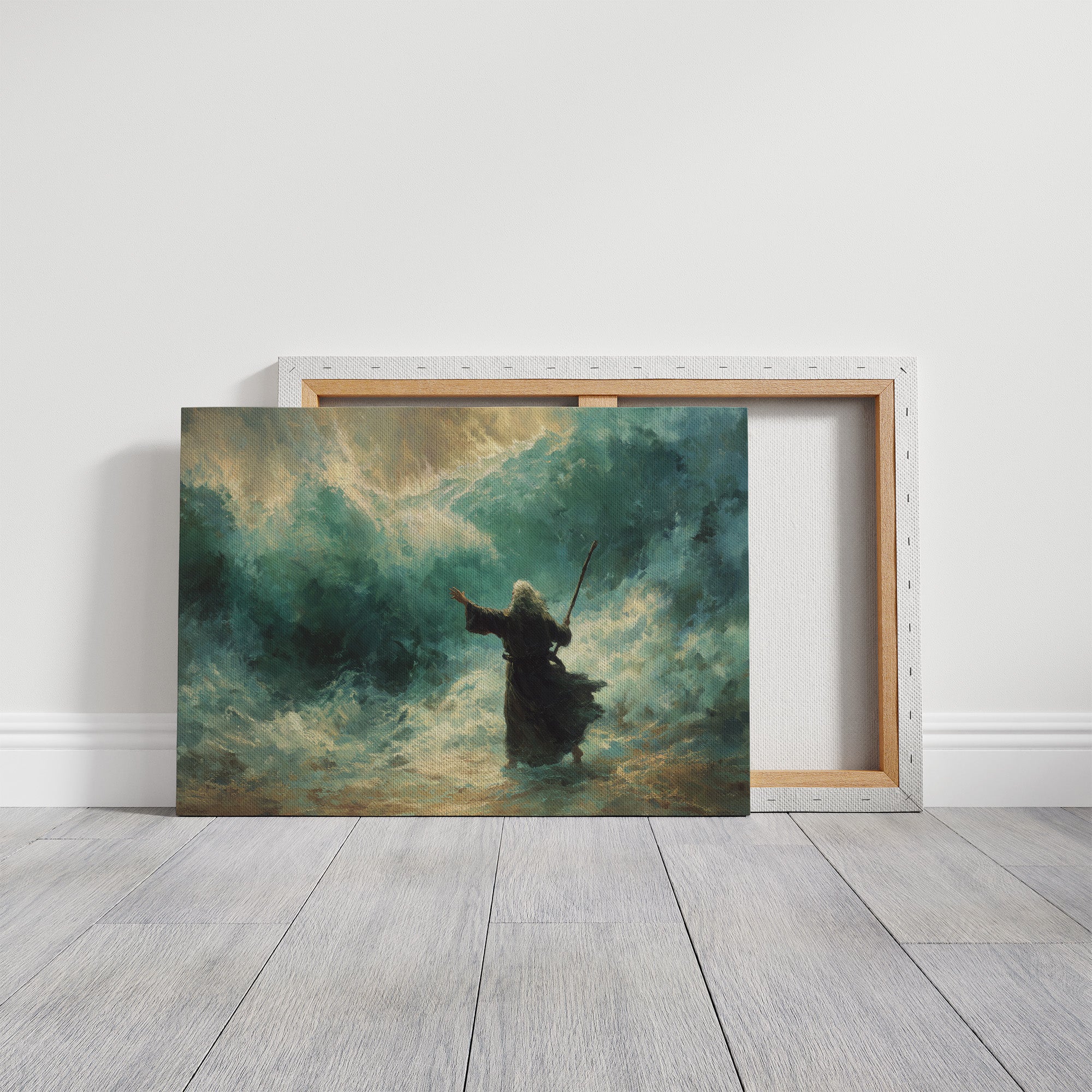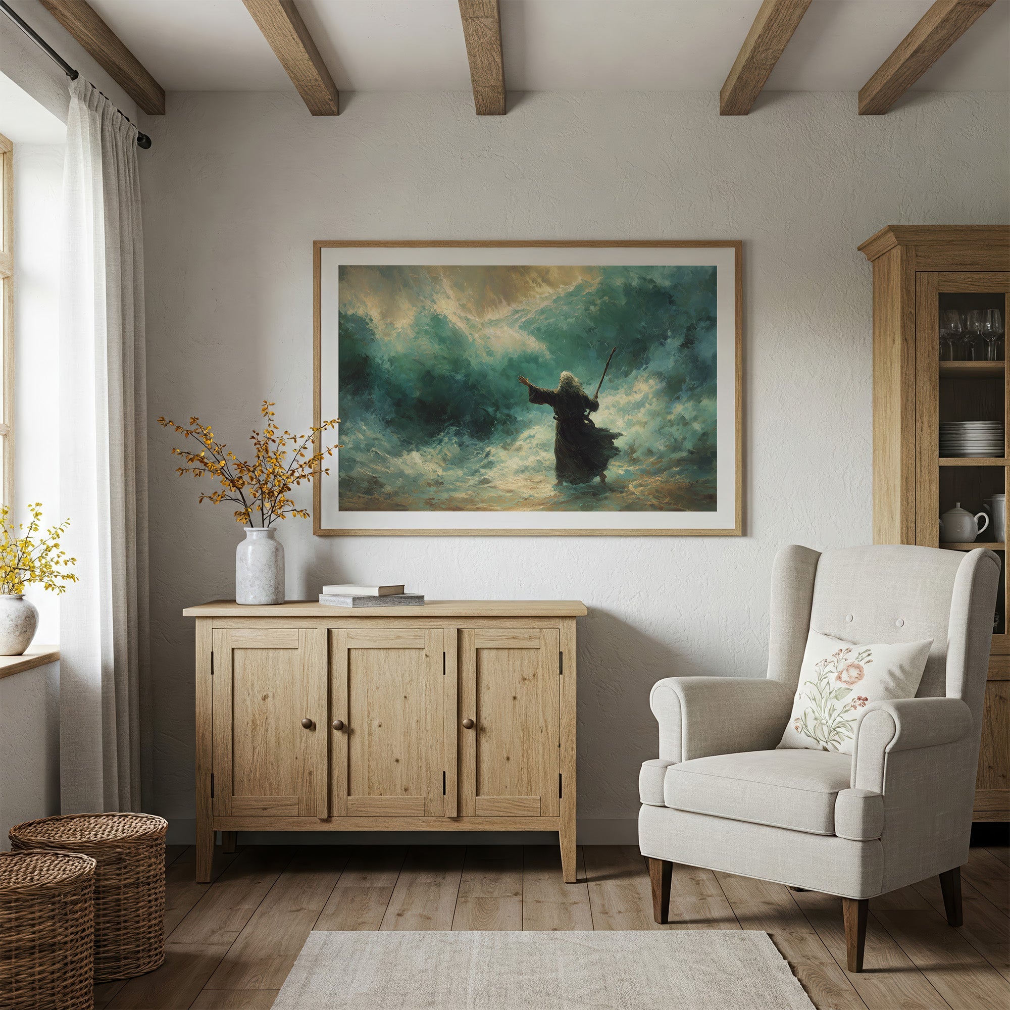 Turbulent teal waters rise in magnificent fury, while a solitary figure raises their staff against the impossible. The dramatic scene captures that moment of supreme courage when one faces overwhelming odds with nothing but faith and resolve. Rich aqua and stormy grays swirl around the robed figure, creating a powerful tension between human determination and nature's raw power. This contemplative piece finds its perfect home in a reading nook or study, inviting viewers to reflect on their own inner strength during life's storms.