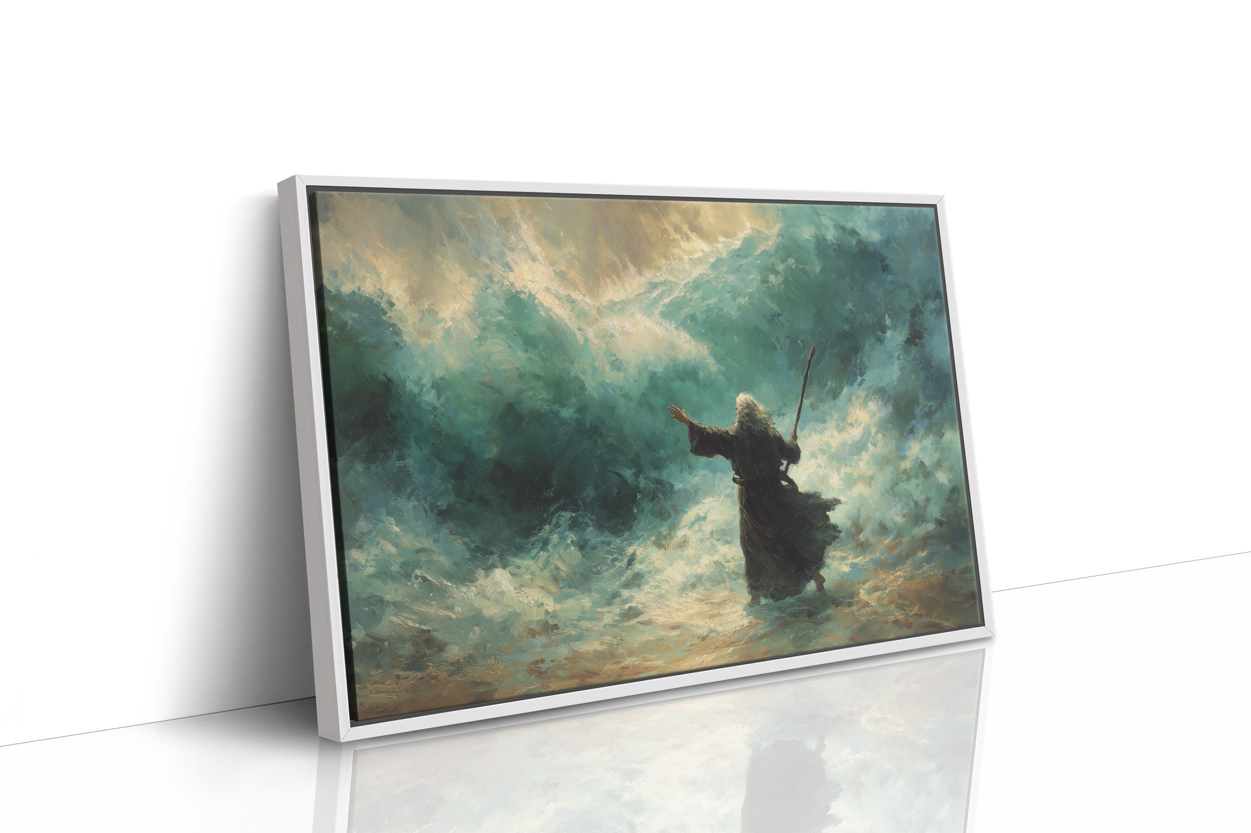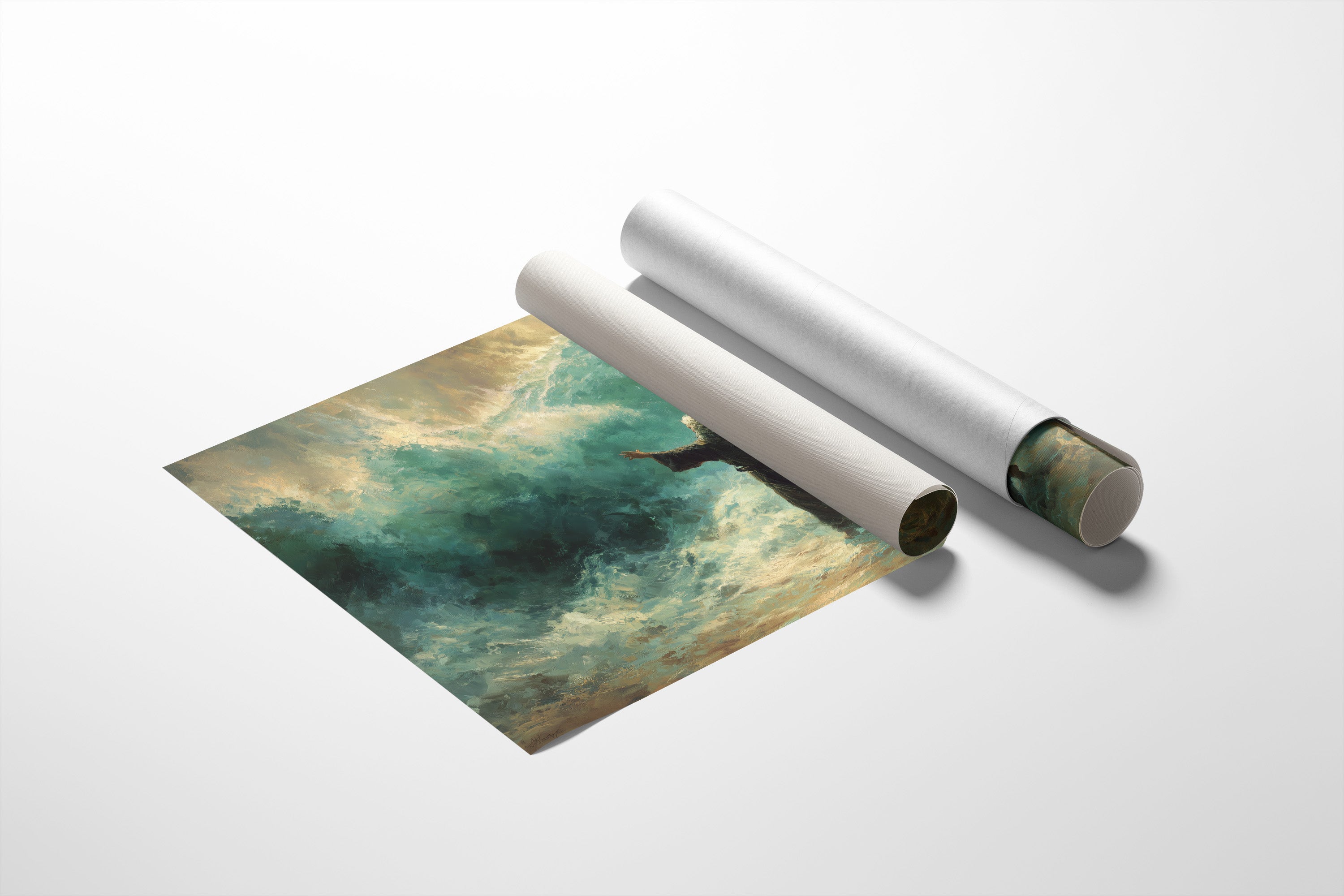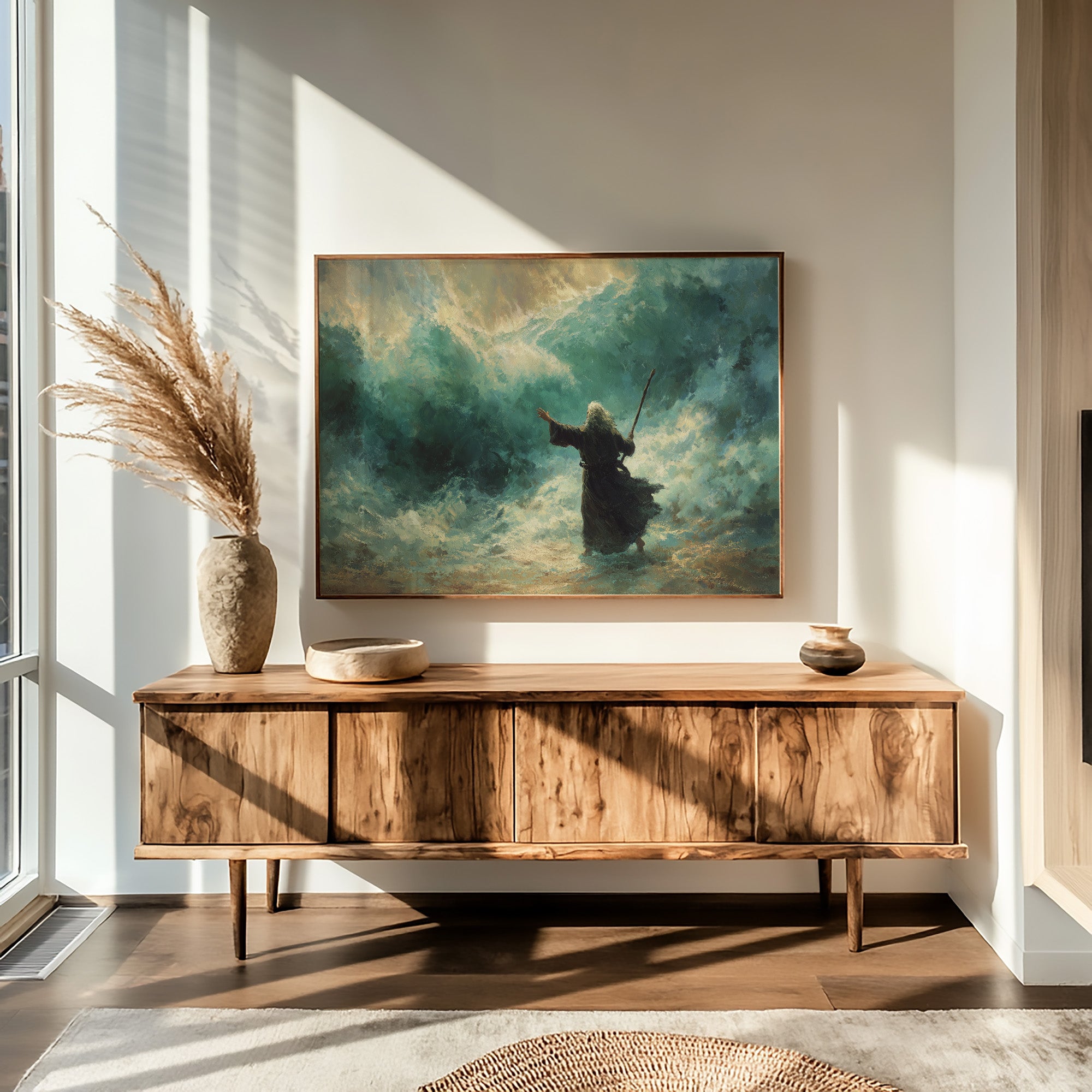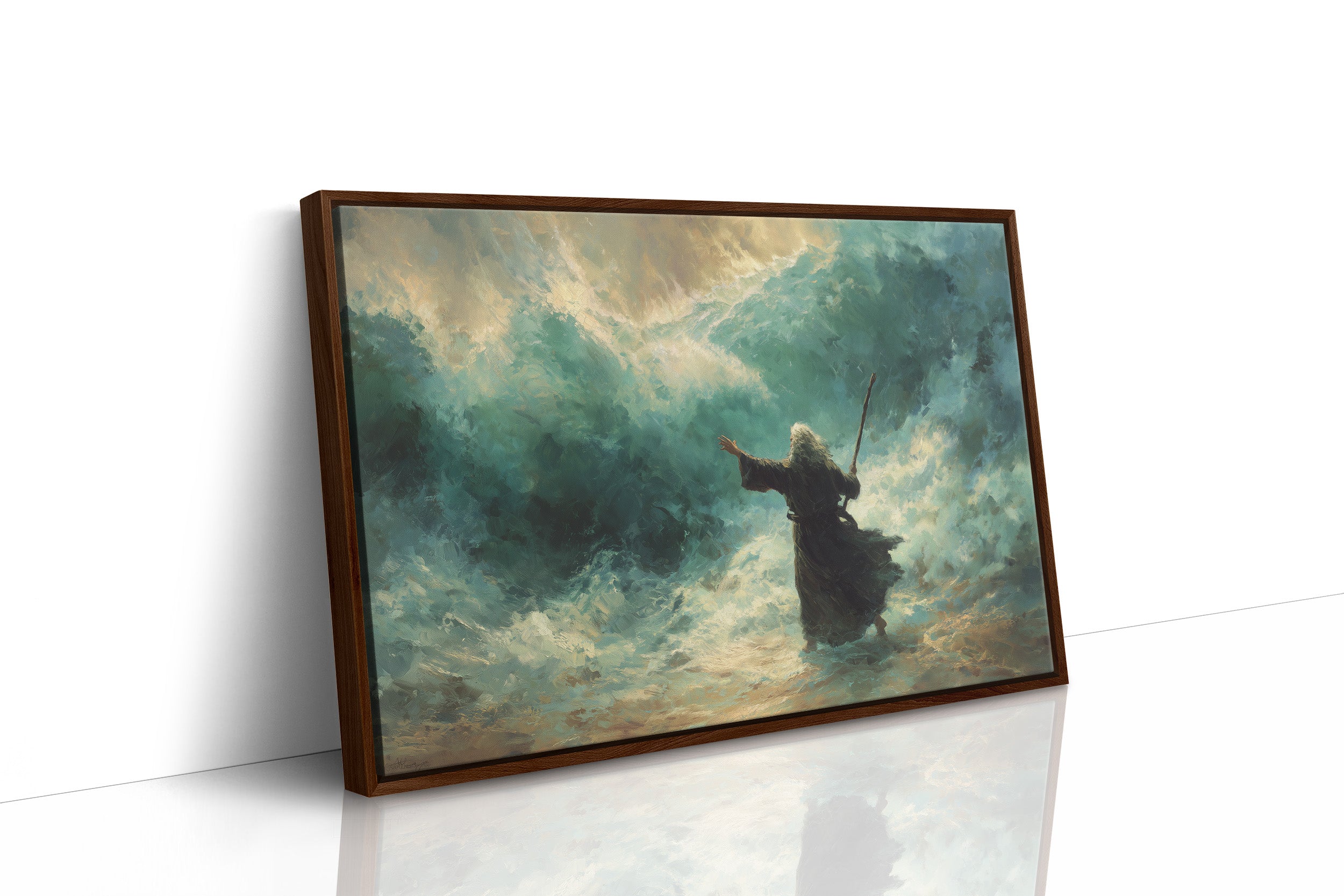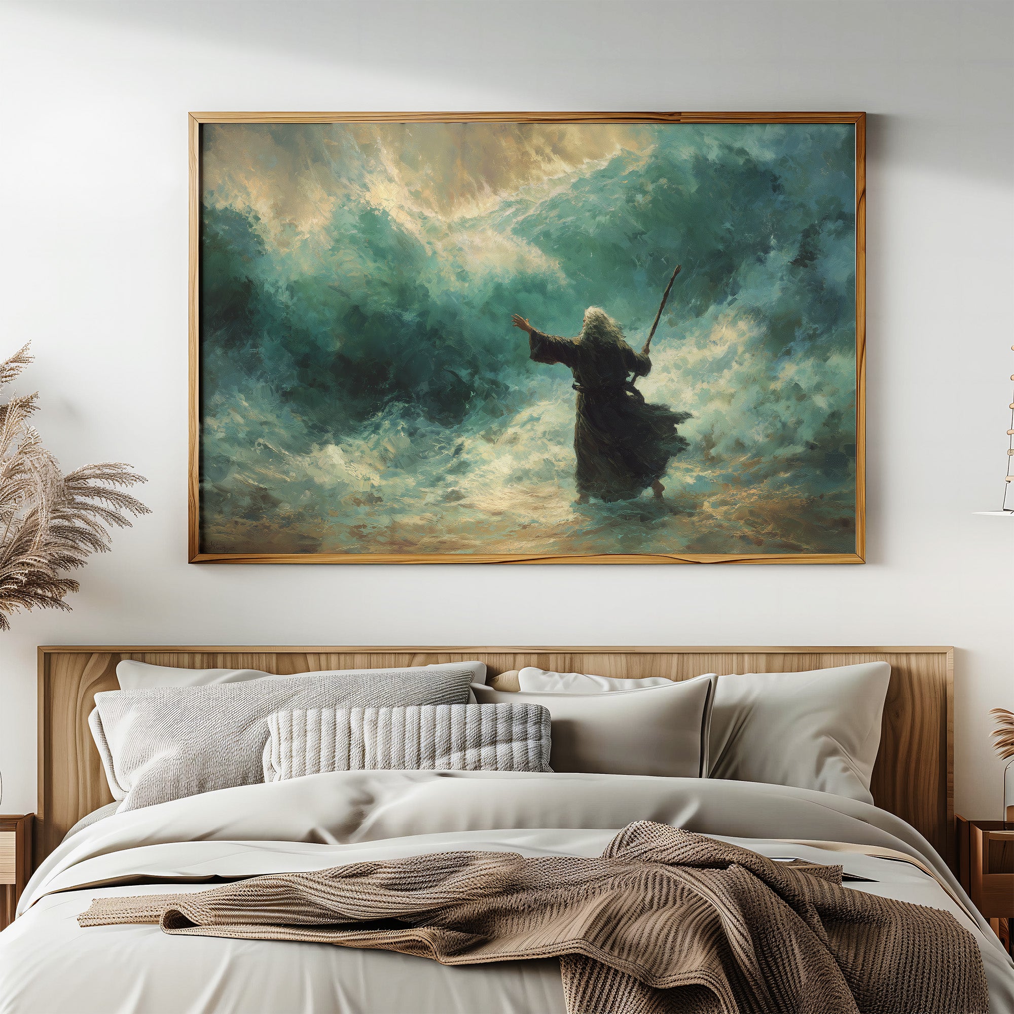 Turbulent teal waters rise in magnificent fury, while a solitary figure raises their staff against the impossible. The dramatic scene captures that moment of supreme courage when one faces overwhelming odds with nothing but faith and resolve. Rich aqua and stormy grays swirl around the robed figure, creating a powerful tension between human determination and nature's raw power. This contemplative piece finds its perfect home in a reading nook or study, inviting viewers to reflect on their own inner strength during life's storms.