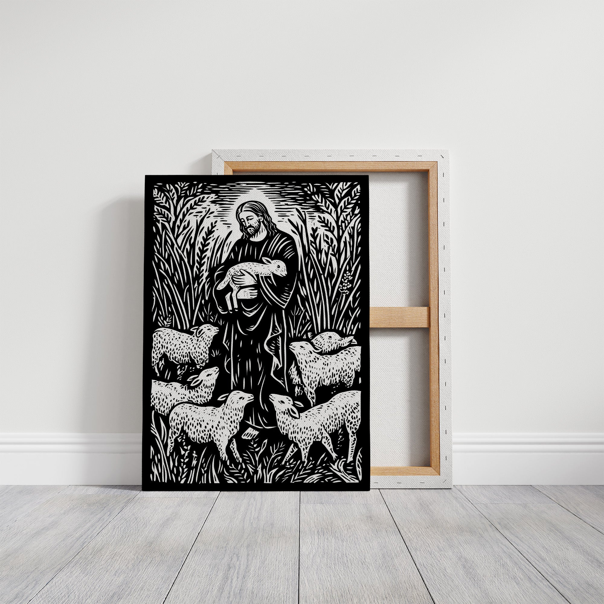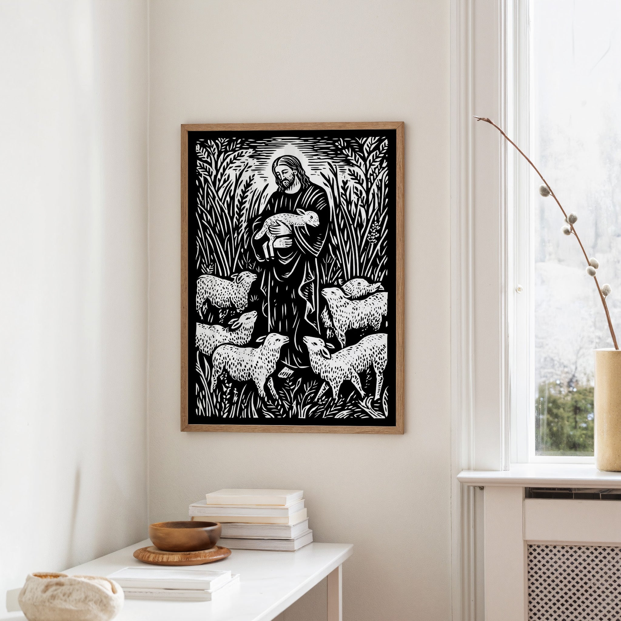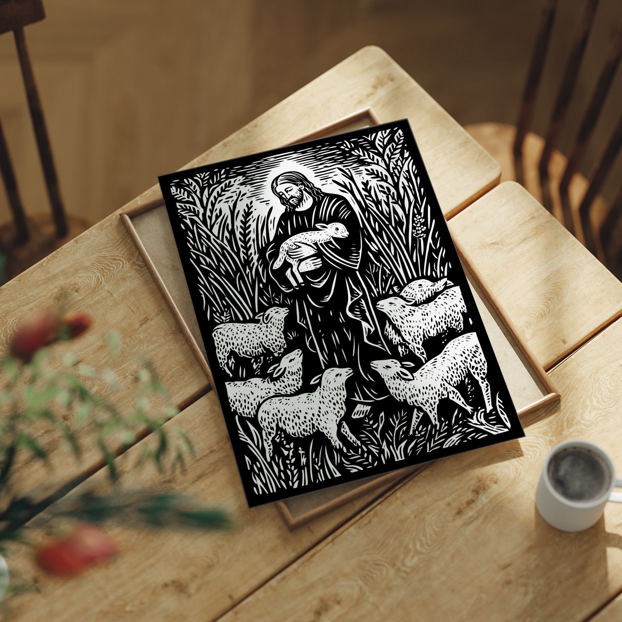 Stillness settles across the meadow as gentle hands cradle new life. The stark contrast of white against black creates a powerful meditation on compassion and care. Bold woodcut lines carve out a scene of profound peace, where the shepherd stands surrounded by his flock, holding the most vulnerable with particular tenderness. This striking linocut style artwork brings timeless symbolism into contemporary spaces.