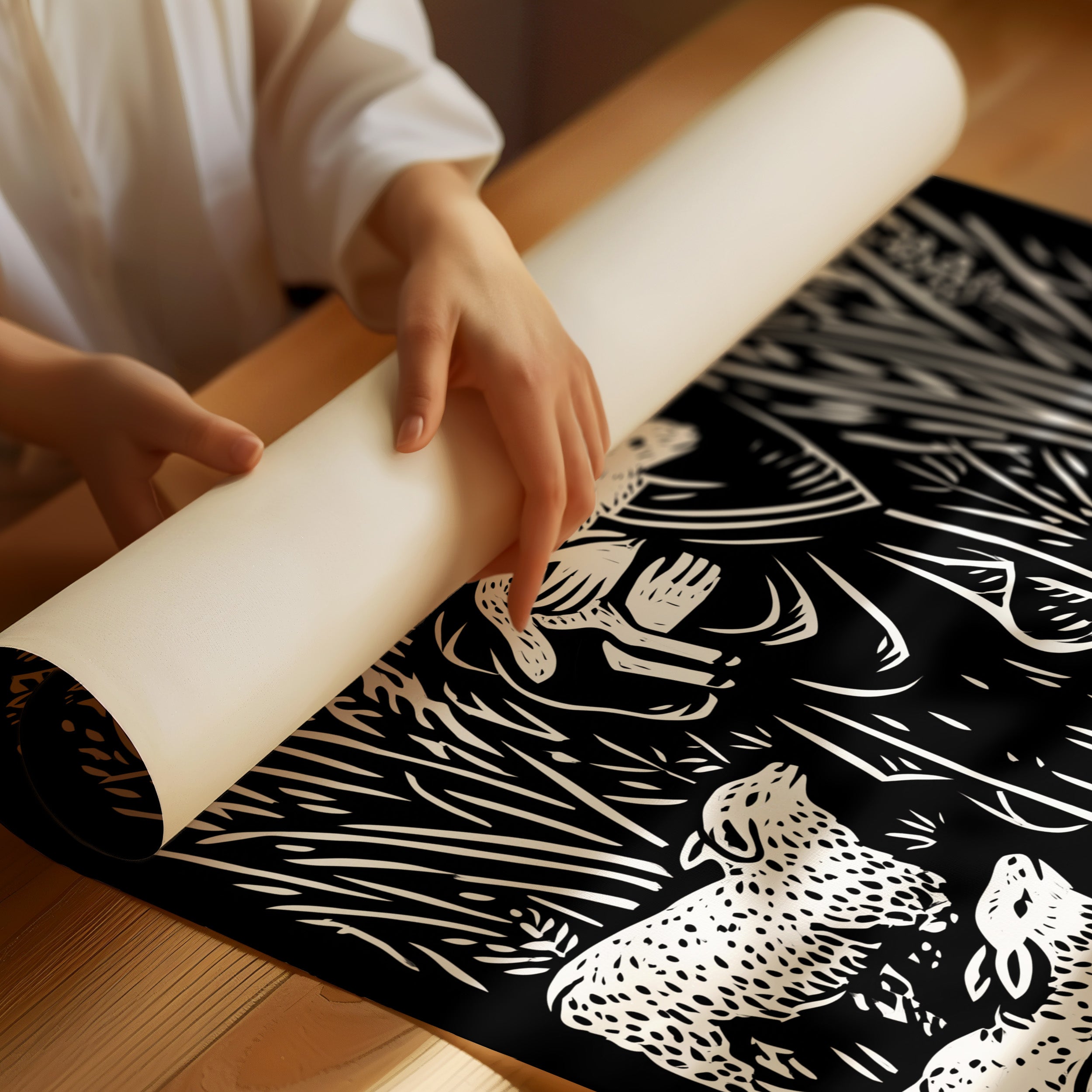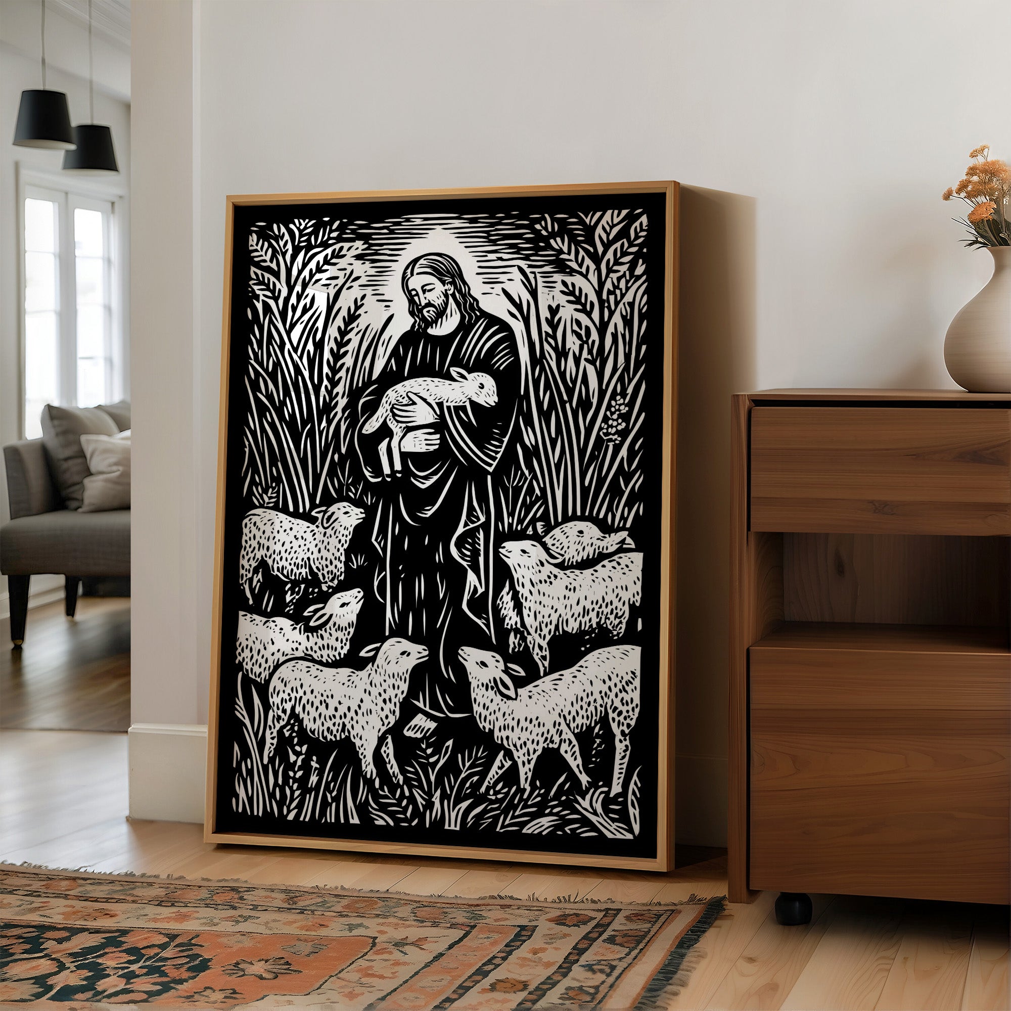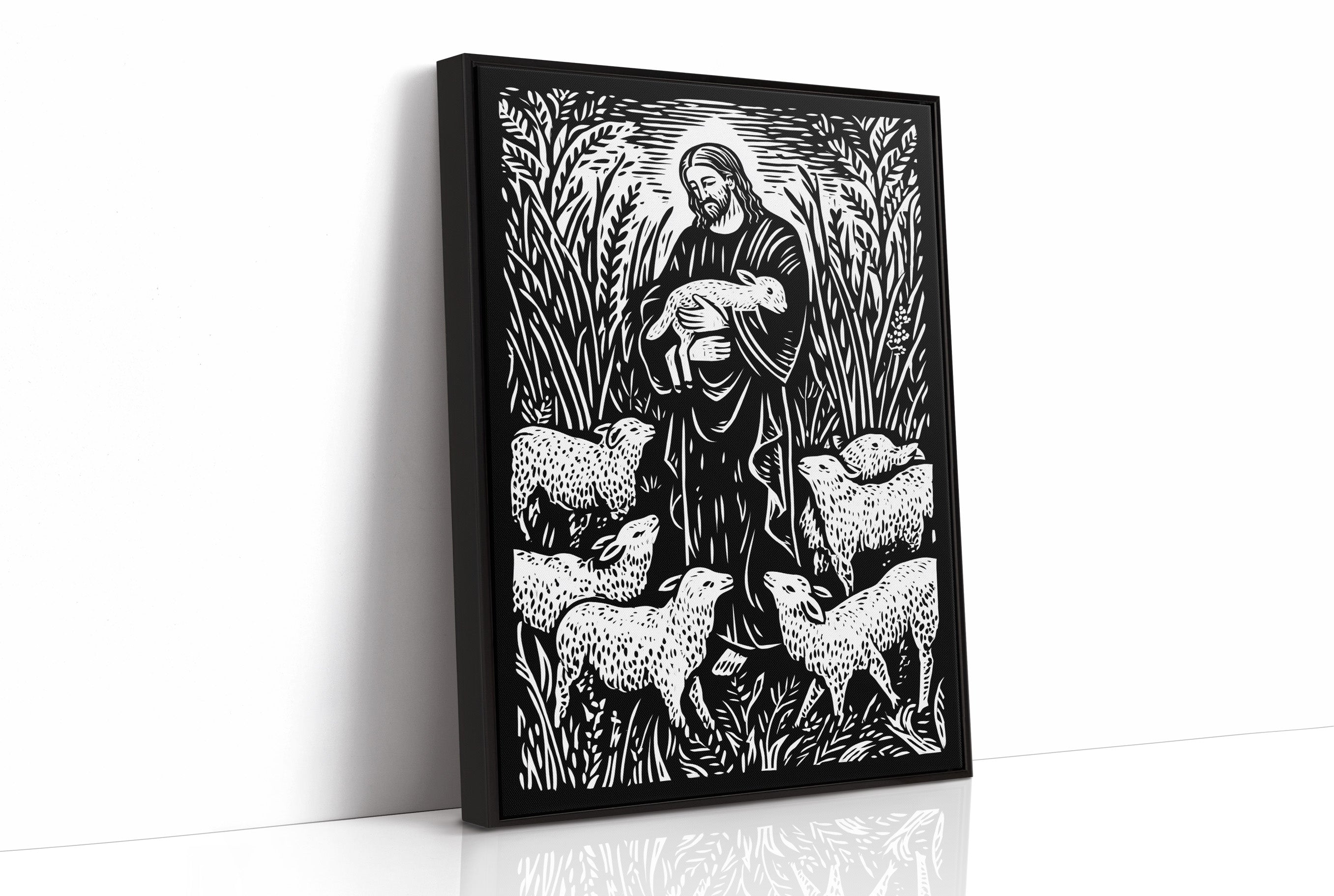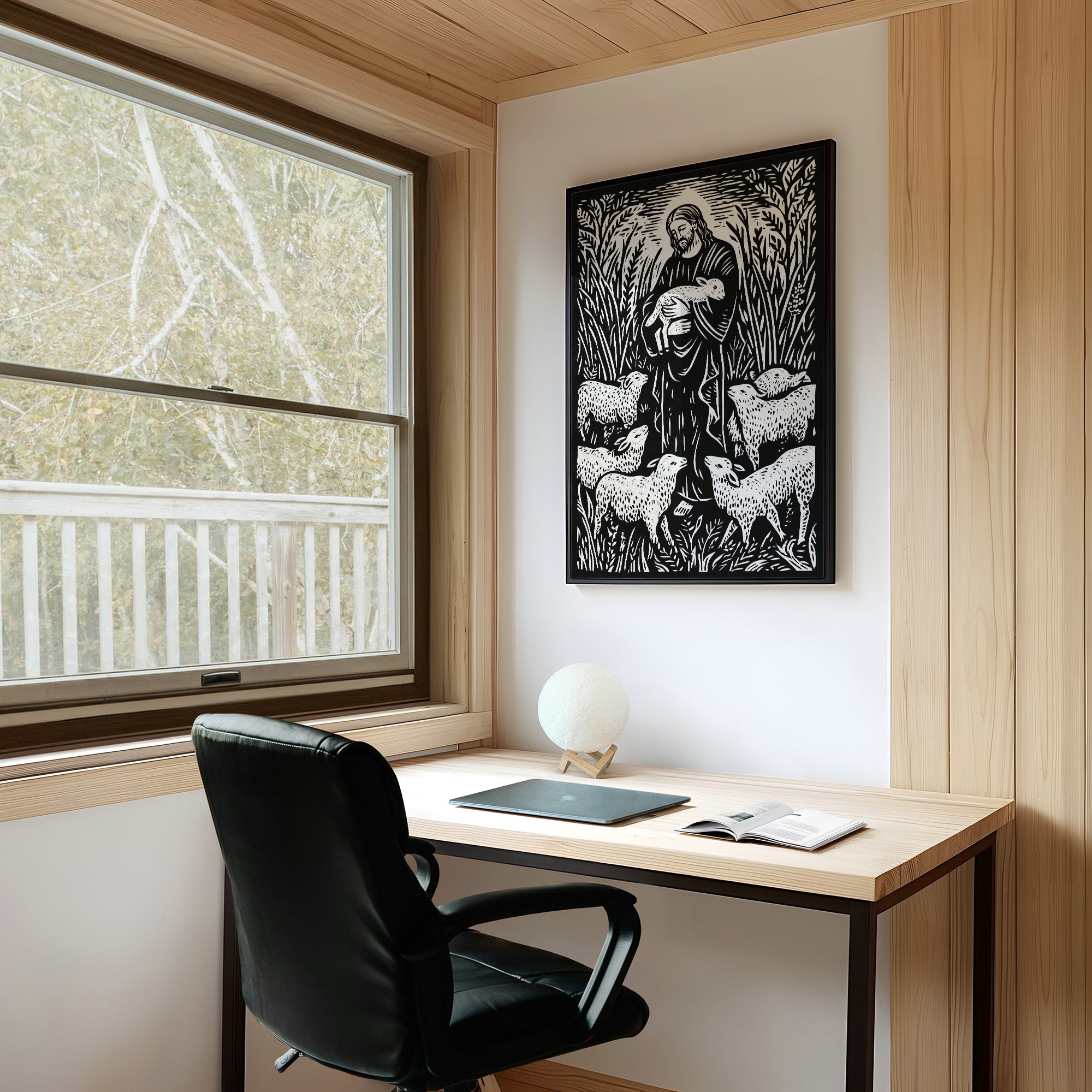 Stillness settles across the meadow as gentle hands cradle new life. The stark contrast of white against black creates a powerful meditation on compassion and care. Bold woodcut lines carve out a scene of profound peace, where the shepherd stands surrounded by his flock, holding the most vulnerable with particular tenderness. This striking linocut style artwork brings timeless symbolism into contemporary spaces.