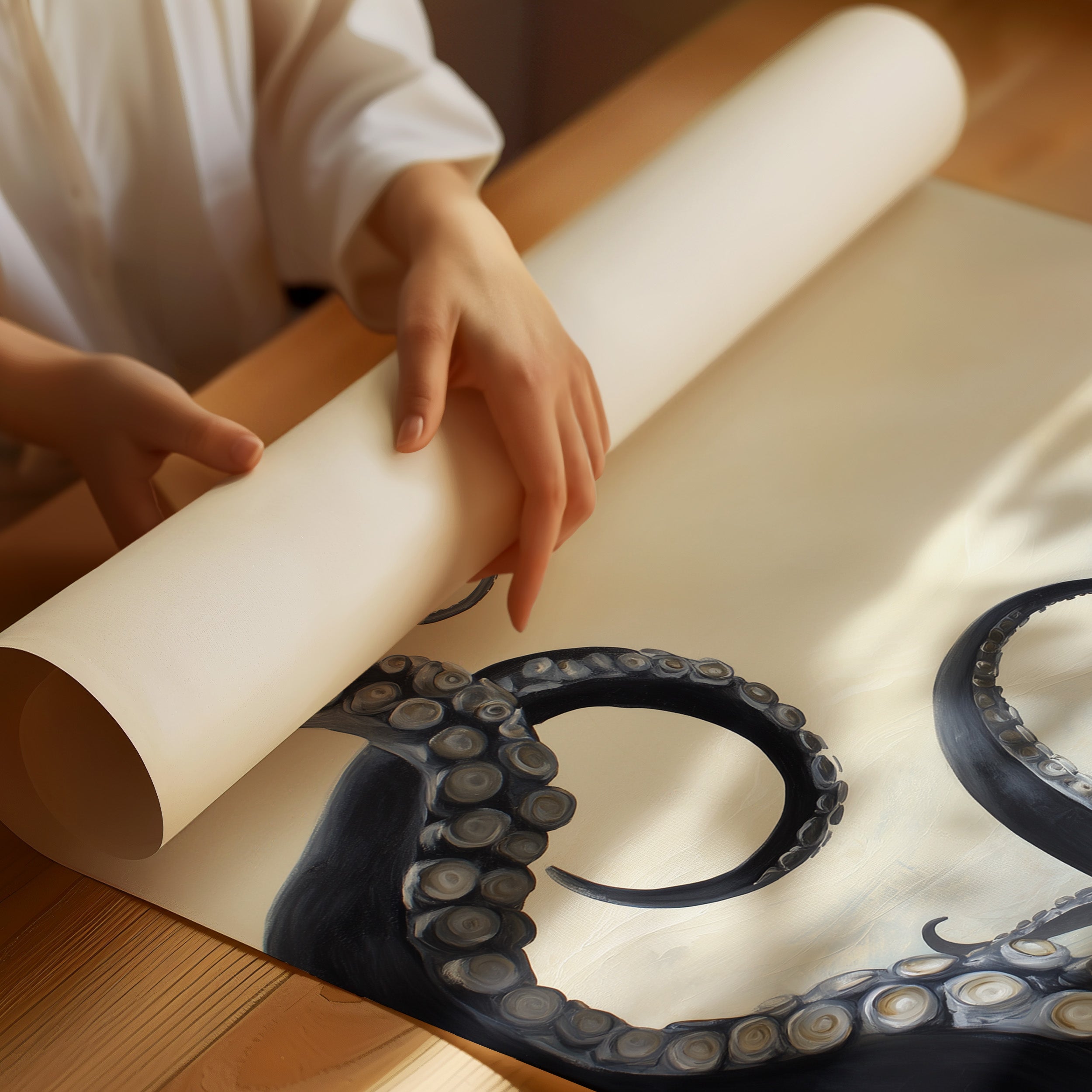 Morning light spills across a sophisticated living space, illuminating an elegant octopus print waiting to be hung. The monochromatic tentacles curl gracefully against a soft beige background, their texture contrasting beautifully with the sleek leather armchair and ribbed ceramic lamp nearby. This thoughtful arrangement speaks to a curated aesthetic where natural forms meet modern design.