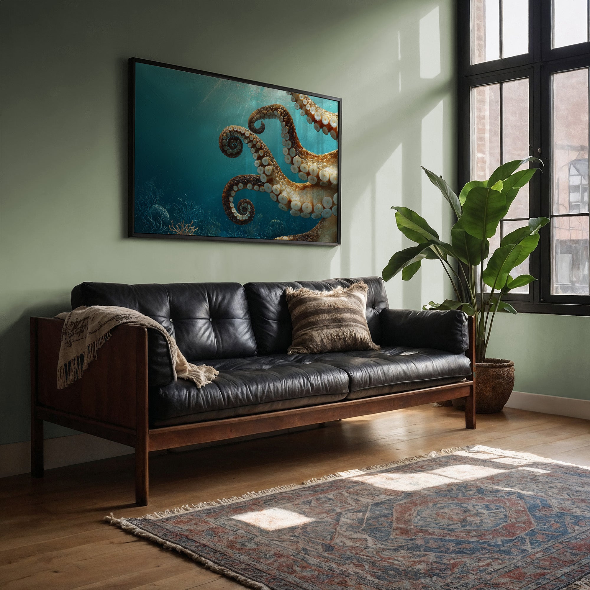 Graceful curves spiral through liquid azure, each suction cup catching fragments of sunlight filtering from above. The octopus extends its amber arms with deliberate elegance against the vibrant teal backdrop, creating a mesmerizing ballet of nature's most intelligent invertebrate. Textured suckers contrast against the smooth, rippling water, while hints of coral in the distance complete this underwater tableau. This captivating marine portrait brings sophisticated depth to dining rooms or studies where its contemplative energy invites conversation.
