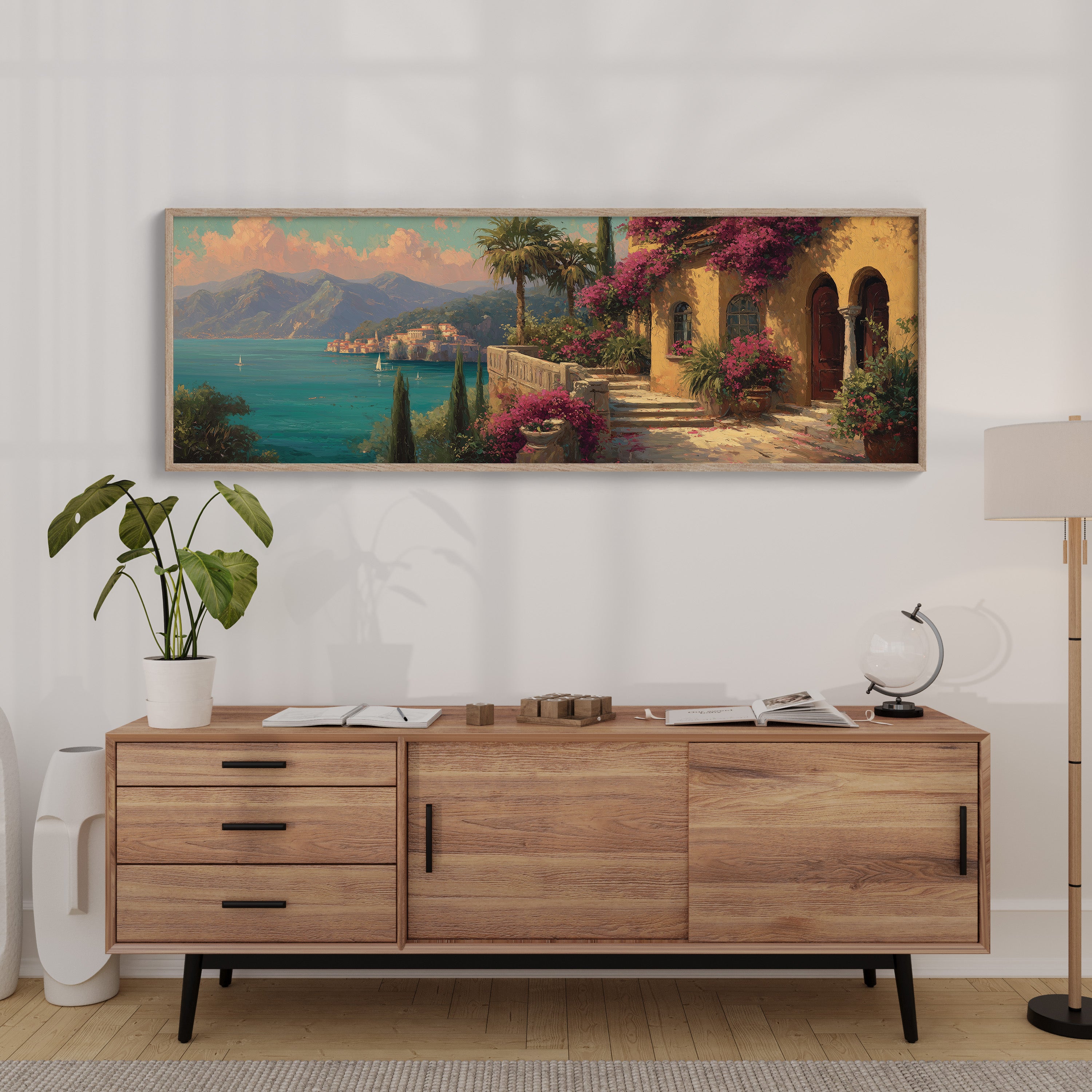 Your artwork should take up 60-75% of wall space above furniture. For standard sofas, choose 24"x36" or larger. When in doubt, go slightly bigger.
