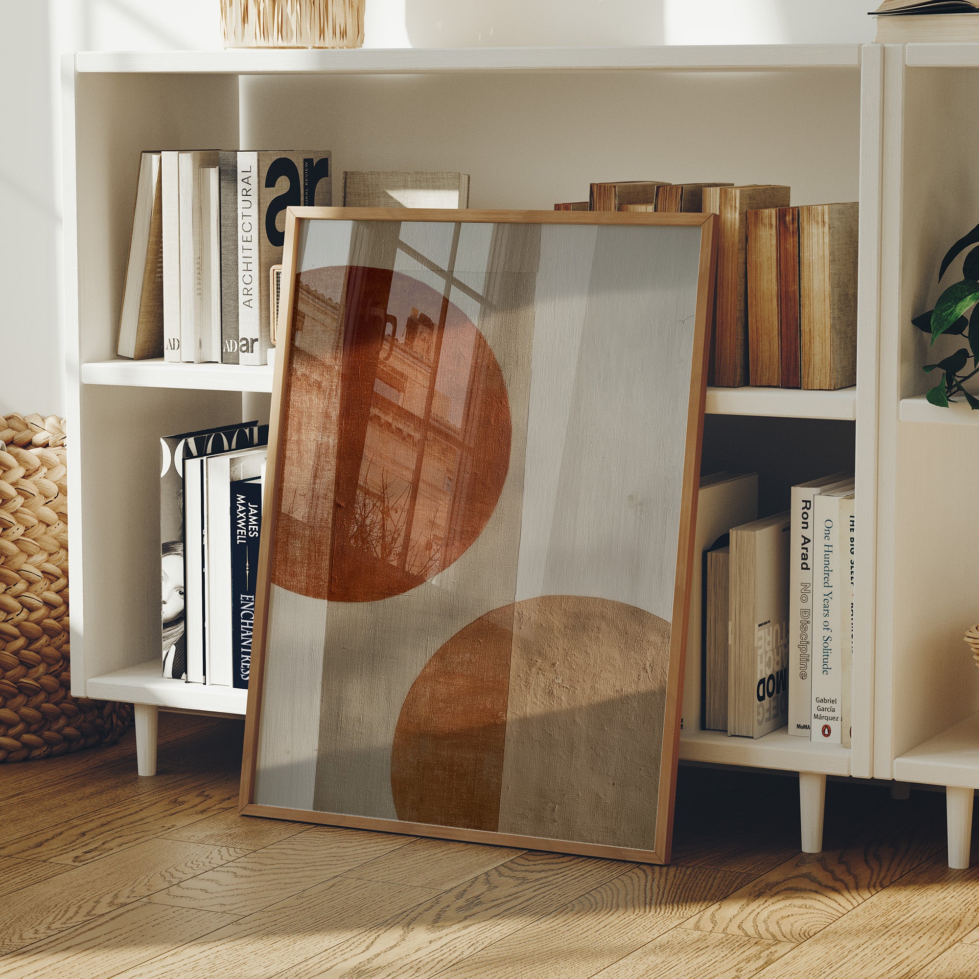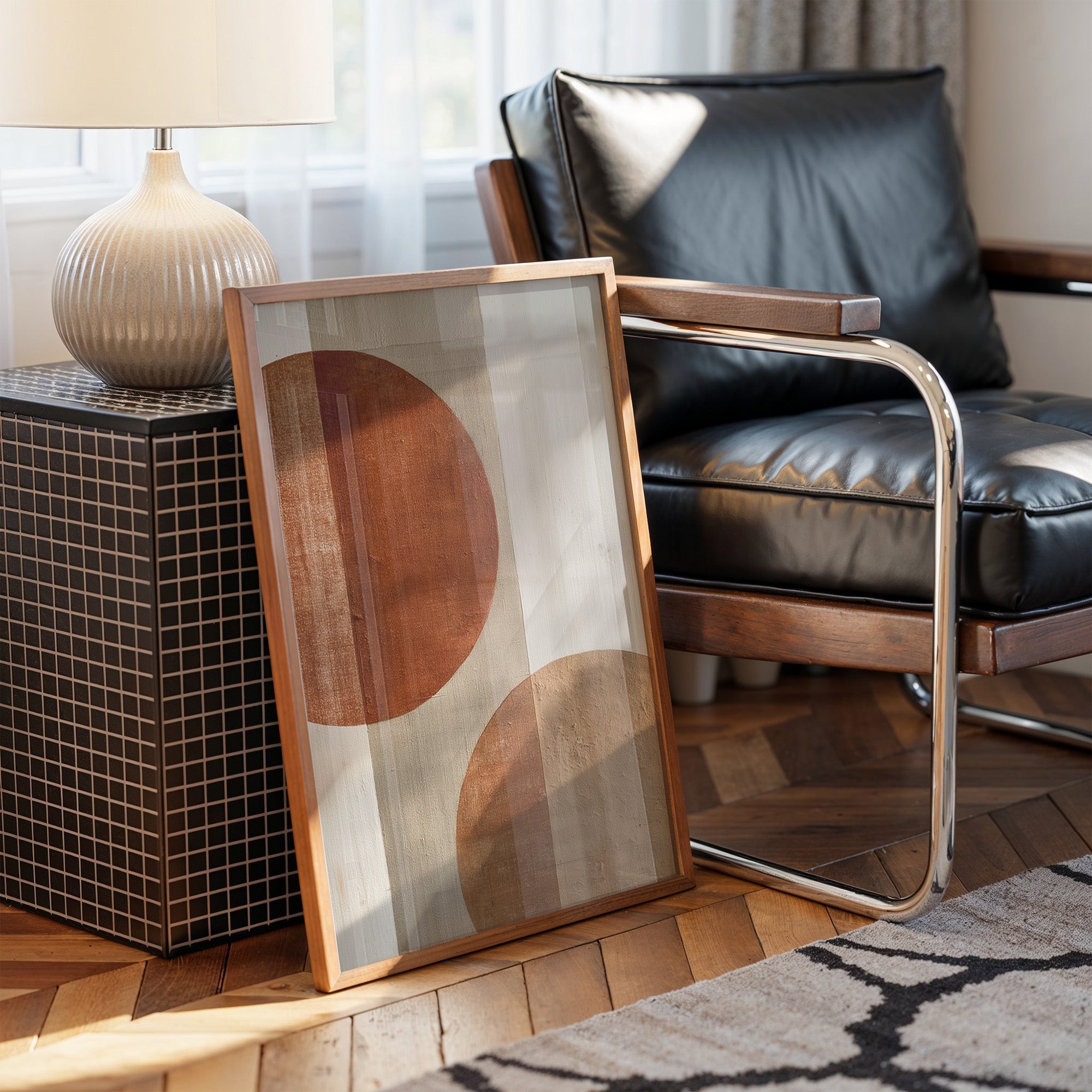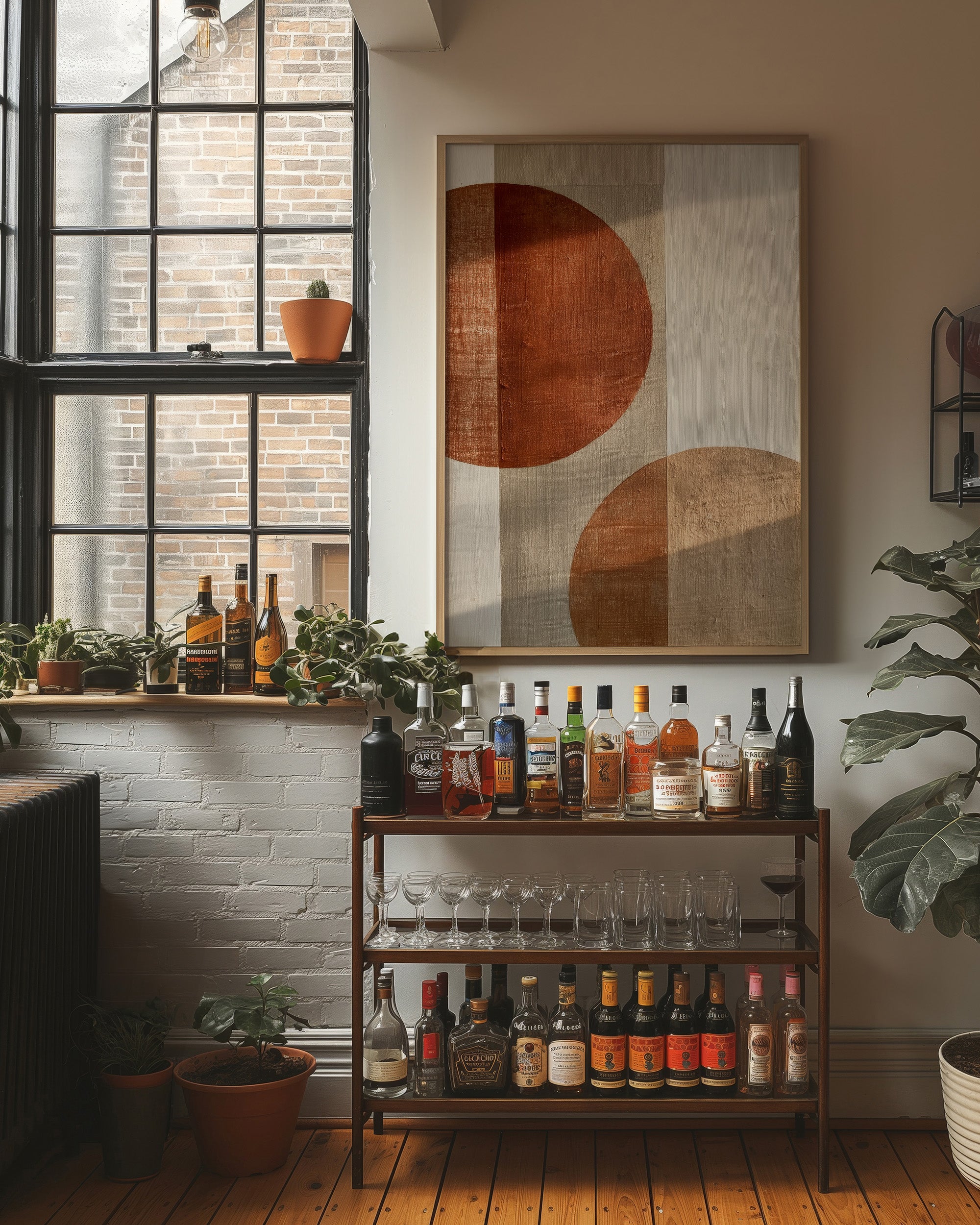 Warm afternoon light filters through industrial windows, casting gentle shadows across a sophisticated home bar setup. The focal point is a striking minimalist artwork featuring bold terracotta circles on a neutral canvas, creating a perfect balance of warmth and modernism. The scene is enriched by carefully curated elements - leafy plants dotting windowsills, an impressive collection of spirits arranged on an industrial-style bar cart, and the interplay of brick, wood, and glass textures throughout the space. This thoughtfully composed corner would elevate a modern dining room, home bar, or sophisticated living space where entertaining and aesthetic pleasure seamlessly merge.