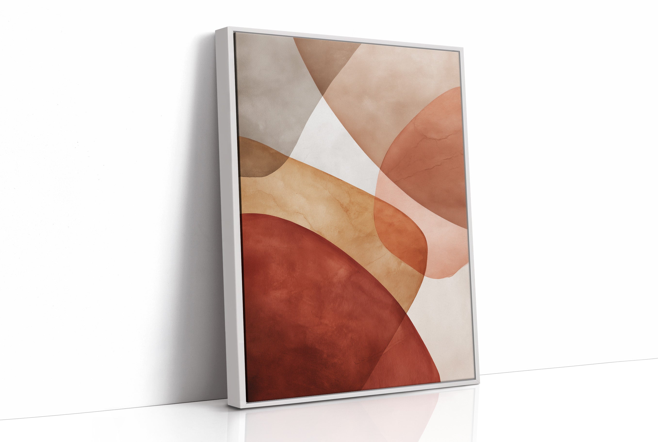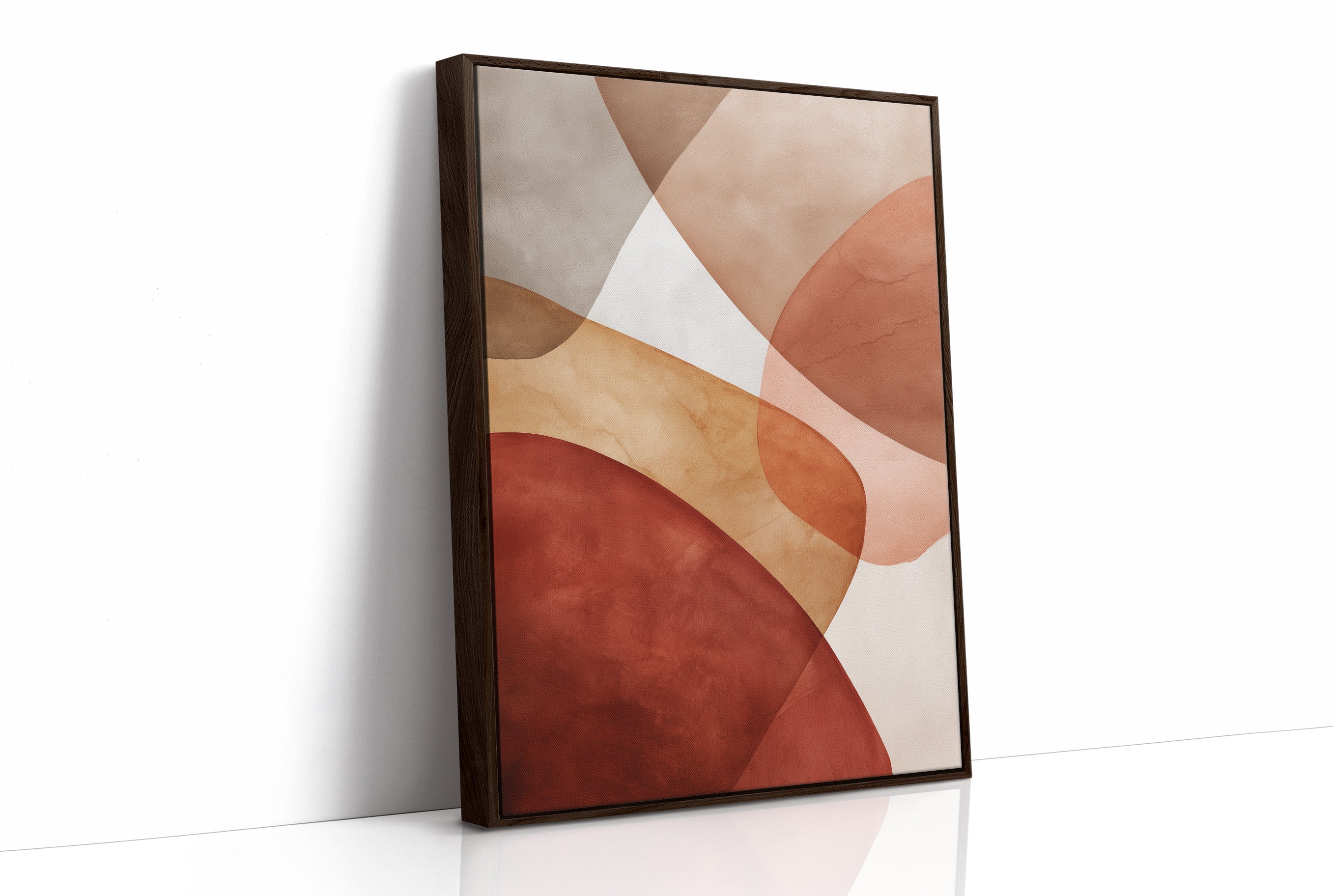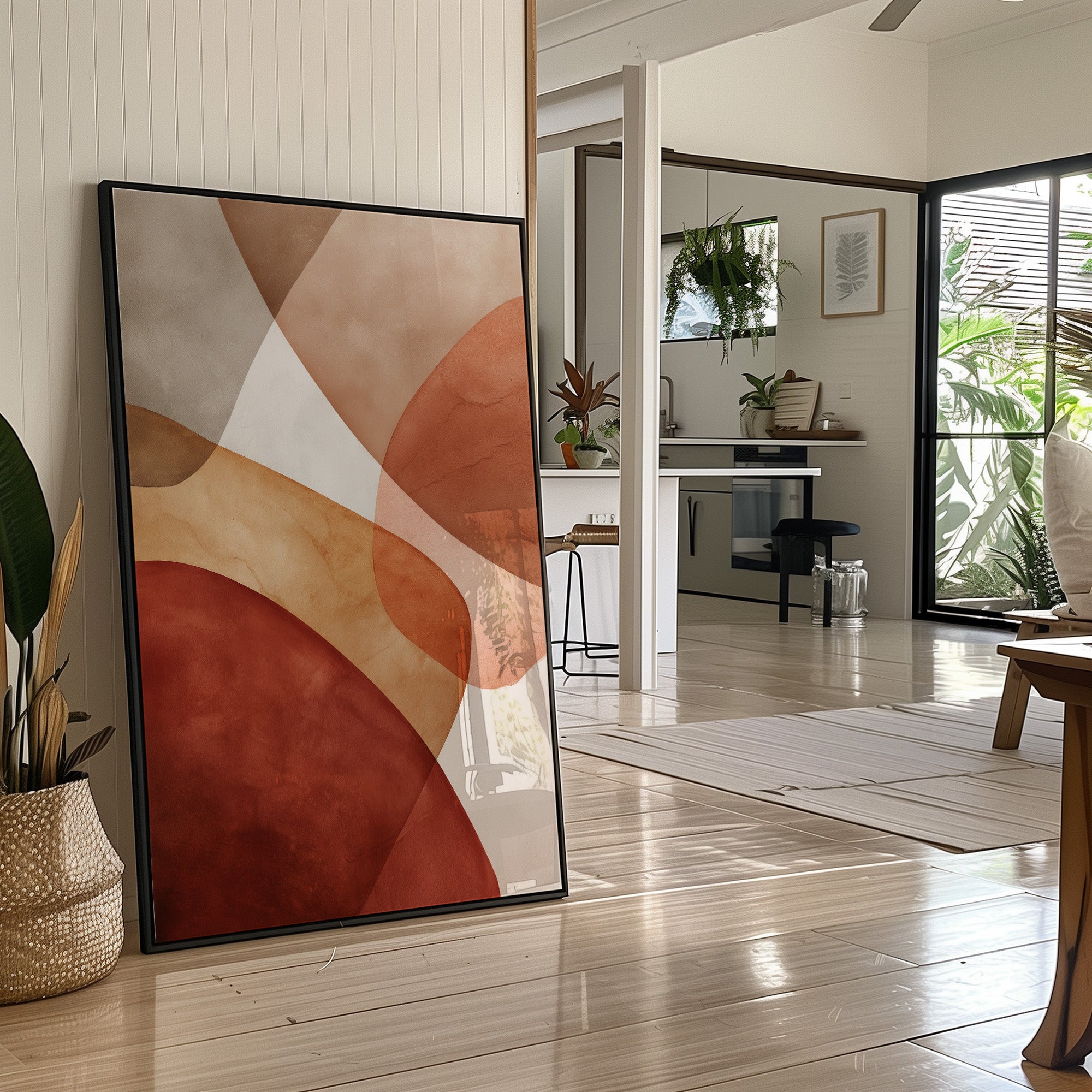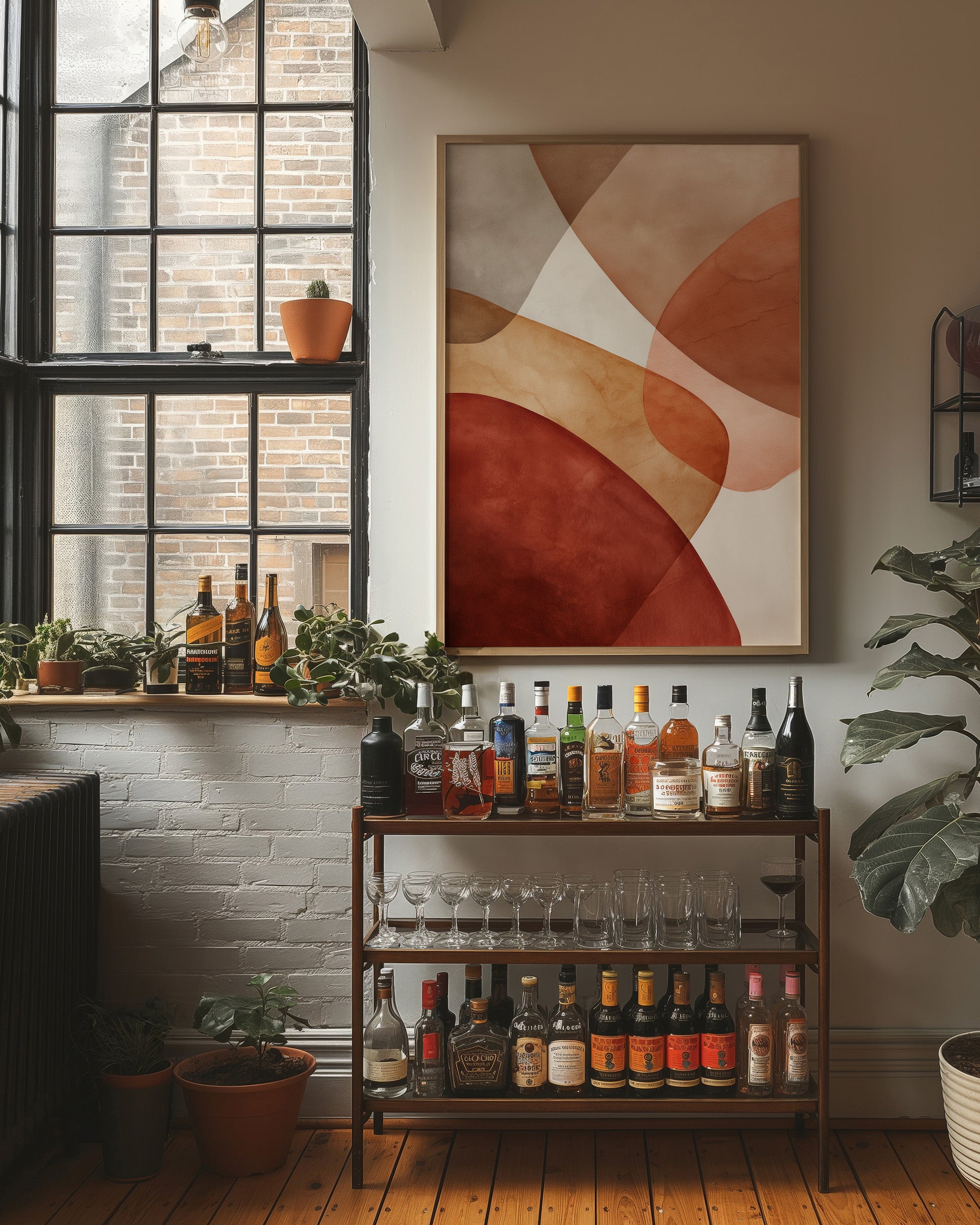 Warm afternoon light filters through industrial windows, casting gentle shadows across a sophisticated urban corner. The striking abstract artwork in earthy terracotta and cream tones creates a perfect backdrop for a thoughtfully curated home bar, while potted plants add organic touches to the industrial-meets-modern space. This scene captures the essence of contemporary city living, where vintage architecture meets artistic expression and cultivated taste. Perfect for elevating a dining room, home bar, or sophisticated living space where conversations flow as smoothly as the curves in the artwork.