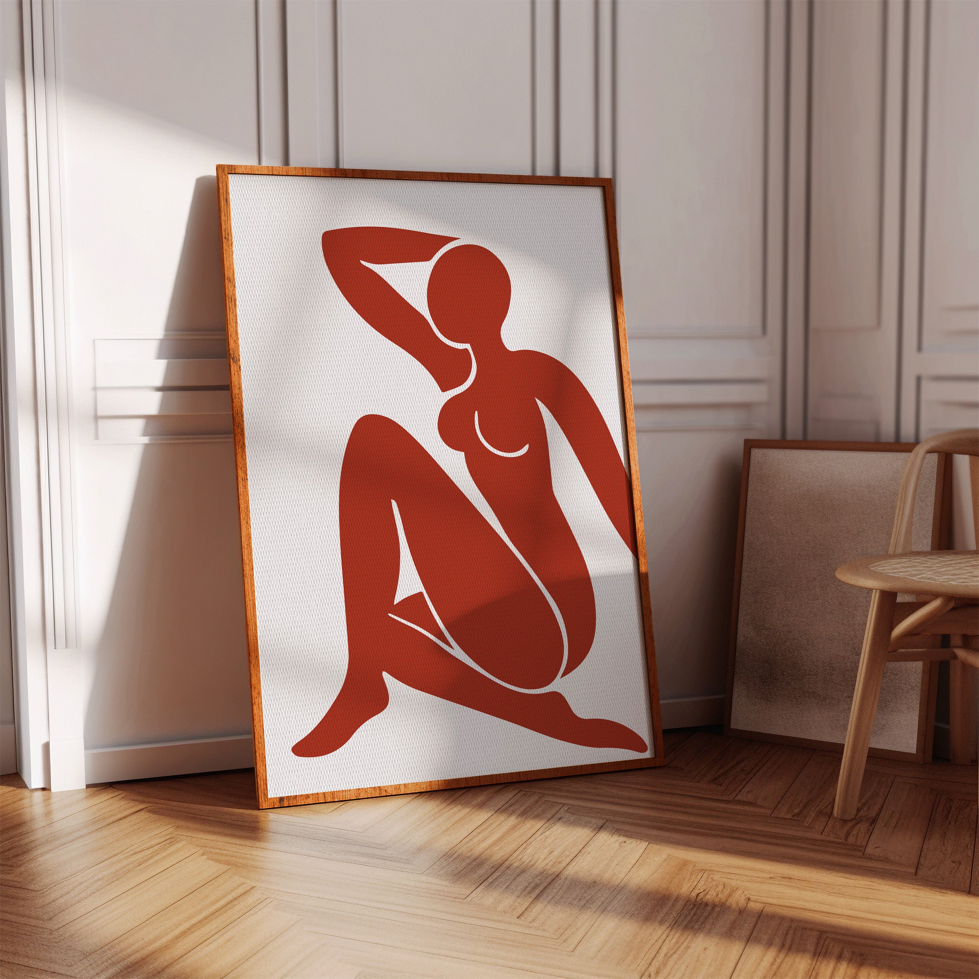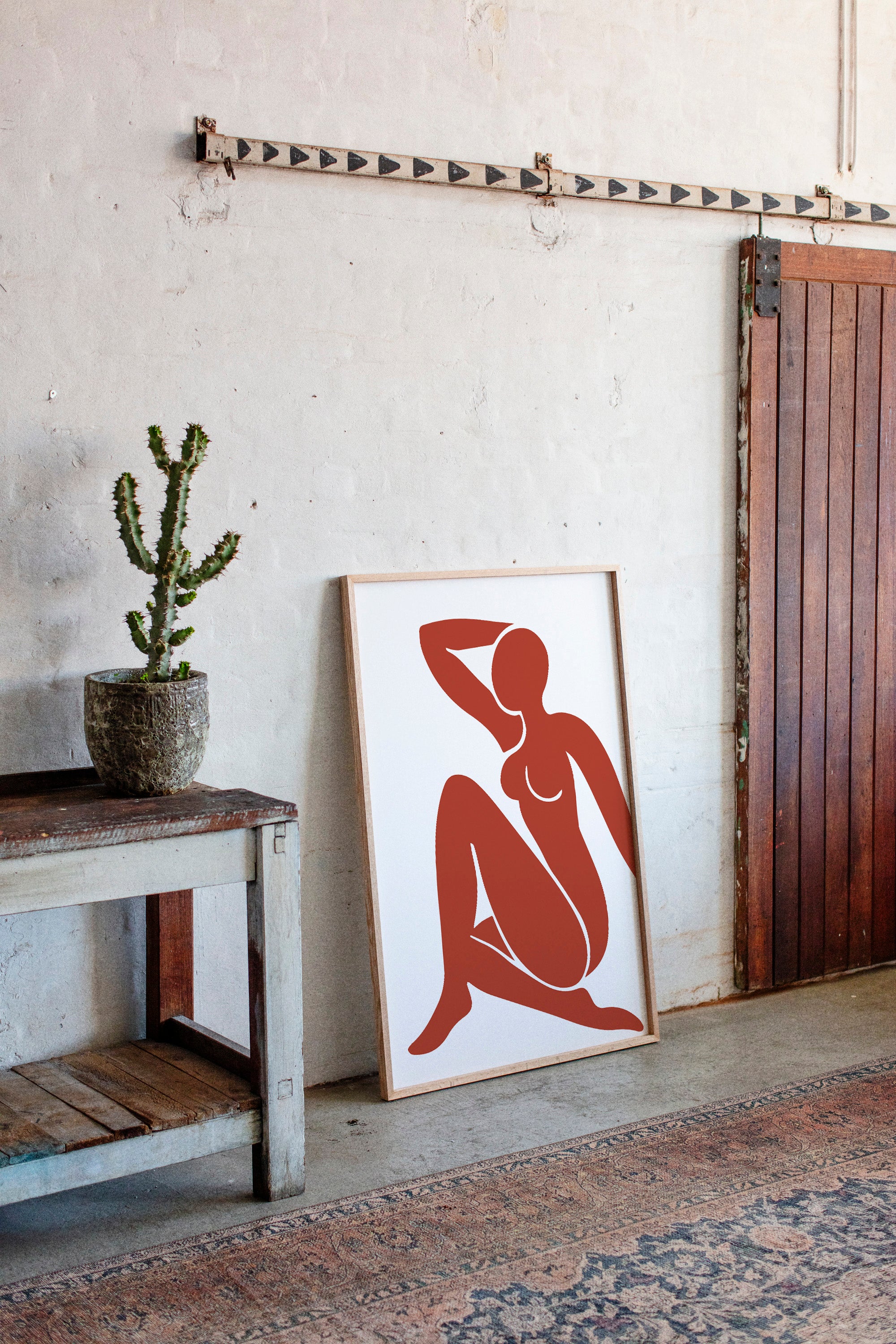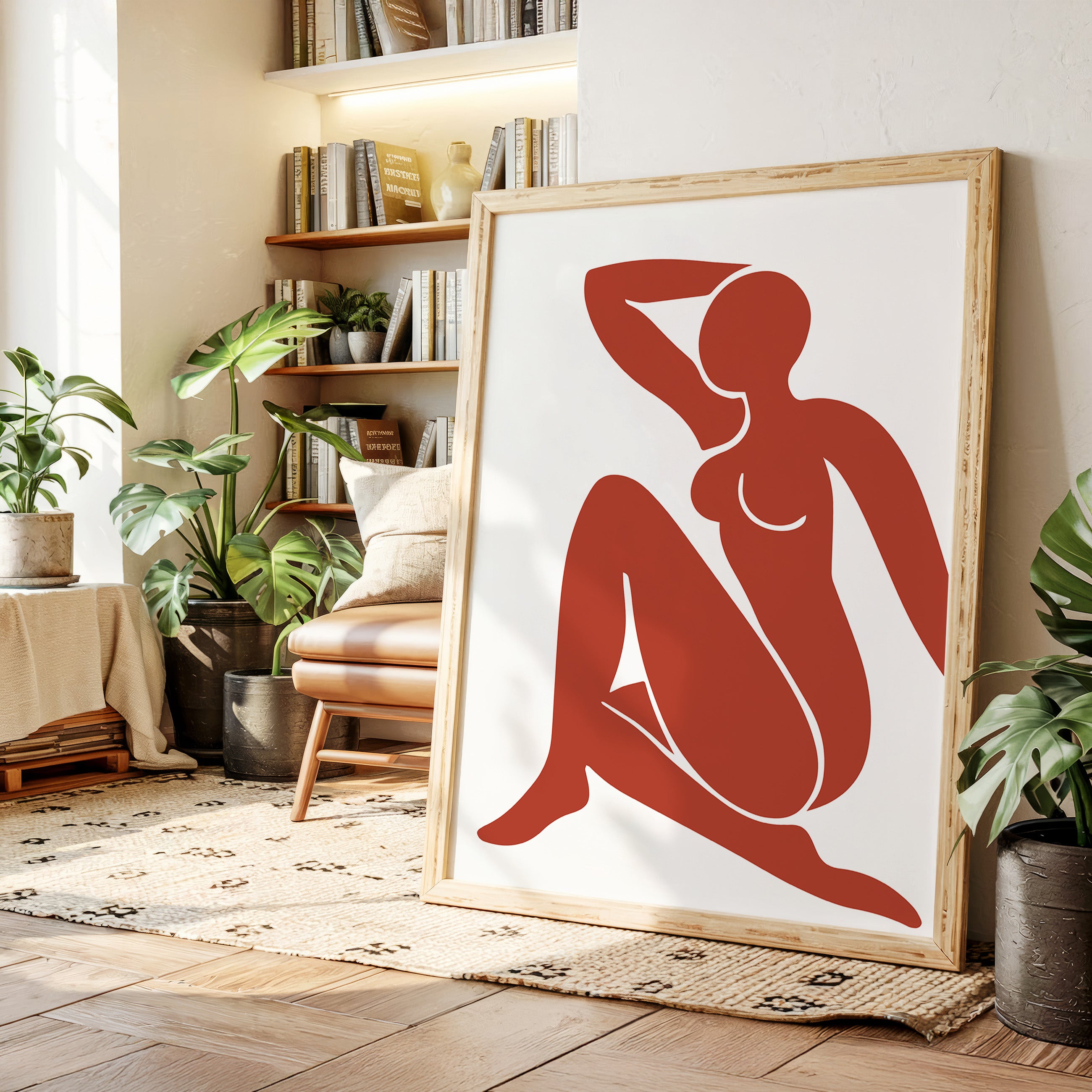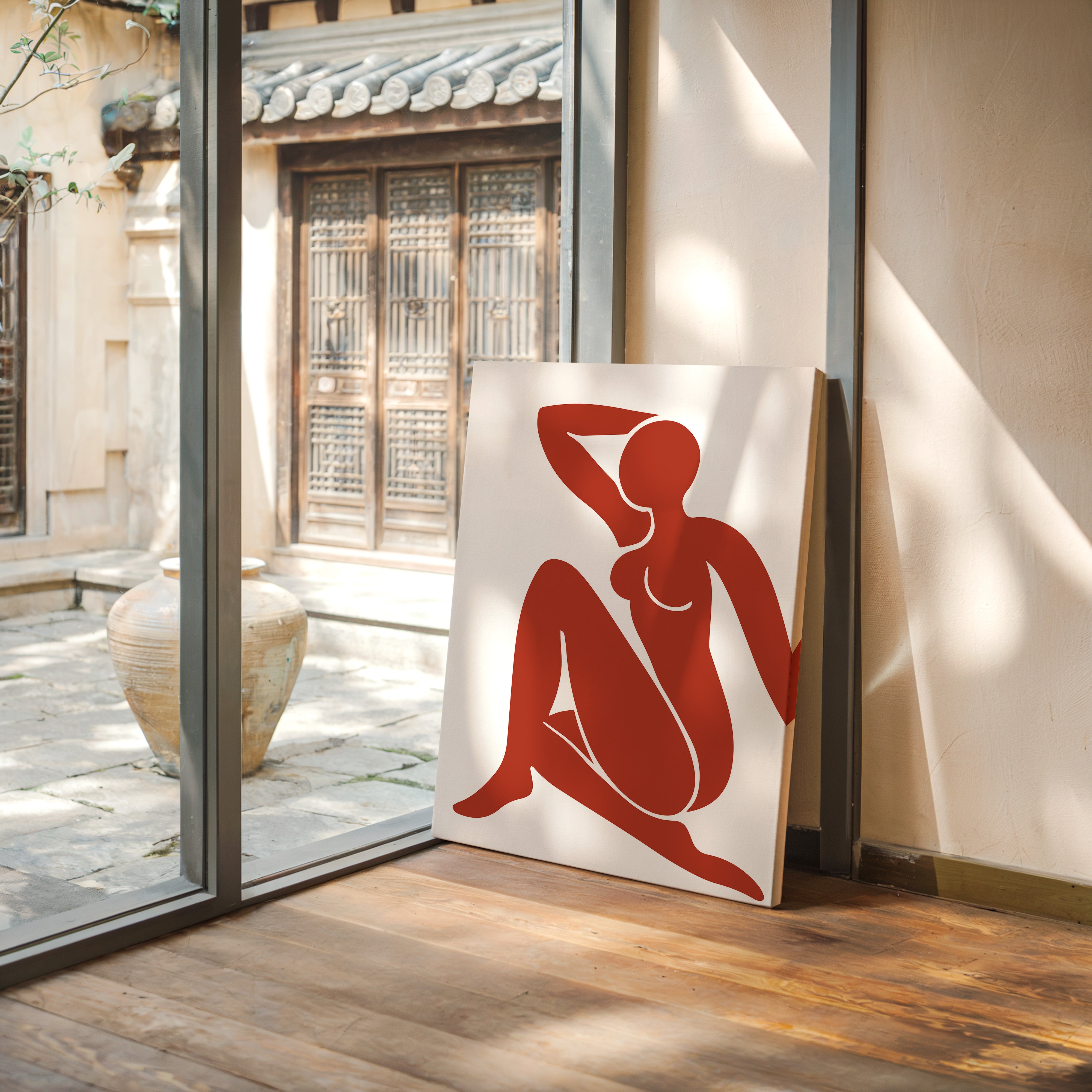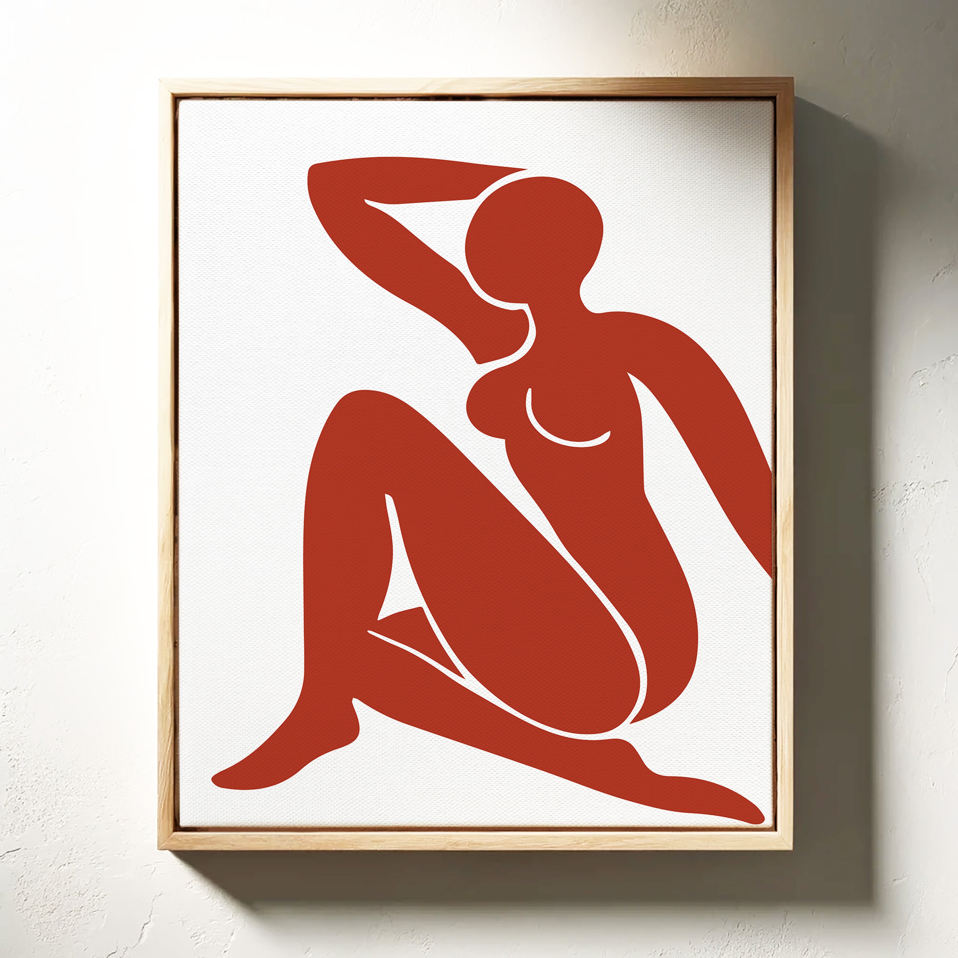 A bold silhouette emerges in warm terracotta, capturing a moment of peaceful contemplation. The flowing lines create a harmonious composition where negative space plays as vital a role as the figure itself. White contours dance against the rich earthen tone, suggesting movement and form through masterful minimalism. This contemporary interpretation speaks to the timeless beauty of simplified forms and essential shapes. Perfect for a modern bedroom, sophisticated bathroom, or any intimate space seeking an artistic touch of elegance.
