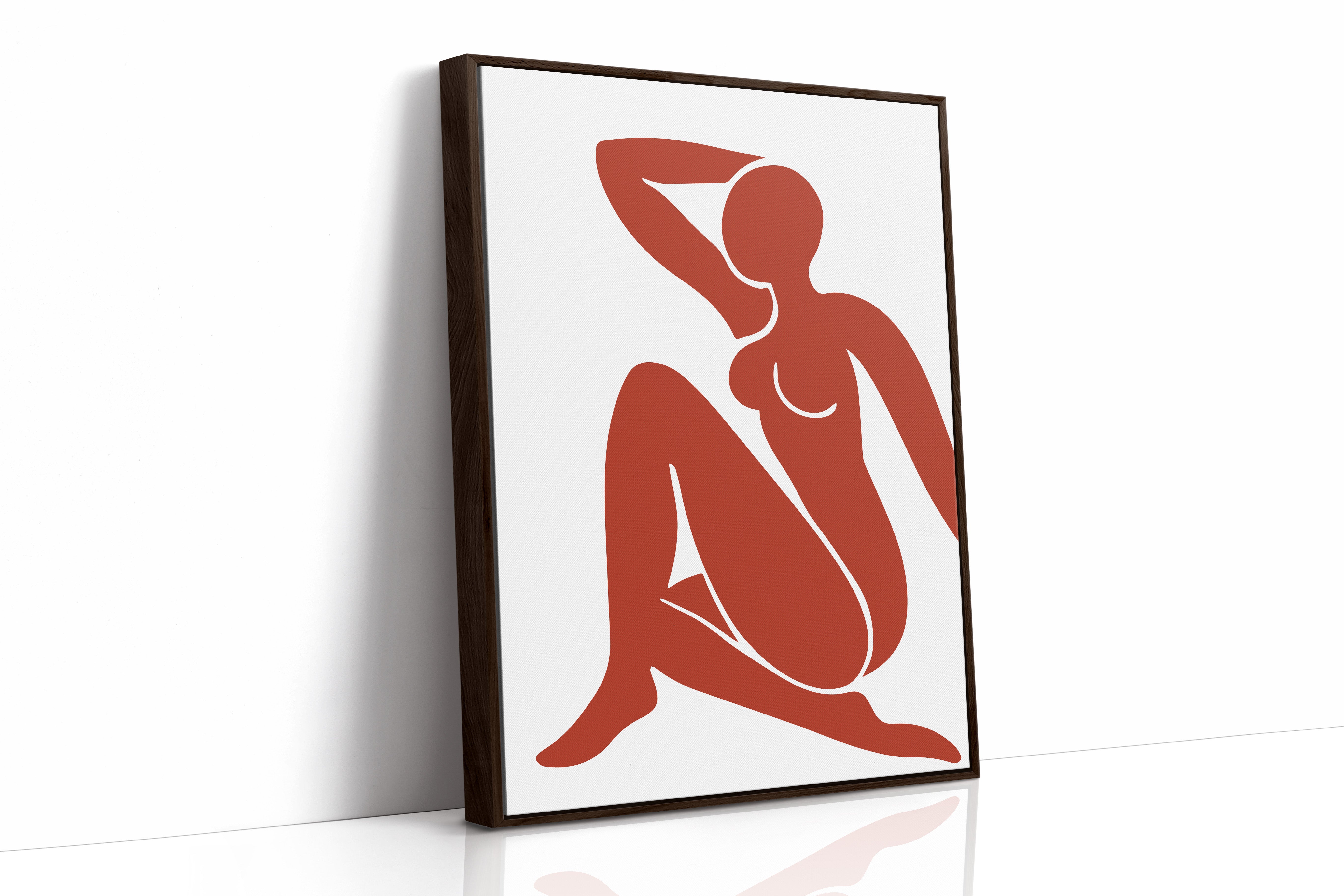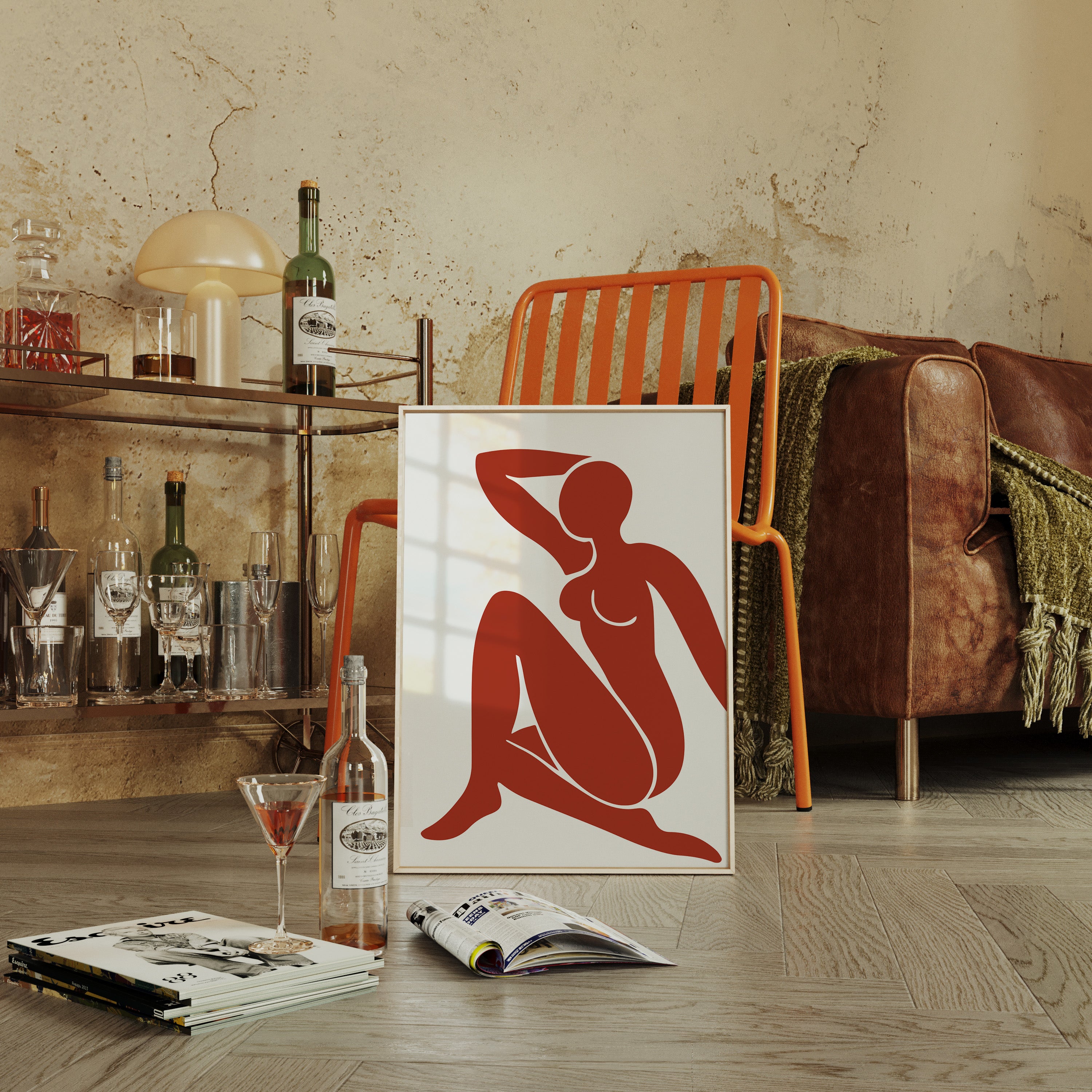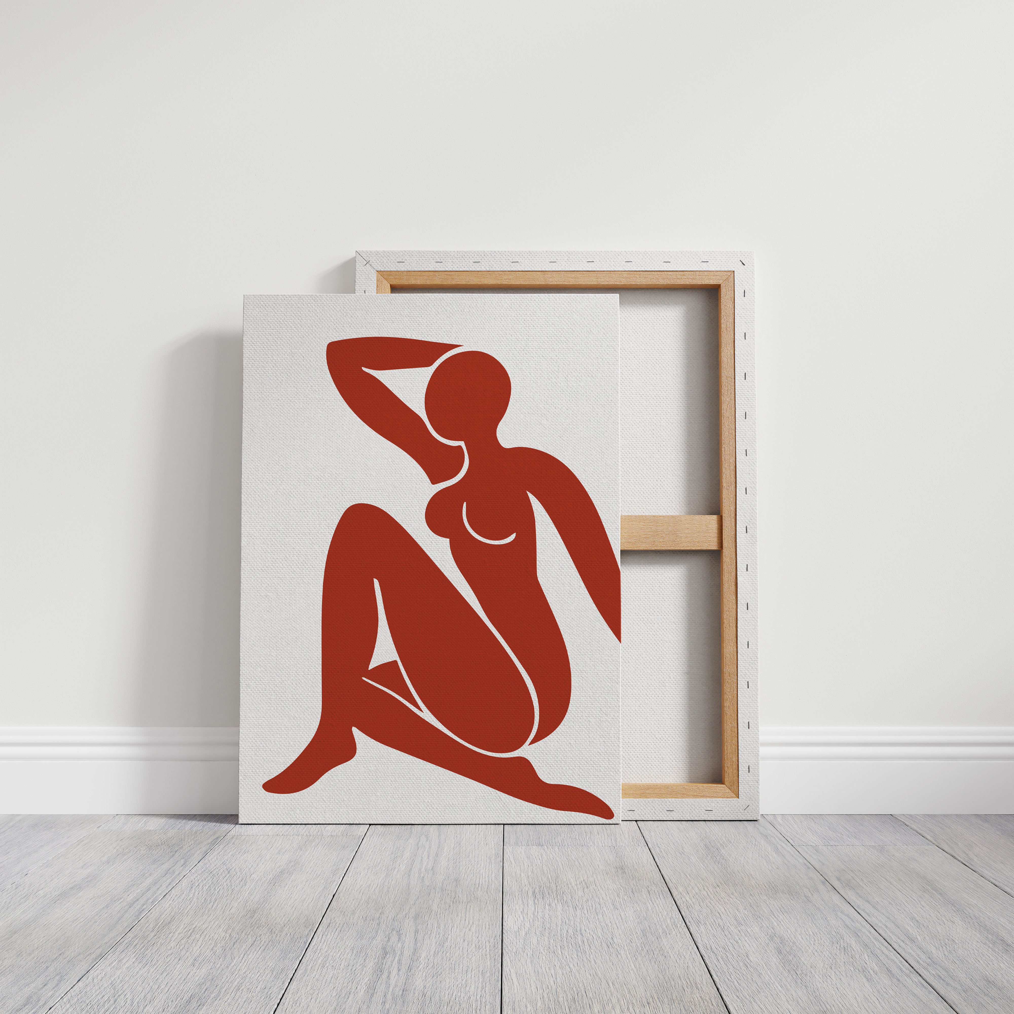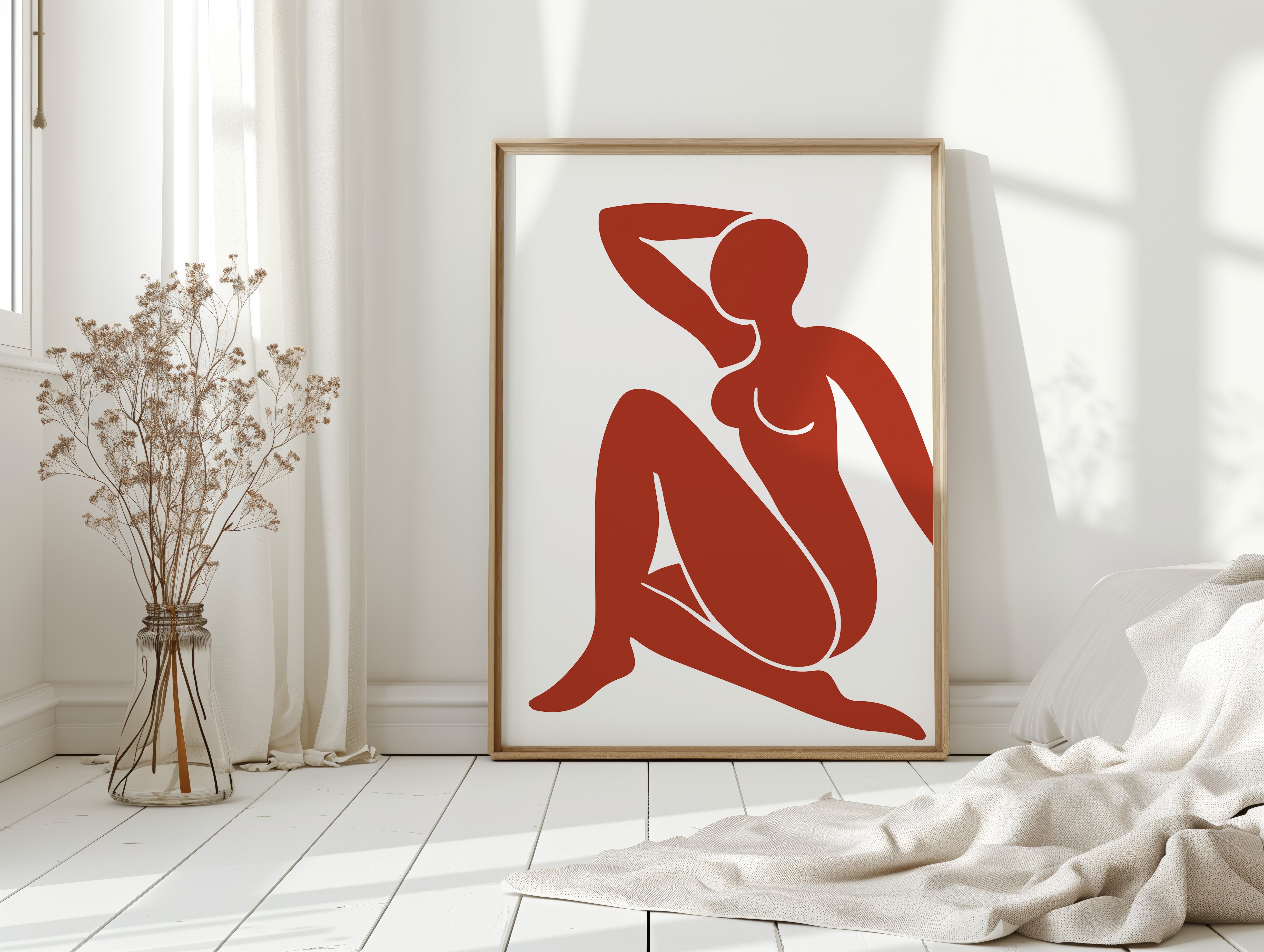 A bold silhouette emerges in warm terracotta, capturing a moment of peaceful contemplation. The flowing lines create a harmonious composition where negative space plays as vital a role as the figure itself. White contours dance against the rich earthen tone, suggesting movement and form through masterful minimalism. This contemporary interpretation speaks to the timeless beauty of simplified forms and essential shapes. Perfect for a modern bedroom, sophisticated bathroom, or any intimate space seeking an artistic touch of elegance.