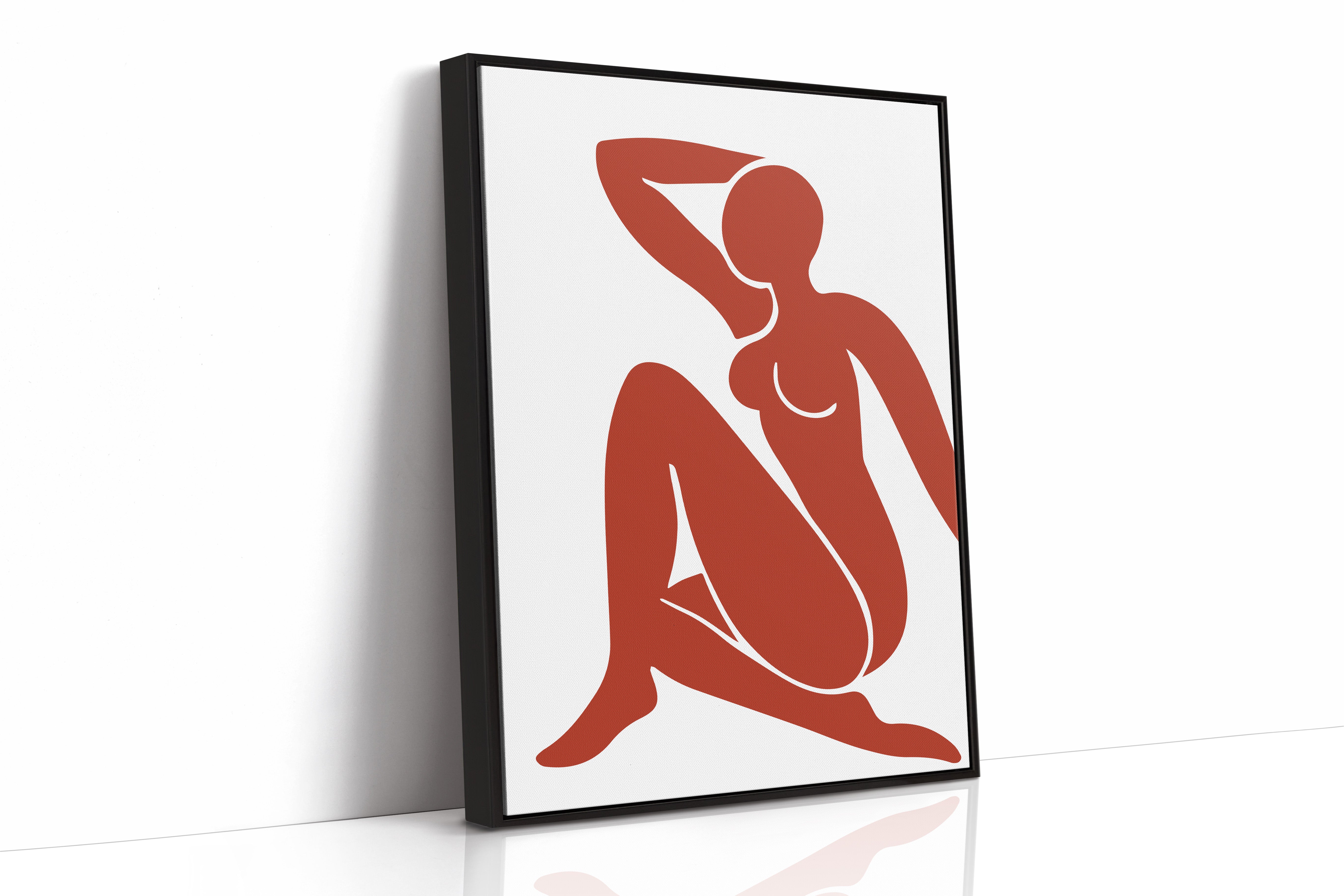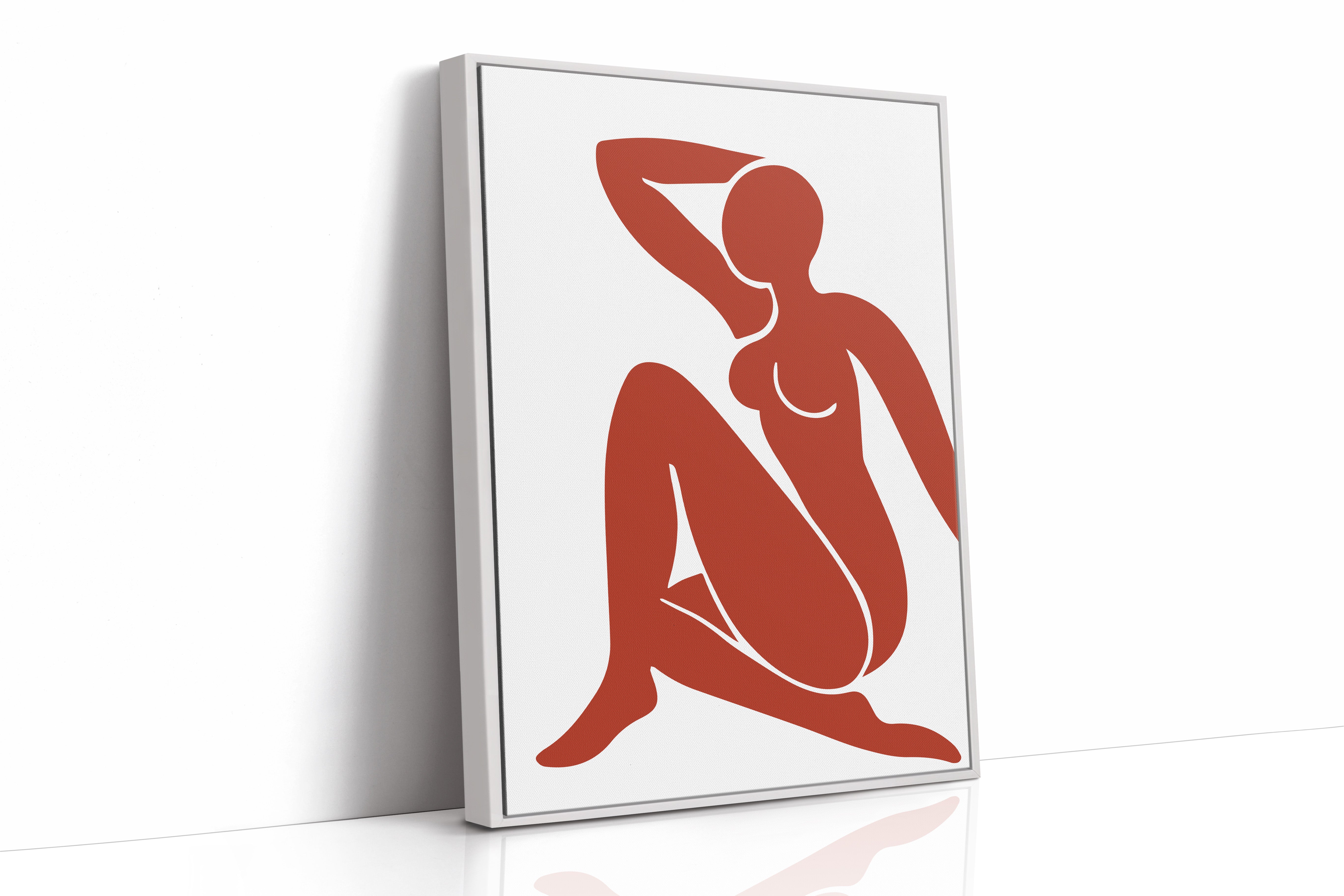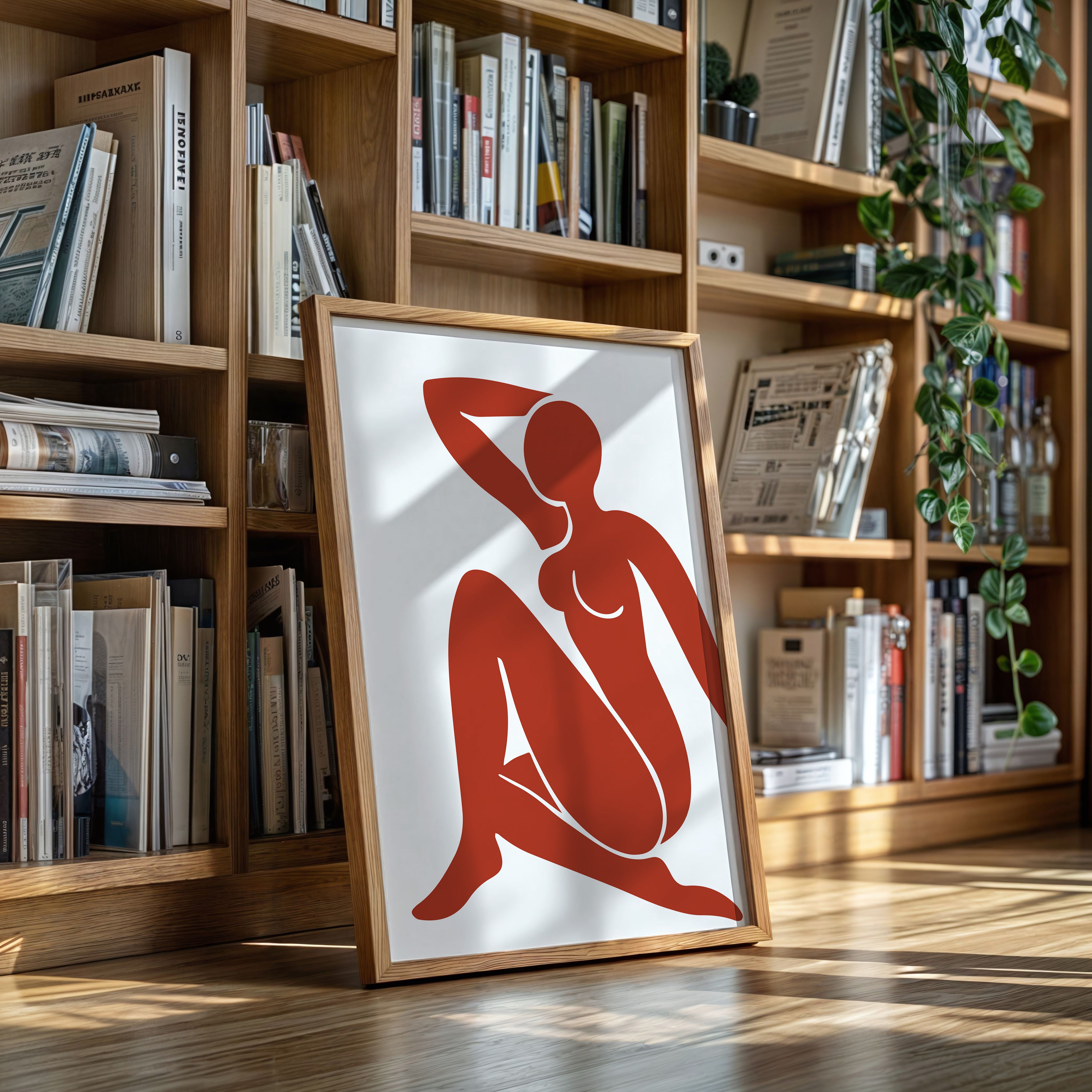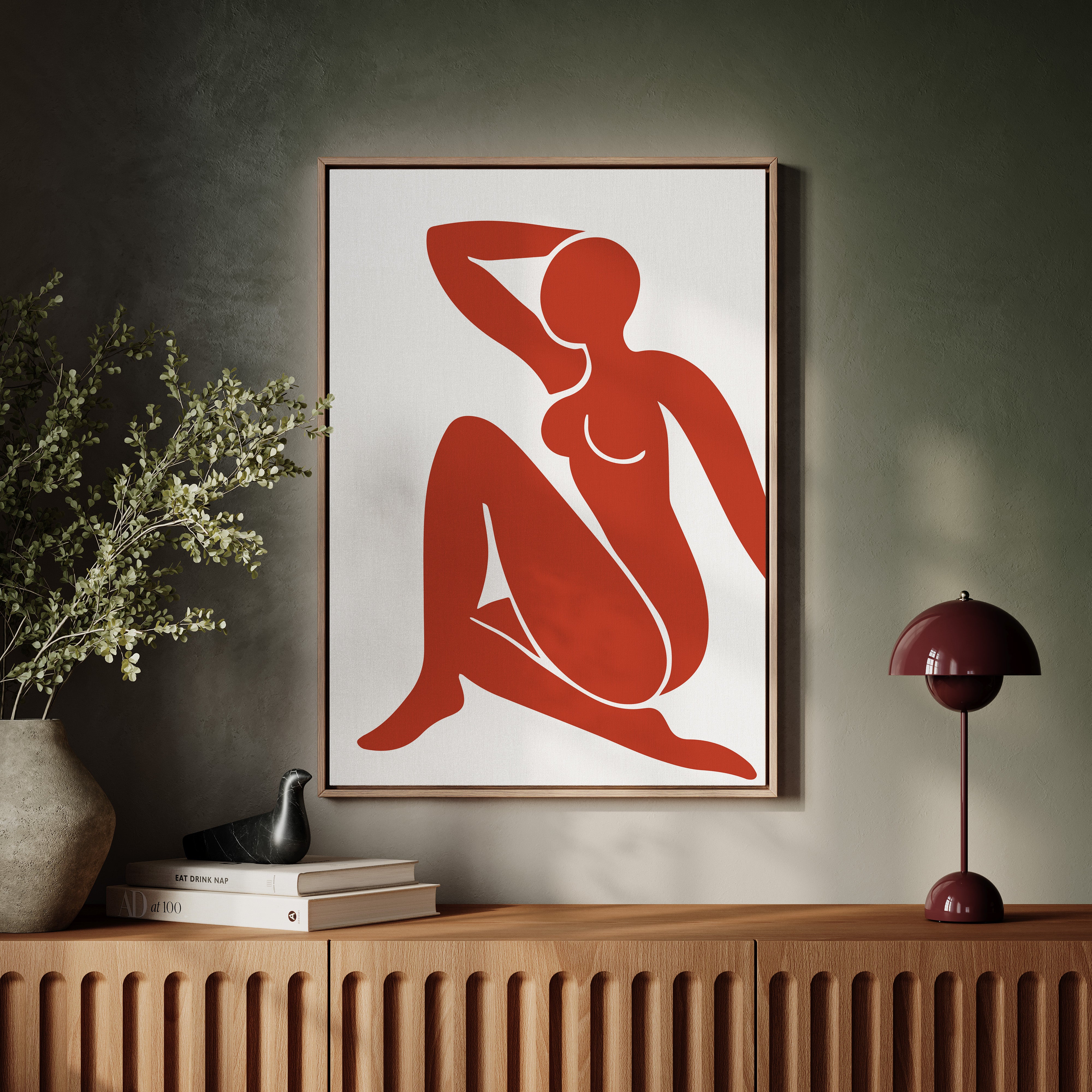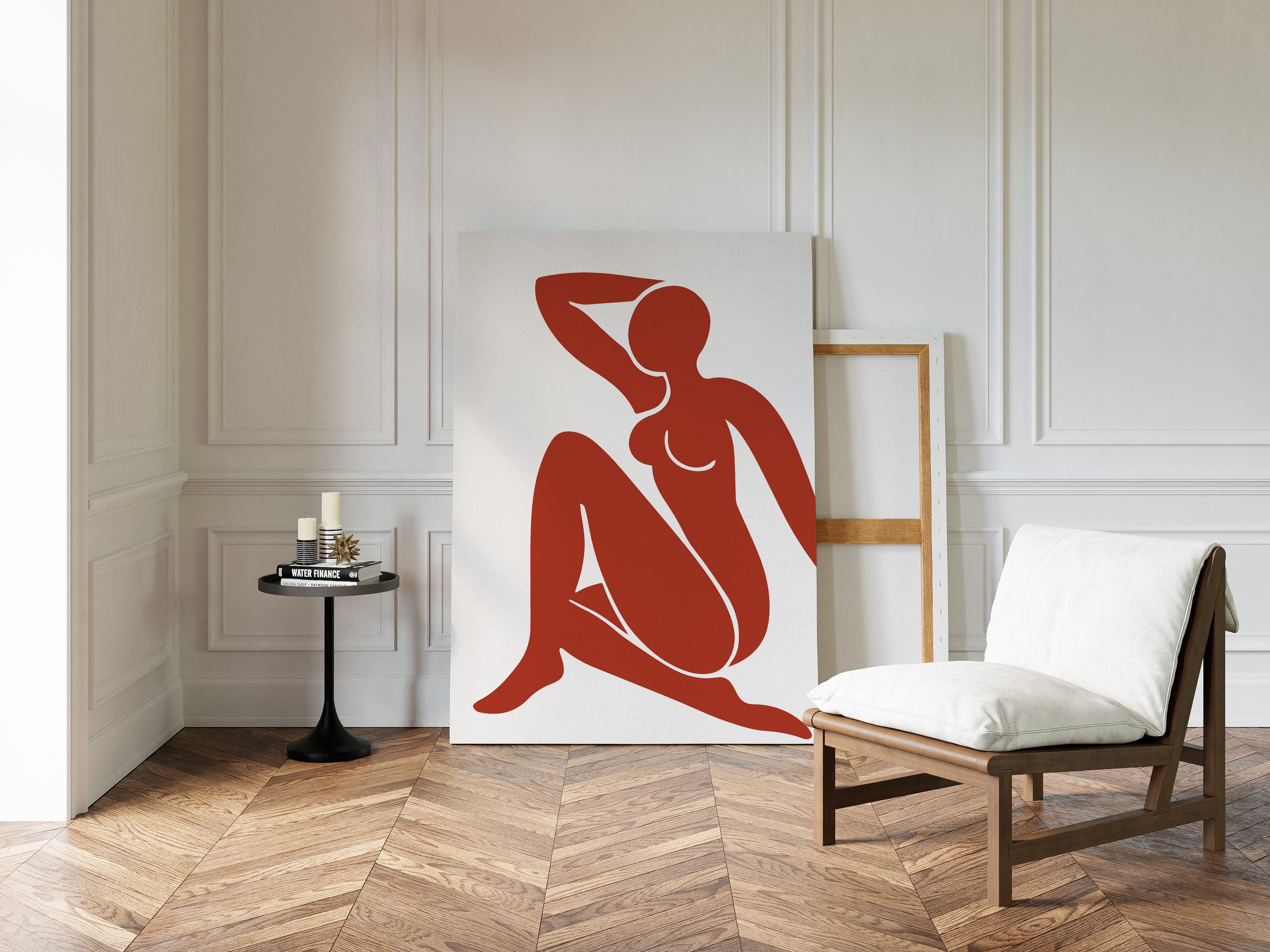 A bold silhouette emerges in warm terracotta, capturing a moment of peaceful contemplation. The flowing lines create a harmonious composition where negative space plays as vital a role as the figure itself. White contours dance against the rich earthen tone, suggesting movement and form through masterful minimalism. This contemporary interpretation speaks to the timeless beauty of simplified forms and essential shapes. Perfect for a modern bedroom, sophisticated bathroom, or any intimate space seeking an artistic touch of elegance.