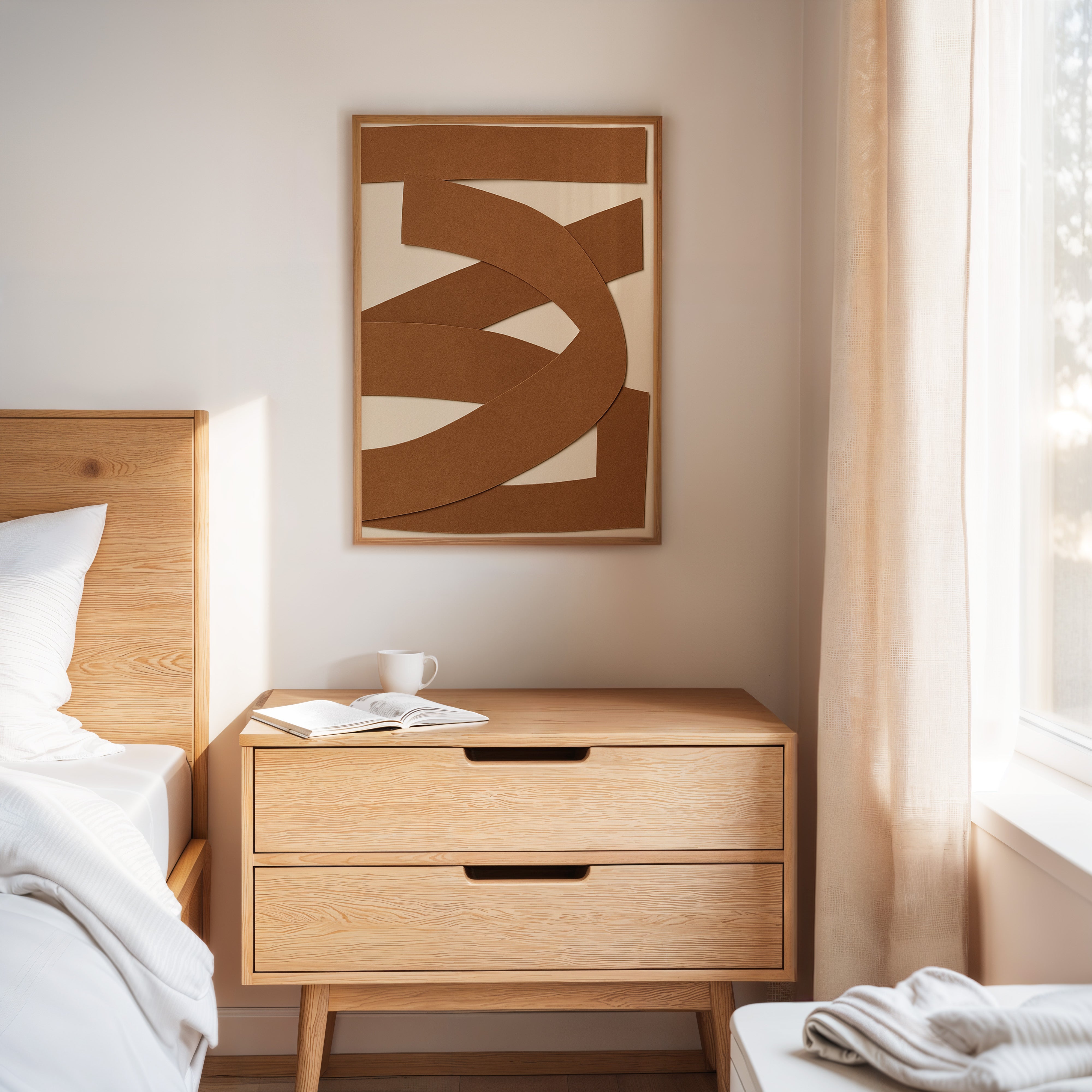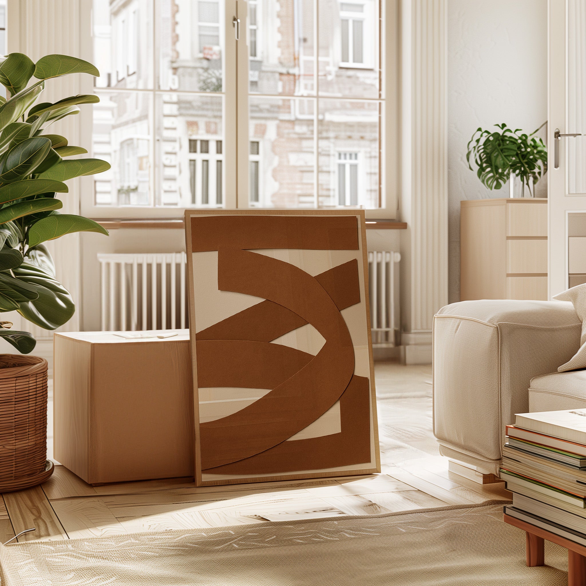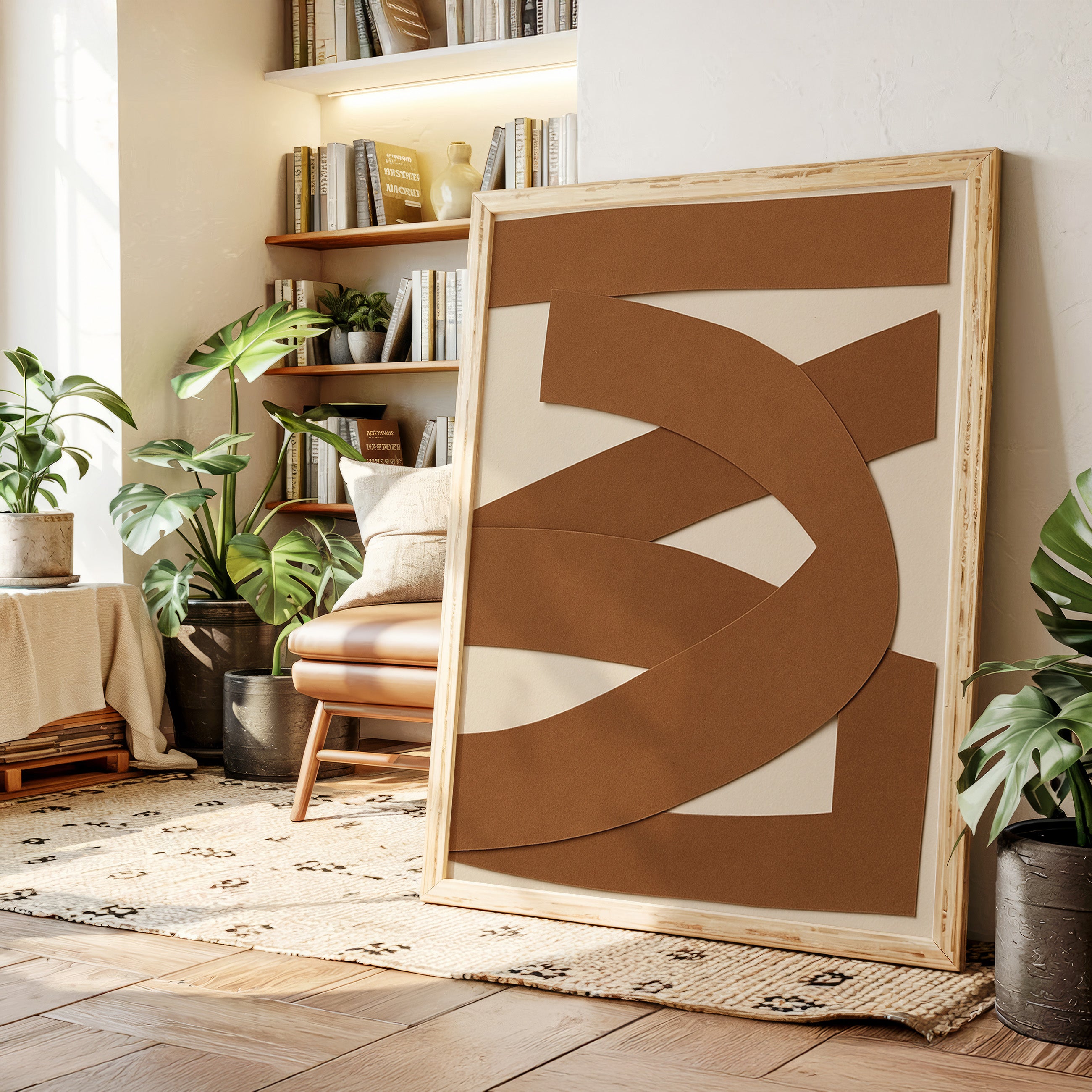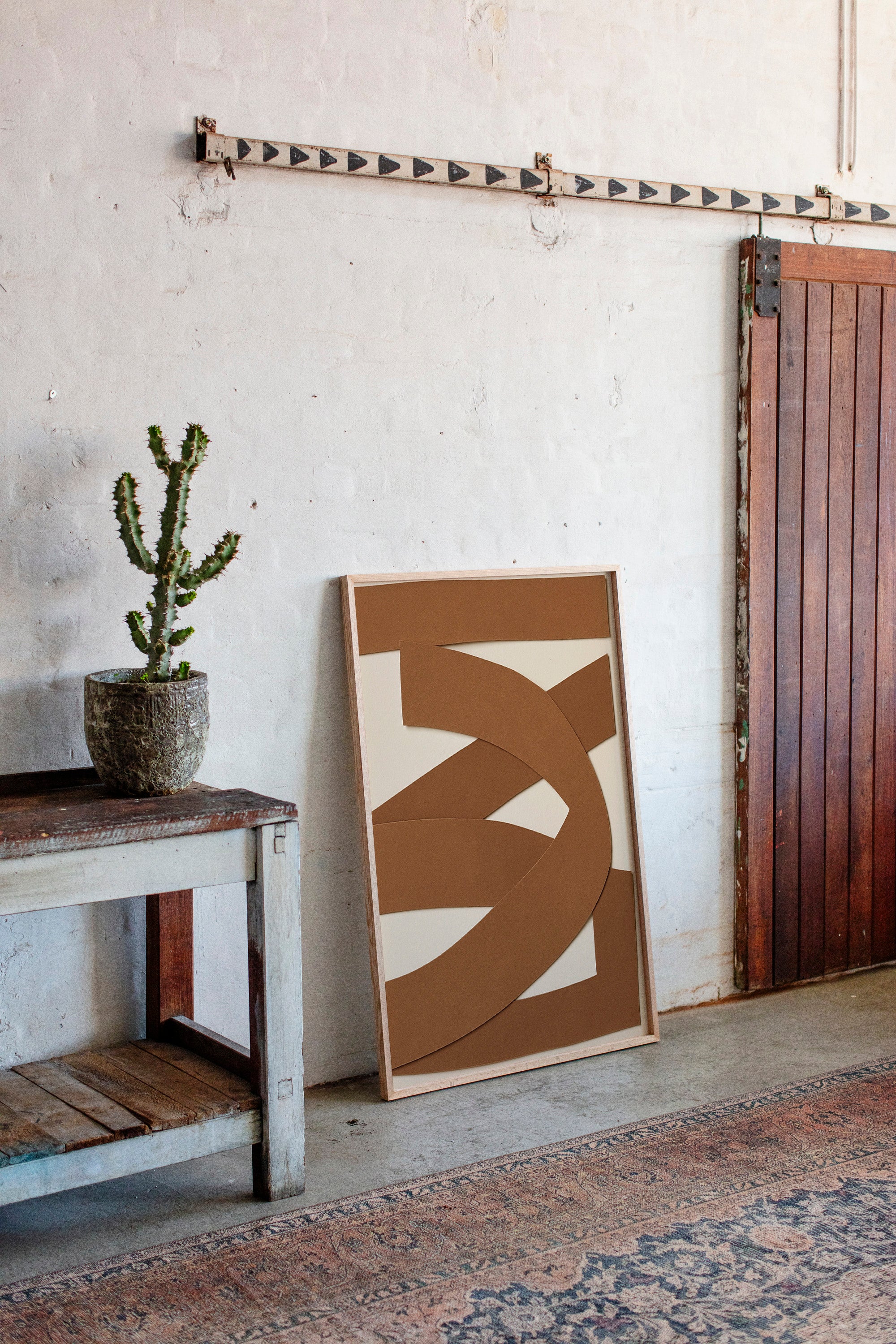 Smooth curves of rich terracotta paper dance across a cream canvas, creating an elegant choreography of form and negative space. The precise cuts and thoughtful arrangement speak to both strength and fluidity, as each band flows with purposeful grace into the next. The warm earth tones and minimalist composition create a sophisticated interplay of light and shadow, texture and void. This contemporary piece would bring architectural interest and organic movement to a modern living space or professional office, especially when paired with natural materials and clean lines.
