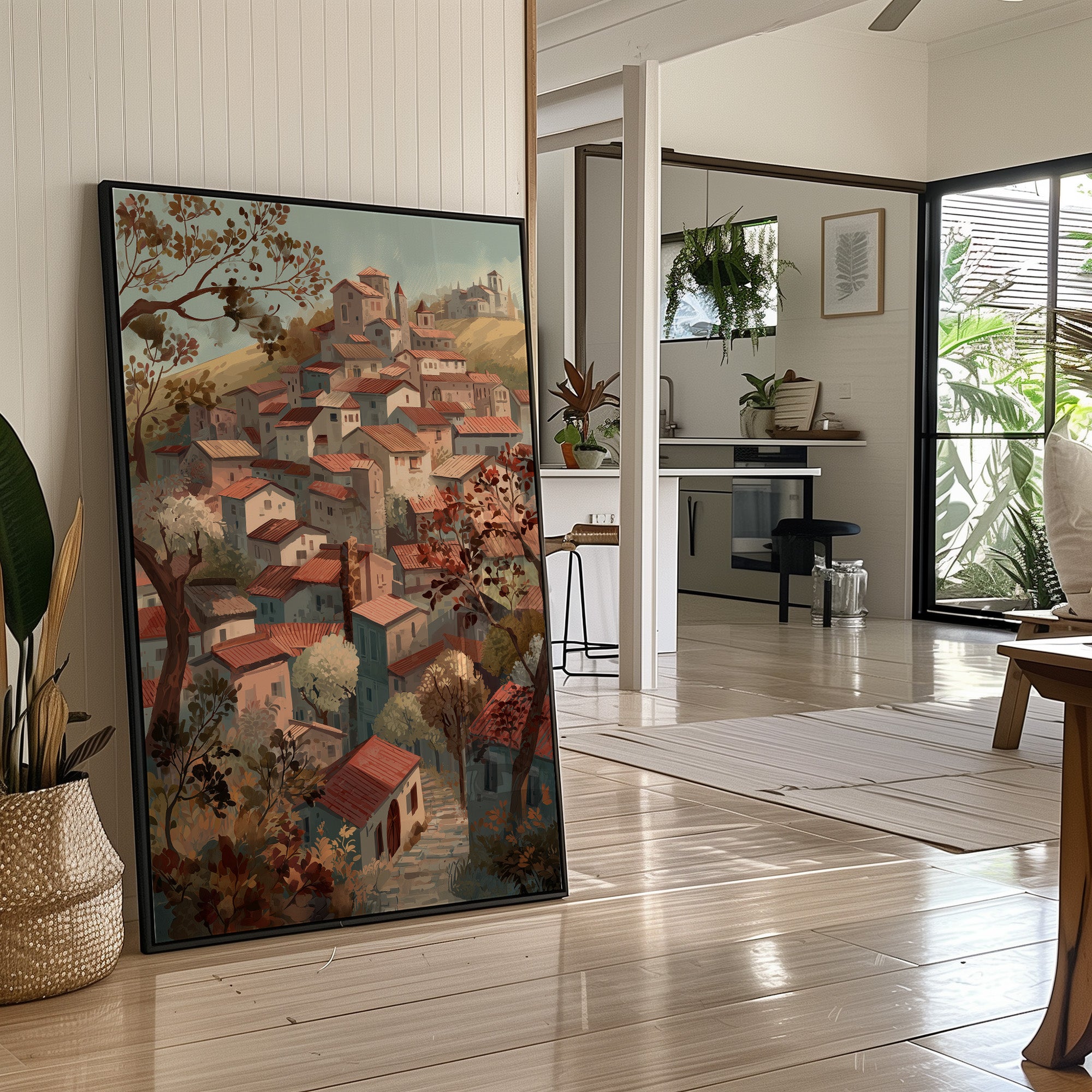 A hillside village cascades down golden slopes, its clustered homes crowned with weathered terracotta roofs that glow warmly against a soft, misty sky. Autumn trees frame the scene with bronze and copper foliage, their branches reaching toward stone pathways that wind between the stacked dwellings. This vintage-inspired illustration captures the timeless charm of Mediterranean architecture with painterly brushstrokes and a muted, earthy palette. Perfect for a living room seeking Old World elegance and nostalgic warmth.