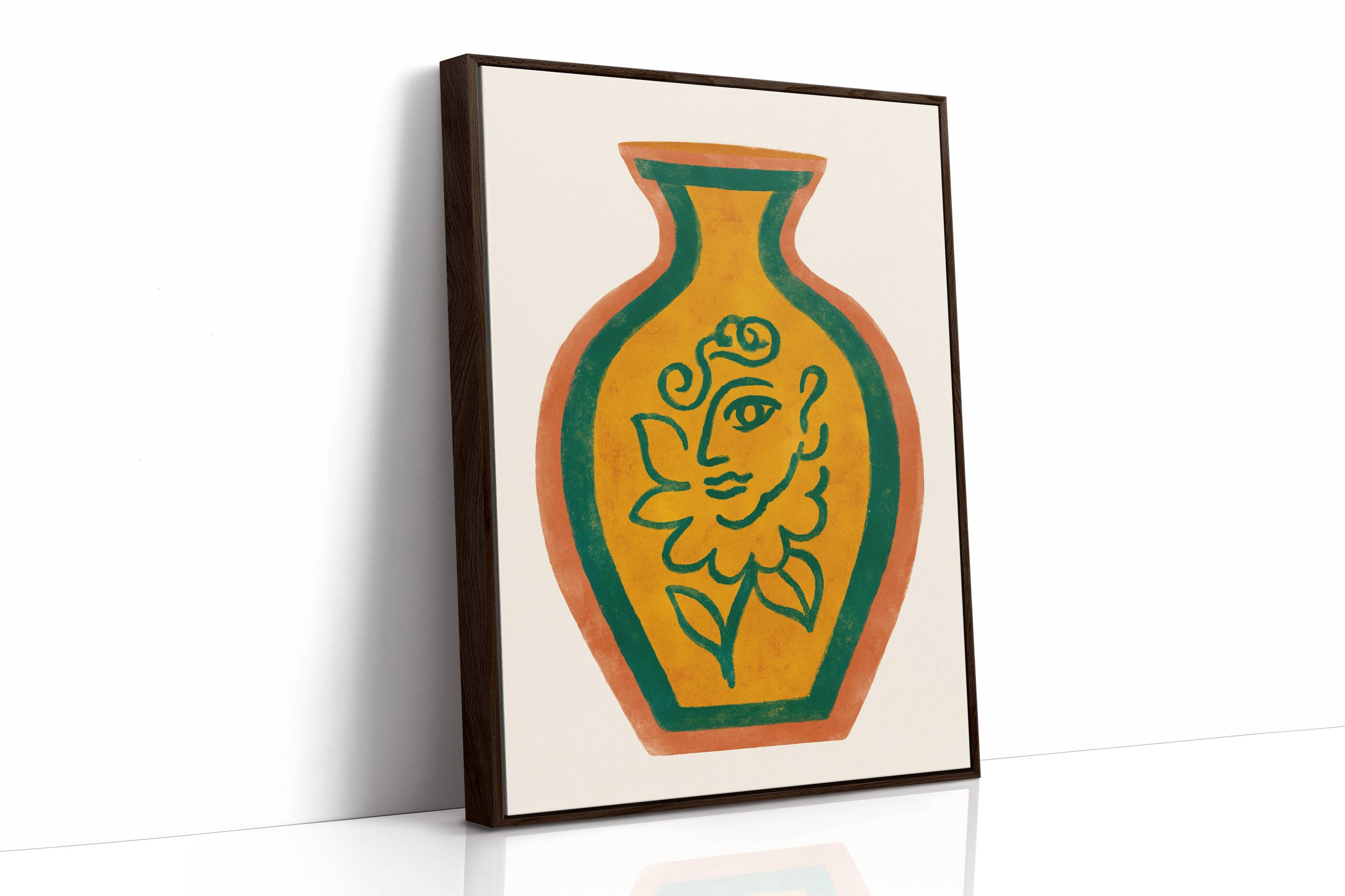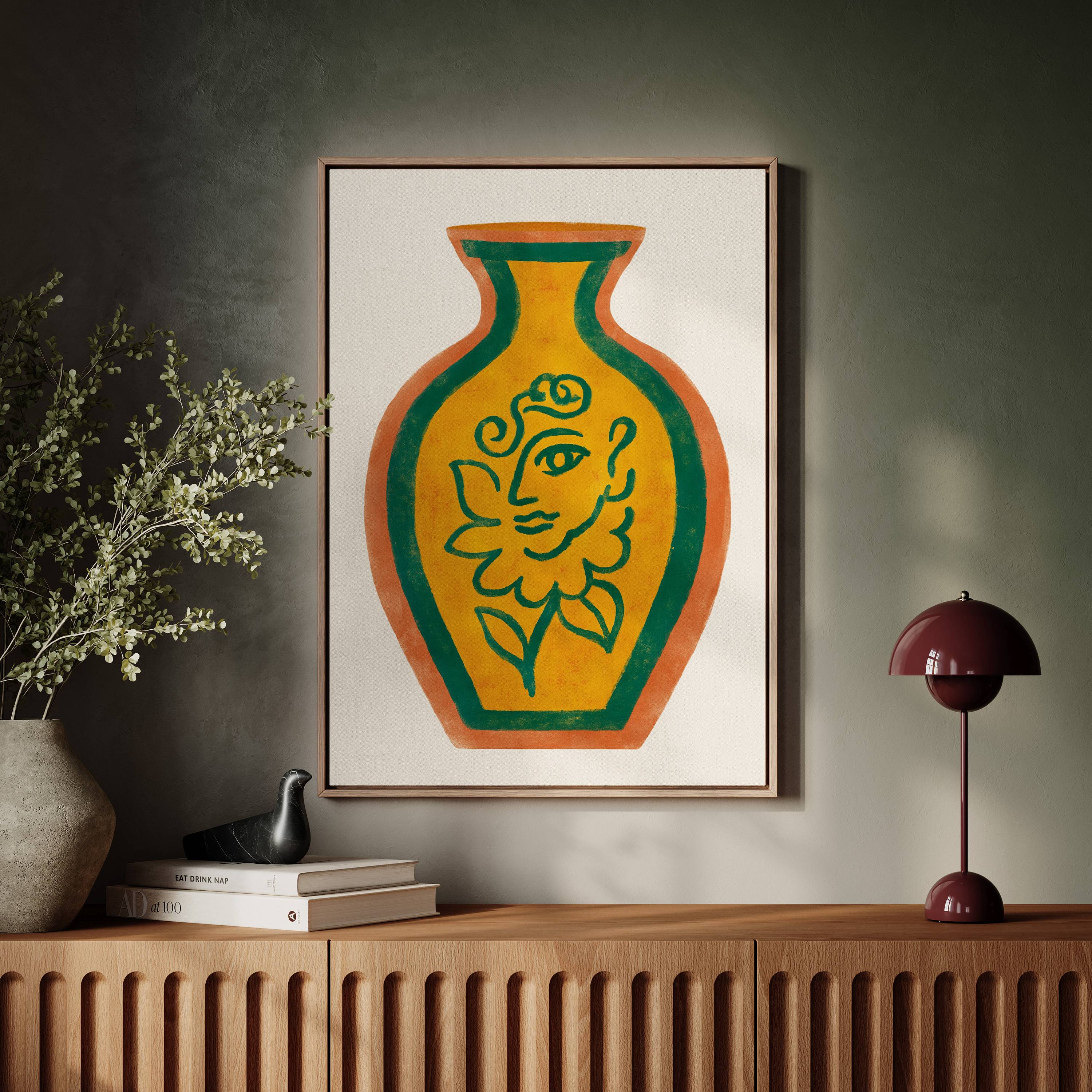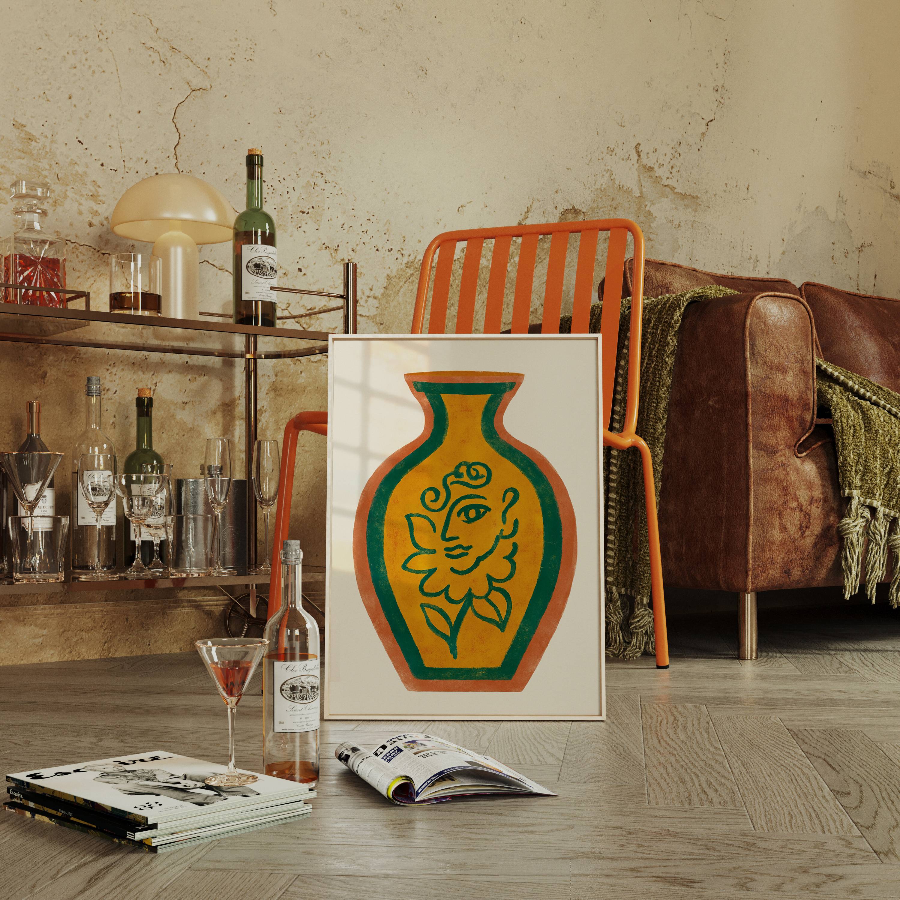 A playful dance of emerald lines against marigold yellow captures the essence of folk art simplicity. The terracotta-rimmed vessel cradles a whimsical portrait-flower hybrid, where feminine features merge with petals in an enchanting display of artistic imagination. The bold colors and flowing lines speak to both Mediterranean traditions and modern interpretive art, creating a striking balance between classical form and contemporary expression. Perfect for adding a touch of artistic warmth to a kitchen nook or bringing character to a minimalist dining space.