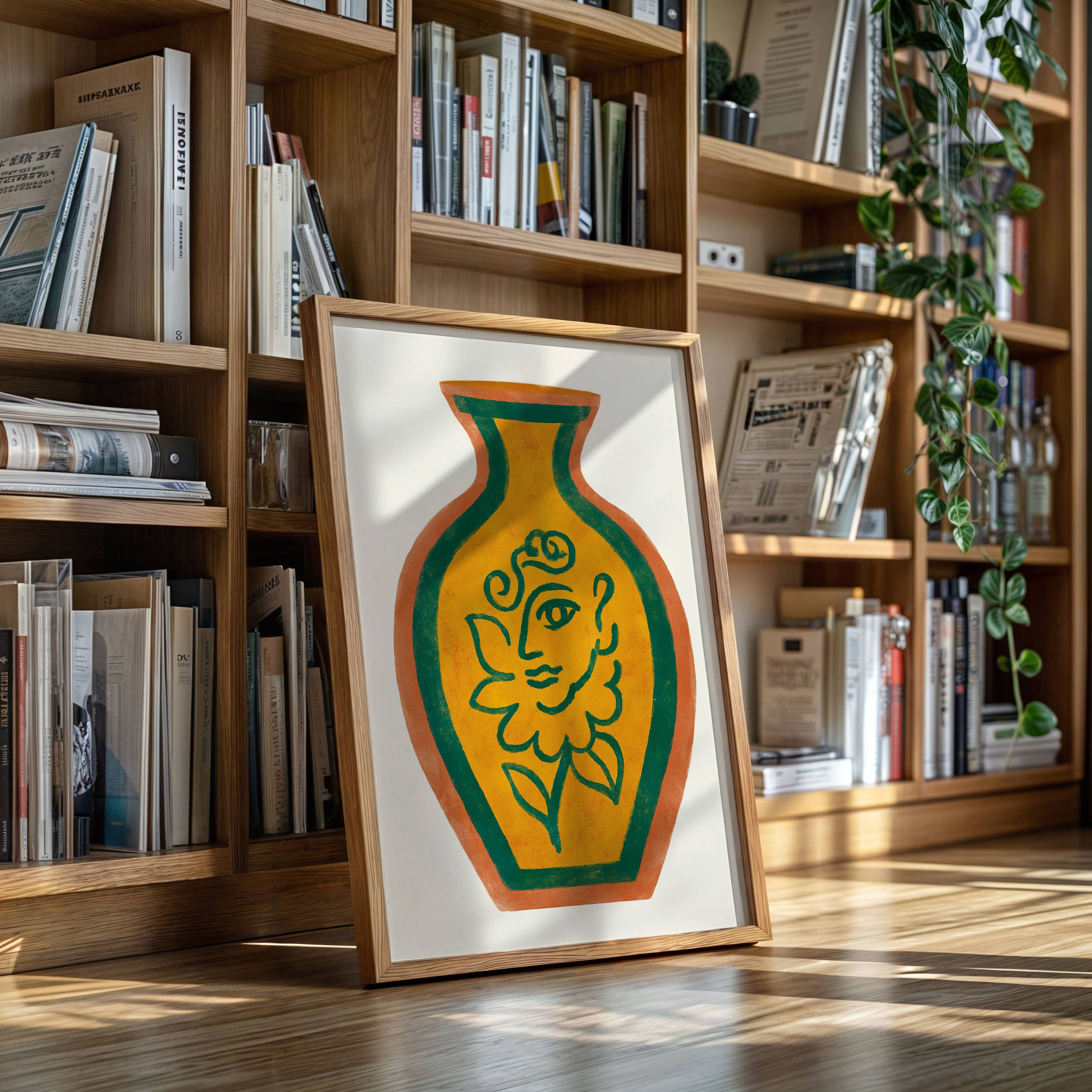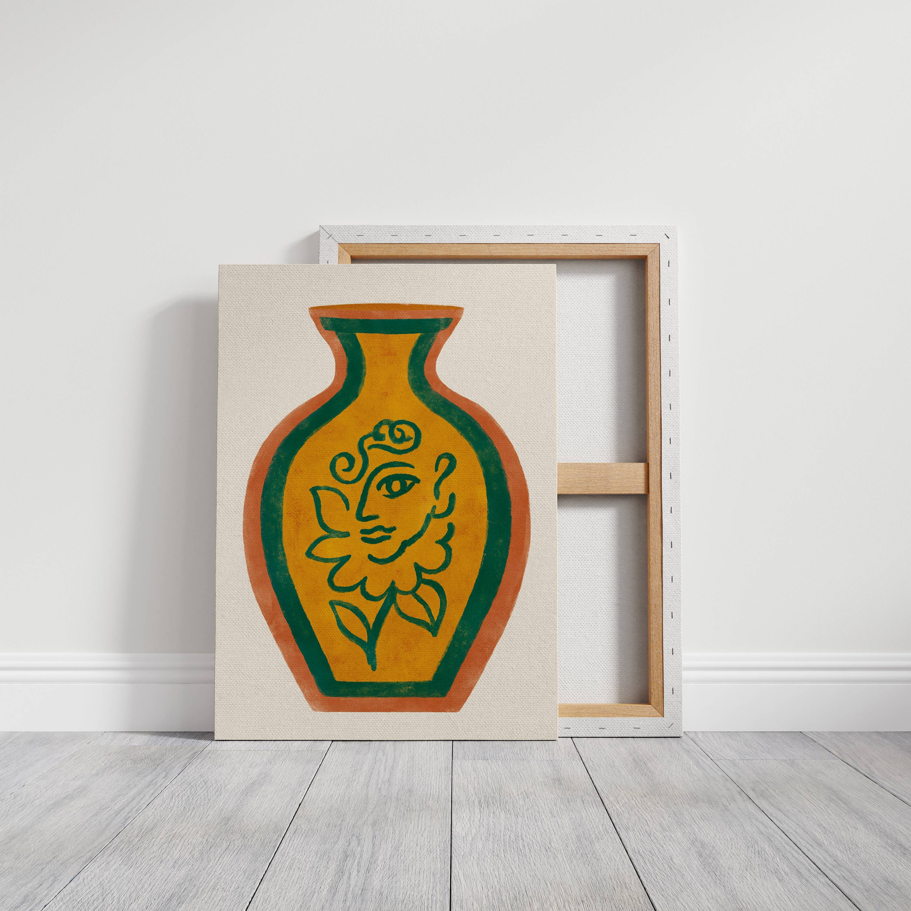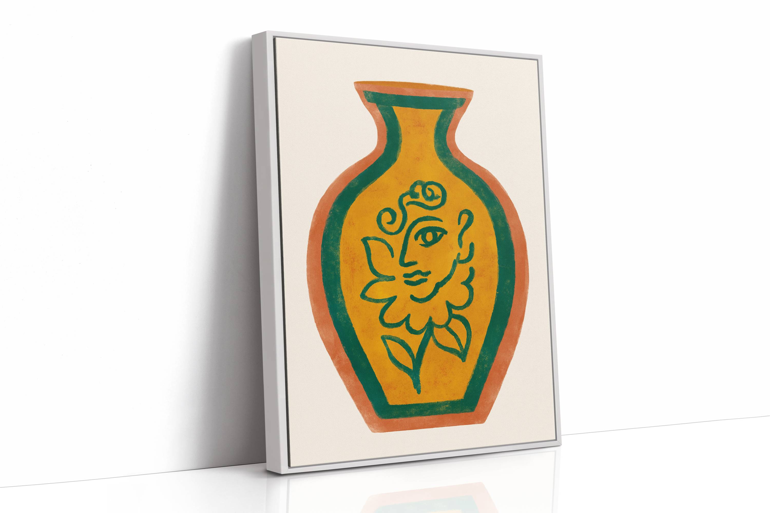 A playful dance of emerald lines against marigold yellow captures the essence of folk art simplicity. The terracotta-rimmed vessel cradles a whimsical portrait-flower hybrid, where feminine features merge with petals in an enchanting display of artistic imagination. The bold colors and flowing lines speak to both Mediterranean traditions and modern interpretive art, creating a striking balance between classical form and contemporary expression. Perfect for adding a touch of artistic warmth to a kitchen nook or bringing character to a minimalist dining space.