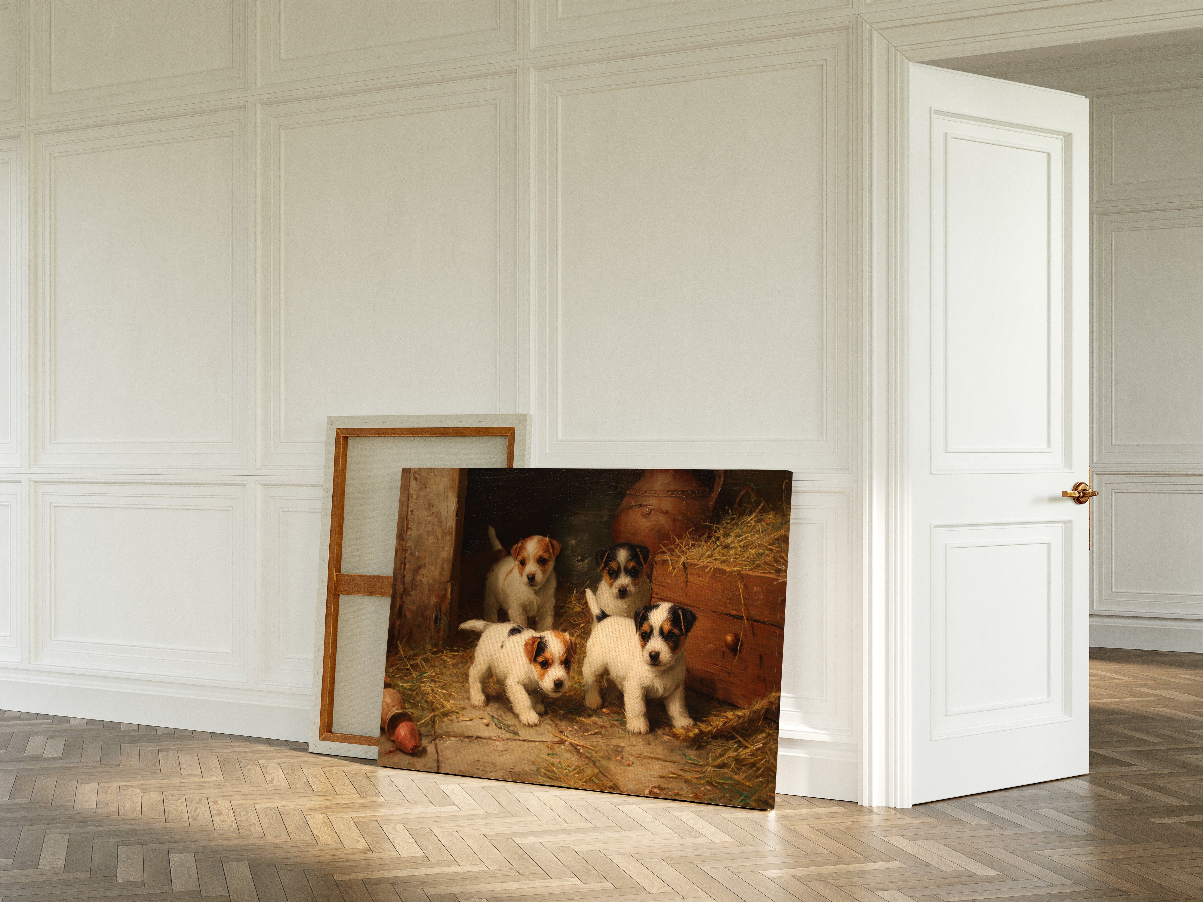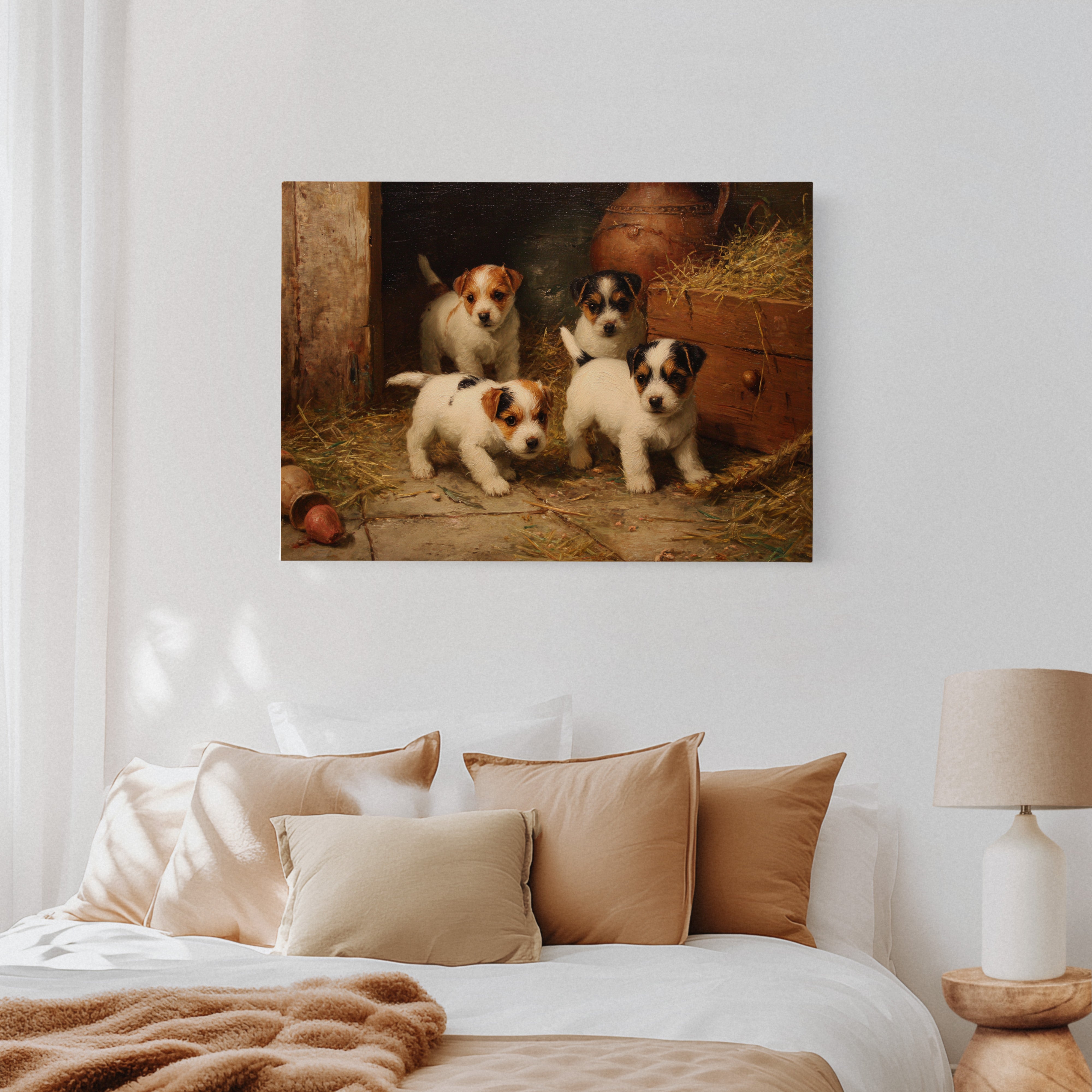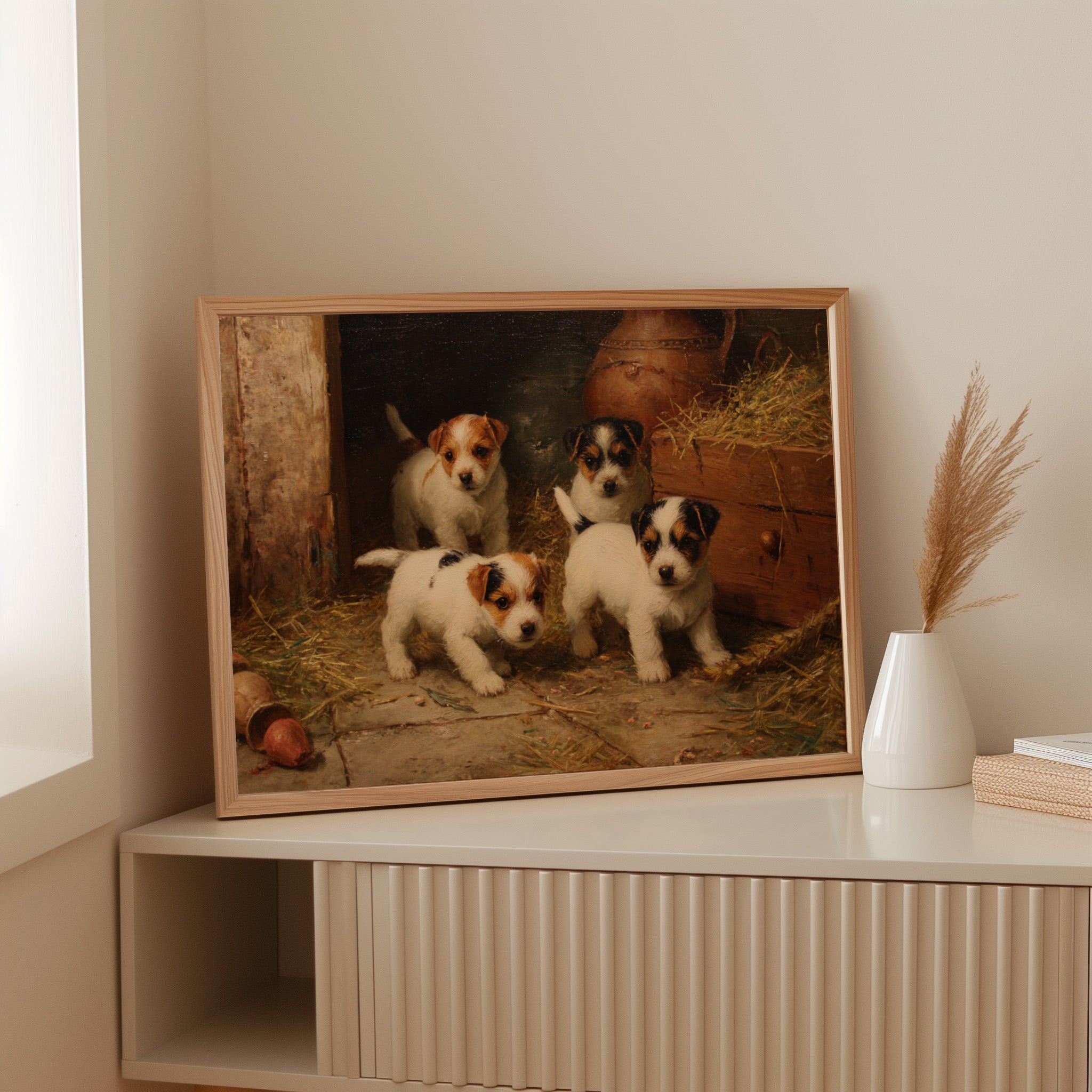 In the warm glow of a rustic barn, four mischievous terrier puppies gather with bright eyes and eager expressions. Their pristine white coats, marked with brown and black patches, stand out against the weathered wood and scattered hay. Each pup radiates personality and charm, from their alert ears to their sturdy little paws positioned for their next playful escapade. The scene captures a timeless moment of pastoral life, complete with terracotta pots and golden straw creating a cozy corner of countryside charm. Perfect for bringing warmth and character to a country kitchen, farmhouse dining room, or any space seeking to capture the innocent joy of rural living.