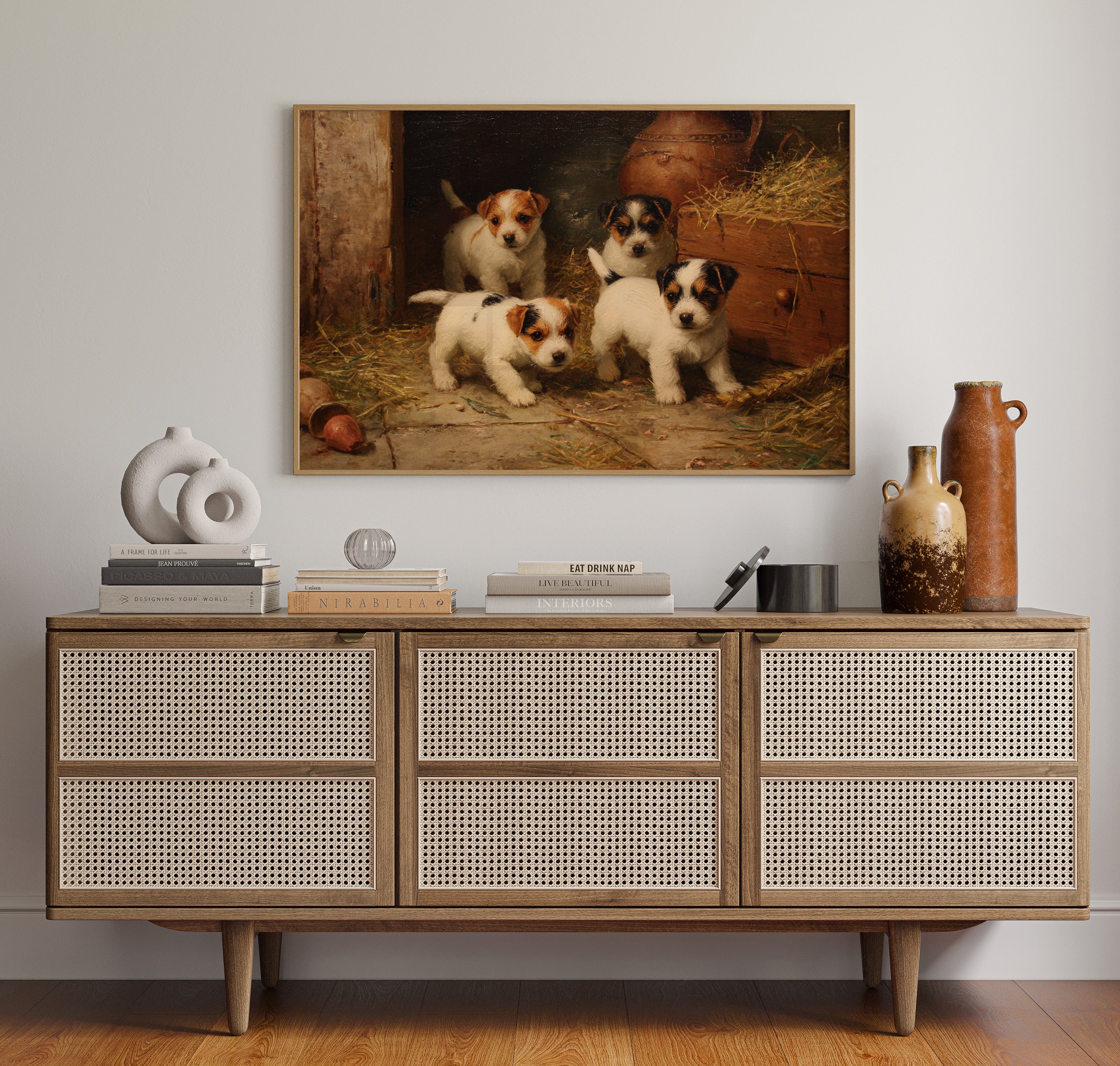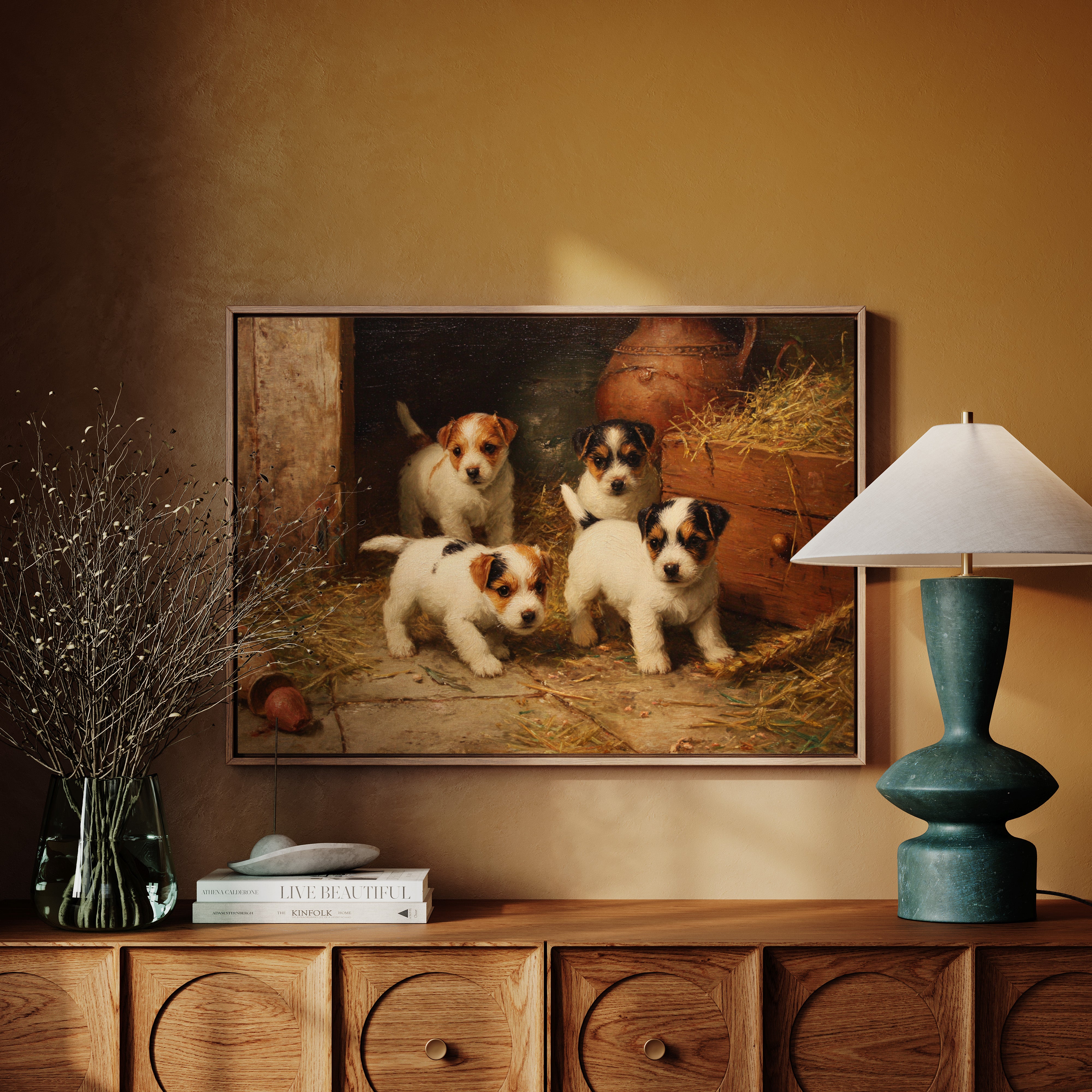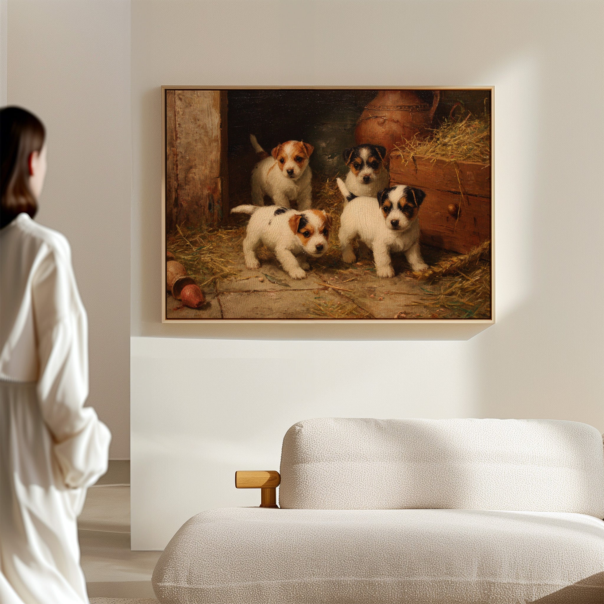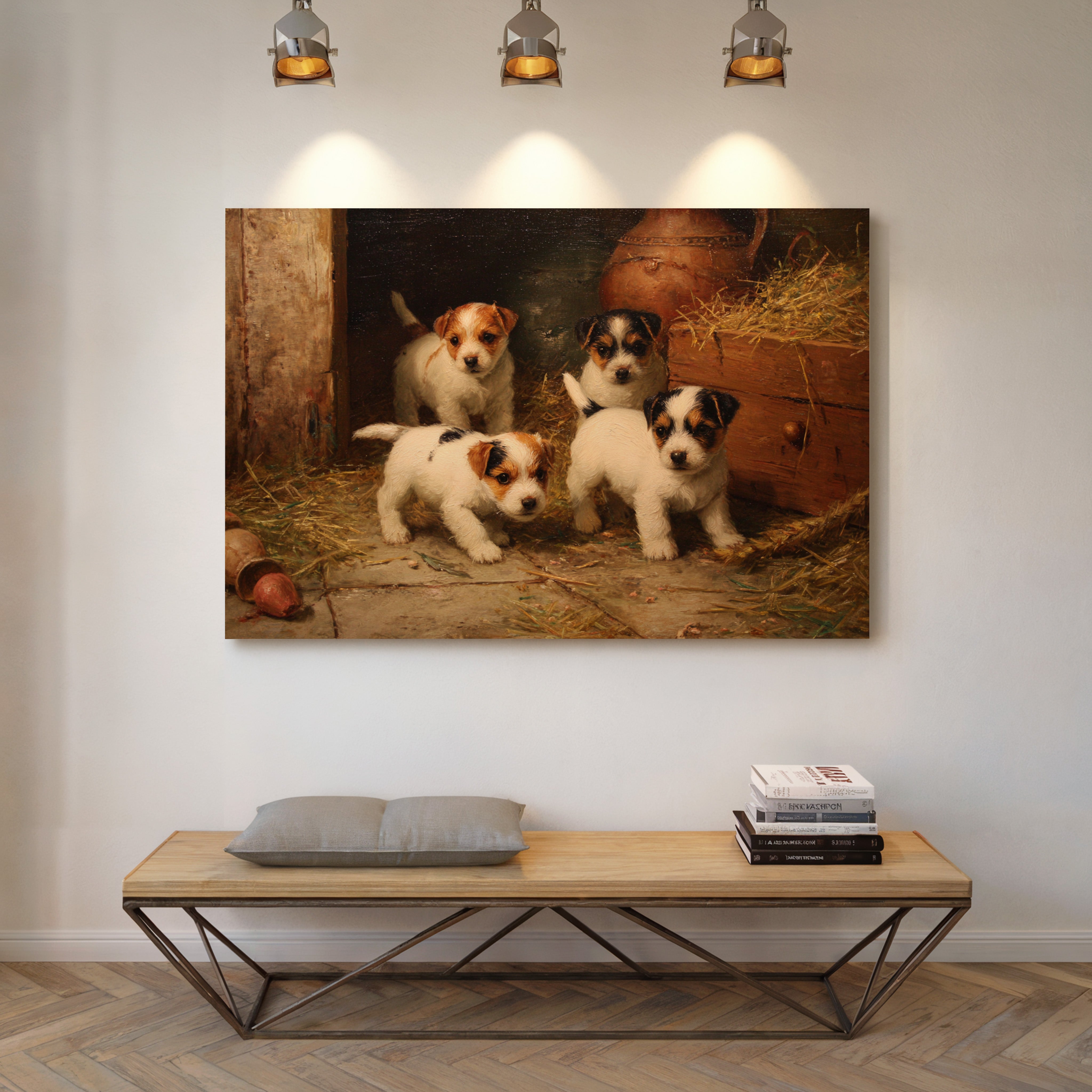 In the warm glow of a rustic barn, four mischievous terrier puppies gather with bright eyes and eager expressions. Their pristine white coats, marked with brown and black patches, stand out against the weathered wood and scattered hay. Each pup radiates personality and charm, from their alert ears to their sturdy little paws positioned for their next playful escapade. The scene captures a timeless moment of pastoral life, complete with terracotta pots and golden straw creating a cozy corner of countryside charm. Perfect for bringing warmth and character to a country kitchen, farmhouse dining room, or any space seeking to capture the innocent joy of rural living.