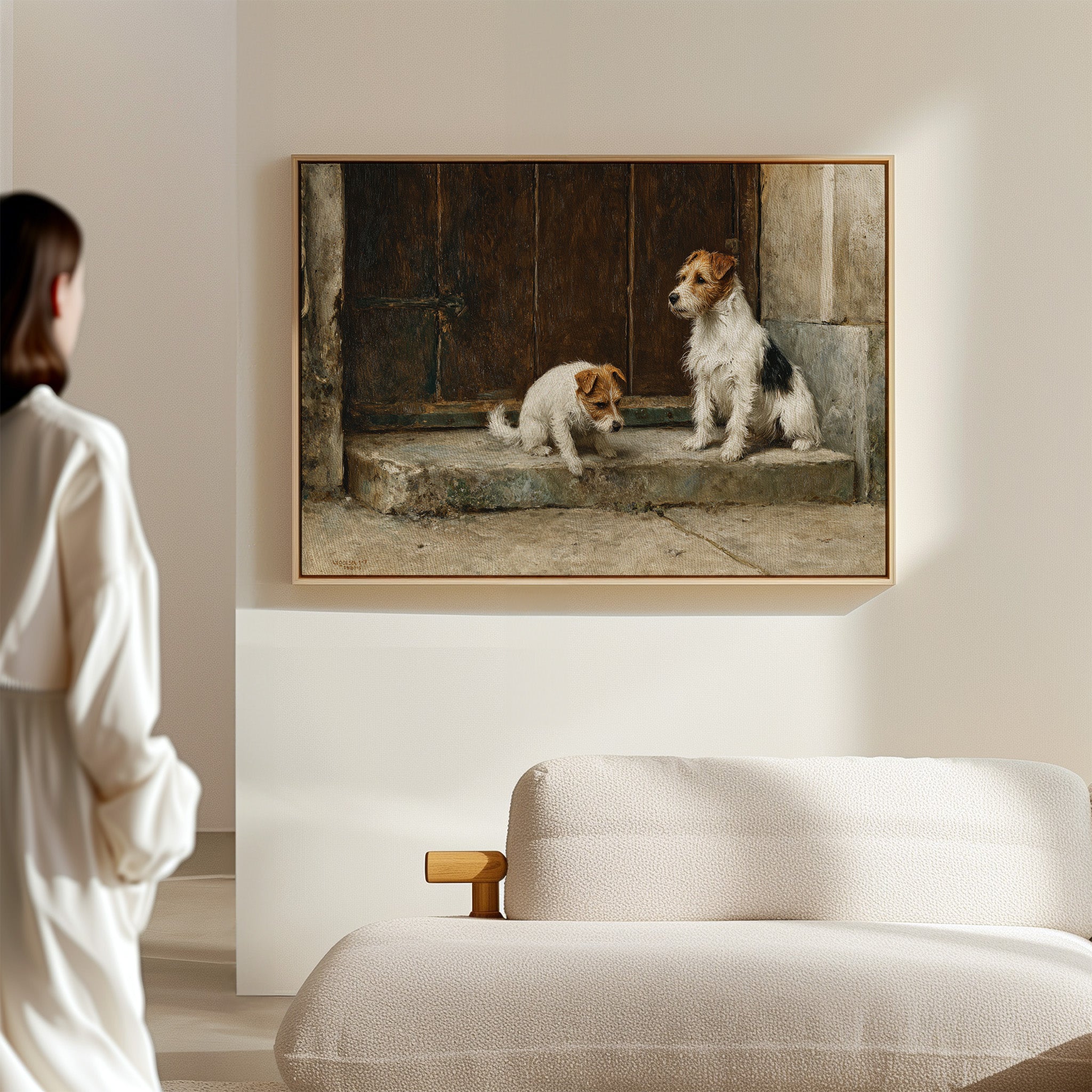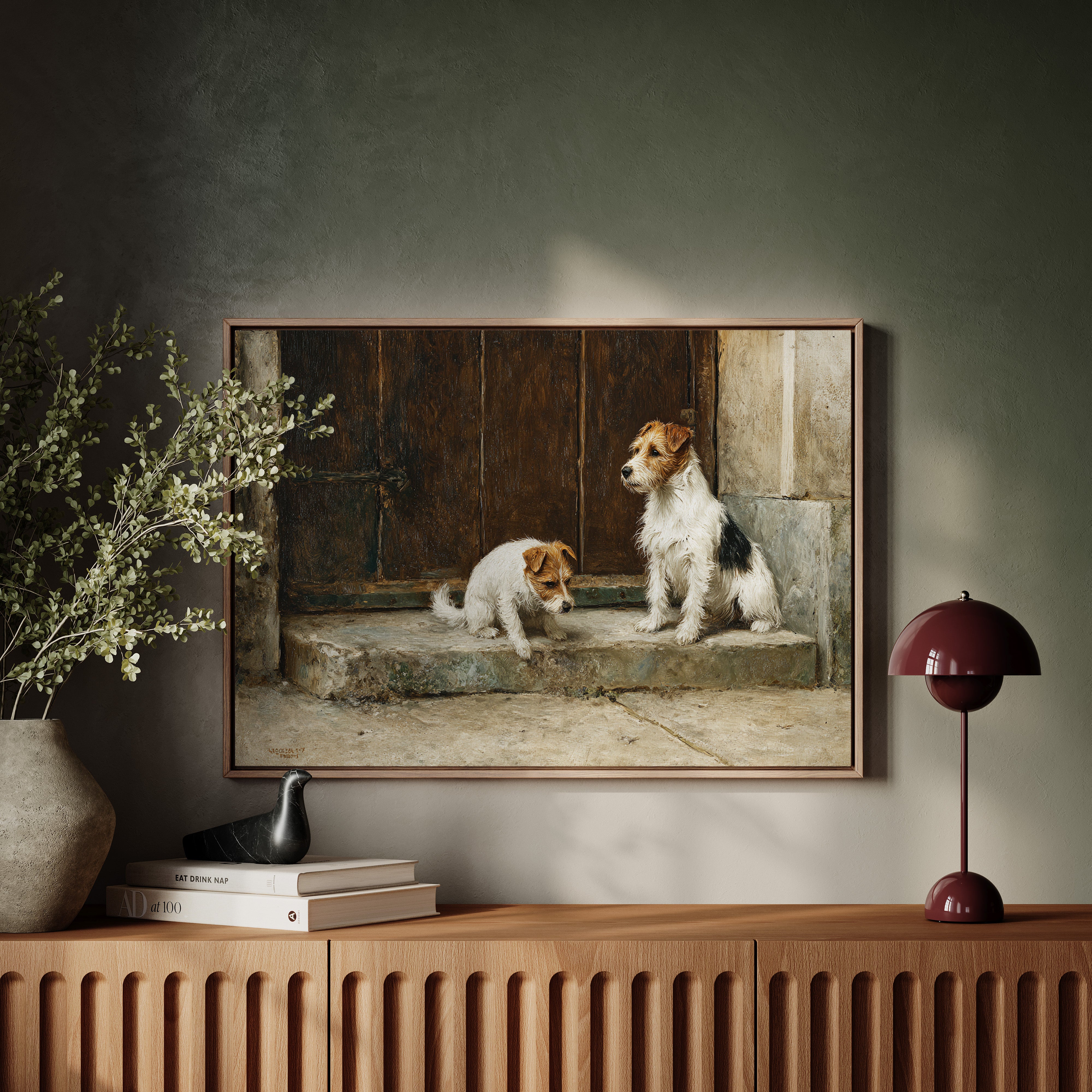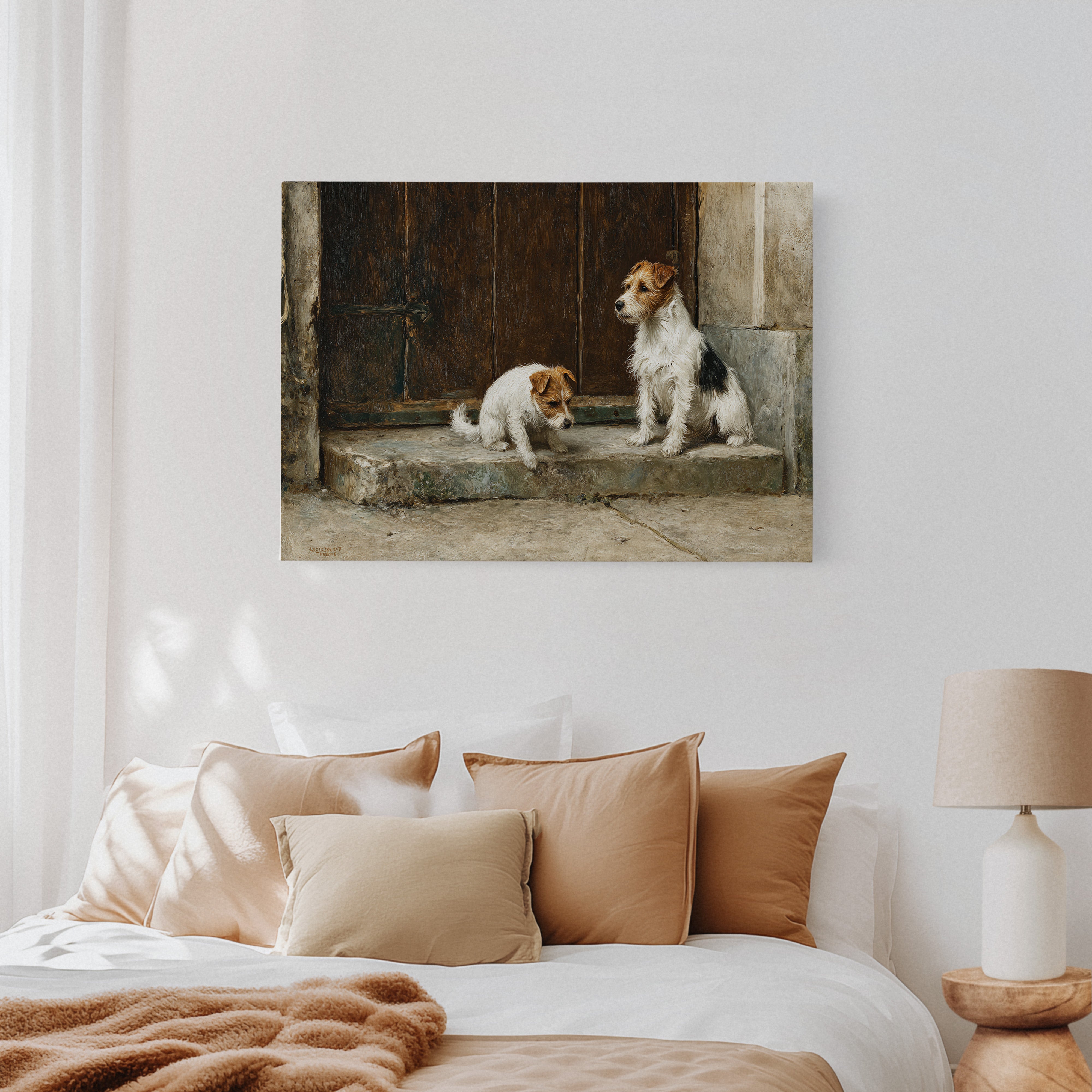 Two wire-haired terriers stand sentinel on weathered stone steps, their alert presence a testament to unwavering loyalty. The rich contrast between their crisp white coats and russet markings plays against the deep browns of an aged wooden door, creating a classical portrait of companionship. The larger dog sits proudly while its smaller companion investigates their shared domain, their expressions reflecting both vigilance and curiosity. Perfect for a study, library, or any space where traditional charm meets contemporary sophistication.