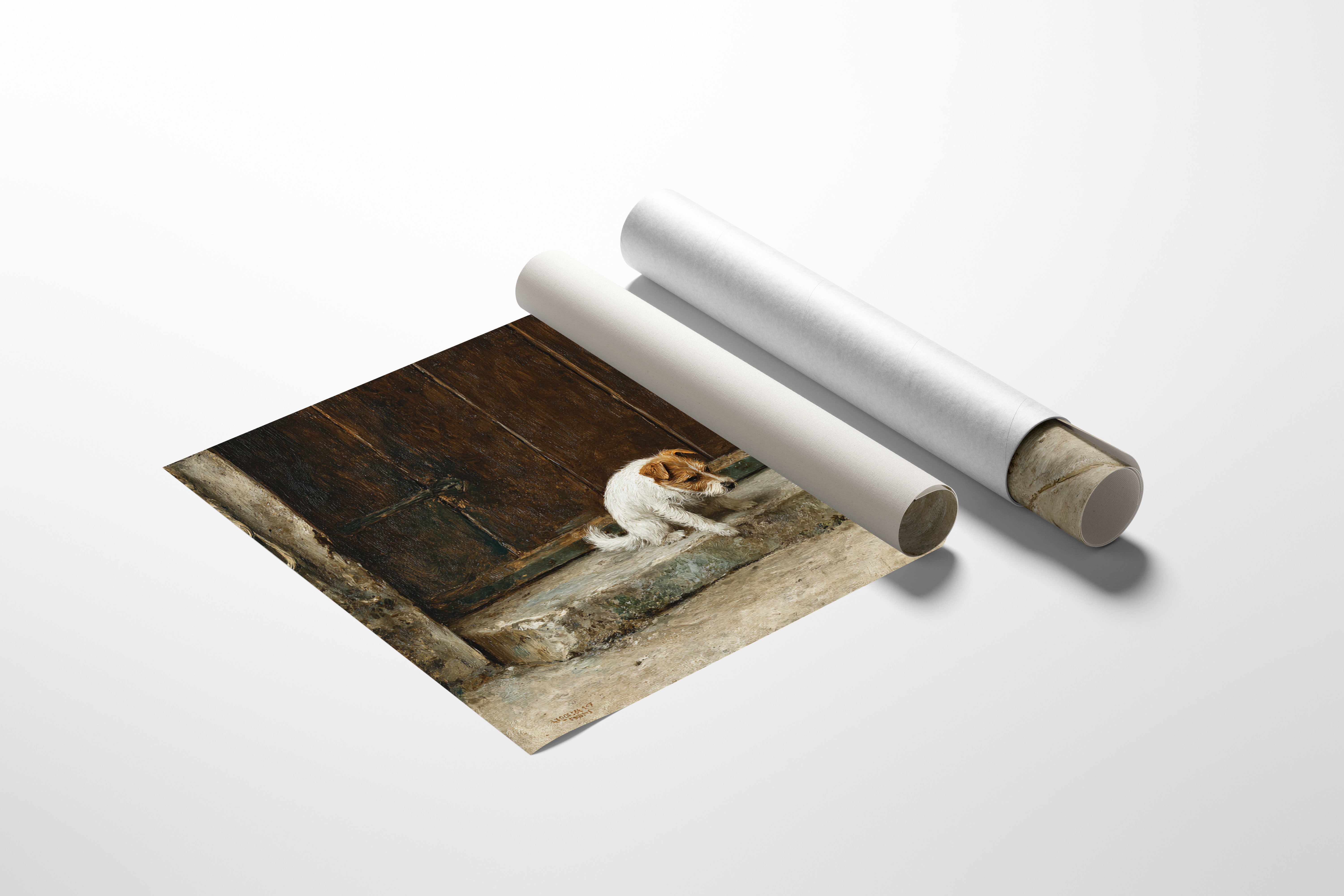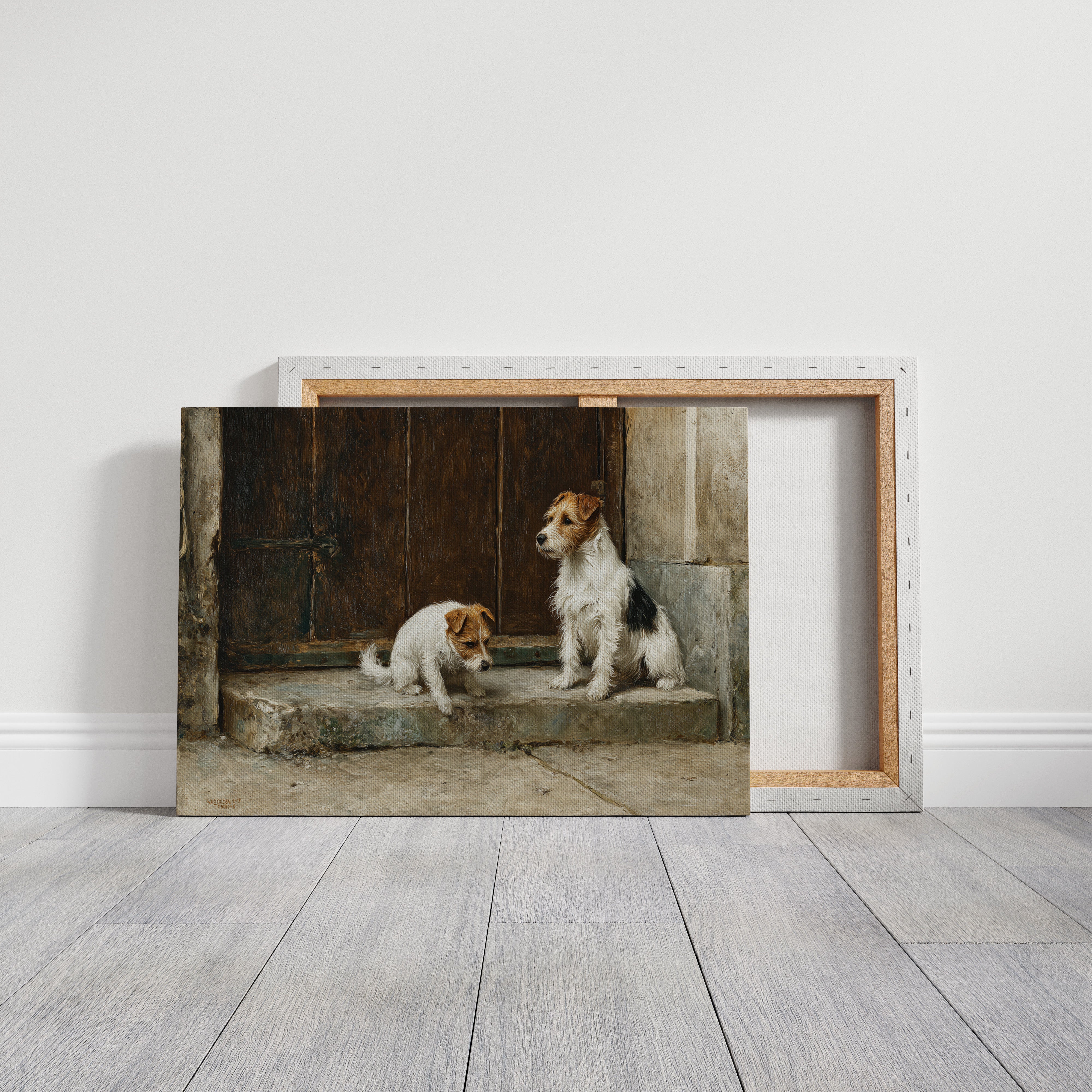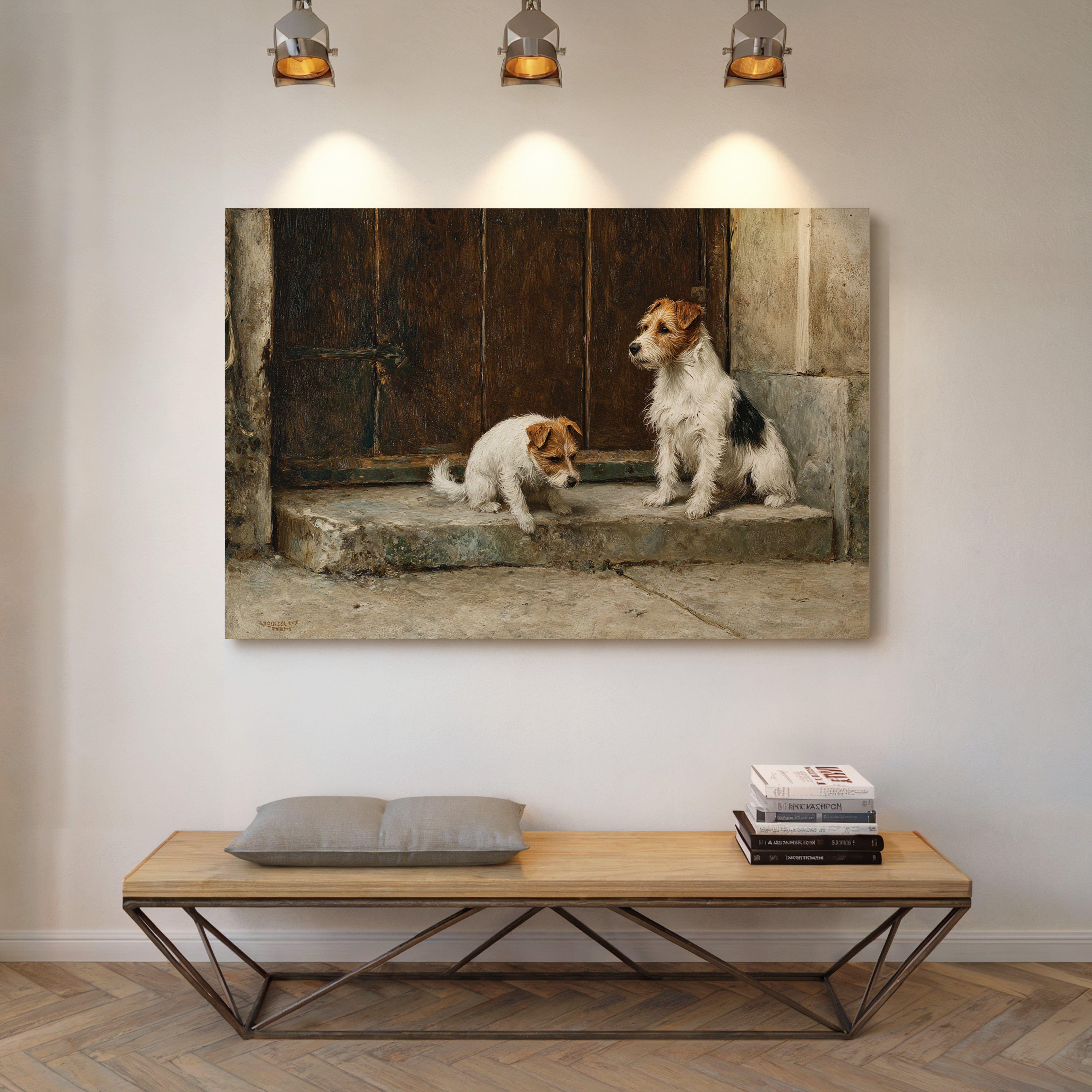 Two wire-haired terriers stand sentinel on weathered stone steps, their alert presence a testament to unwavering loyalty. The rich contrast between their crisp white coats and russet markings plays against the deep browns of an aged wooden door, creating a classical portrait of companionship. The larger dog sits proudly while its smaller companion investigates their shared domain, their expressions reflecting both vigilance and curiosity. Perfect for a study, library, or any space where traditional charm meets contemporary sophistication.