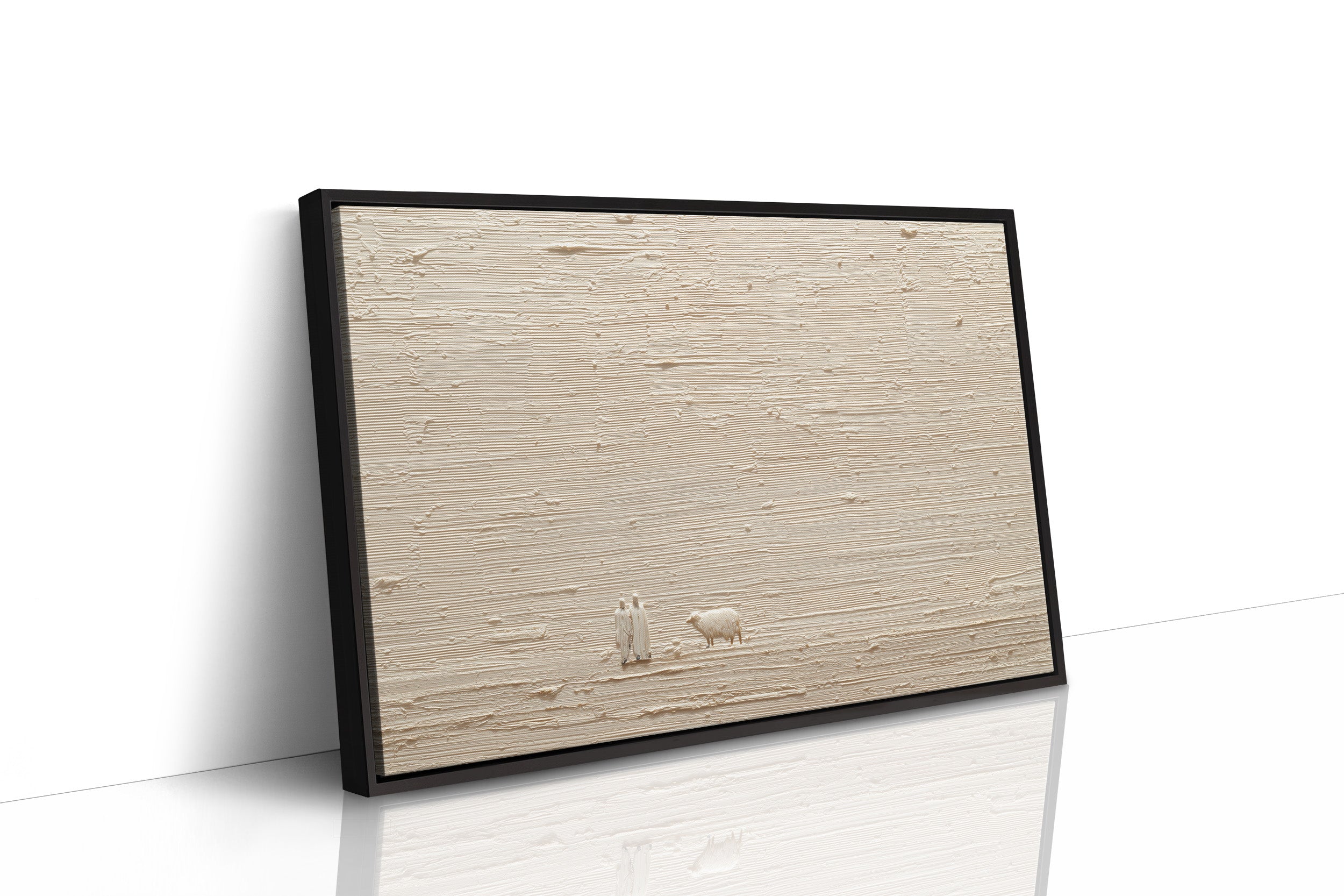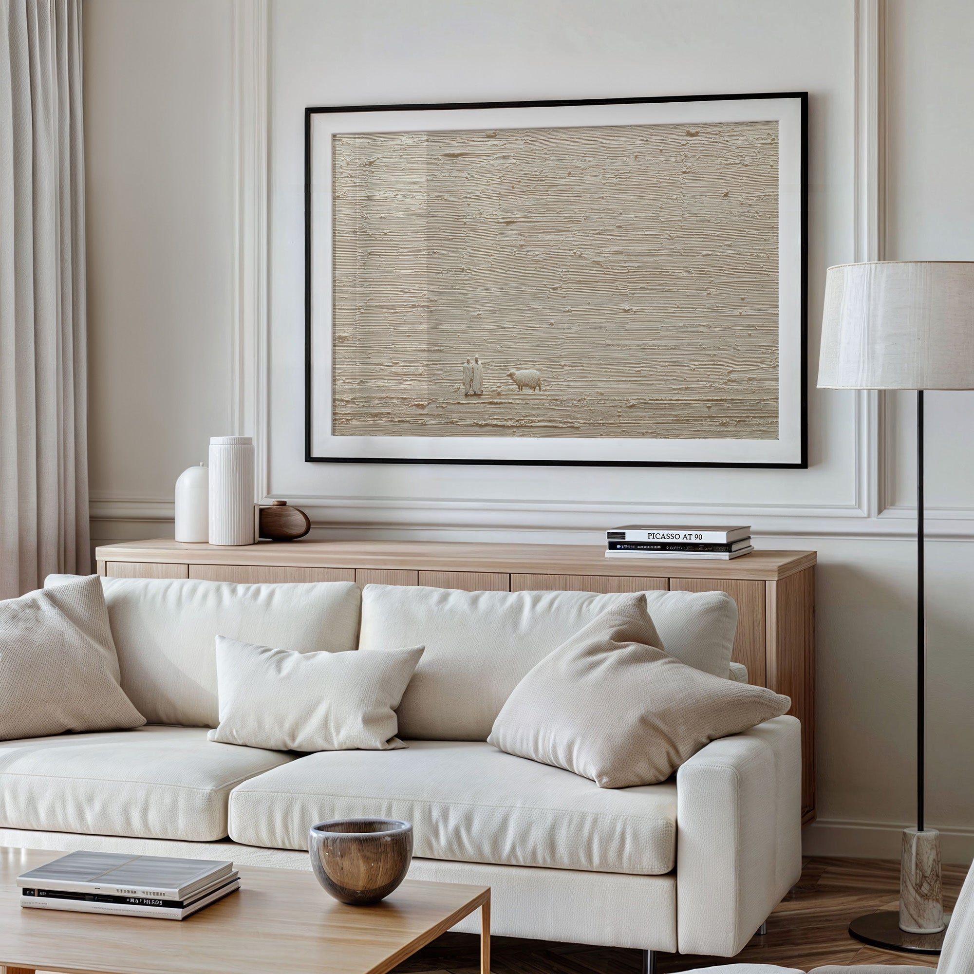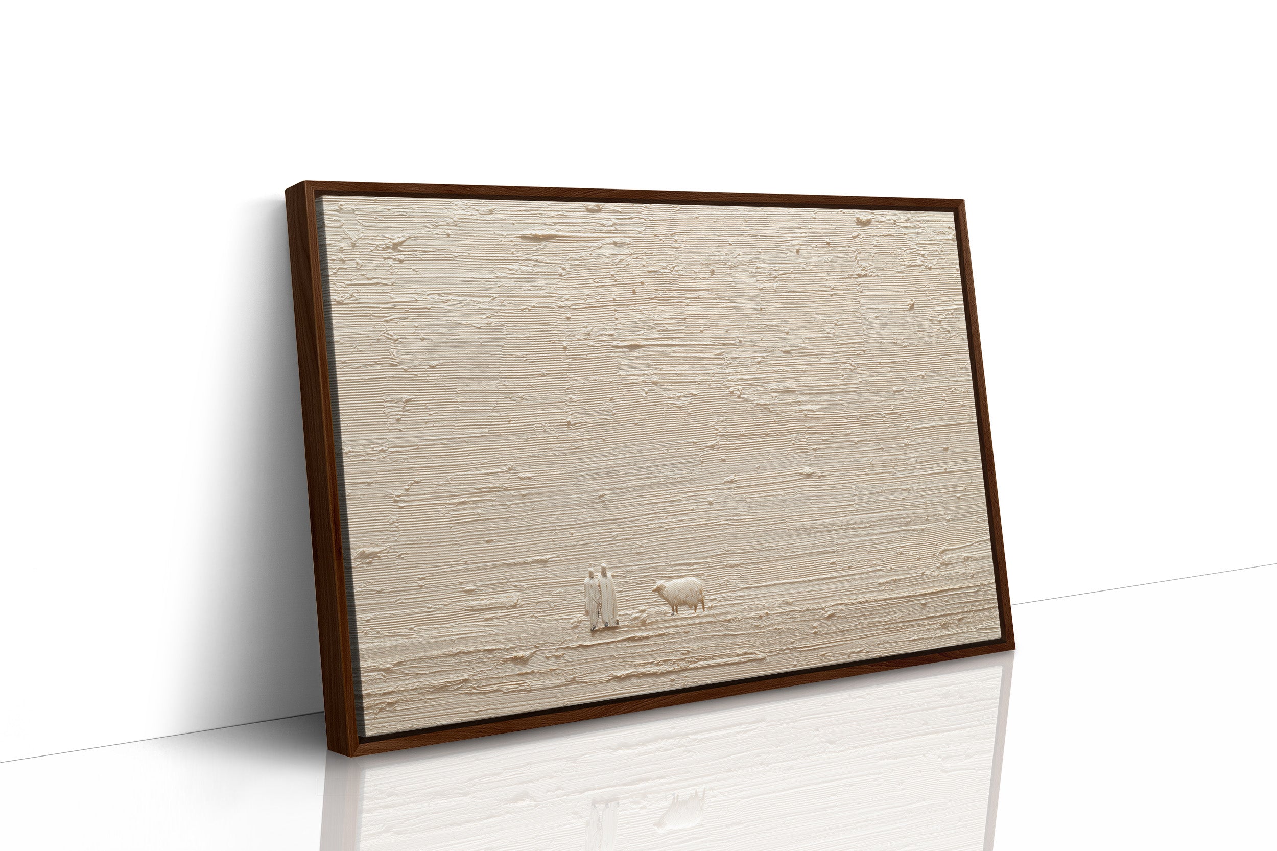Sunlight washes over a minimalist textured artwork, where tiny figures of a person and animal traverse an expanse of creamy white relief. The tactile landscape rests among wooden bookshelves, creating a dialogue between literature and visual storytelling. Dried pampas grass in an earthenware vessel stands sentinel beside the framed piece, enhancing the natural, organic aesthetic with its feathery plumes.