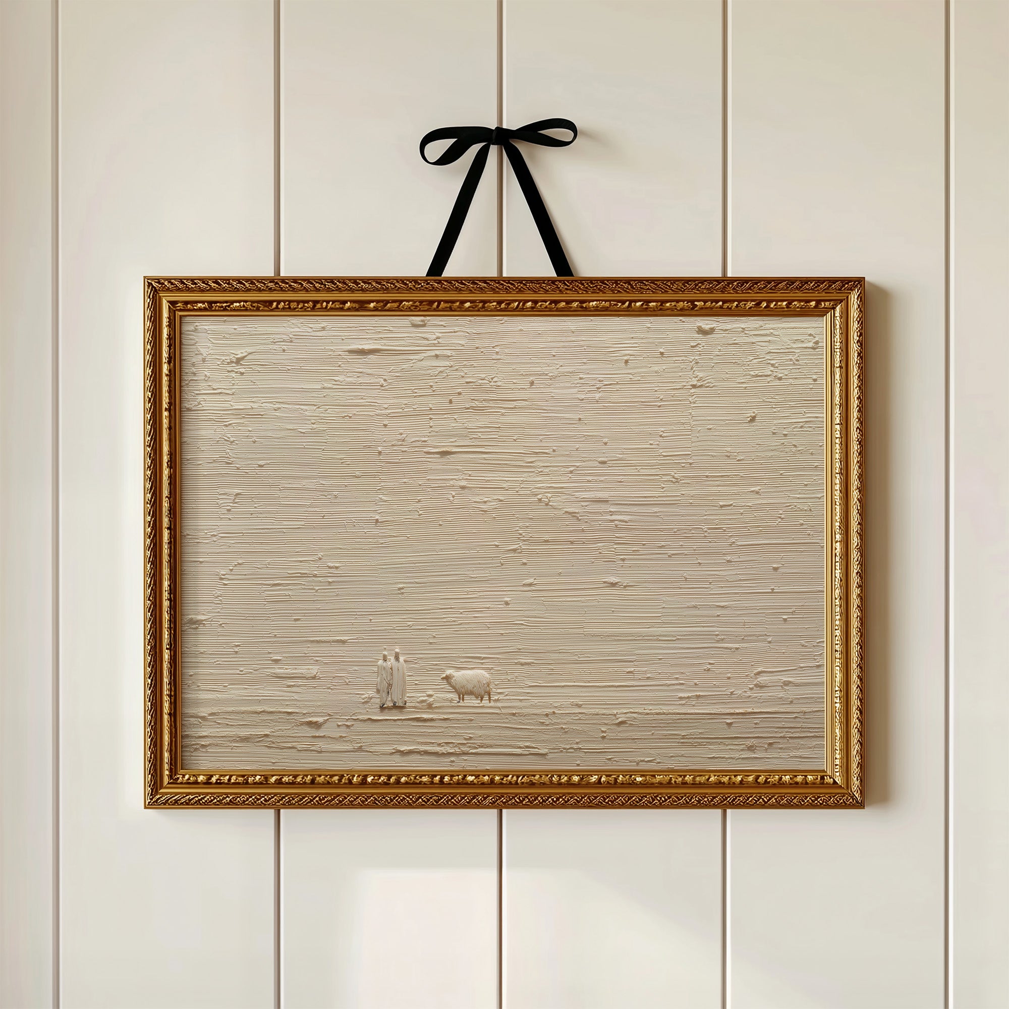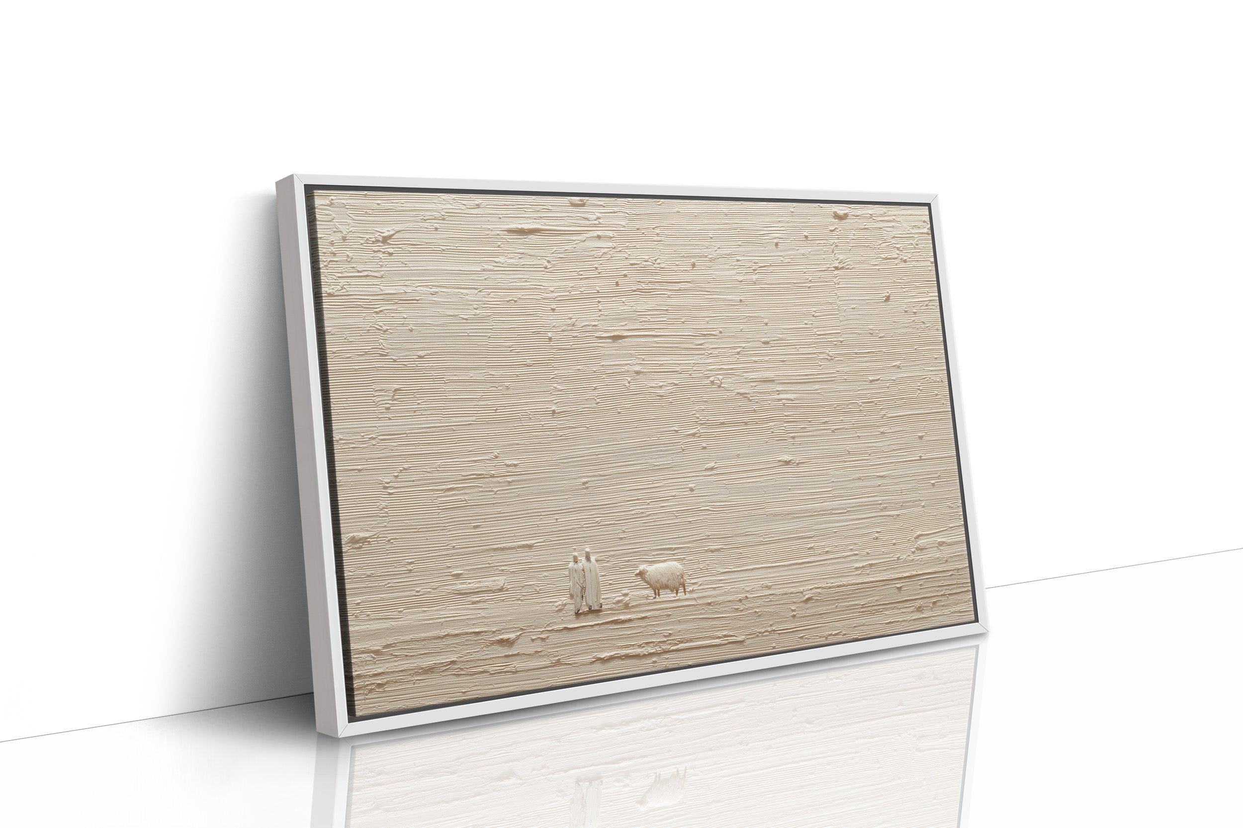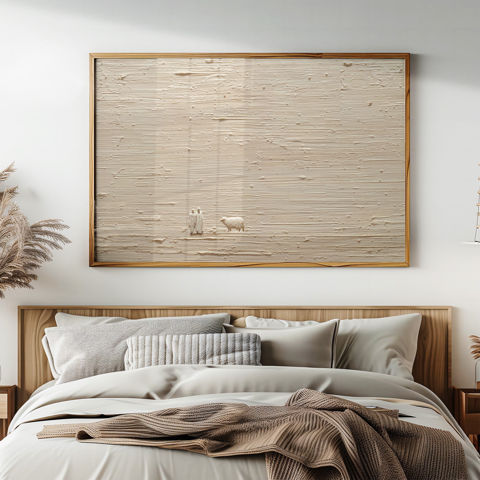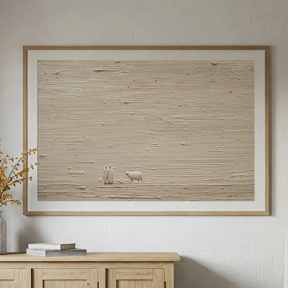 Sunlight washes over a minimalist textured artwork, where tiny figures of a person and animal traverse an expanse of creamy white relief. The tactile landscape rests among wooden bookshelves, creating a dialogue between literature and visual storytelling. Dried pampas grass in an earthenware vessel stands sentinel beside the framed piece, enhancing the natural, organic aesthetic with its feathery plumes.