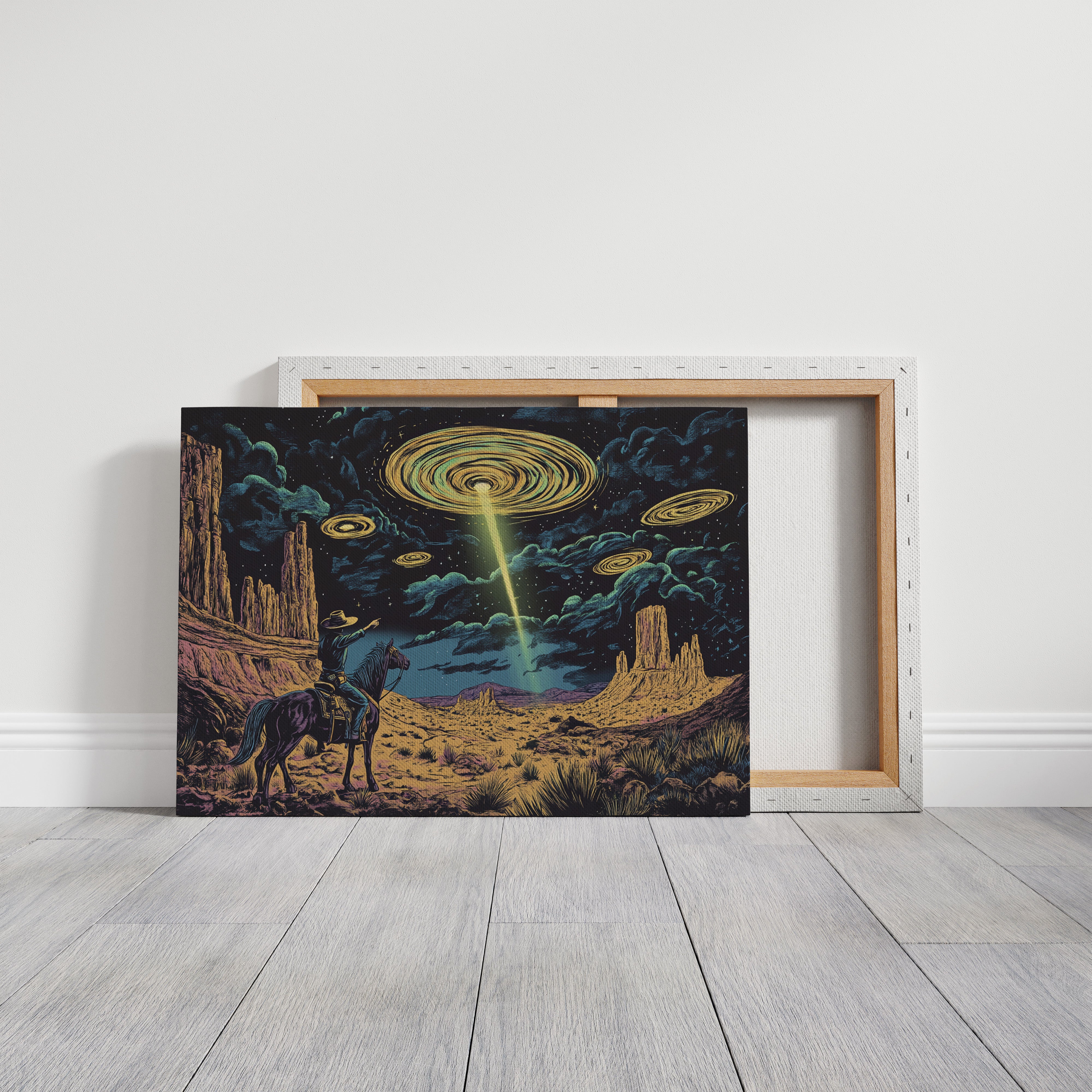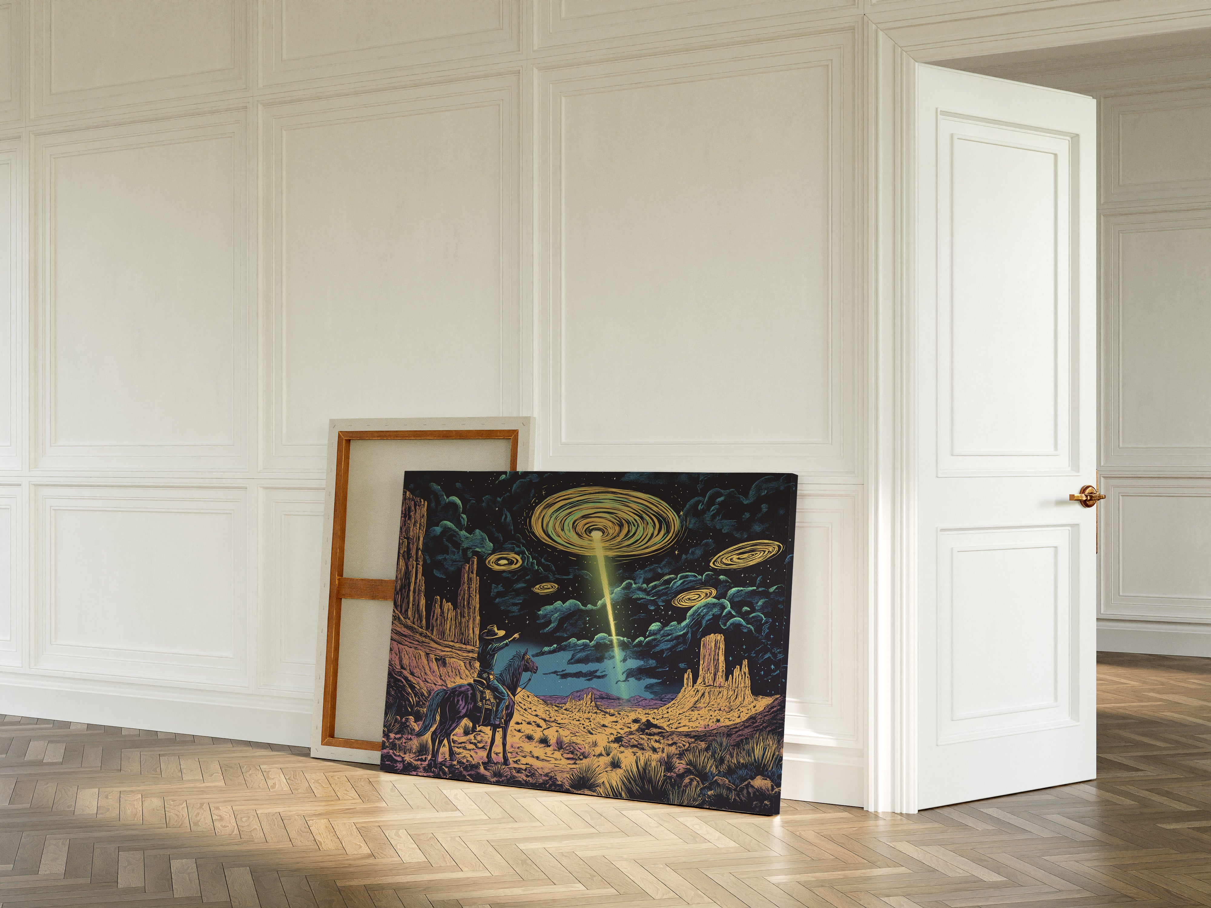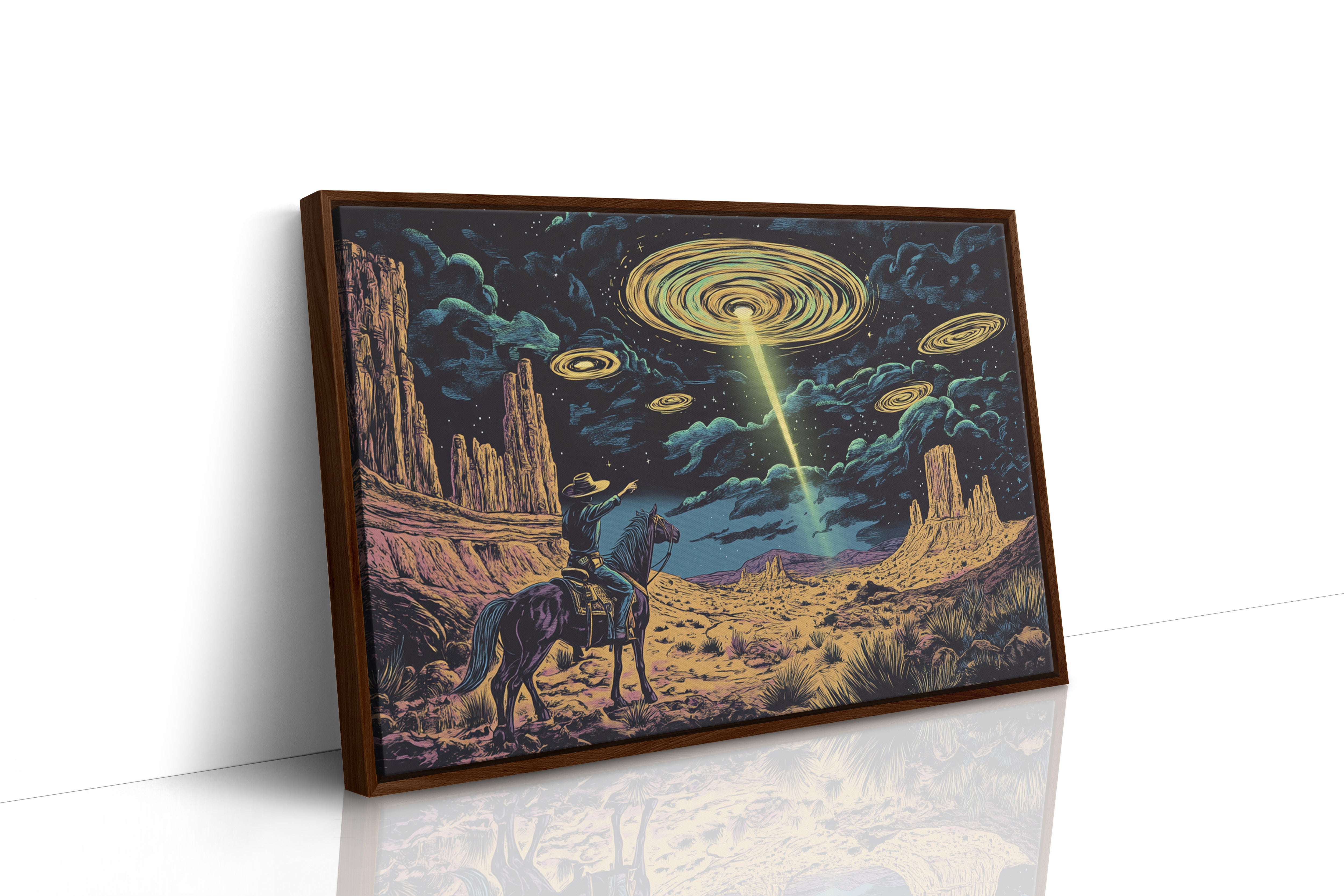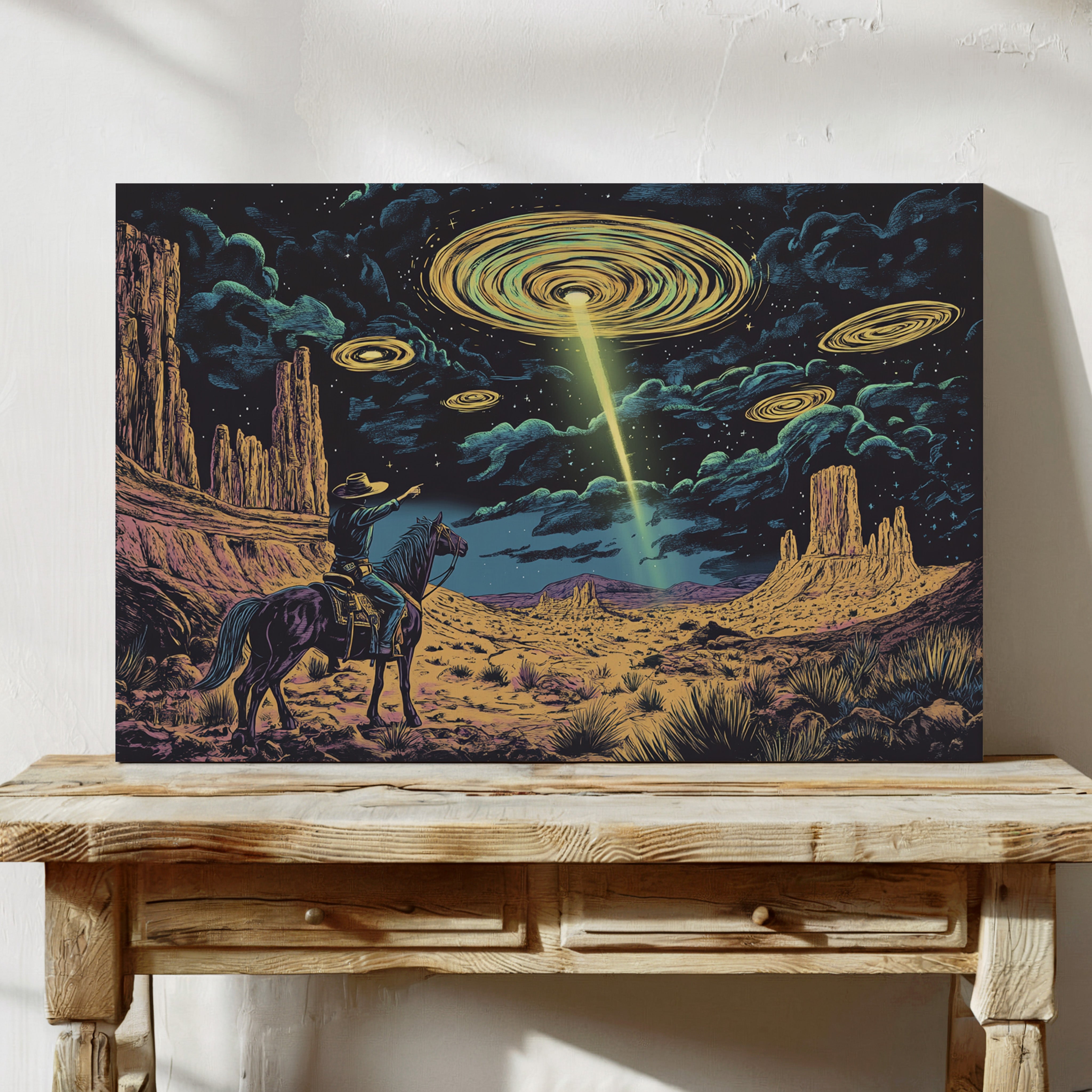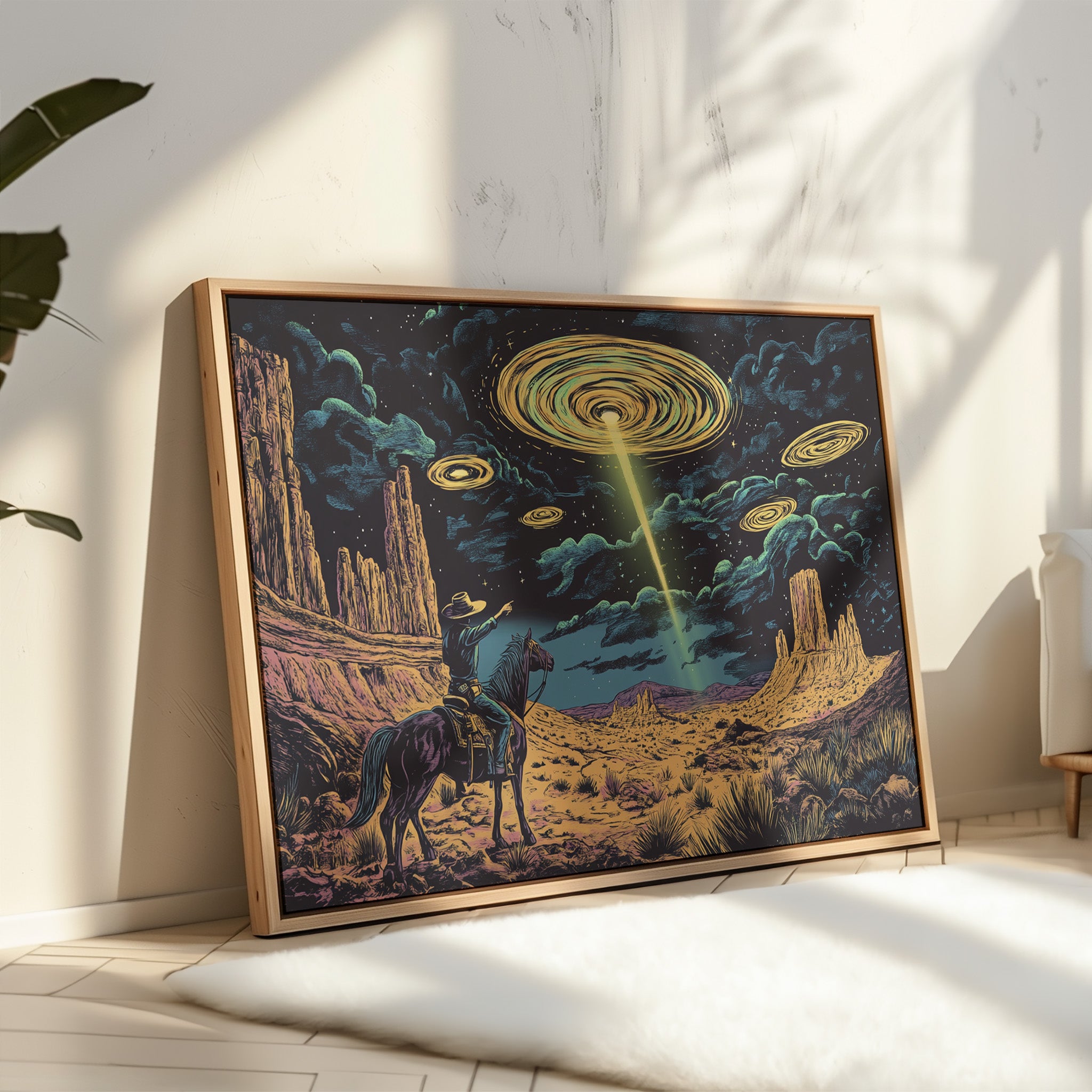 A lone cowboy raises his hand to the swirling sky, where golden discs descend in silence. This cosmic western scene fuses retro alien lore with desert grandeur in vivid detail.