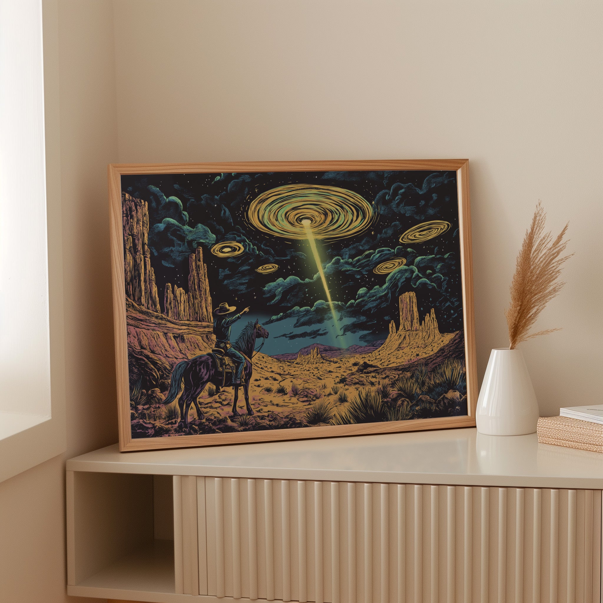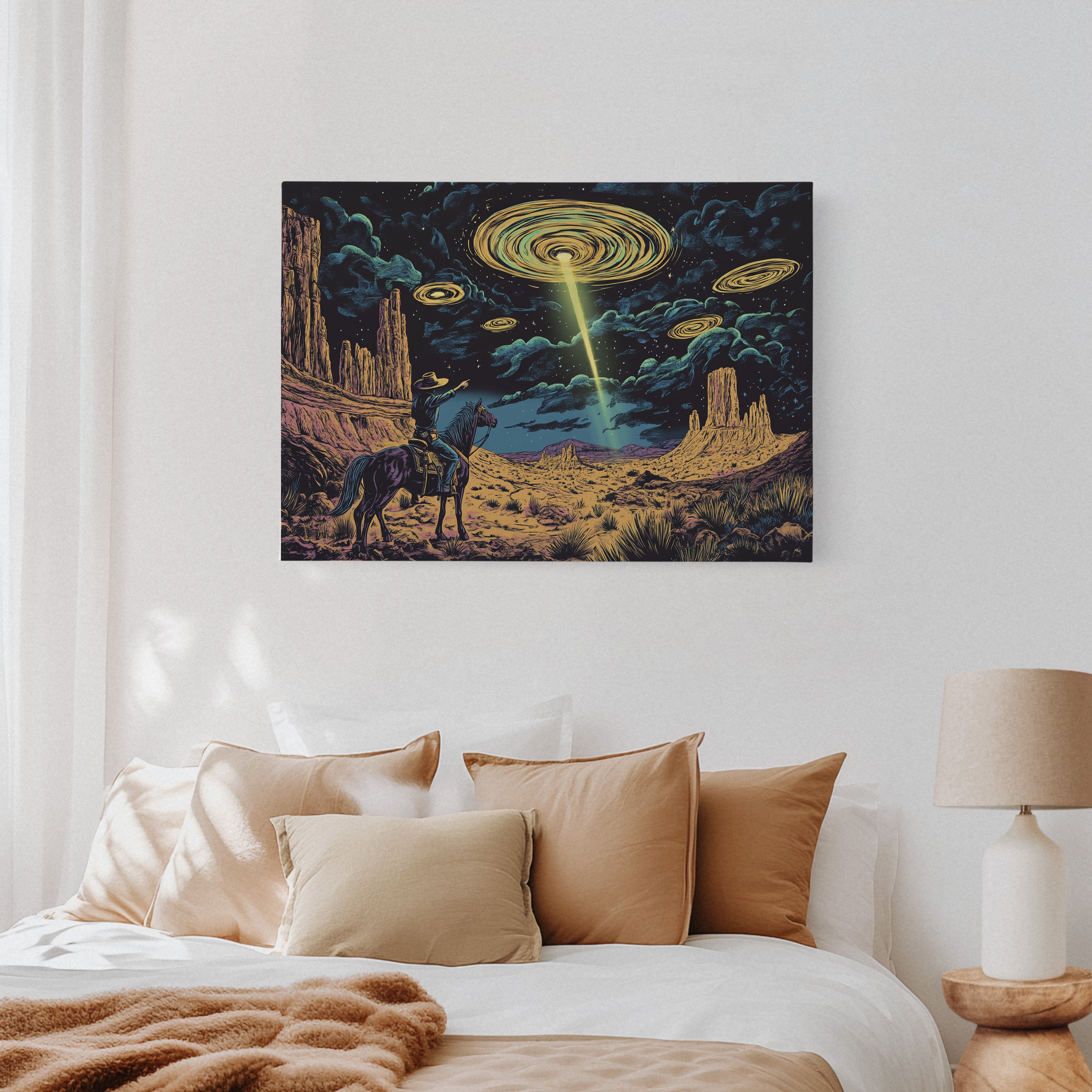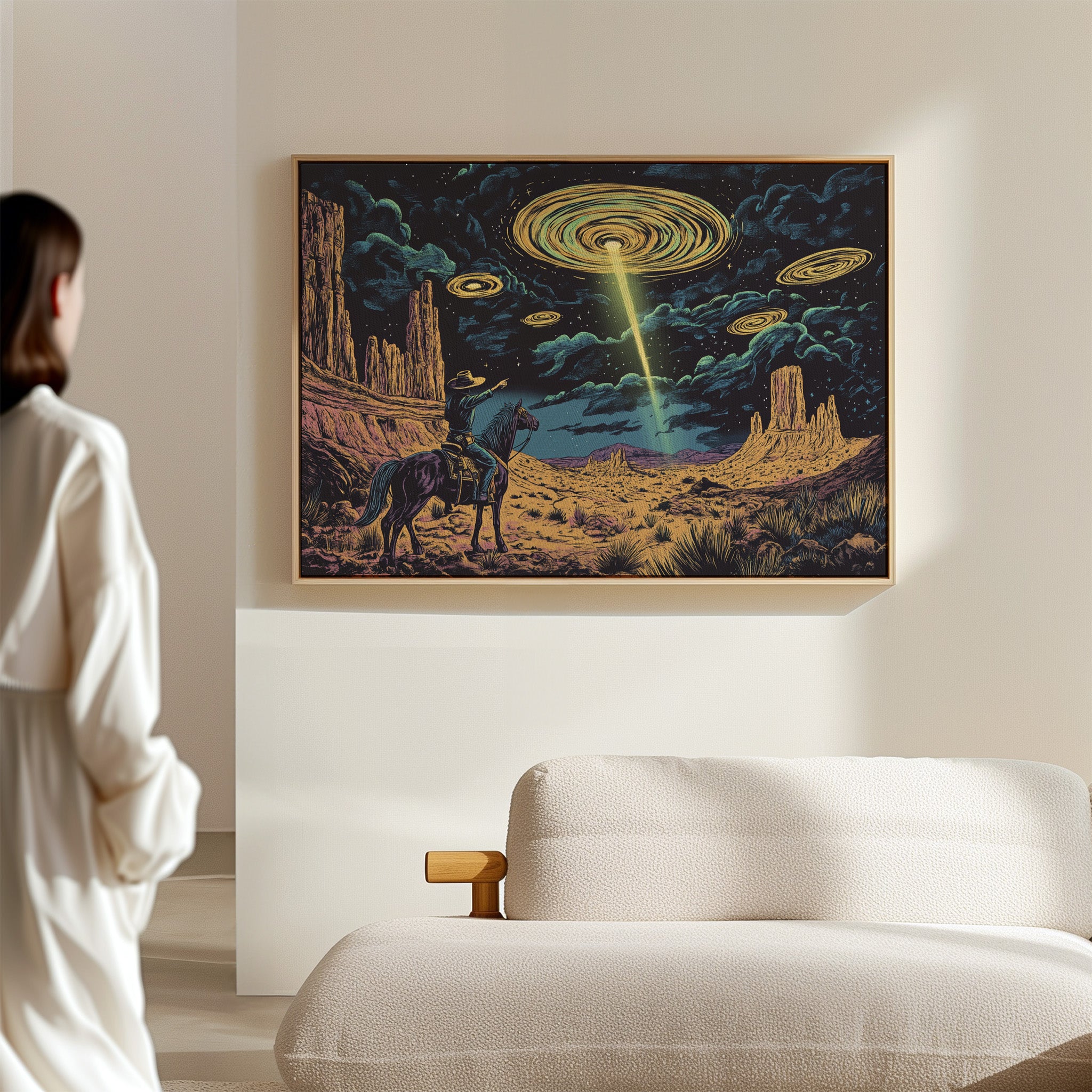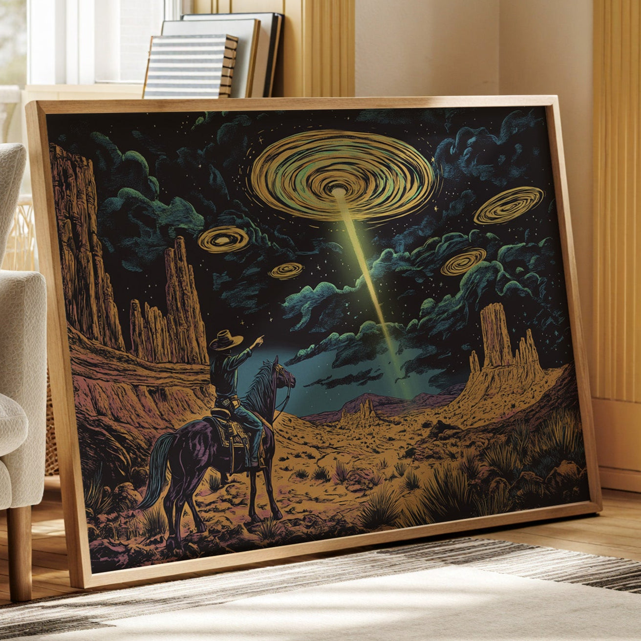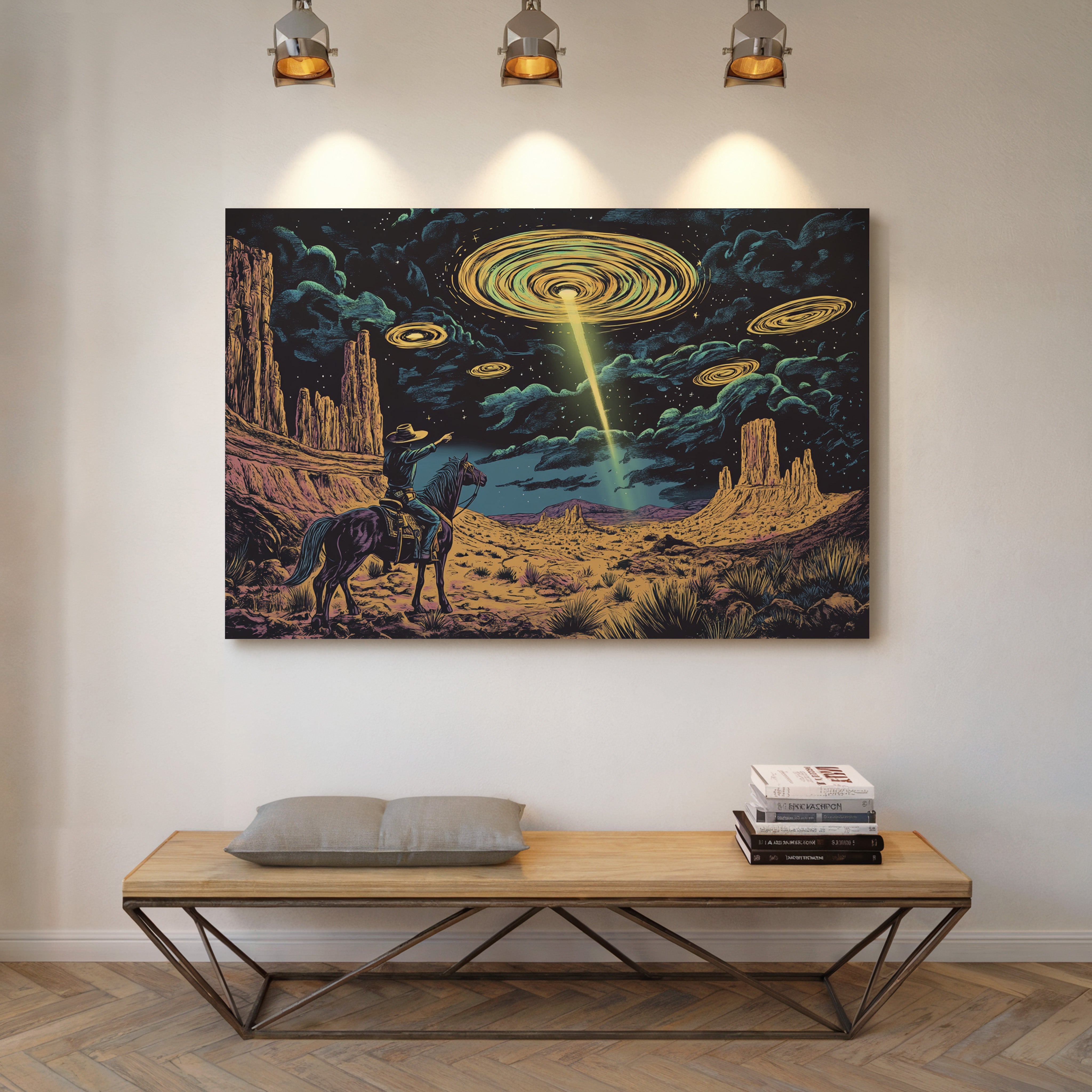A lone cowboy raises his hand to the swirling sky, where golden discs descend in silence. This cosmic western scene fuses retro alien lore with desert grandeur in vivid detail.