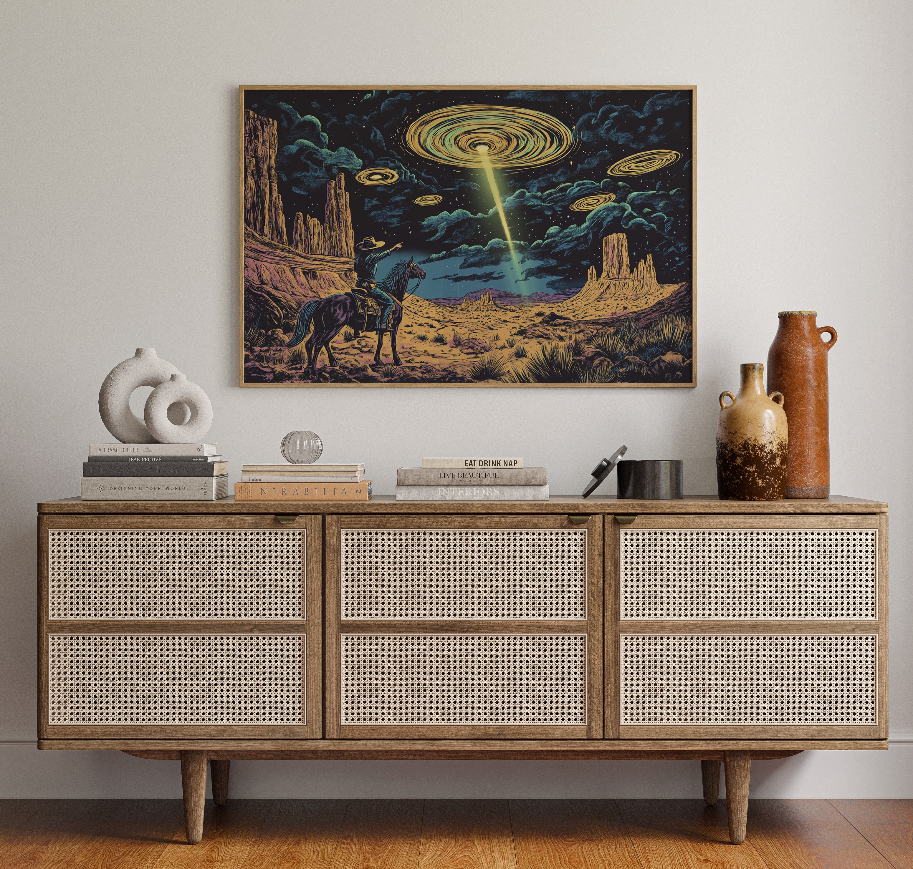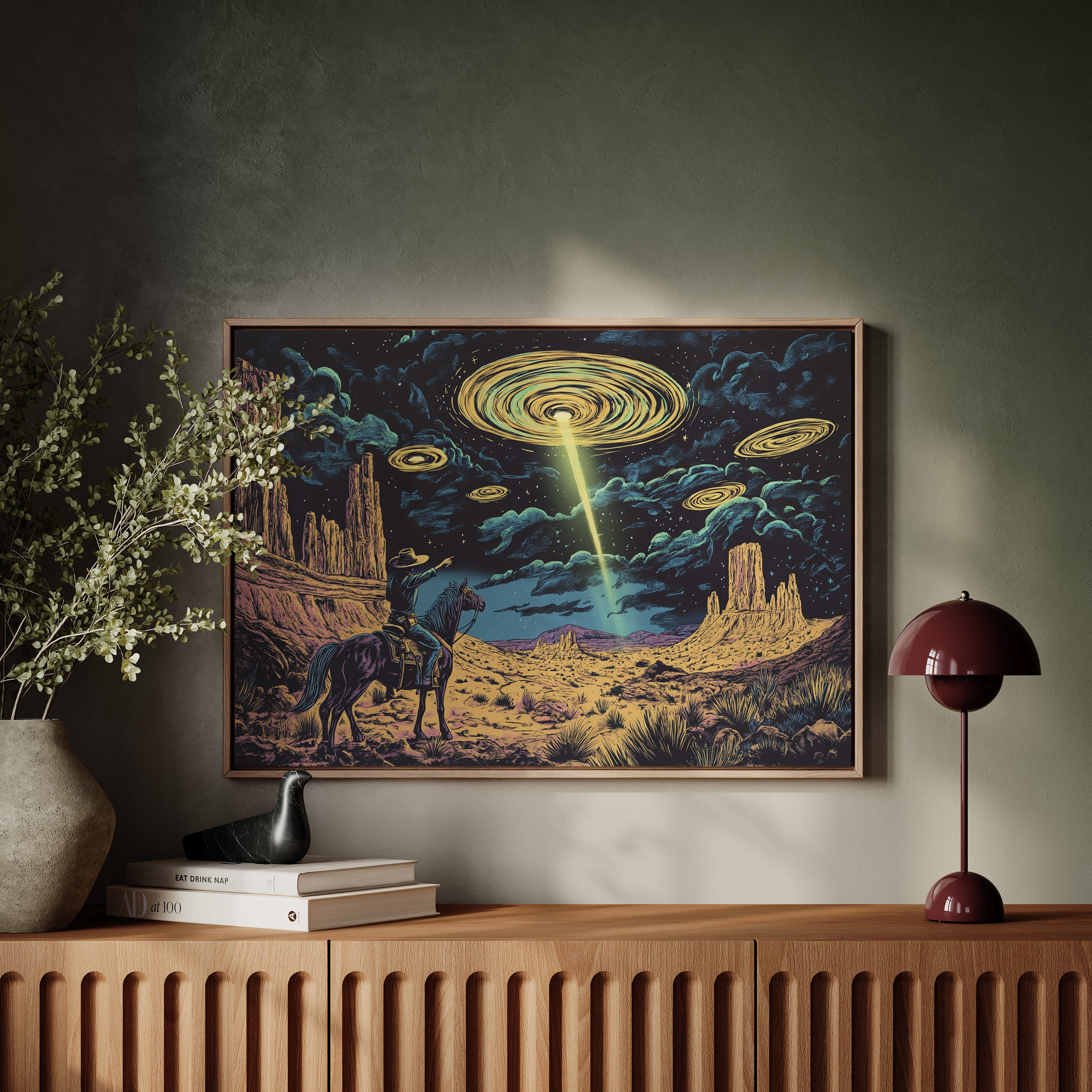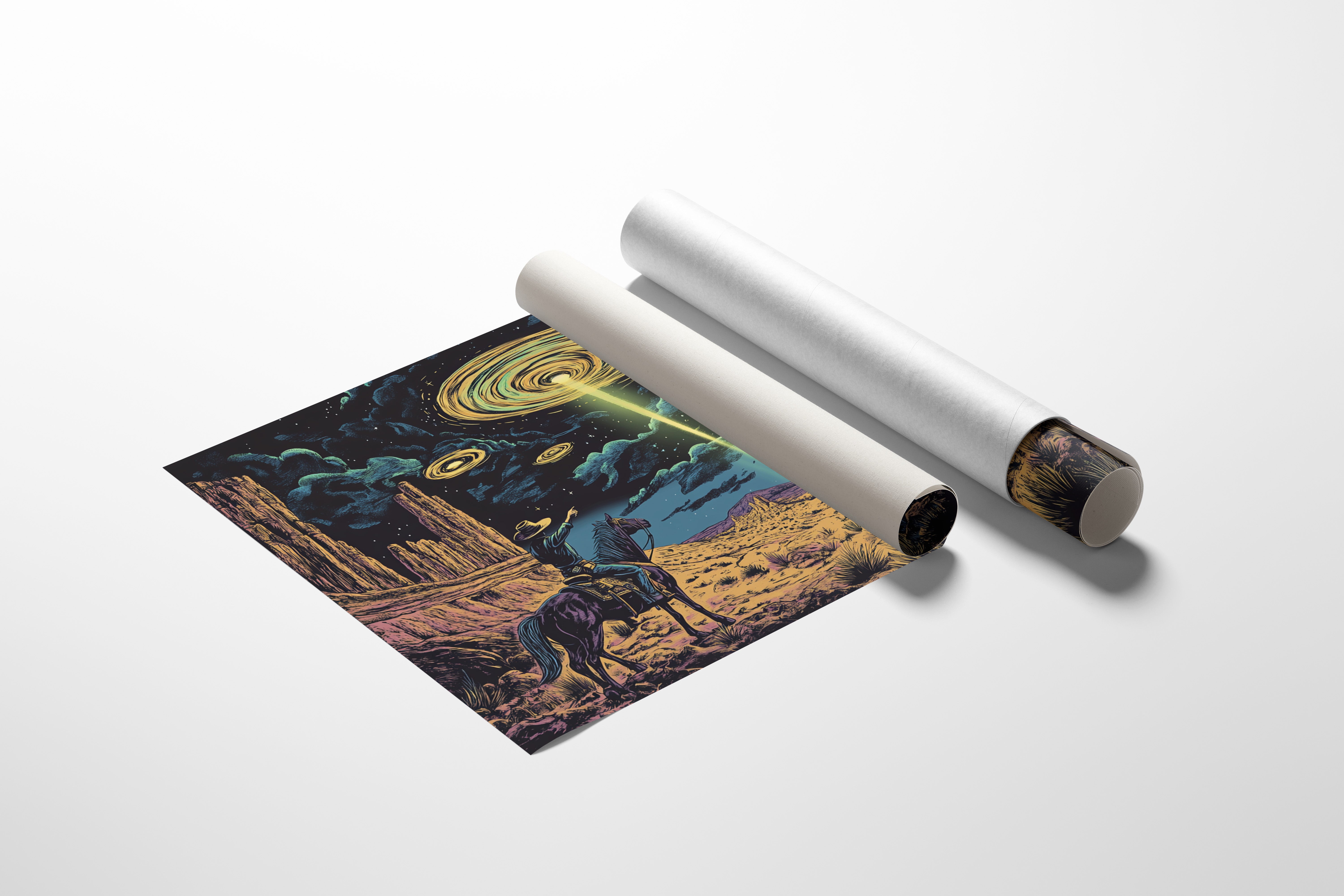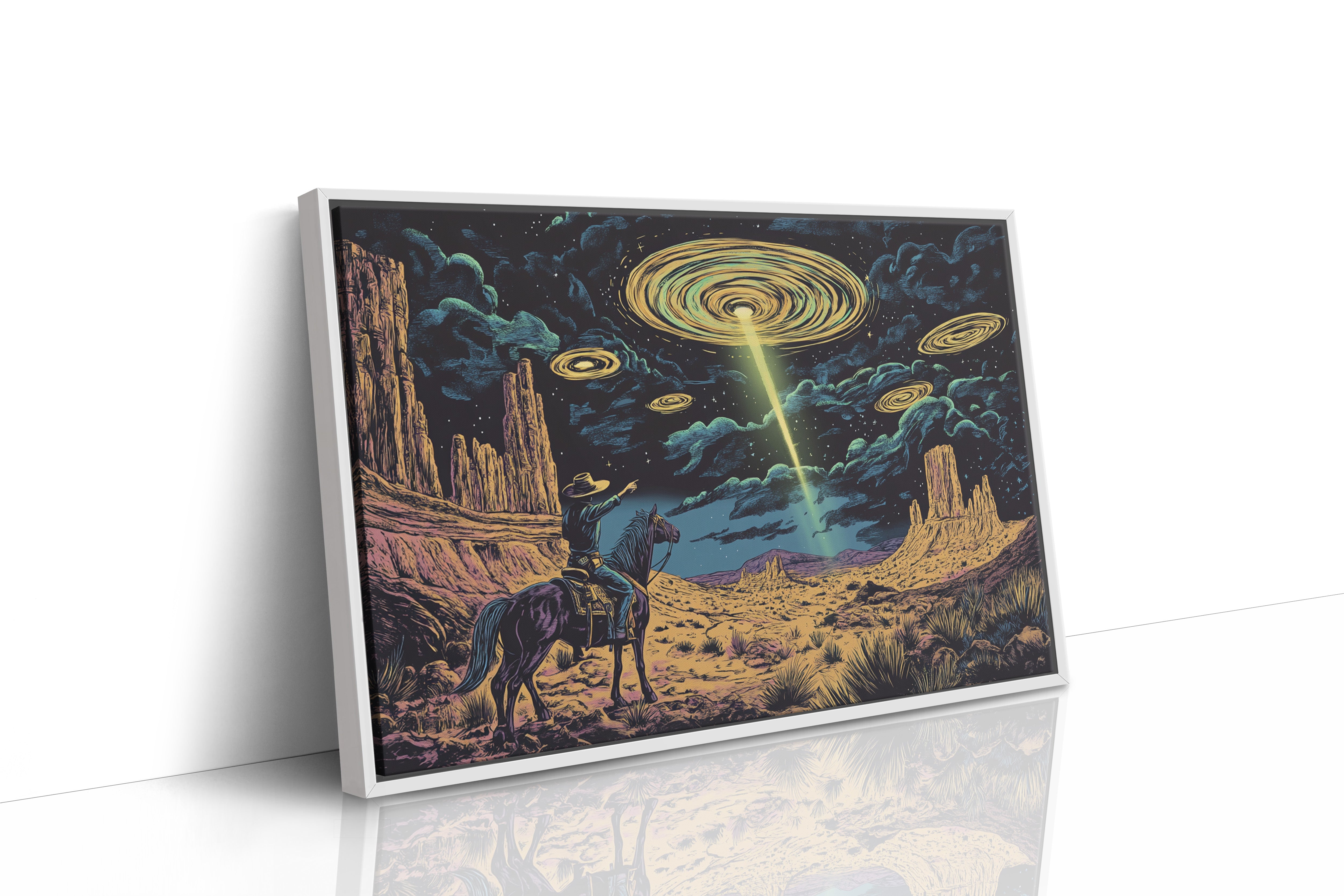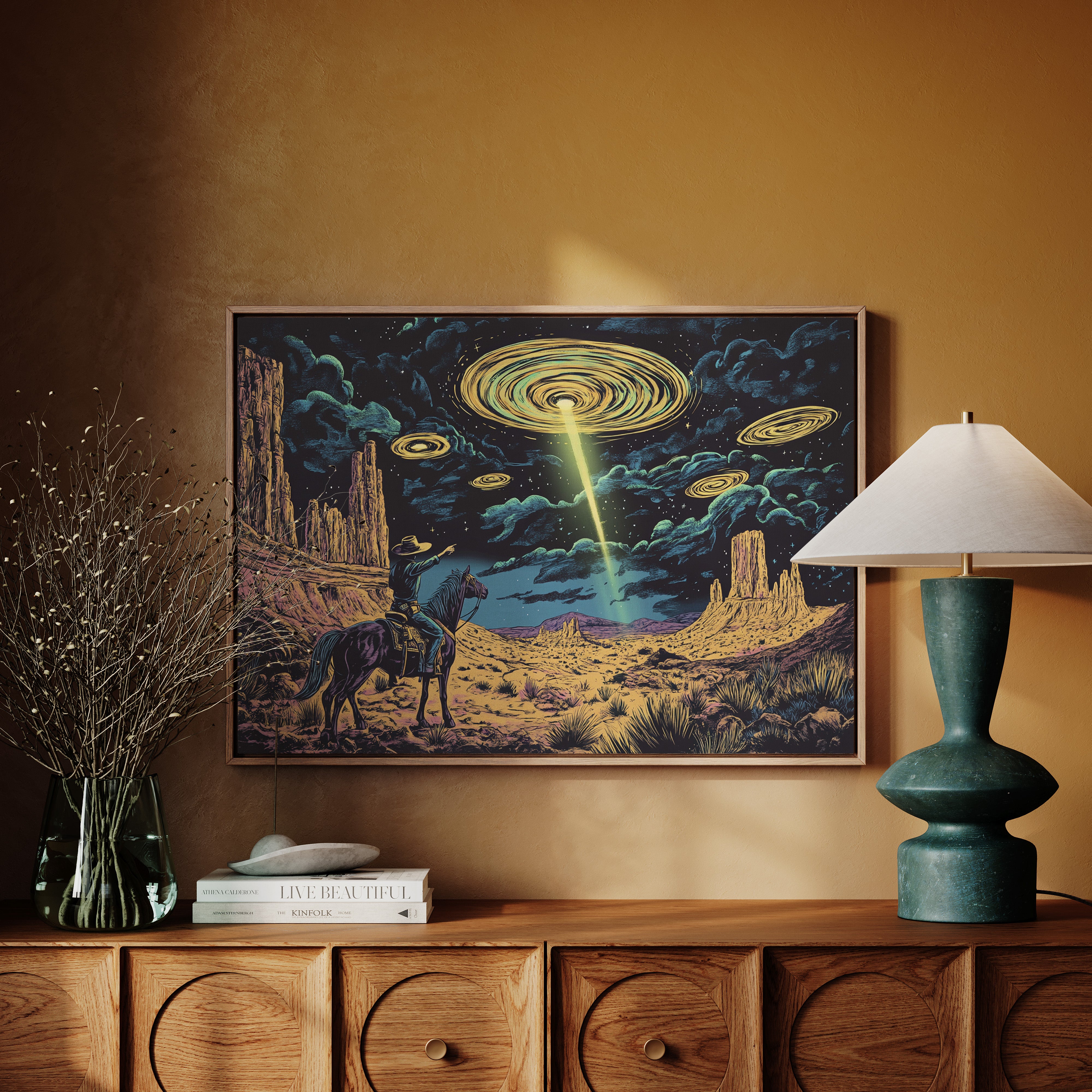 A lone cowboy raises his hand to the swirling sky, where golden discs descend in silence. This cosmic western scene fuses retro alien lore with desert grandeur in vivid detail.